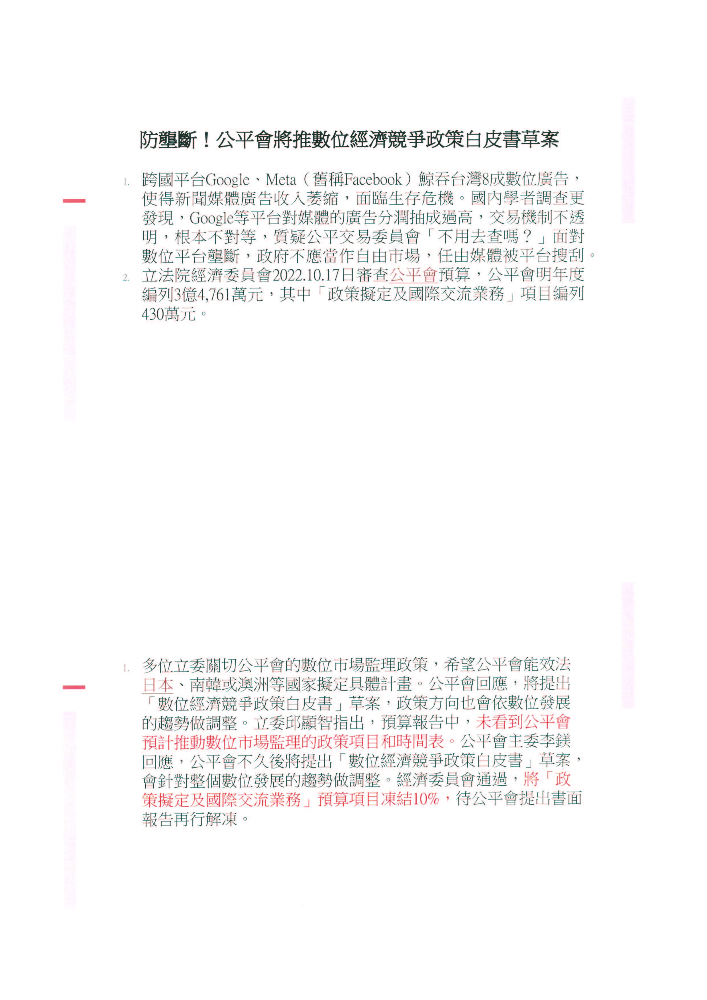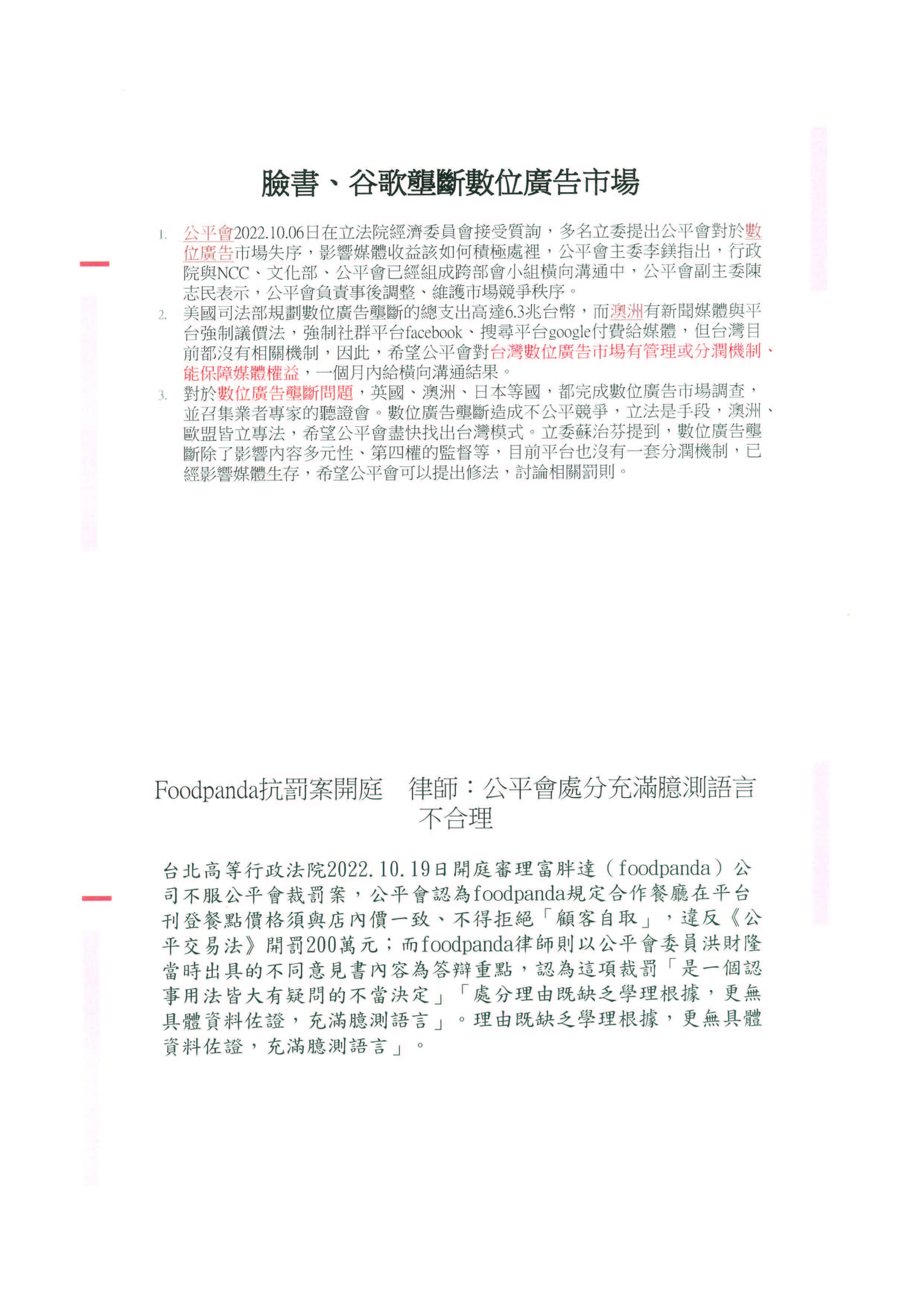 臉書、谷歌壟斷數位平臺也是要注意的,特別是分潤機制的建立,對臺灣整個新聞市場、民主機制的建立都很重要。