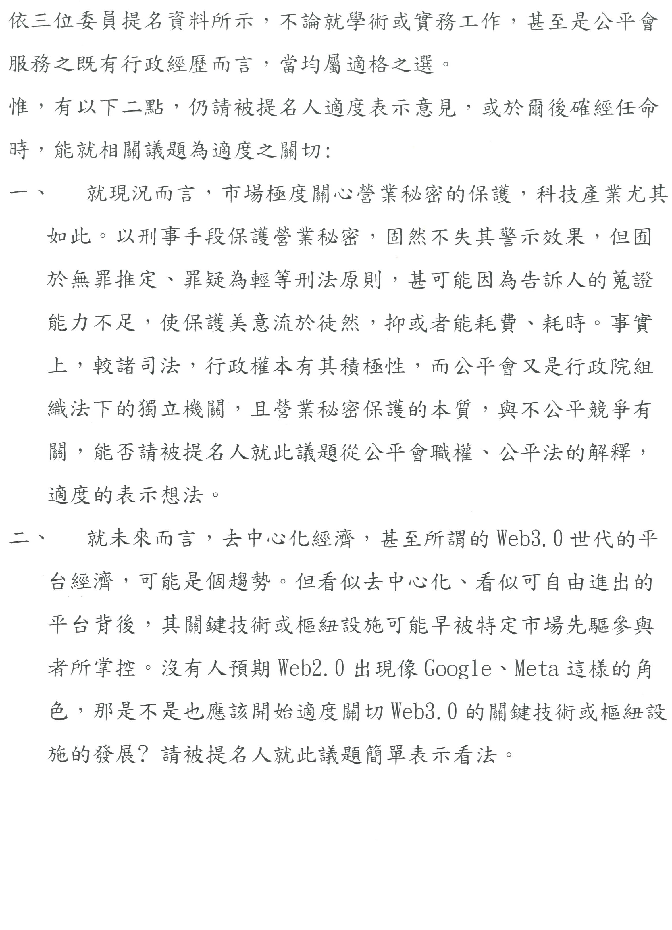 我看到三位的資歷及專業領域,其實我滿期待針對剛剛所說的兩項議題─一個是關於傳統營業秘密保護,另外一個是關於現在網路經濟平台更進一步的去中心化經濟,都能夠得到委員們的關注,這是我個人的期許,也希望各位被提名人有機會就這部分在爾後多多表示意見。我的發言到此結束,謝謝。