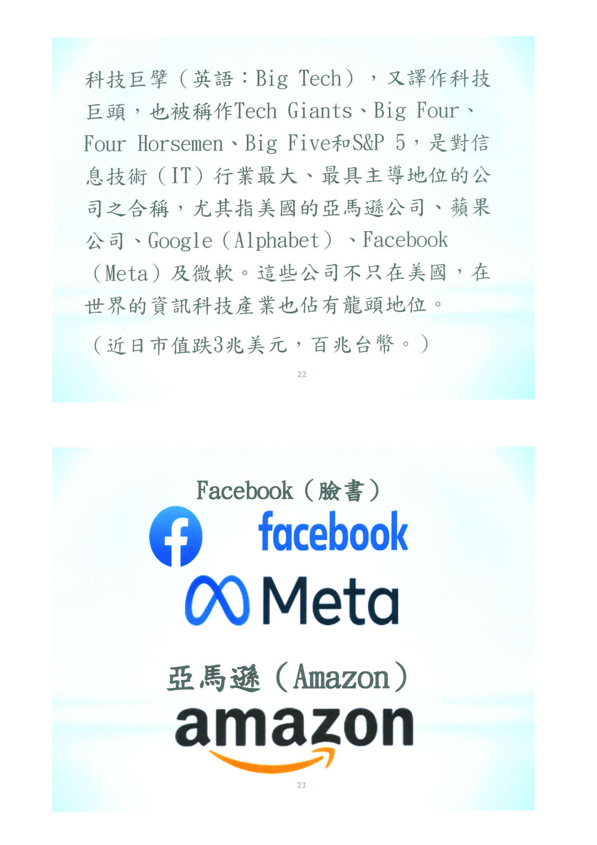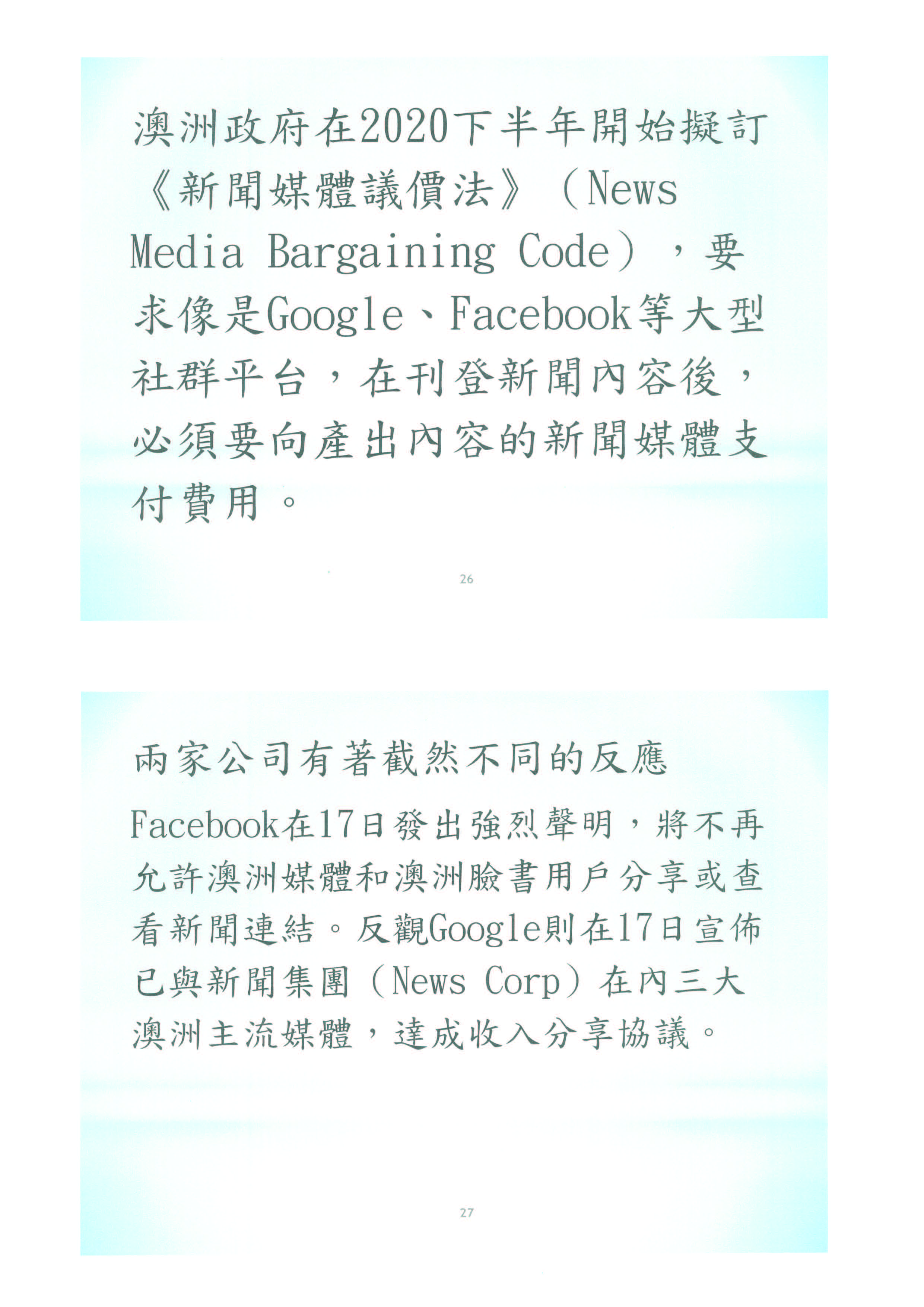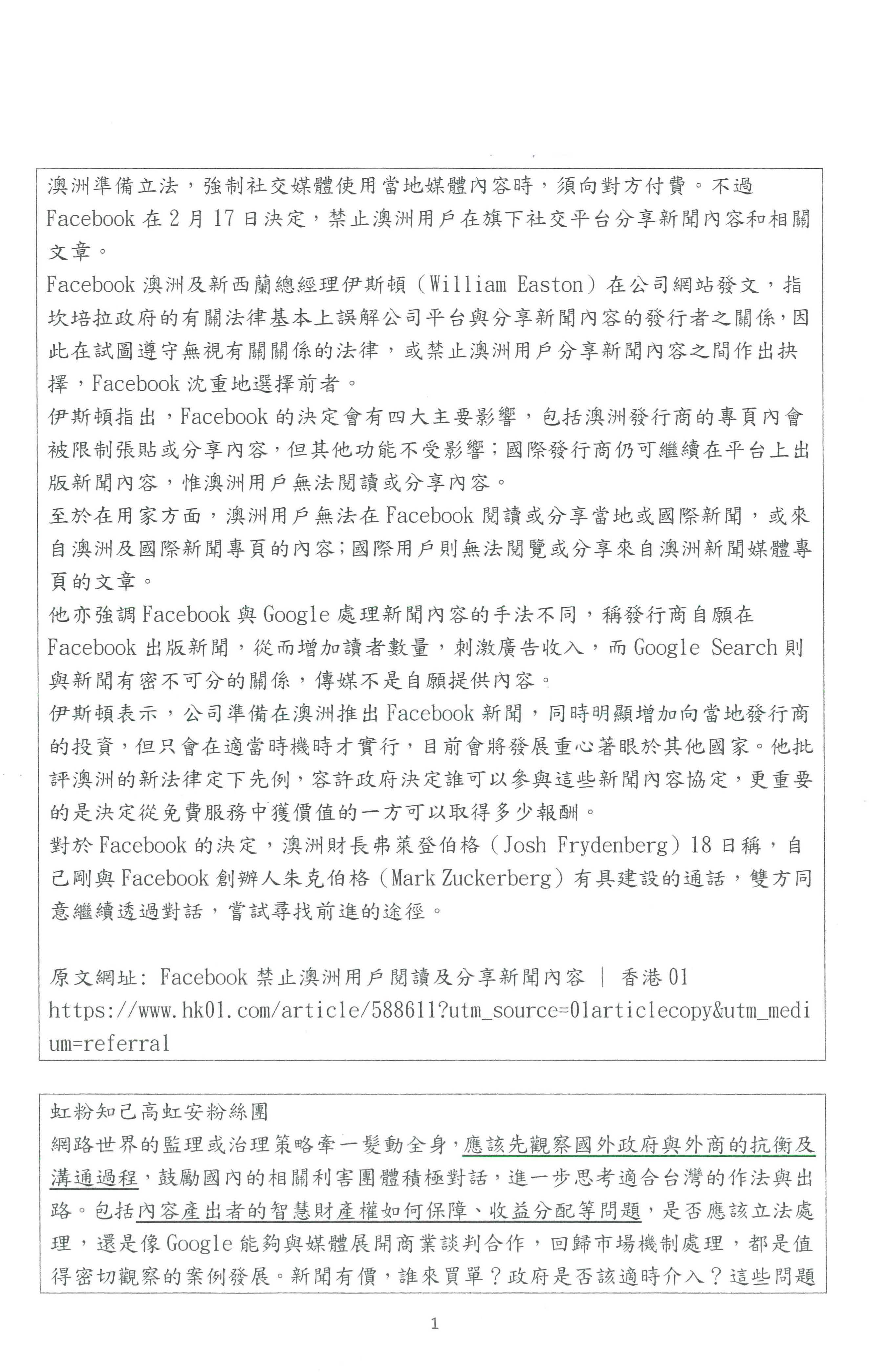 我曾經請教劉華美教授來經濟委員會要講什麼,她說這種數位經濟的大頭,比如蘋果、微軟、臉書和亞馬遜會變成未來重要的課題。這兩個月發生一件事情,就是澳洲政府要跟臉書和谷歌收錢;哪一位高委員說要「打群架」?這不是甲級動員、大家互相打架,上CNN的體育電視,它是跟著大的經濟體一起同進退,因為臺灣的市場規模經濟不足,禁不起臉書或者是谷歌的抵制,所以要跟著大的經濟體打群架。