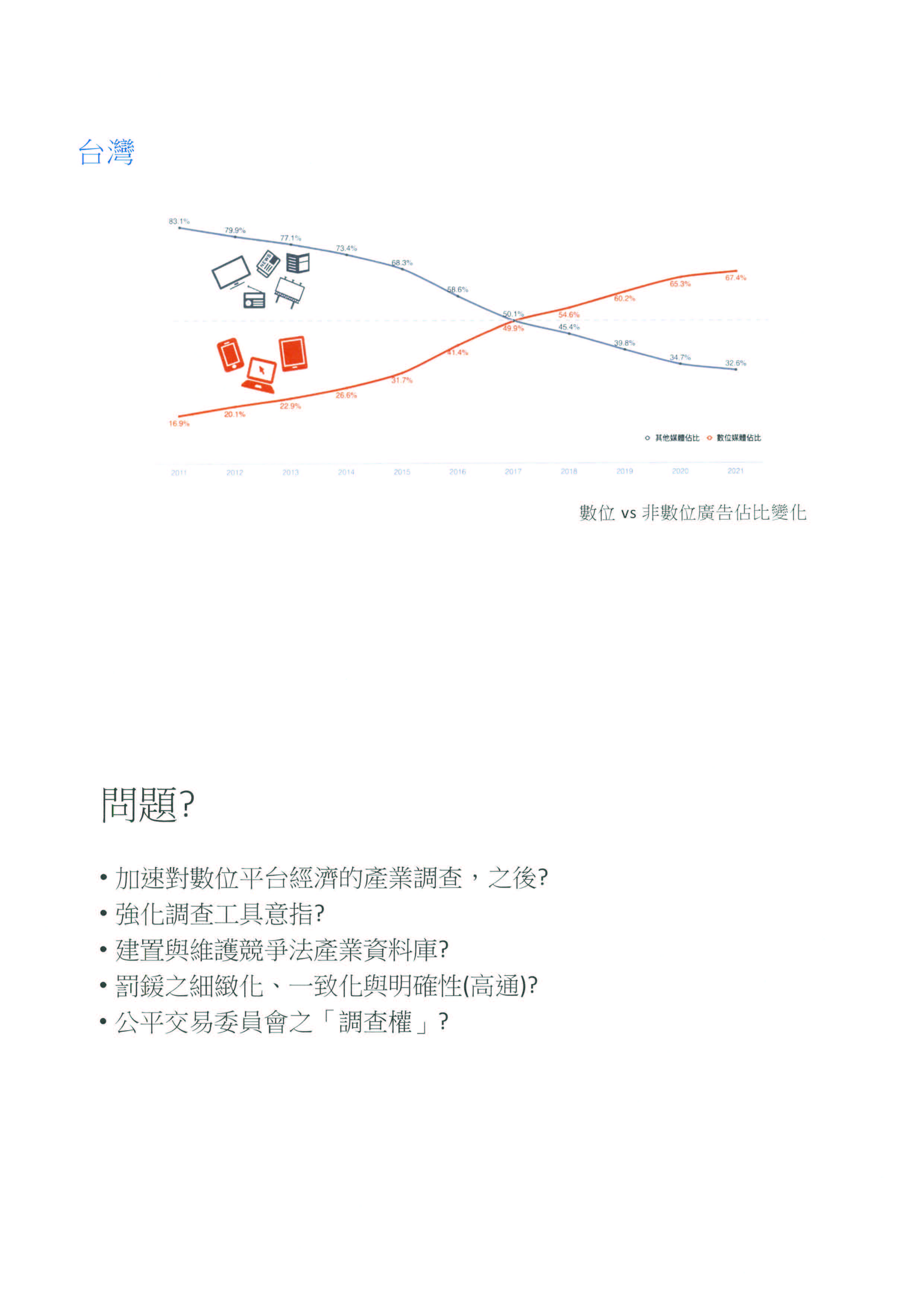 另外一方面數位平臺所壟斷的不只是商品交易的市場,還包括透過提供免費的服務以取得使用者的個人資料,再利用這些資料壟斷以求獲利,因此受到壟斷企業威脅的消費福祉,就不只是在經濟層面上,更隱含了隱私、個資、選擇權以及因為平臺鎖定效應產生的轉換成本等等,而數位平臺壟斷產生的後果,更嚴重的是什麼?更嚴重的是影響整個自由民主社會的運作,例如近來大家非常關注的新聞媒體與平臺間分潤的問題,如果沒有找到一個妥善的解方,將會嚴重衝擊民主社會中最重要的第四權,也就是監督制衡的力量,這才是我們非常關切的,而數位經濟對公平會的執法和審查,也產生了很多新的難題,包括相關市場的定義、濫用市場地位的審查、企業合併的審查等等,這些問題在公平會的數位經濟白皮書當中已經跨出研究的第一步,但是我必須要說,距離提出具體的政策,尤其是跟其他國家比起來,甚至能夠開始落實在執法上,都還有一段距離。