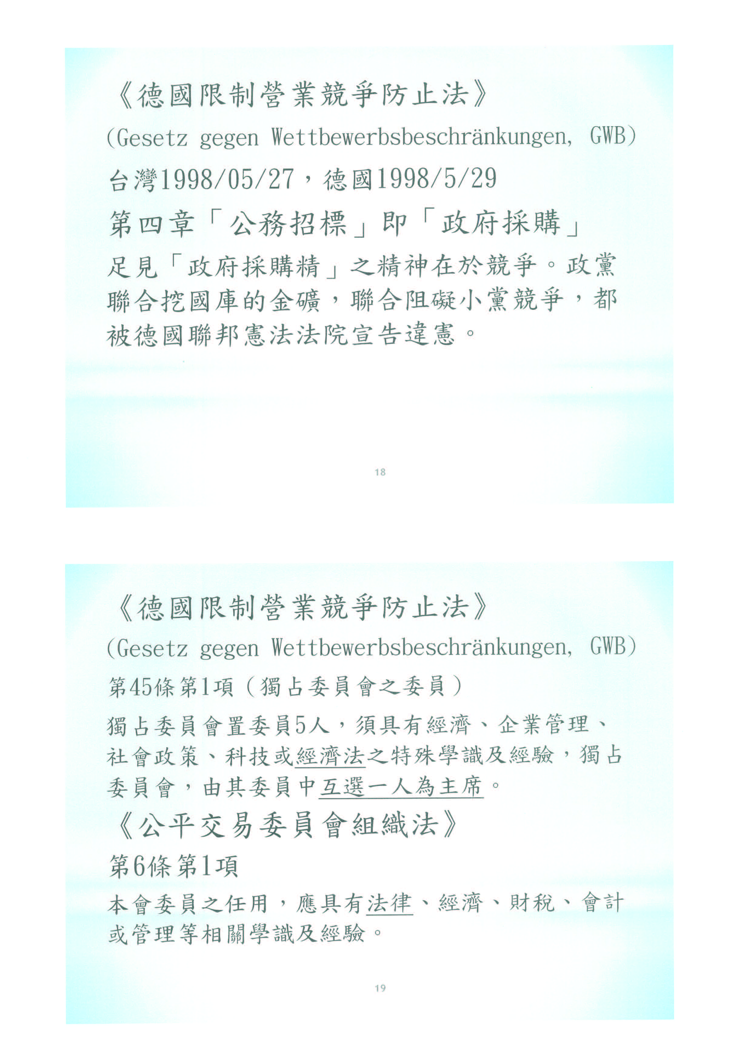 再來就講到限制營業競爭法的部分,德國的政府採購寫在限制營業競爭防止法裡面,表示營業競爭是政府採購的重要內容,而且GWB規定公平交易委員卡特爾廳的委員要有經濟法的知識,不是像我國寫法律的知識,而是經濟法的知識。再來,主任委員是由委員互選,我覺得中選會、NCC和公平交易委員會,如果能夠讓主任委員由委員互選才更能夠達到獨立機關的要求。