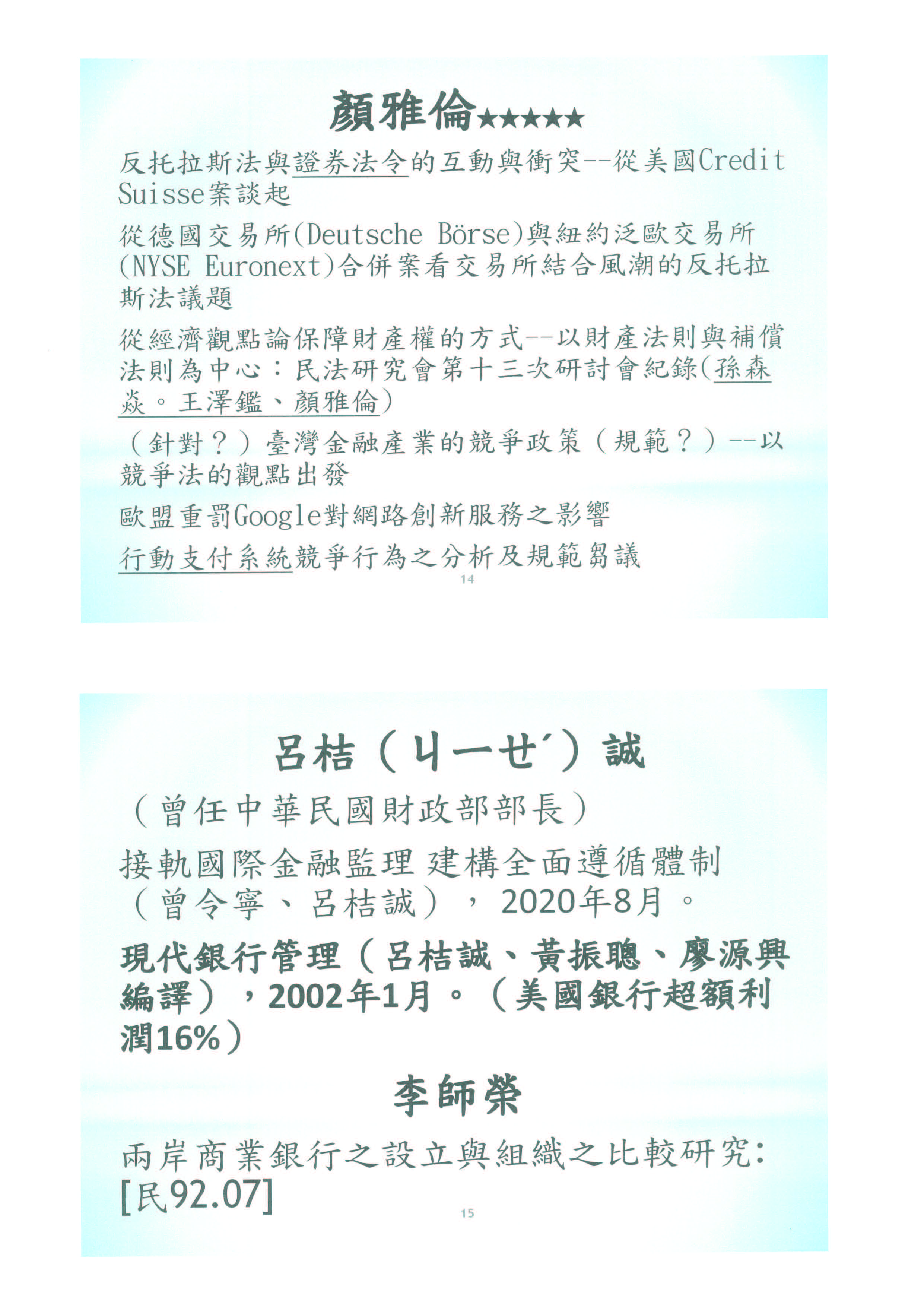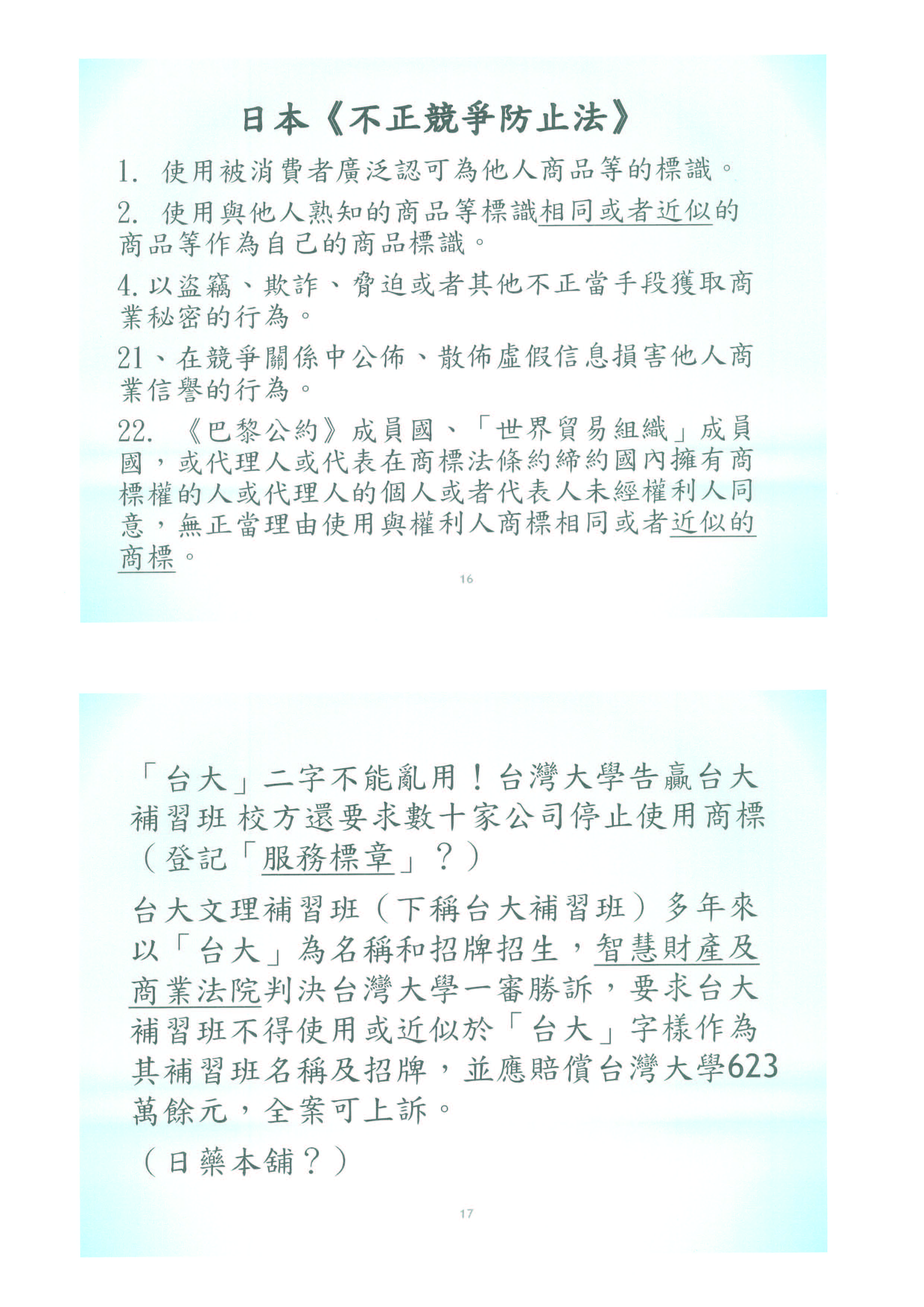 我非常推崇顏雅倫教授,她能夠分析證券市場、能夠分析支付系統,而且還跟我們的孫森焱大法官、王澤鑑權威老師這樣平起平坐,等於是用經濟的方式來分析民法的觀念,顏教授還說她有很多字數比較多的論文會陸續發表,所以我個人是極端推薦。關於不正競爭法,日本的「不正競爭防止法」有列舉了很多態樣,我只是要說明臺大告贏台大文理補習班,以及不是鄭曼青太極拳的,不可以說是他的祖傳弟子。