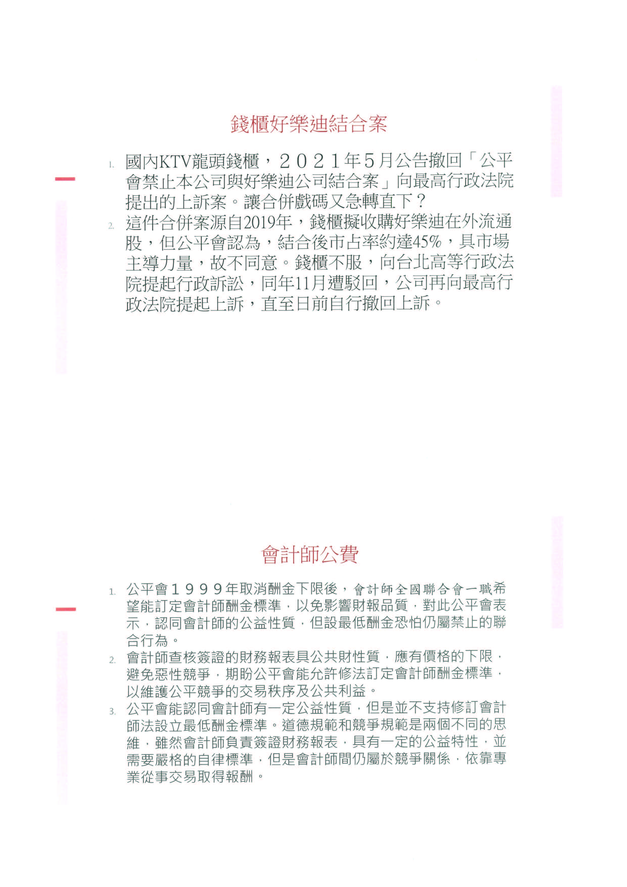 錢櫃好樂迪結合案,雖然公平會禁止它們結合,錢櫃也撤回了最高行政法院的上訴案,可是事實上我們發現錢櫃與好樂迪是聯合辦公,如果繼續下去,公平會對錢櫃、好樂迪是不是要使出殺手鐧把它們拆解,這也是未來委員所要面對的問題。