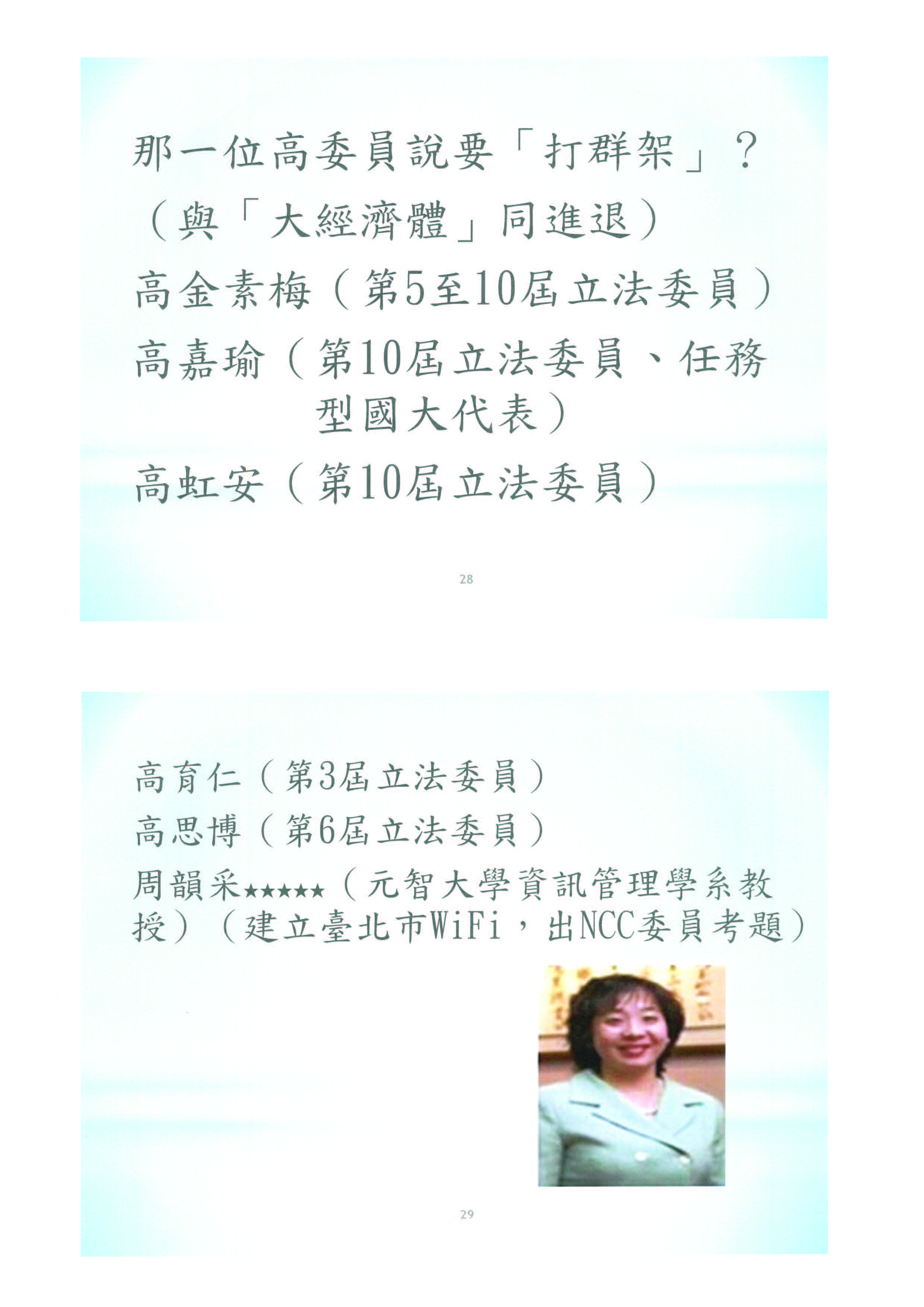 有關這一次公平交易委員會的結構內容,我為什麼放周韻采的照片?因為周韻采教授以前出NCC的考題,我希望NCC的委員或公平委員會的委員,能夠回答剛剛各位學者專家的垂詢,讓我們的整個水準更能夠有所提升。