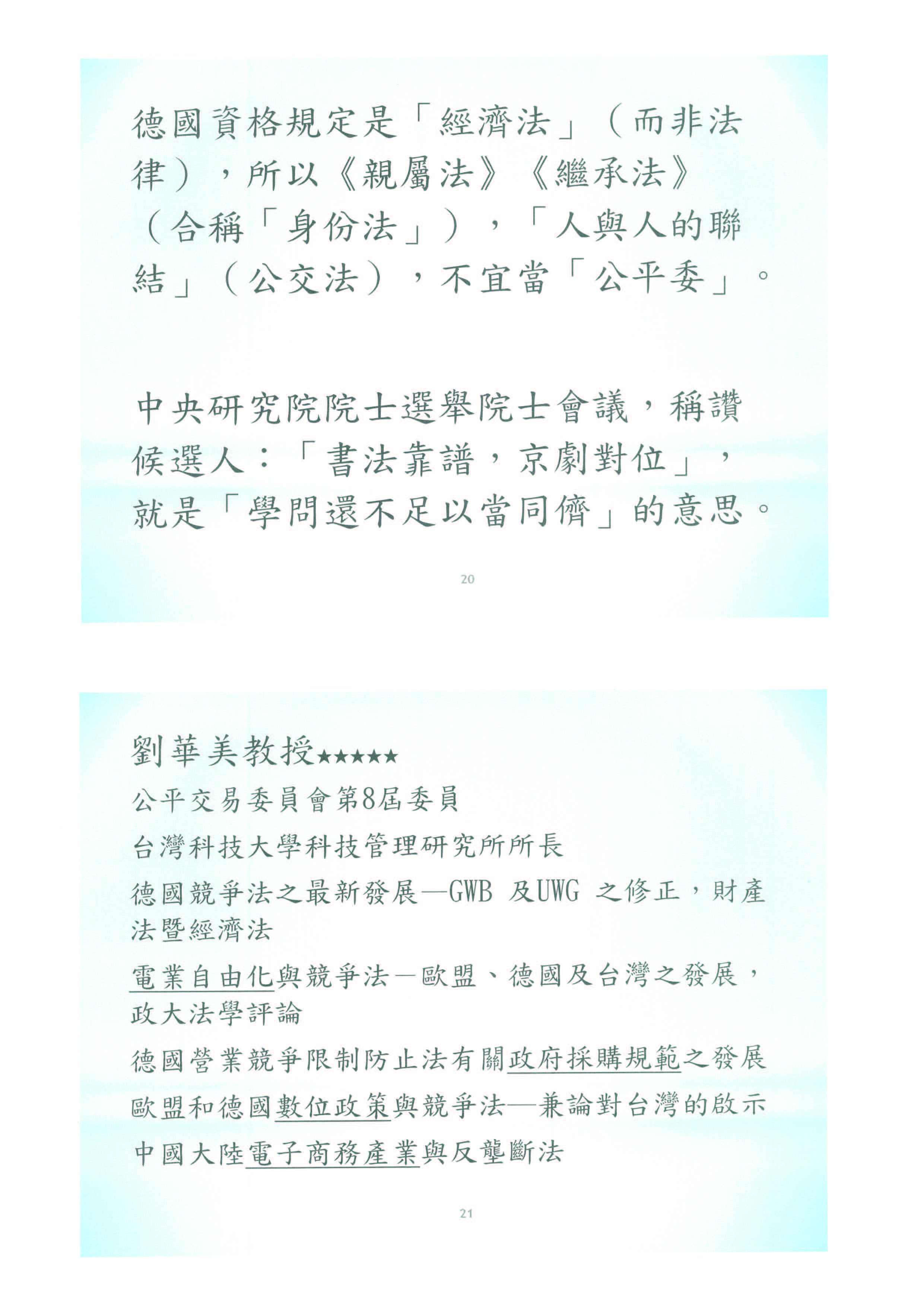 最後一點,競爭法是非常理論跟實務並重的,因此公平會無論是哪一位候選人進來,他在這方面的仔肩是永遠不能卸下來的。以上報告,謝謝。