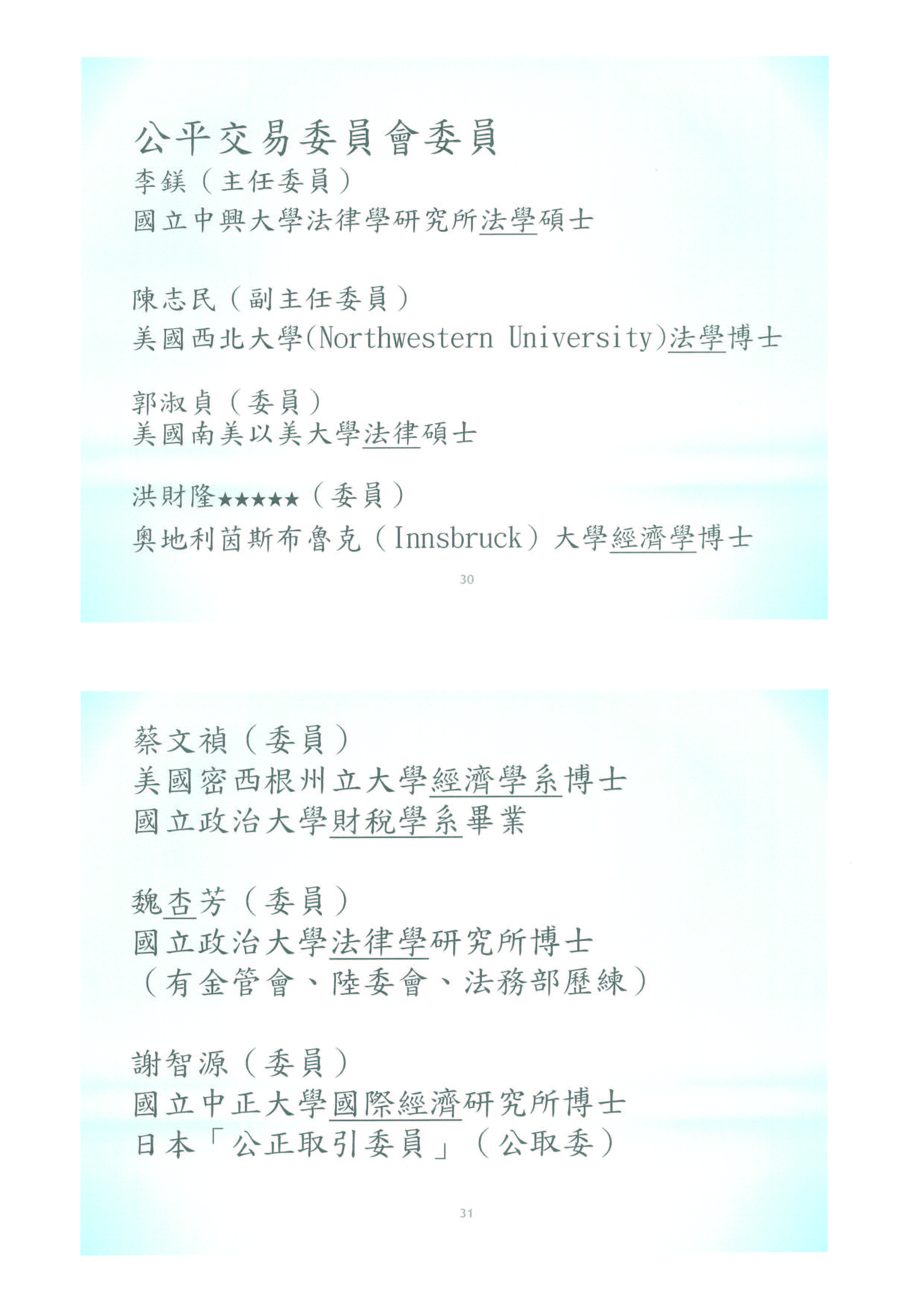 第二大部分,我想針對3位被提名人,也就是候選人的資格、學歷、學養等等,因為我也常常接受公平會的委託研究案,或者是參與小型的開會等等,所以對這3位也算是熟稔,因此我相信公平會或是整體行政院提名3位候選人有其一定的考量,不管是從實務的背景或是理論的背景來看,像辛主秘在公平交易委員會擔任那麼久的各種職務,我相信他未來的工作會更全面,要用委員會另外一個旁觀的角度來提升公平會一些組織管理的力量。李師榮律師具有三十幾年的律師經驗,也有參與社會實務等等,我相信他的實務經驗也可以幫助未來有關司法的部分,譬如高等行政法院、最高行政法院等等案件的處理,如何來分析行政、司法之間是不是還存有什麼樣的齟齬,應該可以有很大的助益。另外,顏雅倫本身也是律師,後來去教書,他還有留學美國的經驗,所以不管是語言還是學養,應該都是屬於現在非常高端的學者。