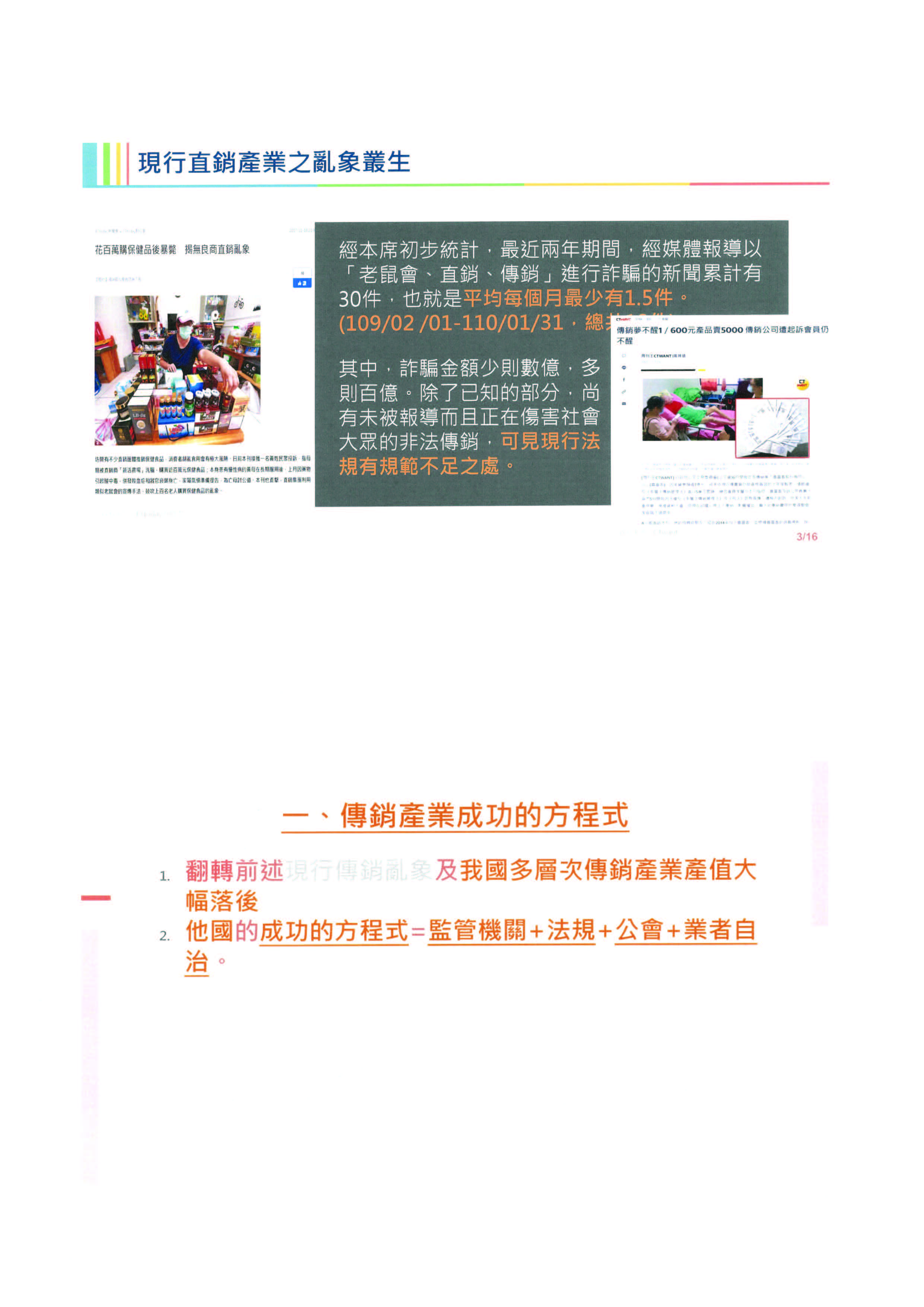 曾浩維律師:主席、各位先進,大家好。很榮幸今天能夠以專家學者身分受邀到此發表意見,由於我個人的背景是執業律師,主要服務項目包括直銷、連鎖加盟等領域,所以今天我想就我執業的項目發表一些個人的看法,以及提醒未來委員們繼續往下精進可能必須注意的事情。