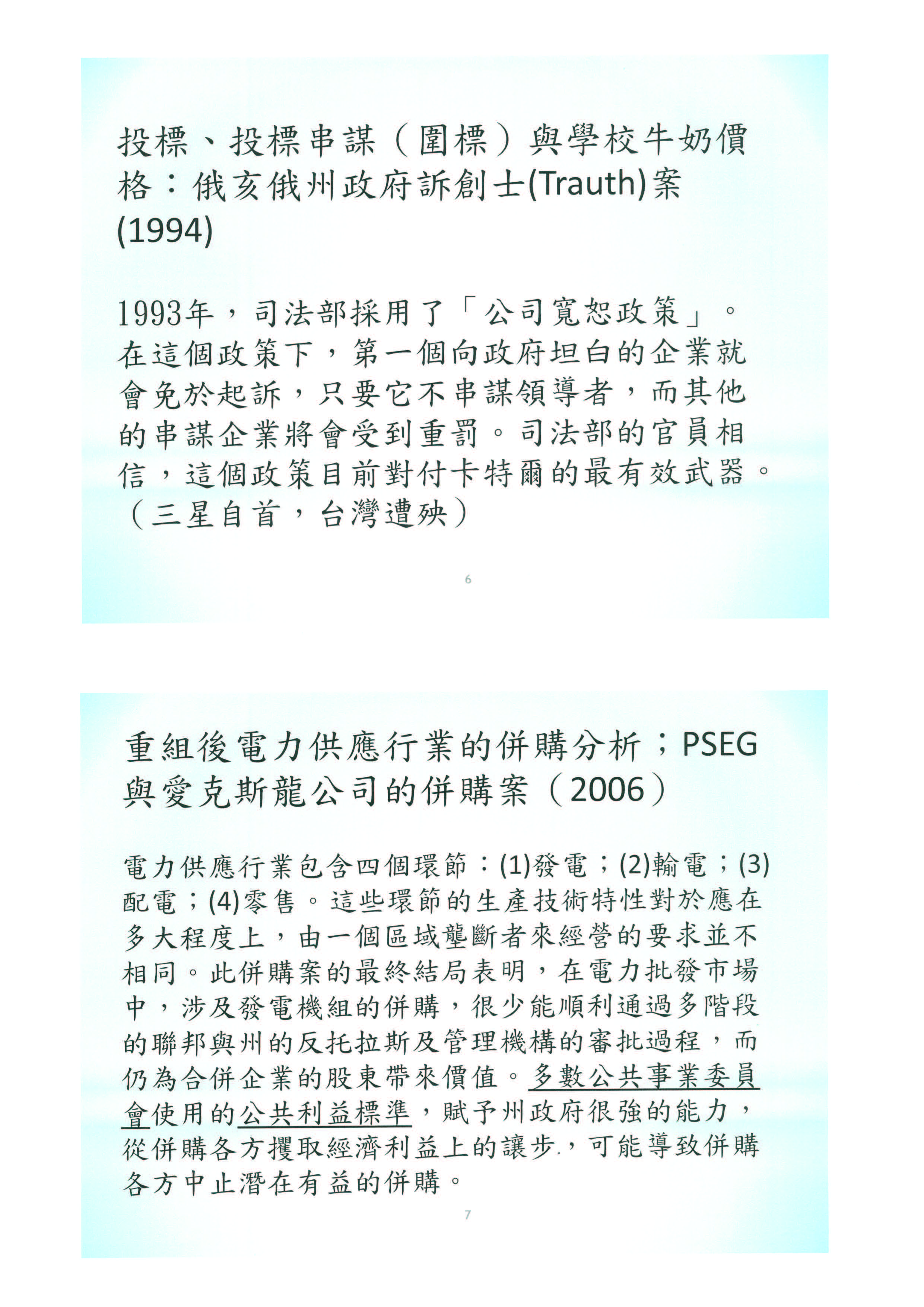 再來我很關心的就是圍標的事件,圍標是用公平交易法來加以處罰,美國有一個政策就是鼓勵大家自首,自首的結果就是韓國三星去自首,臺灣的公司去坐牢,但是這是值得注意發展的方向。電力產業也是我國明年開始要注重的產業,它有自然獨占性質,分為發電、輸電、配電、零售的各個階段,拆解開來觀察的時候比較能夠理解這個產業應該如何管理,剛剛林旺根教授有提到不動產行業有建築、經濟、銷售、仲介、租賃、融資管理等等,也要觀察各個階段有沒有獨占或寡占的情況。