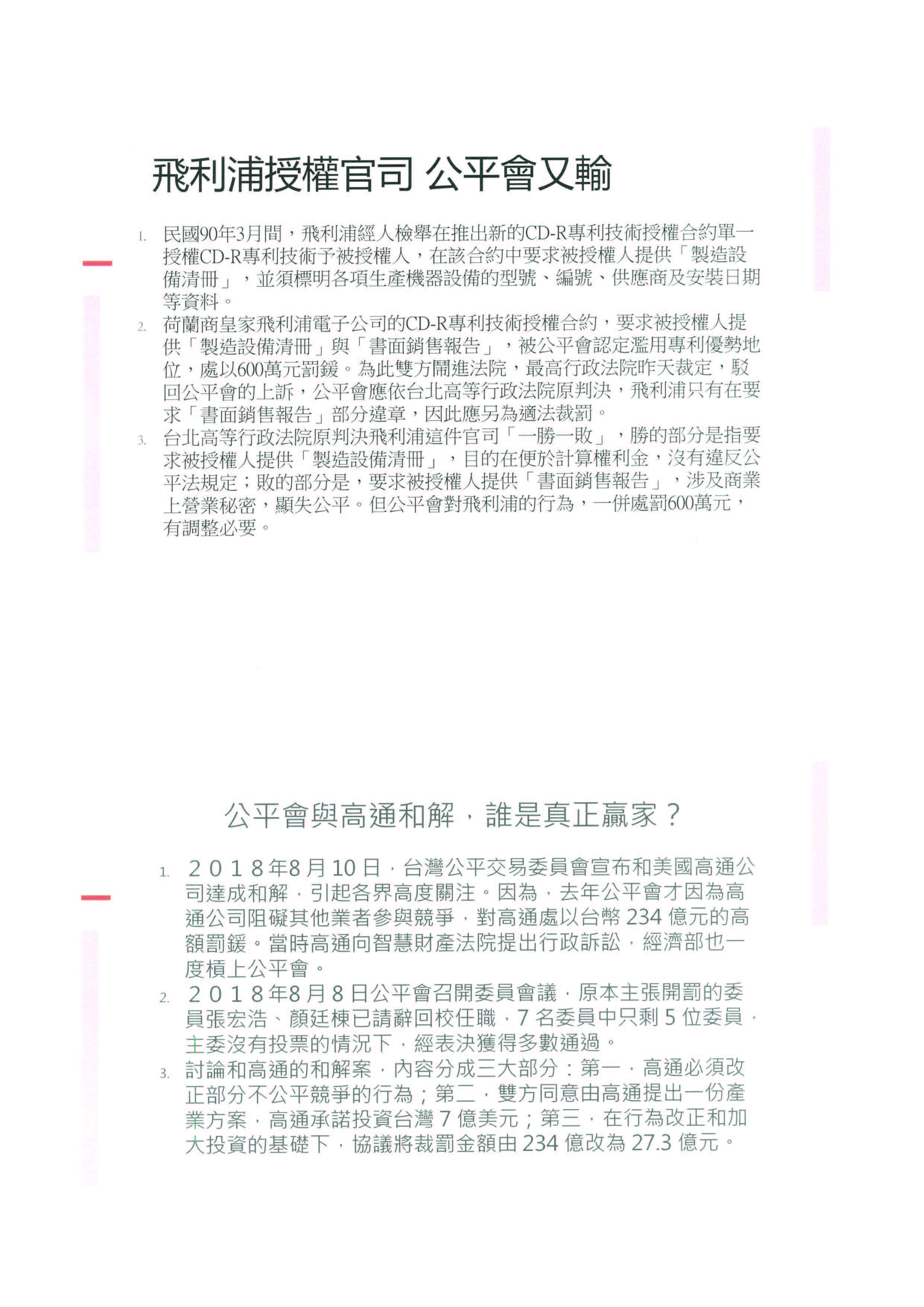 我們來看一下公平會到底有哪些挑戰,大家以為公平法只有公平法,公平法涉及的法相當多,特別從飛利浦授權案可以看到智慧財產權跟公平法之間的平衡也是要重視的。從飛利浦的案子就可以看出來飛利浦濫用專利優勢以及對臺灣產業的一些影響,它也受到公平會的處分,雖然公平會在這個案子有它的見解,但雙方並沒有一致的看法,可以看出這也是未來新的委員所要面對的議題。
