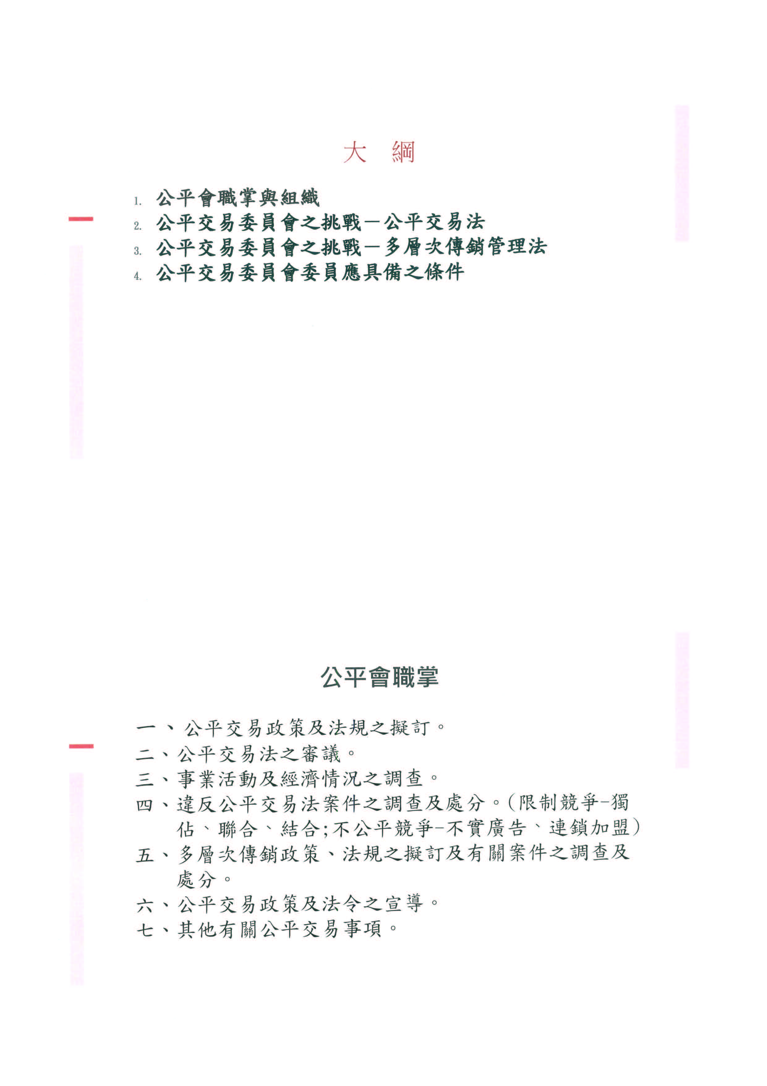 李禮仲副教授:主席、賴召集委員瑞隆先生、各位委員、各位與會的學者專家及各位先生、女士,很高興今天有機會來參加審查行政院函送公平交易委員會委員提名名單,辛志中、顏雅倫及李師榮是否能夠勝任委員一職的公聽會。我很高興公平會提名的三位都是一時的俊傑,他們都來自於產官學,也就是因為他們都是一時俊傑,讓我對他們有更深一層的期許,也有更多一層的期待,所以我今天想就我自己之前擔任公平會委員的一些經驗分享給各位。我先就公平會的職掌、組織以及公平會面臨的挑戰來說明。公平會職掌二個法,一個叫公平交易法,一個叫多層次傳銷管理法,針對目前公平會面臨的問題以及公平會委員到底應該具備哪些條件,跟各位分享及就教。