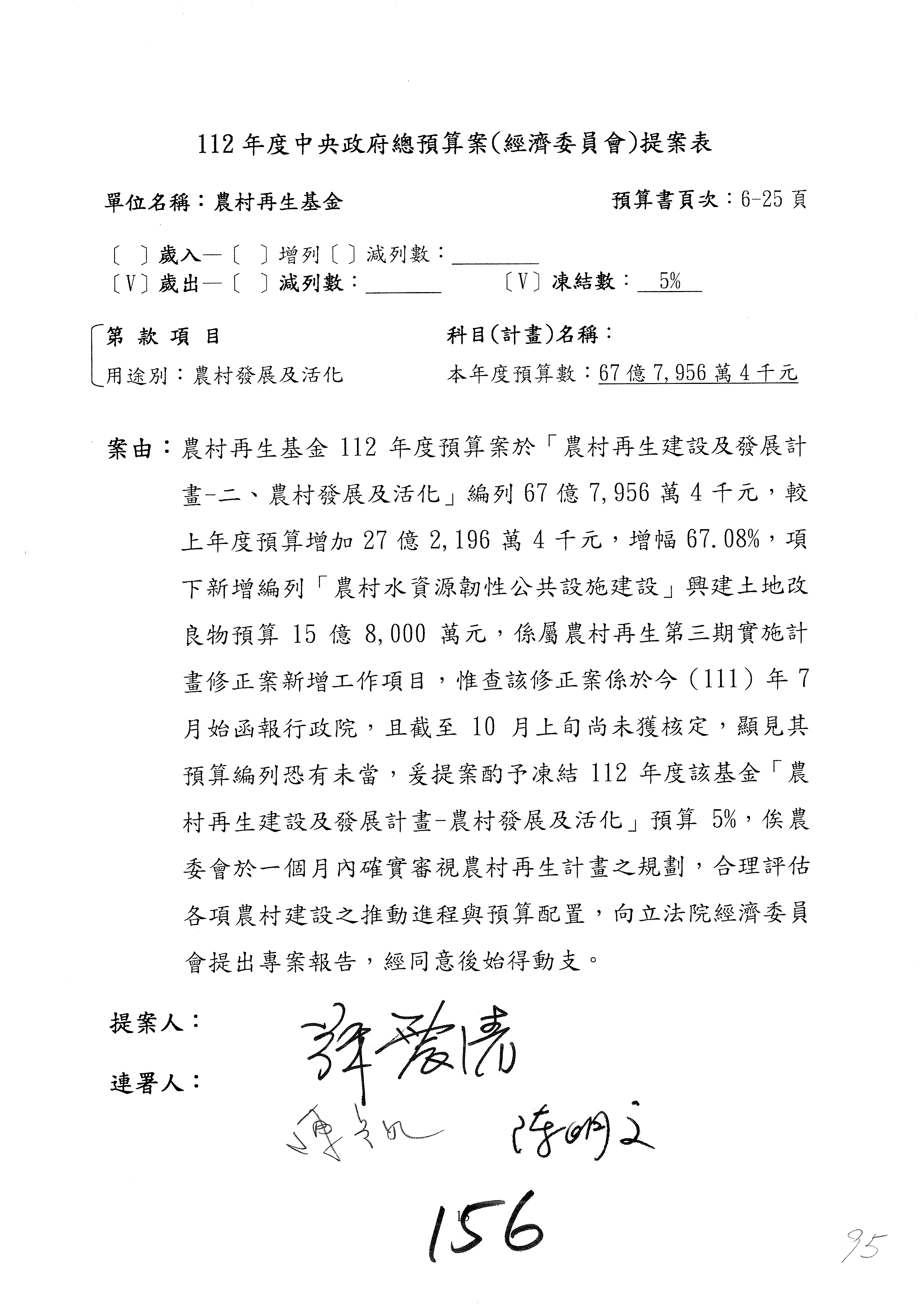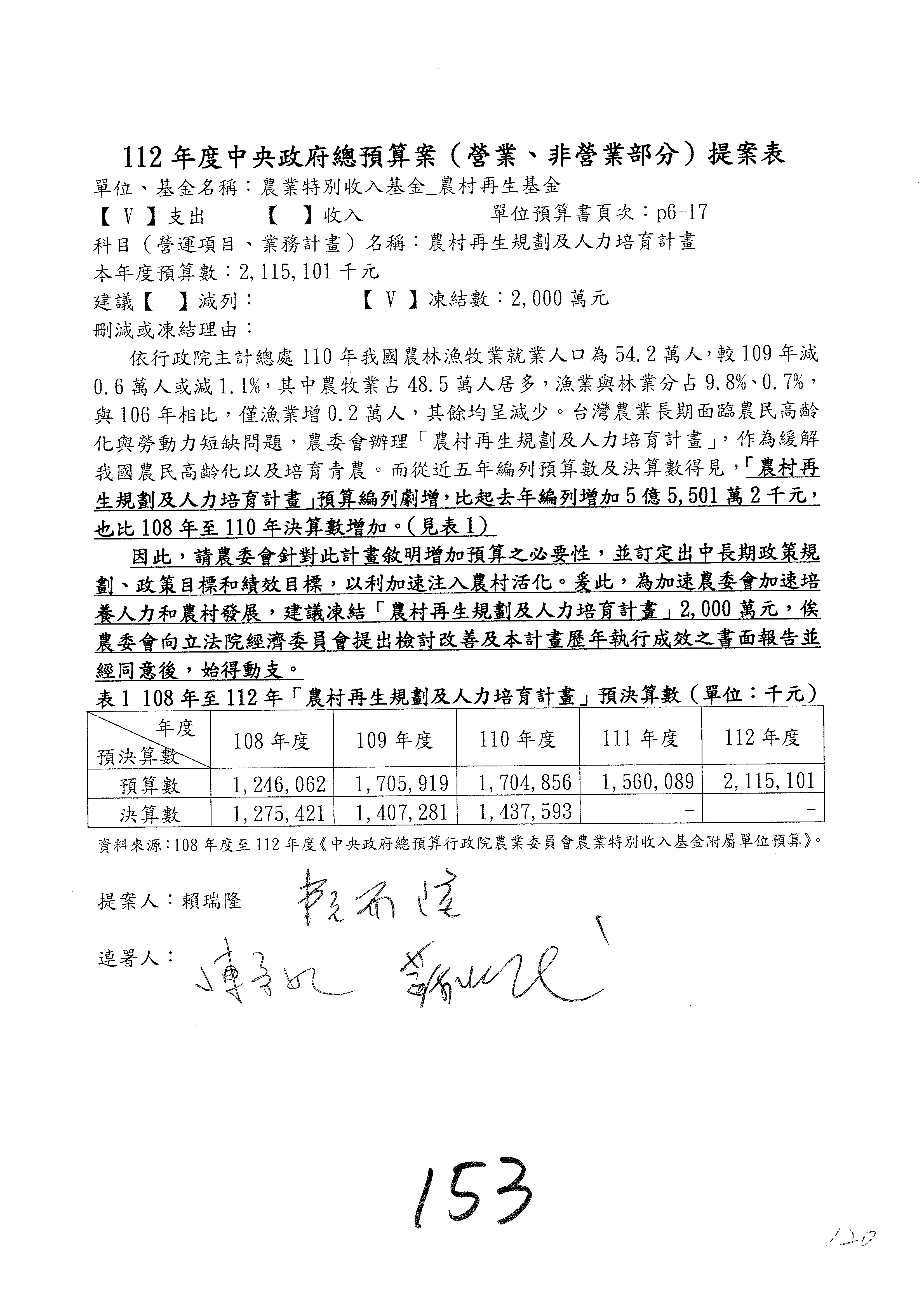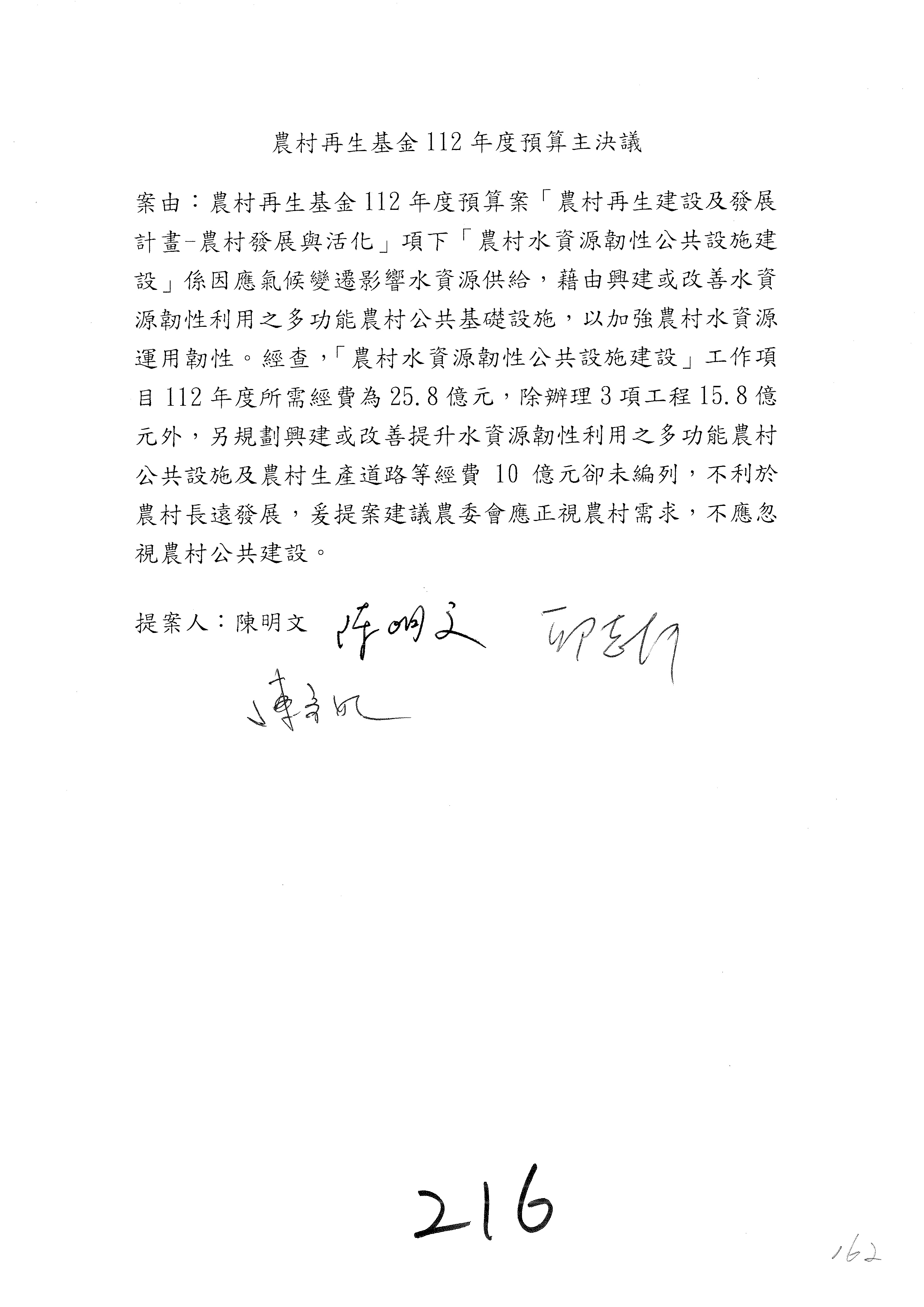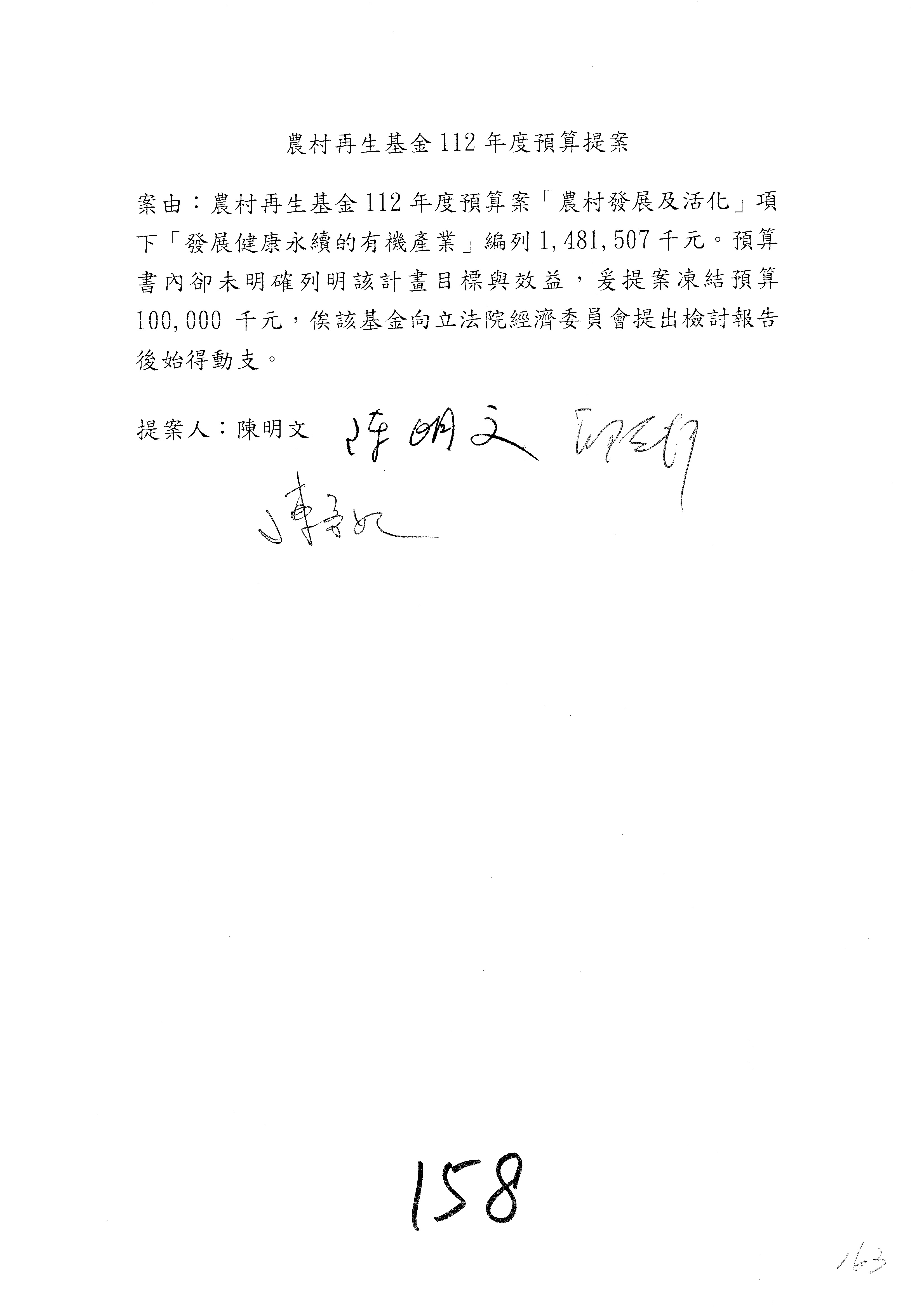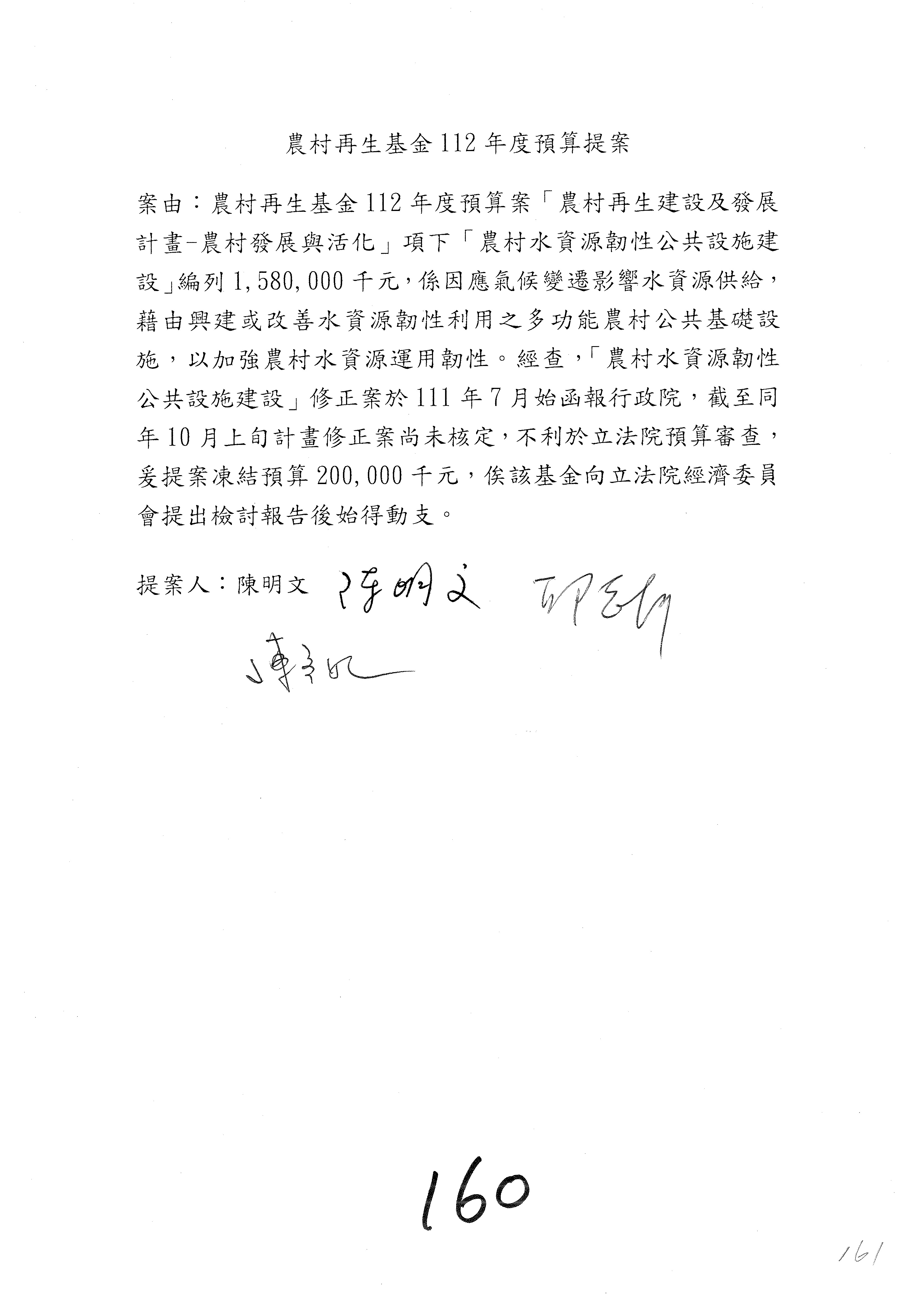 第153案到第168案,農村再生基金凍結2,000萬元,提出書面報告後始得動支。