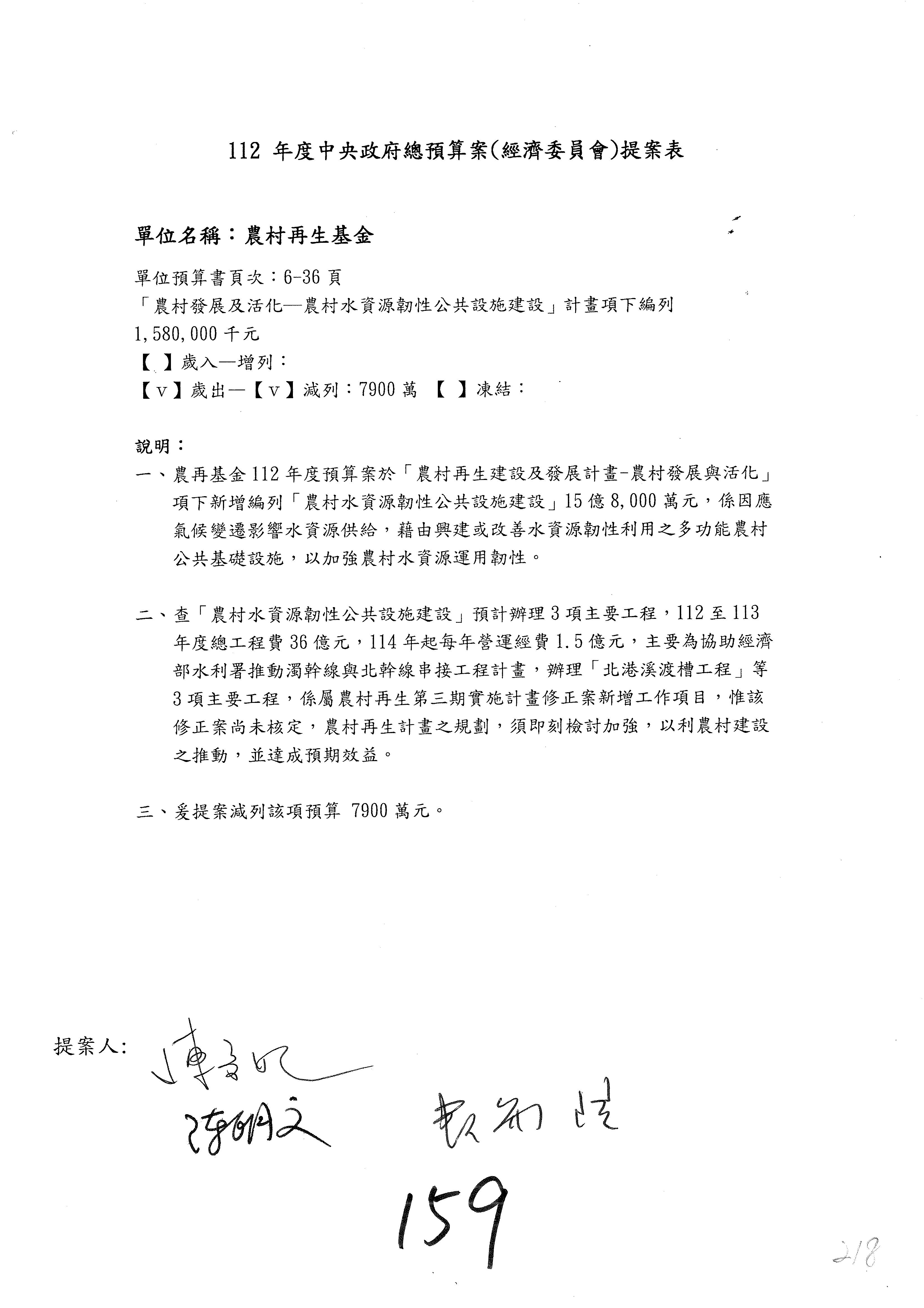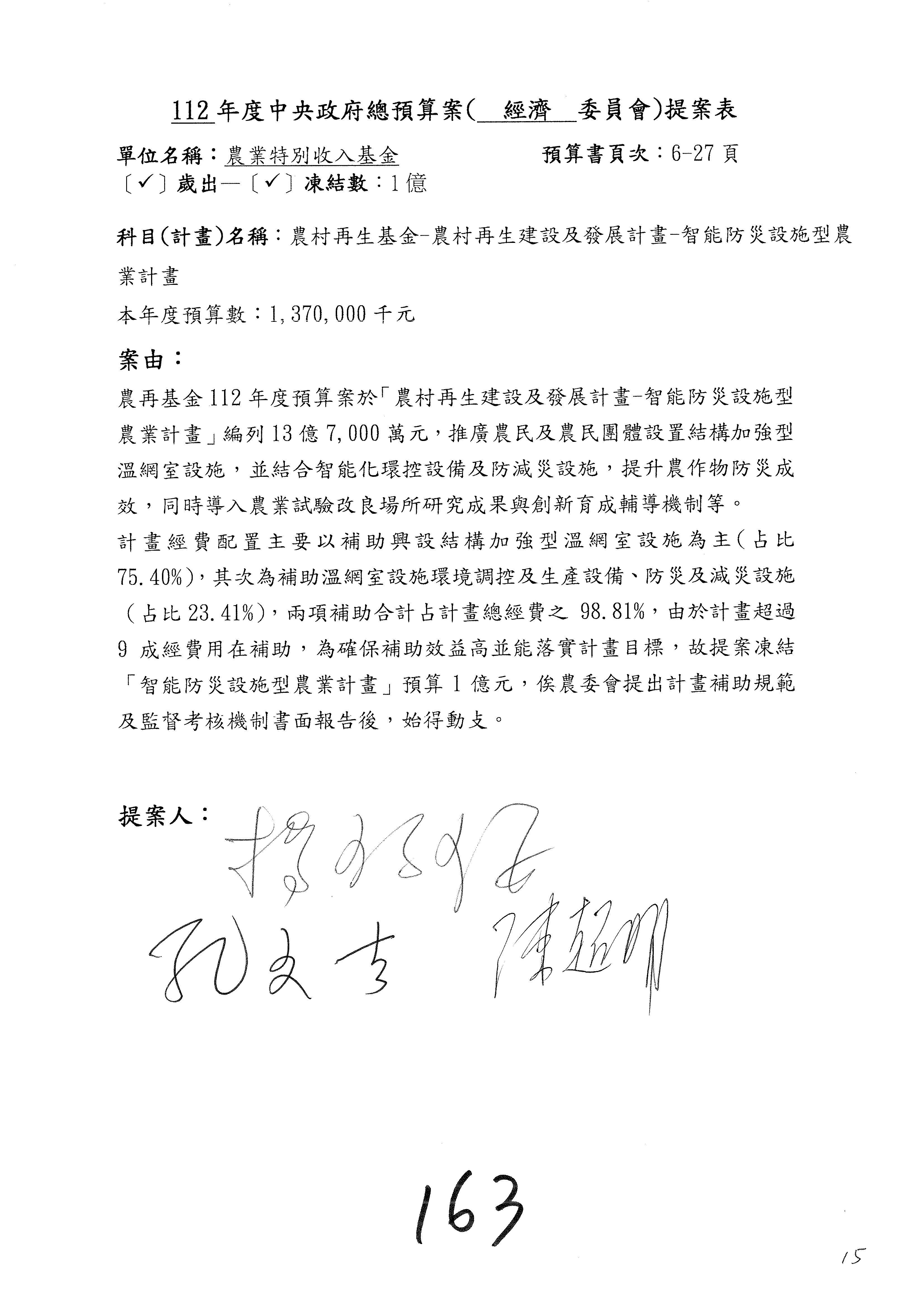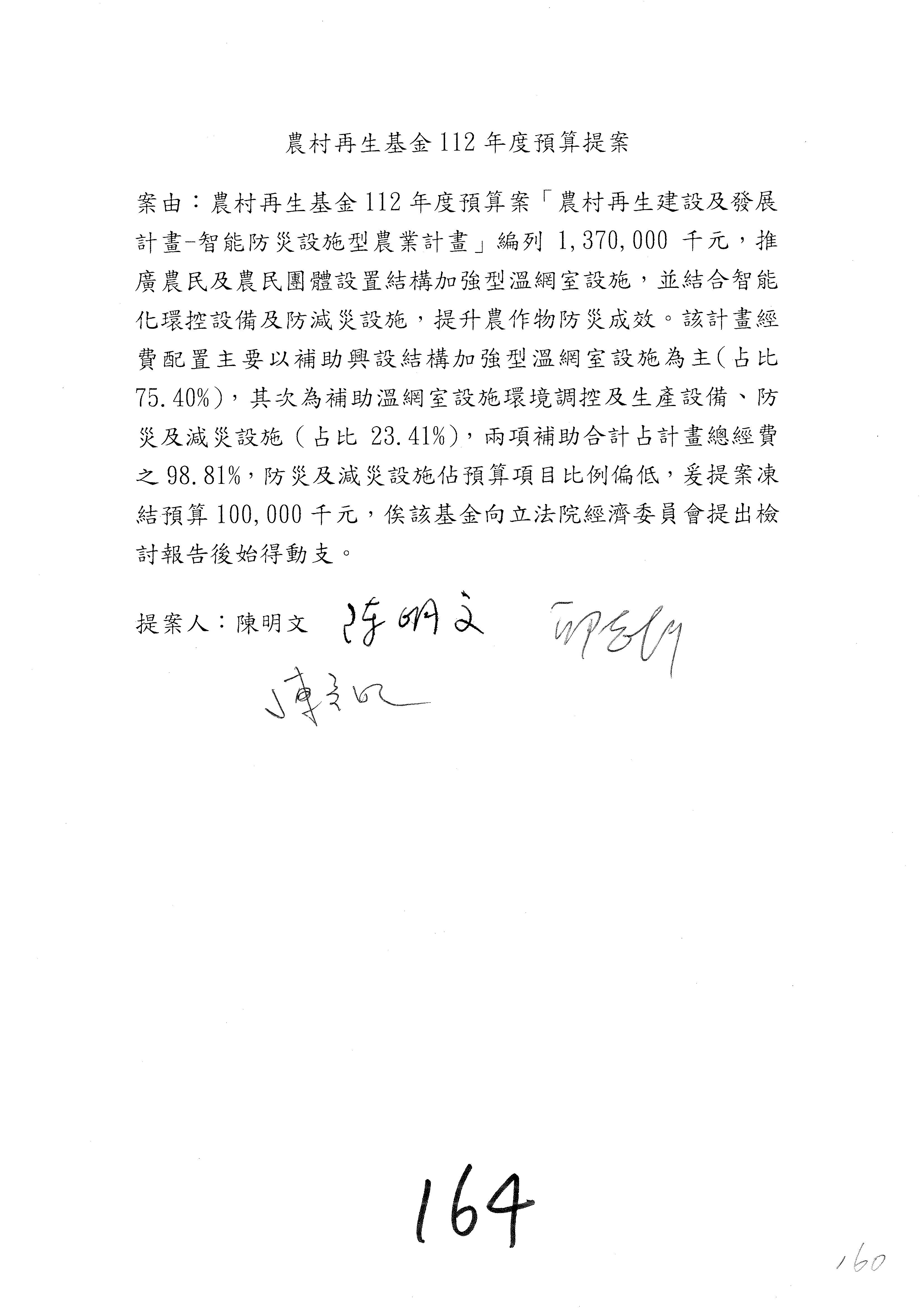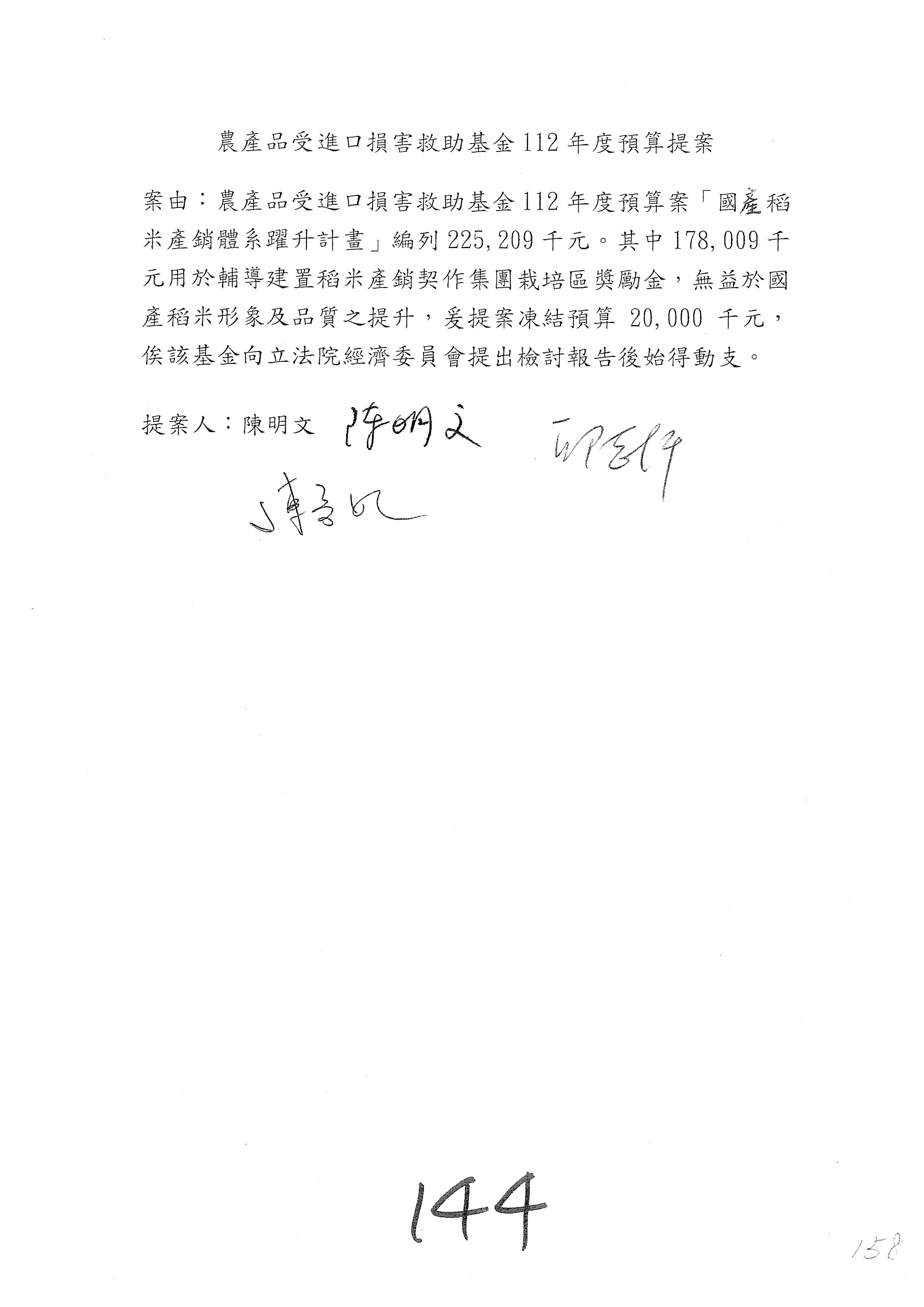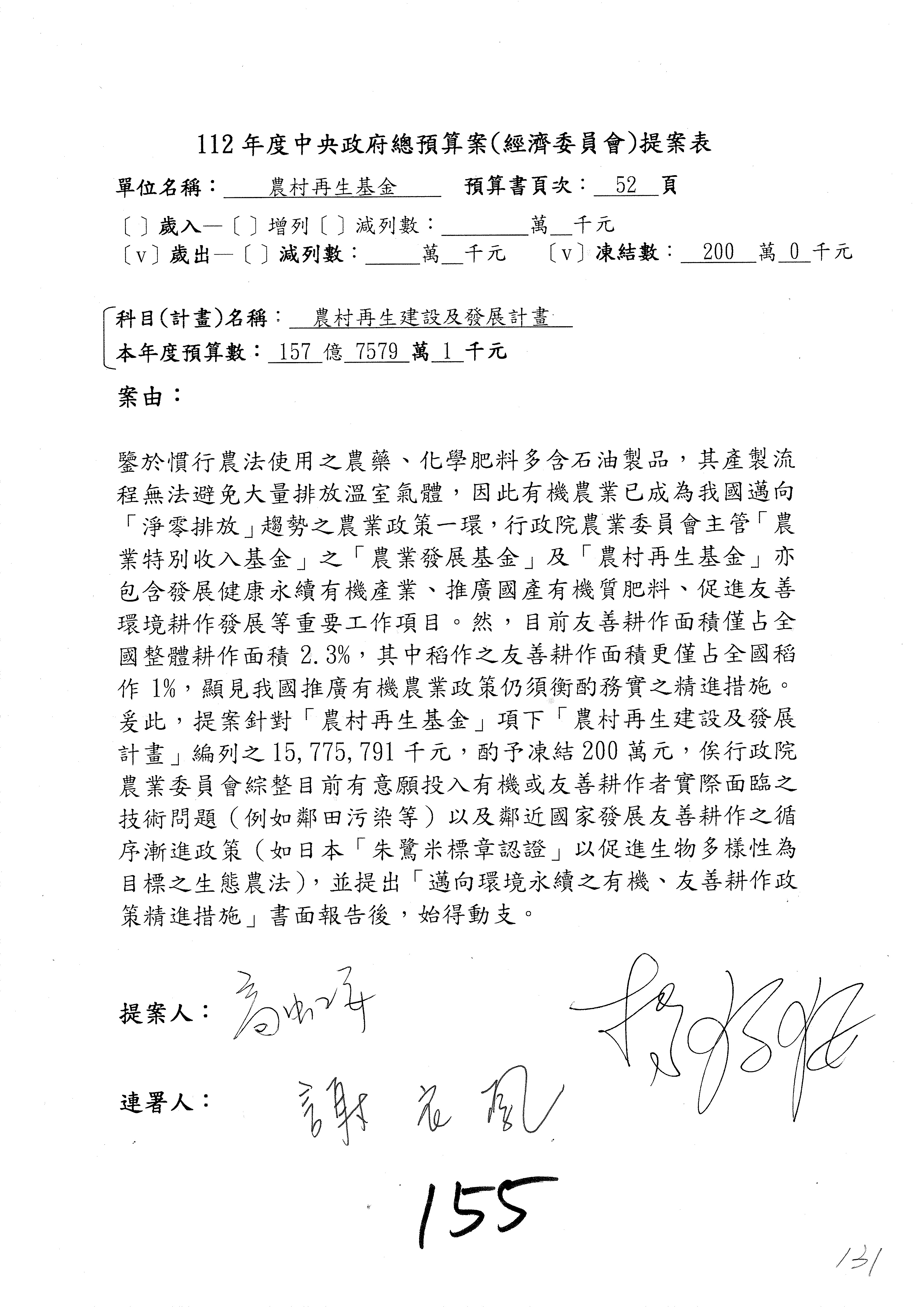 第153案到第168案,農村再生基金凍結2,000萬元,提出書面報告後始得動支。