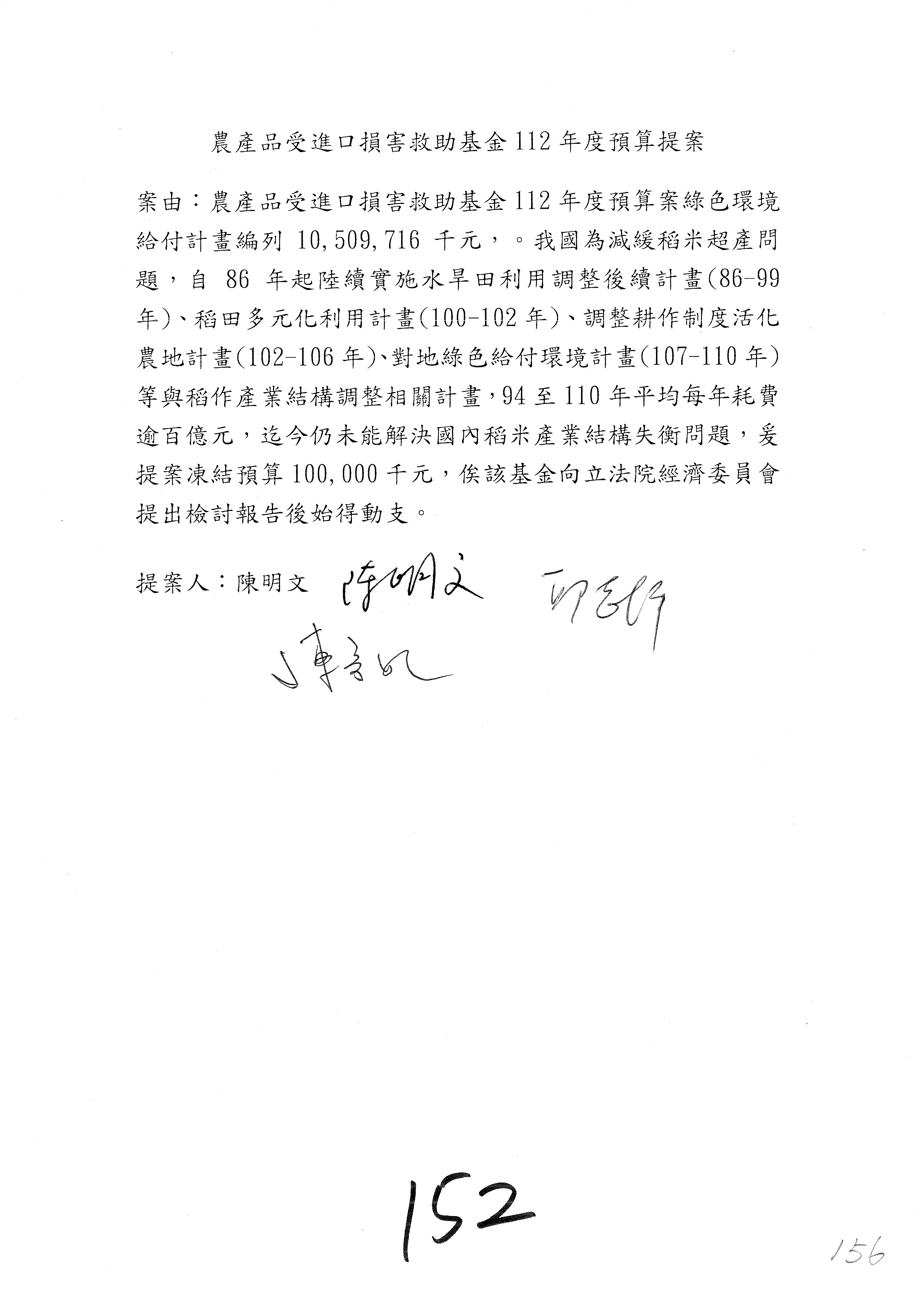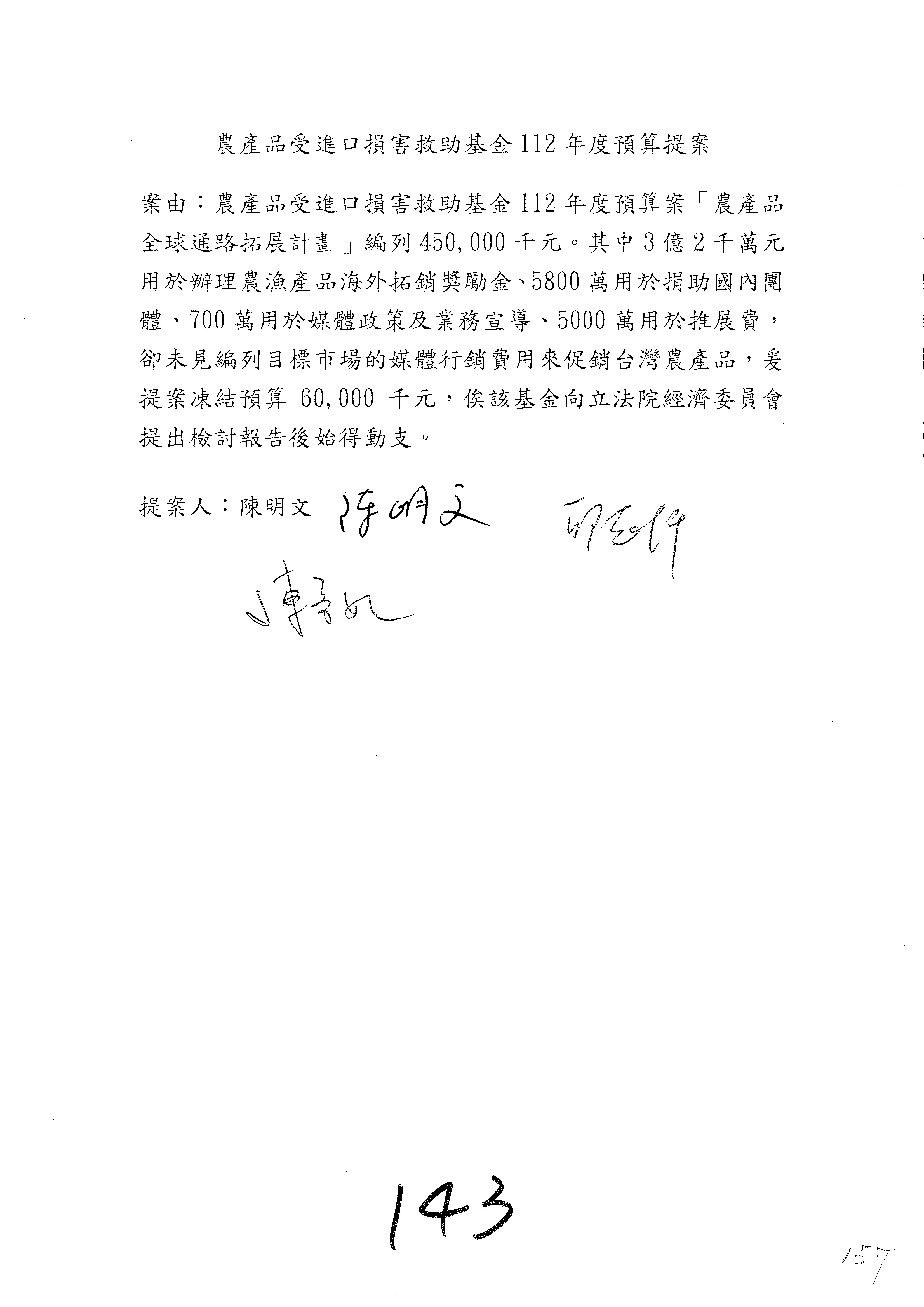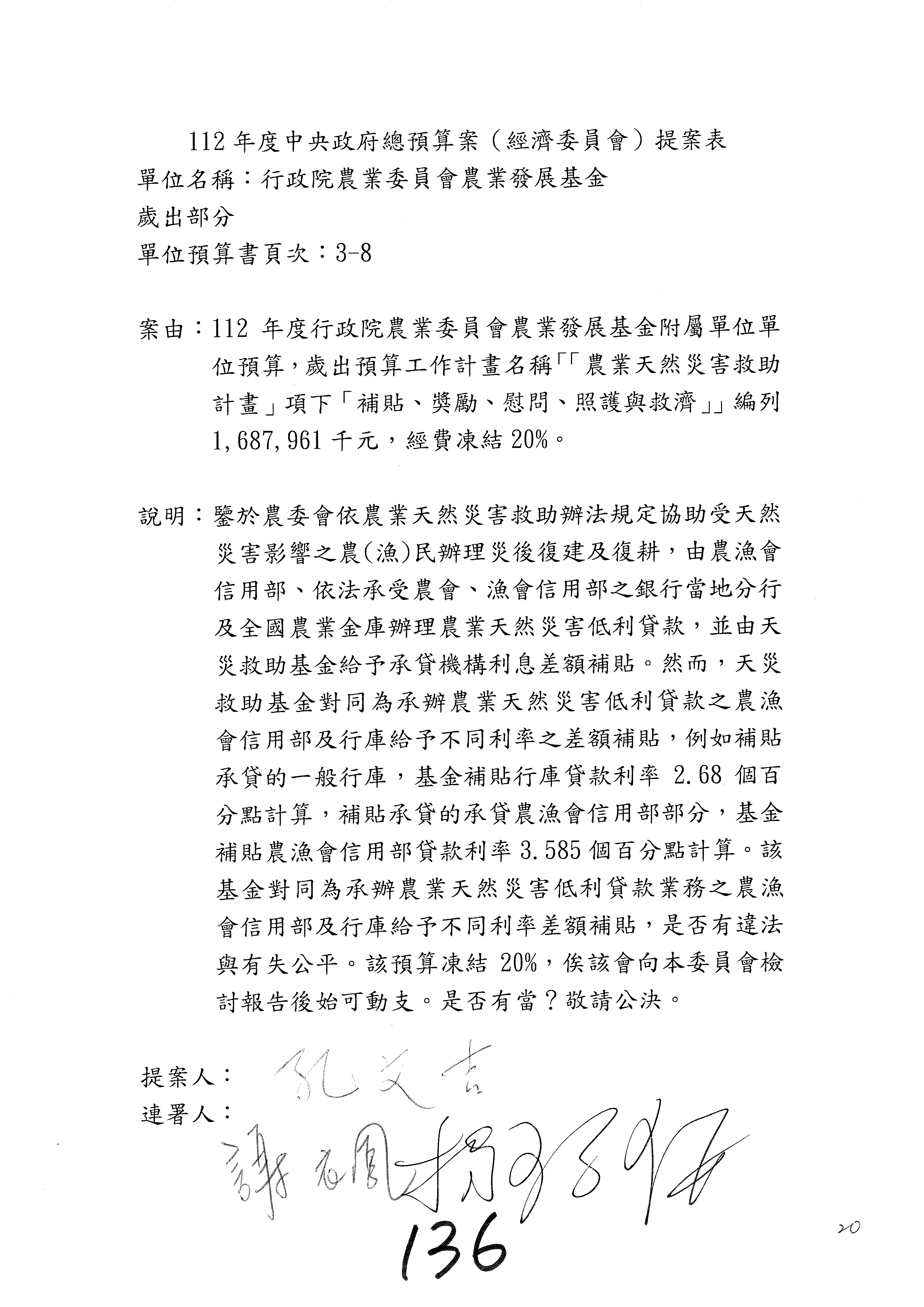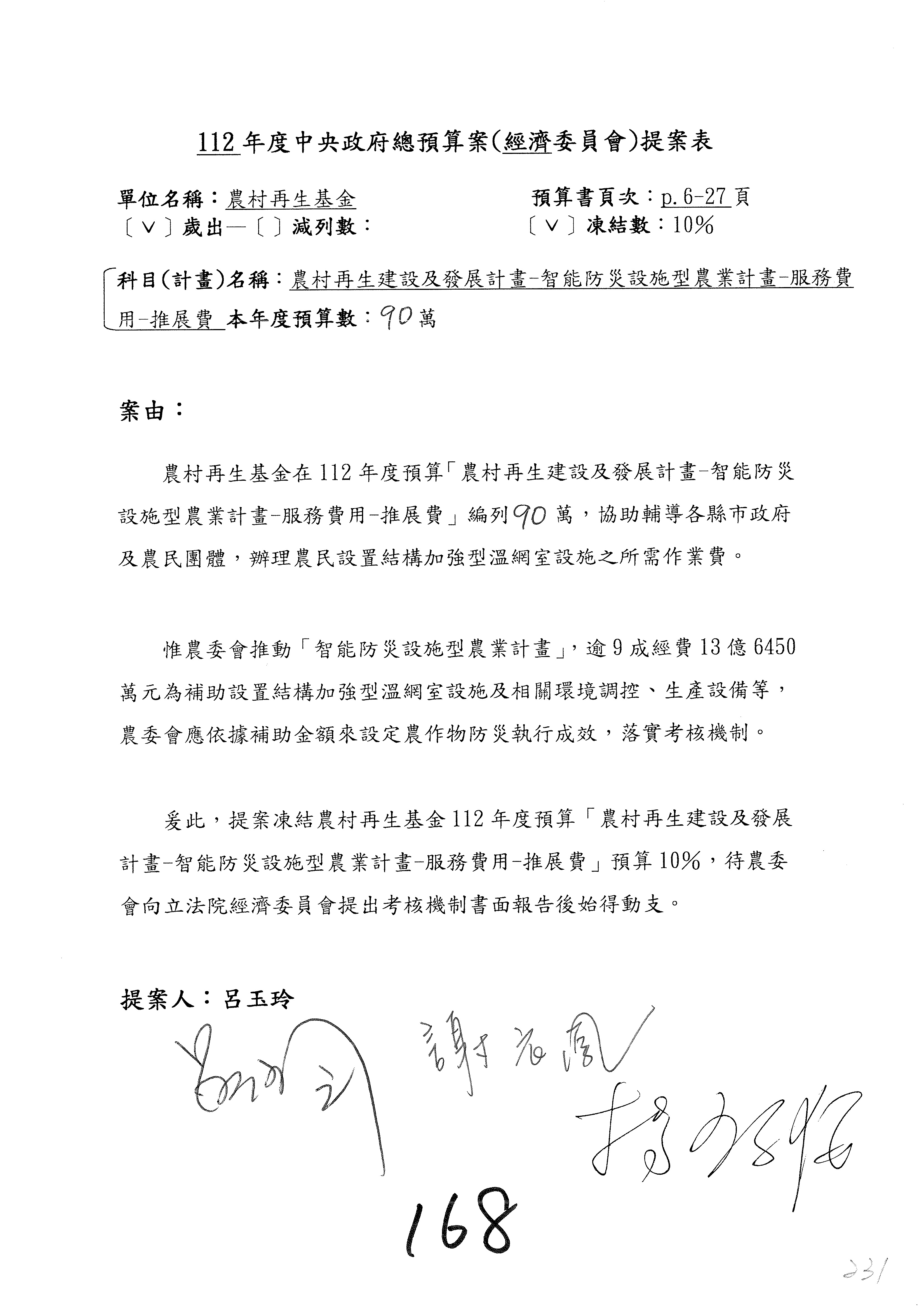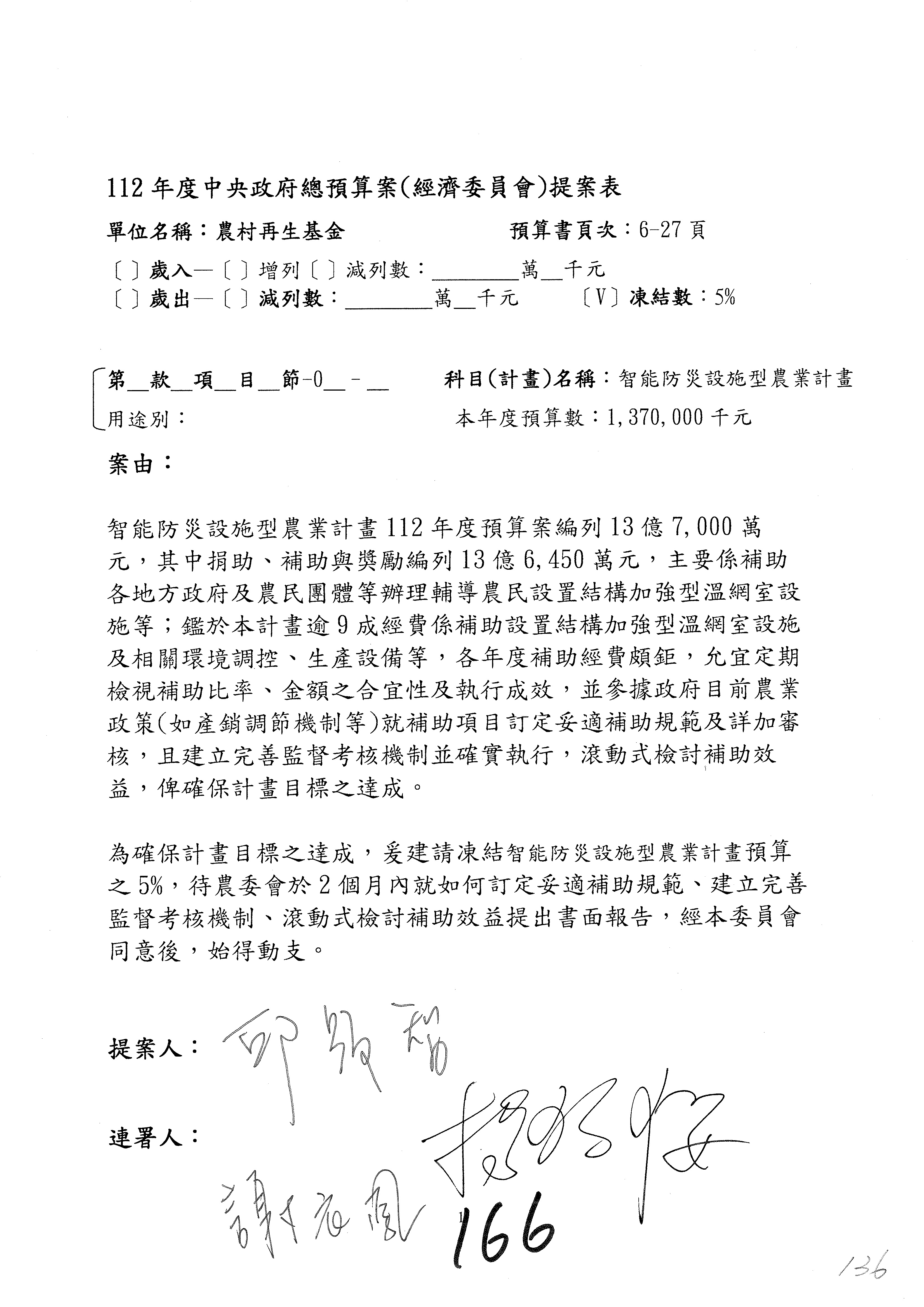 第153案到第168案,農村再生基金凍結2,000萬元,提出書面報告後始得動支。