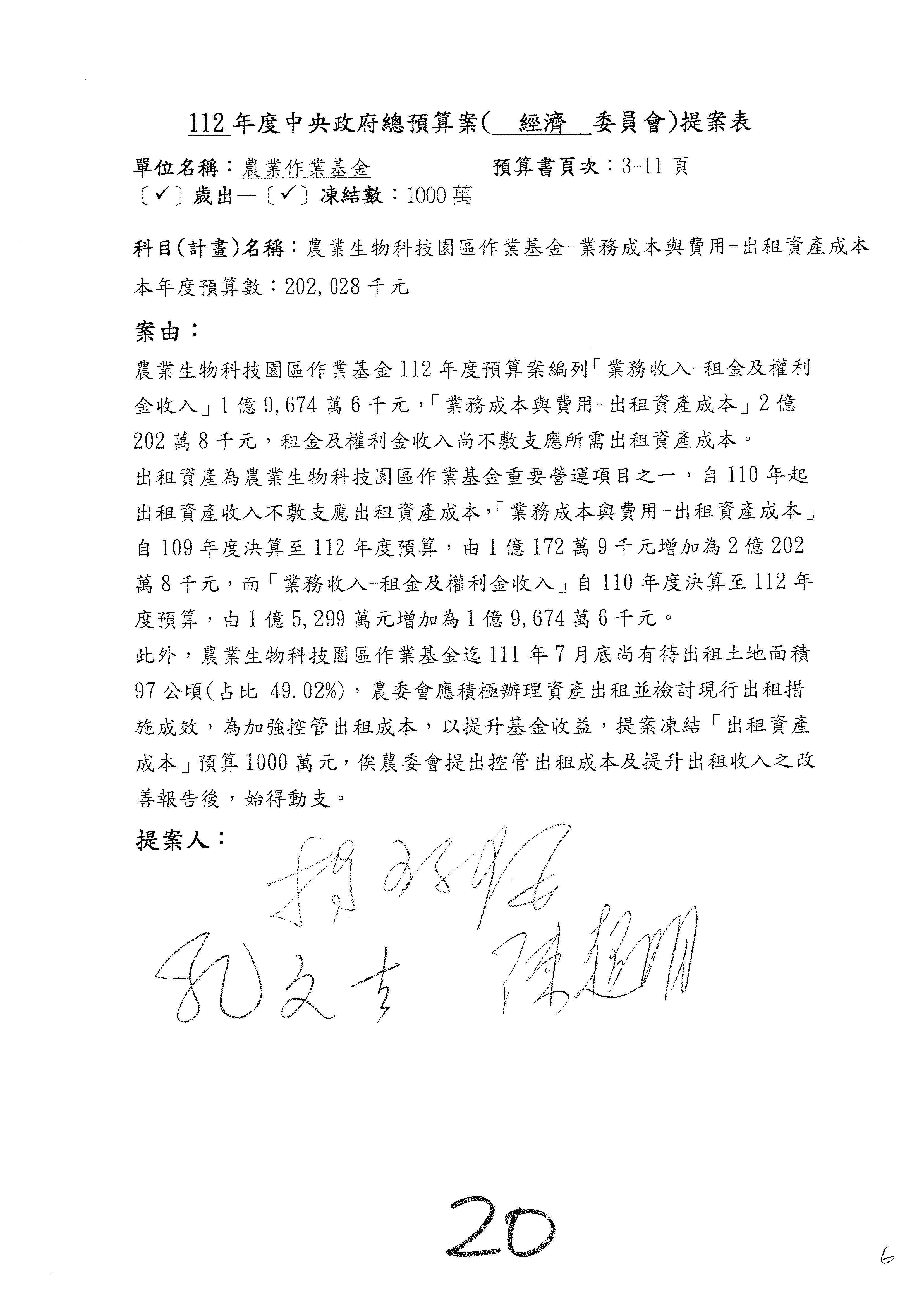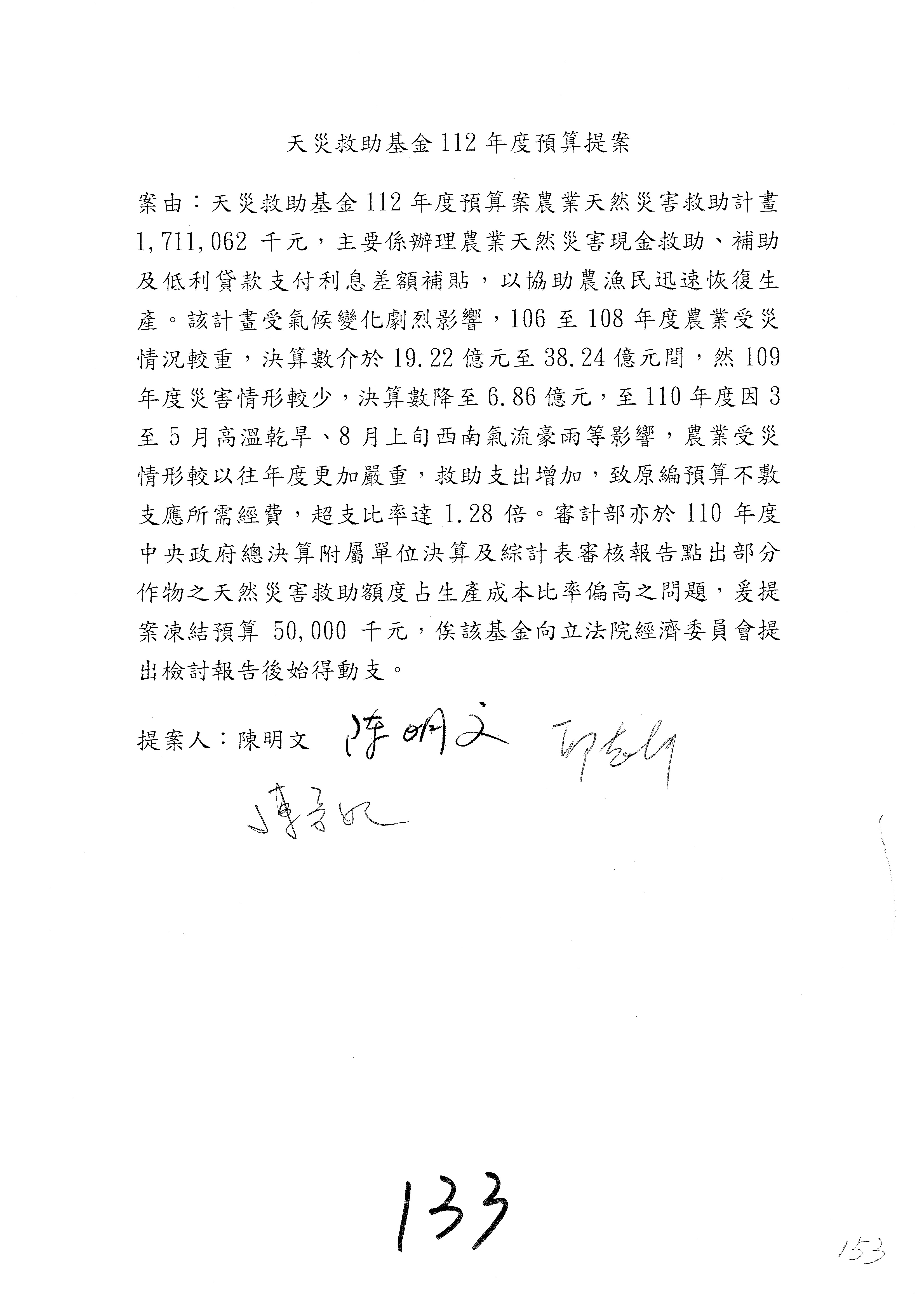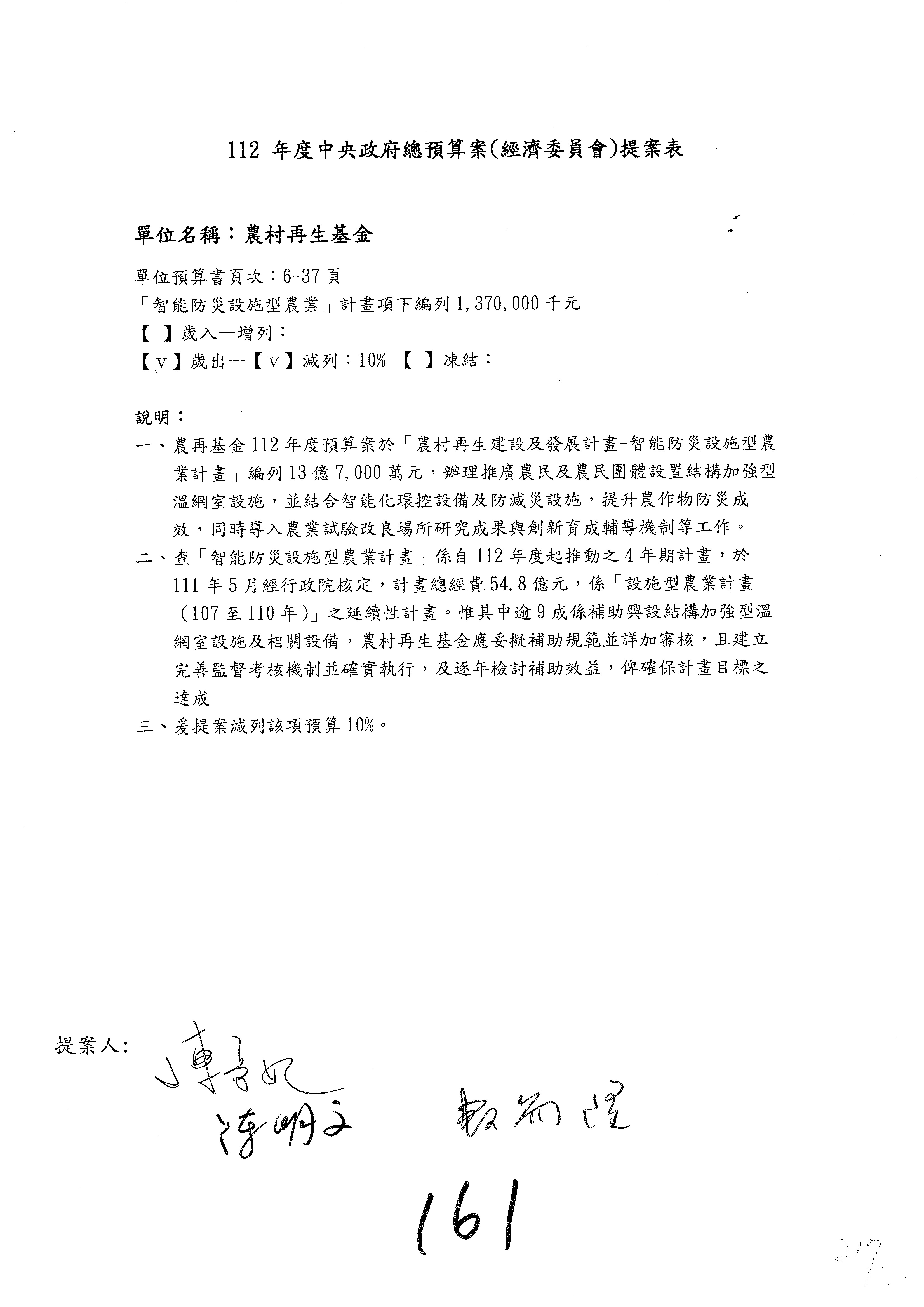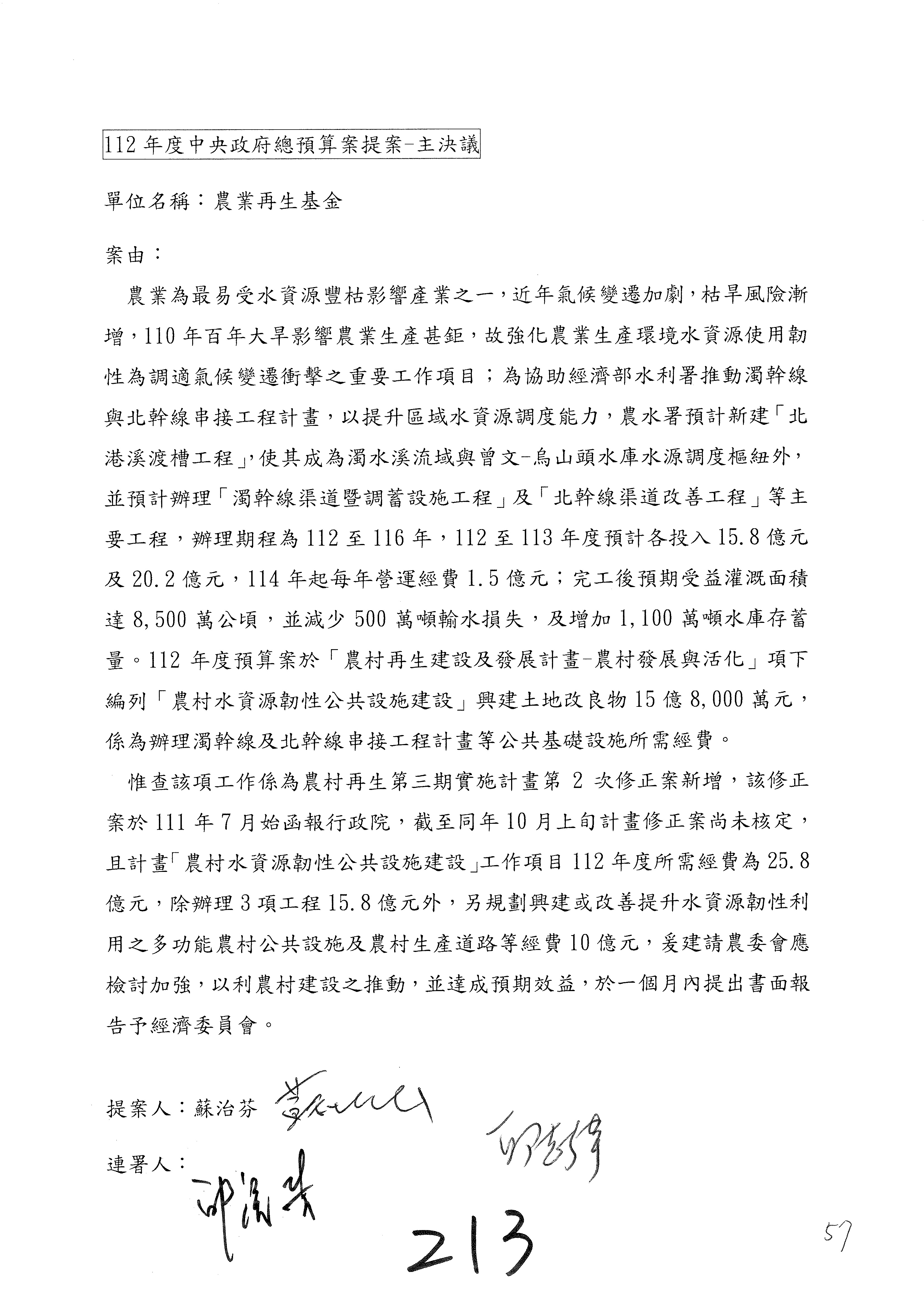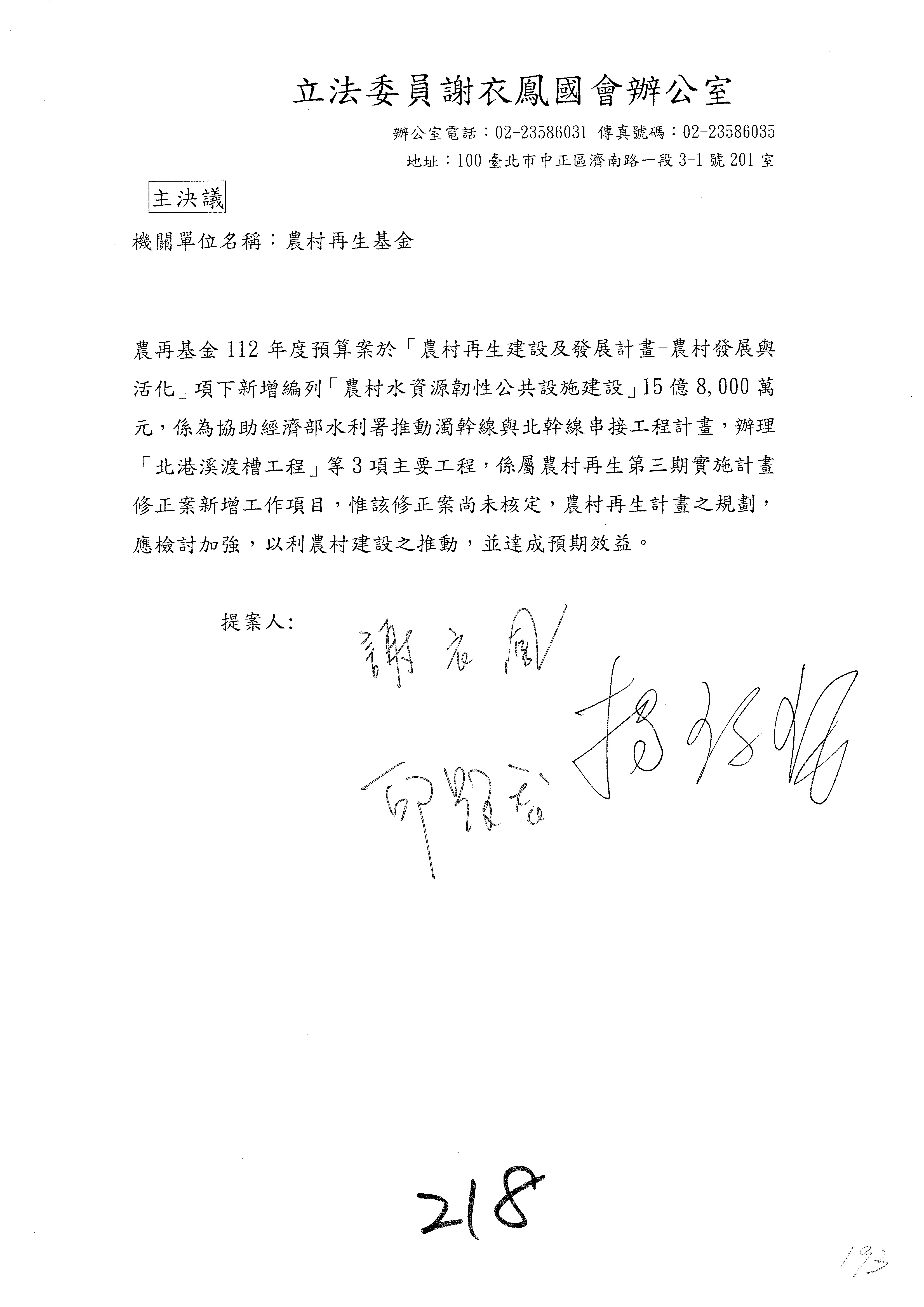 第153案到第168案,農村再生基金凍結2,000萬元,提出書面報告後始得動支。
