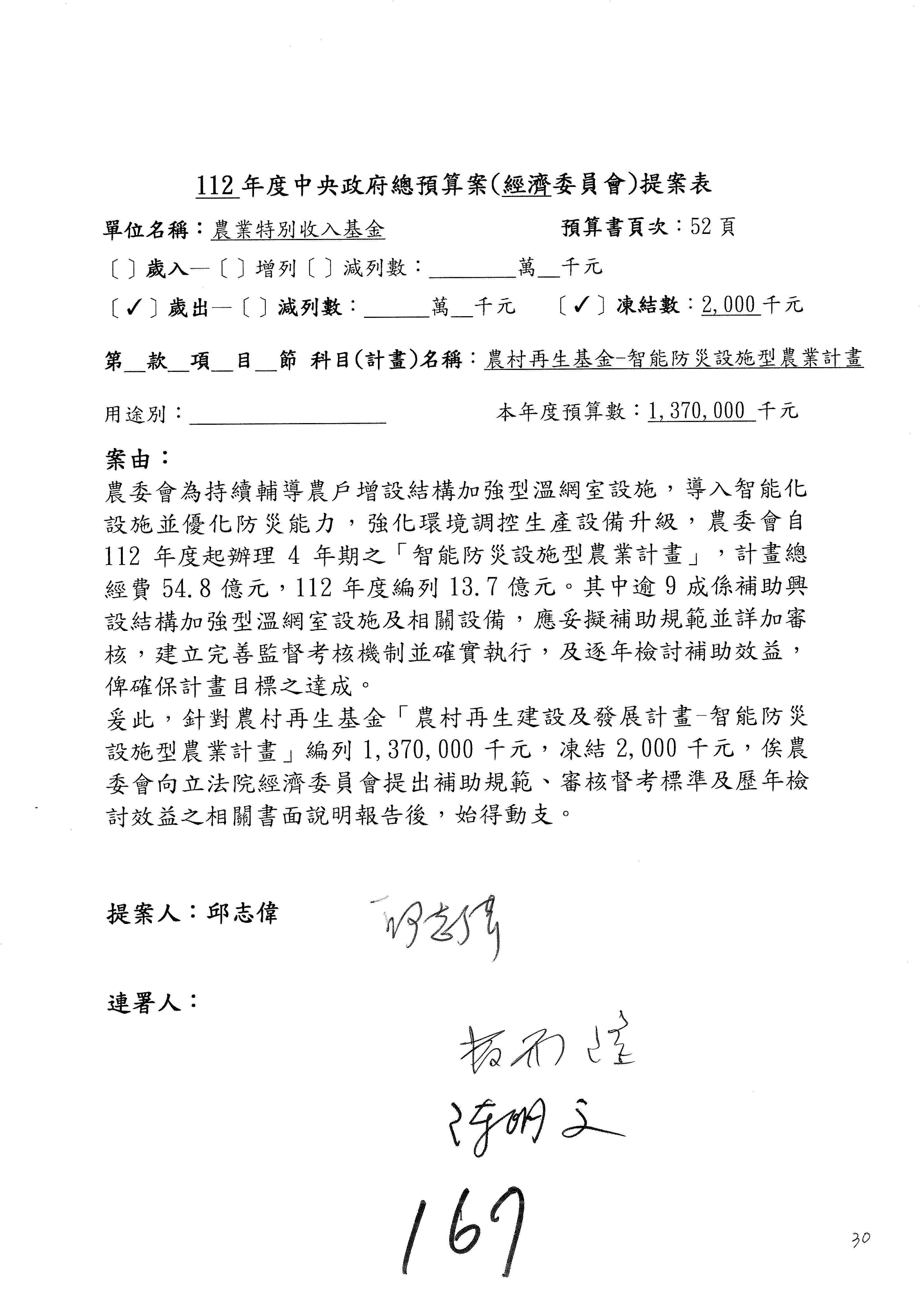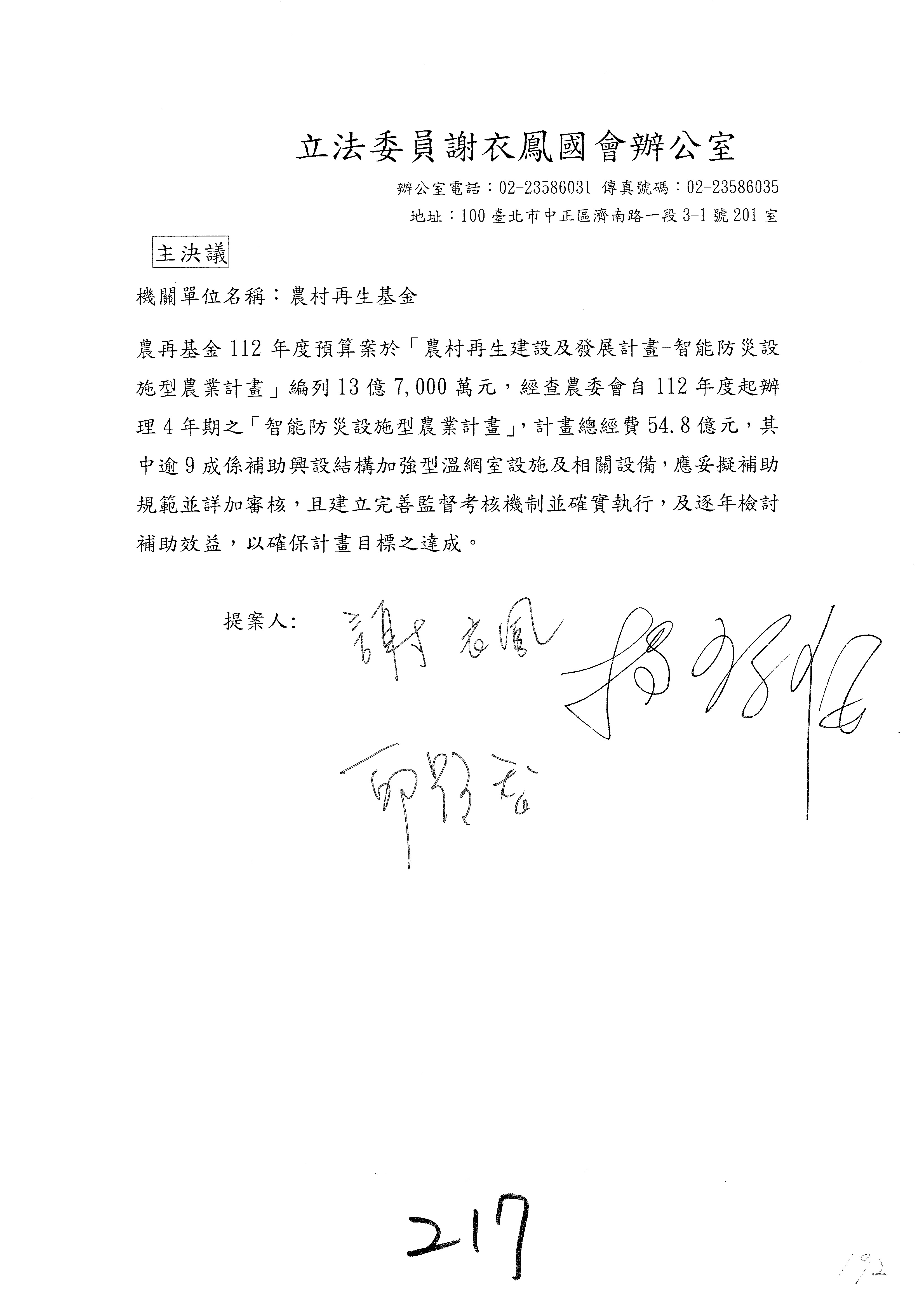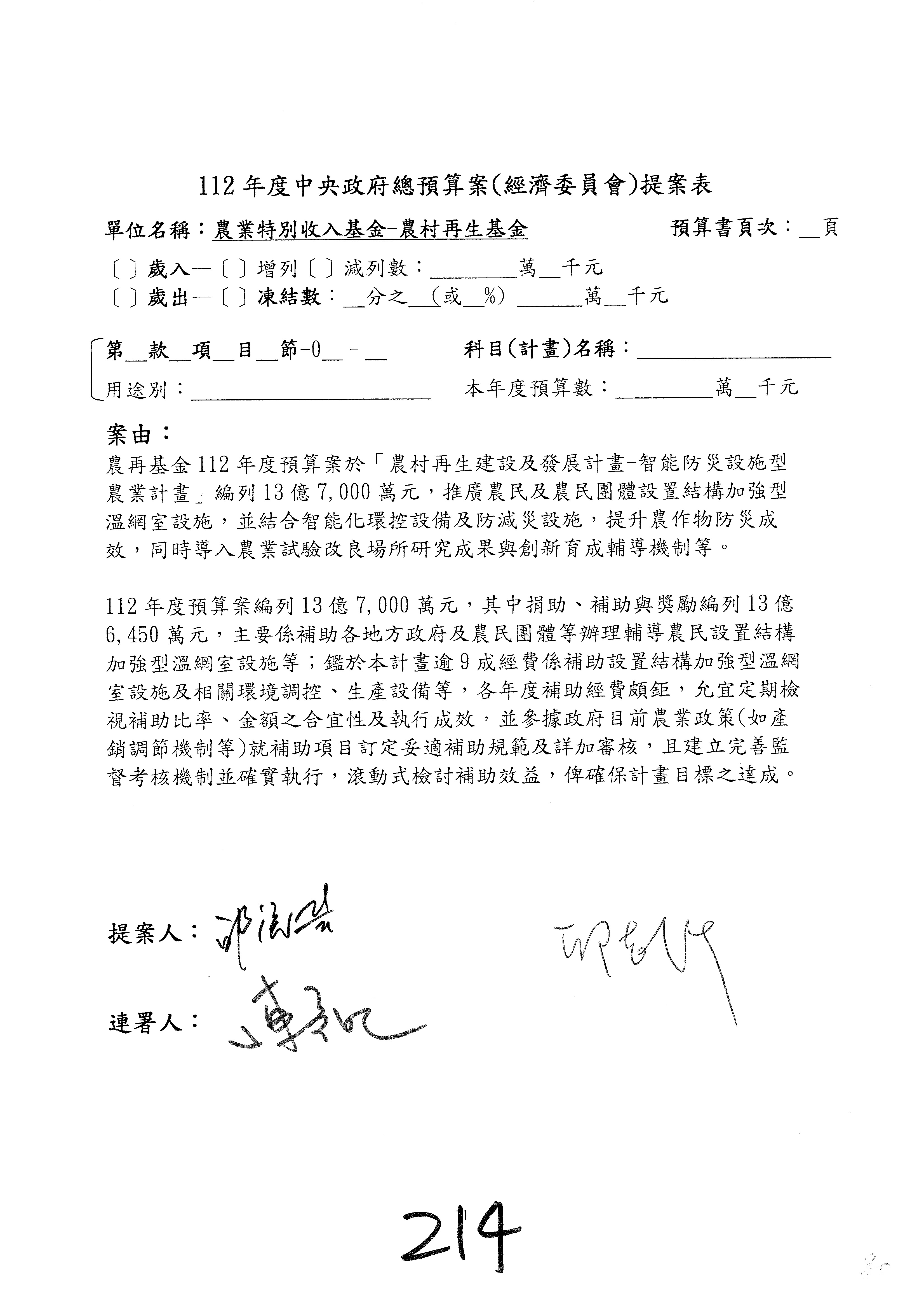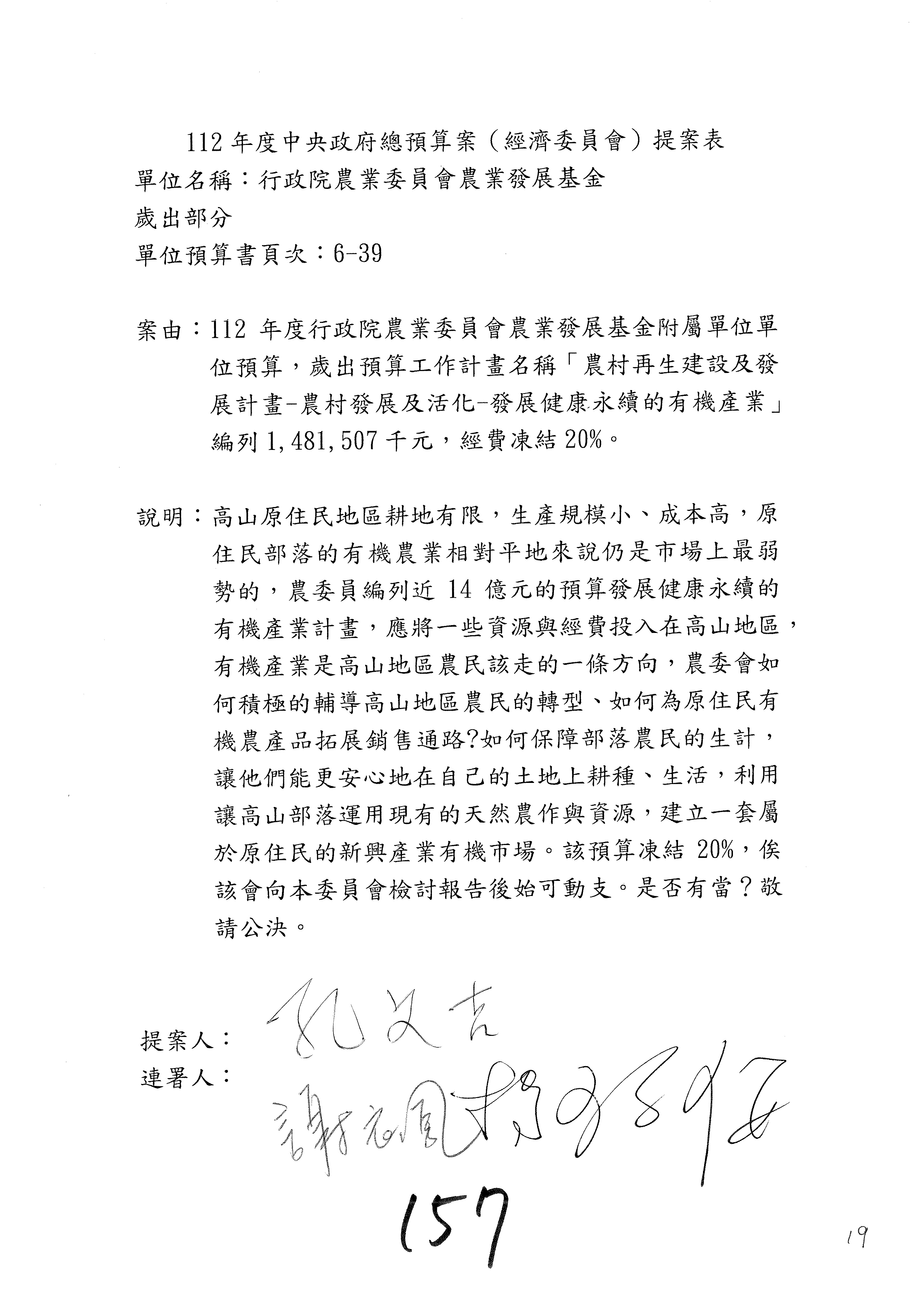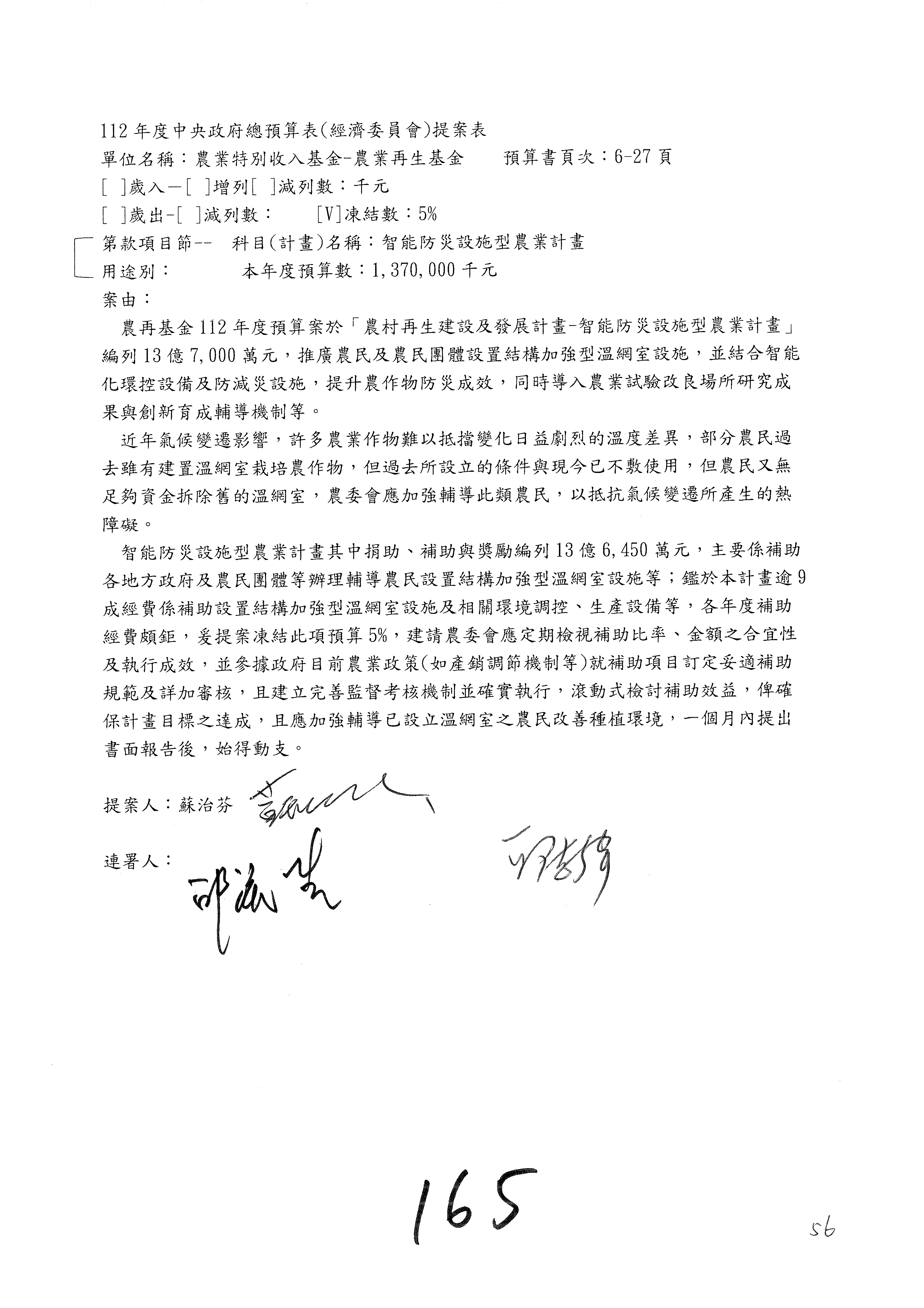 第153案到第168案,農村再生基金凍結2,000萬元,提出書面報告後始得動支。