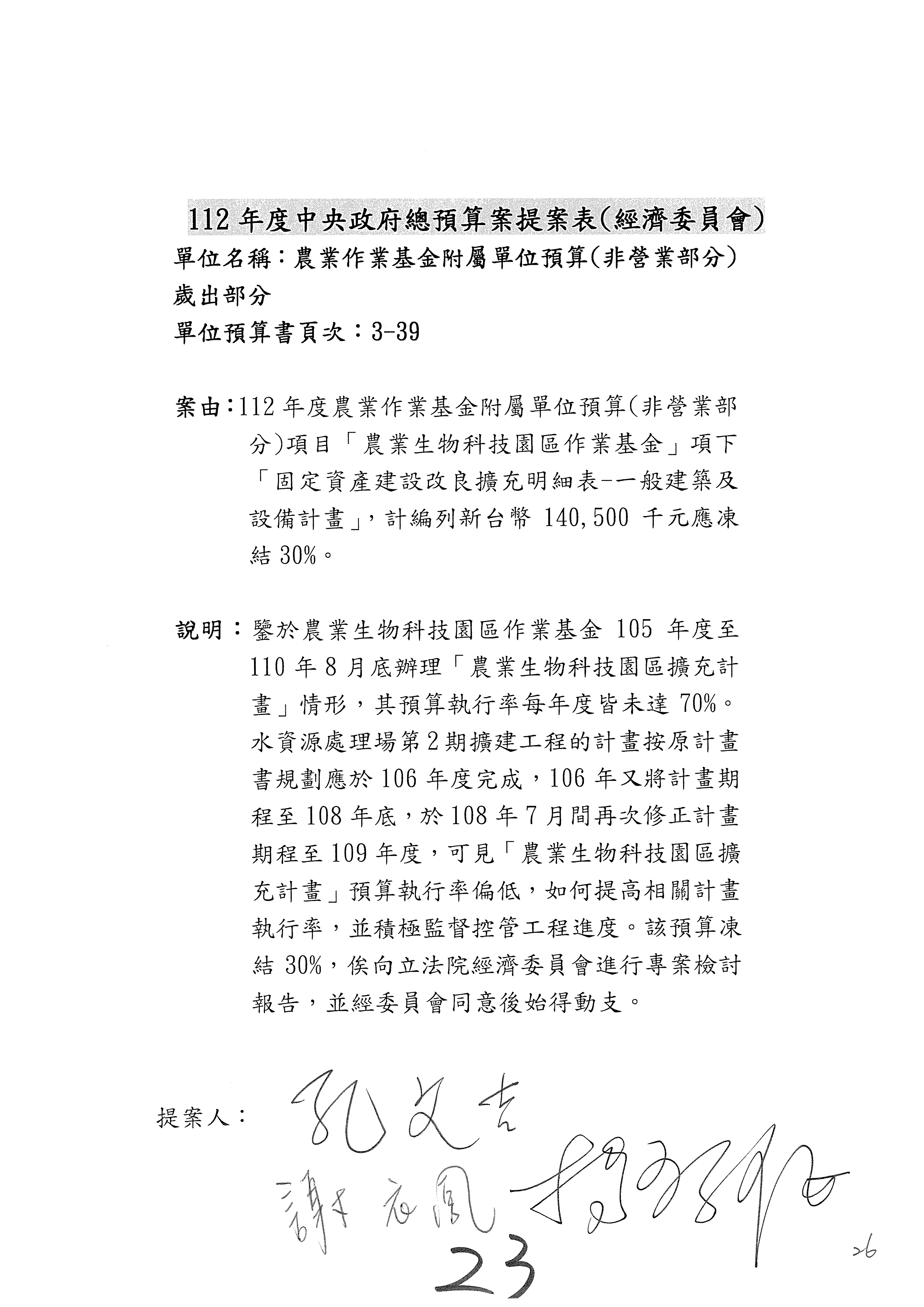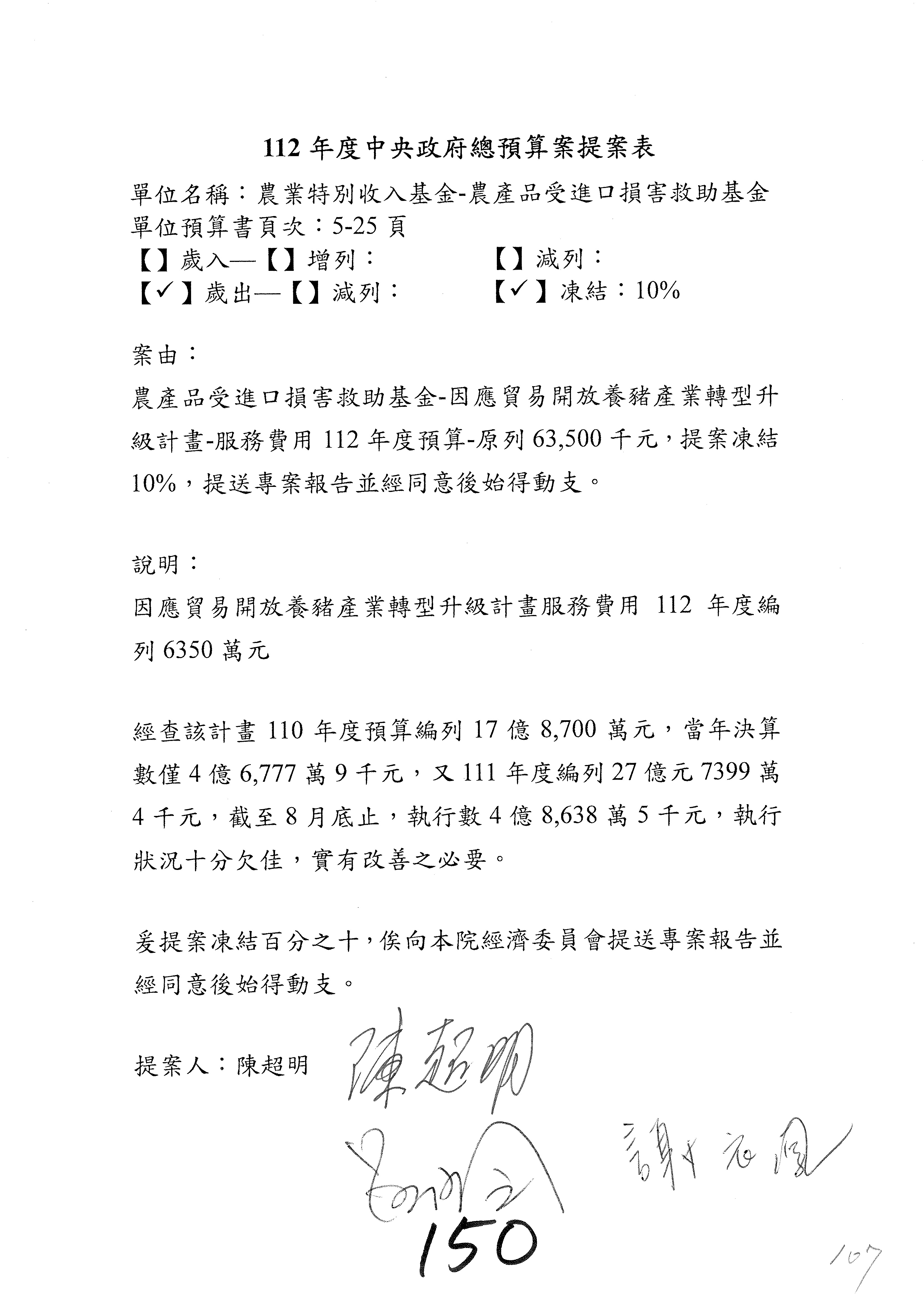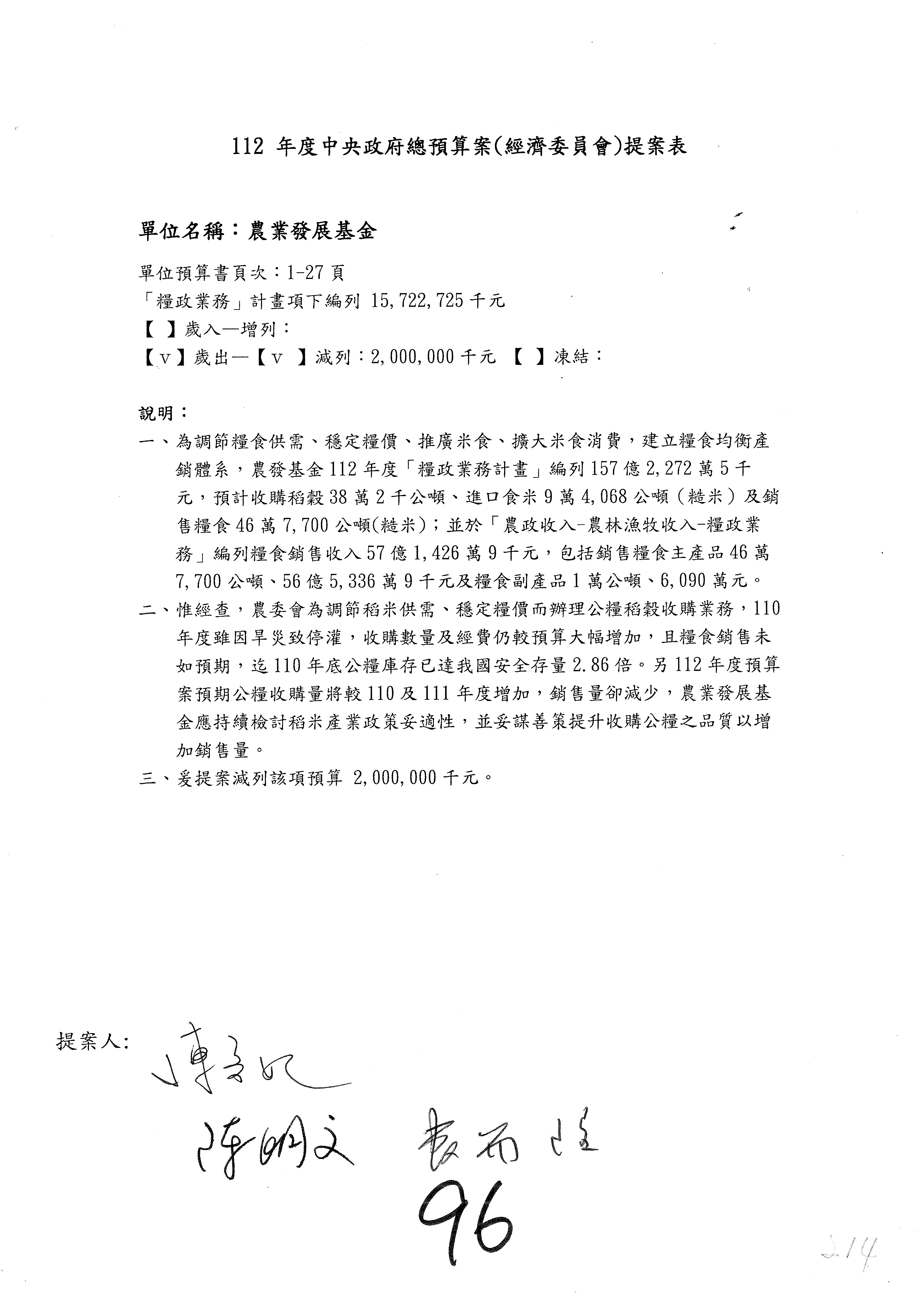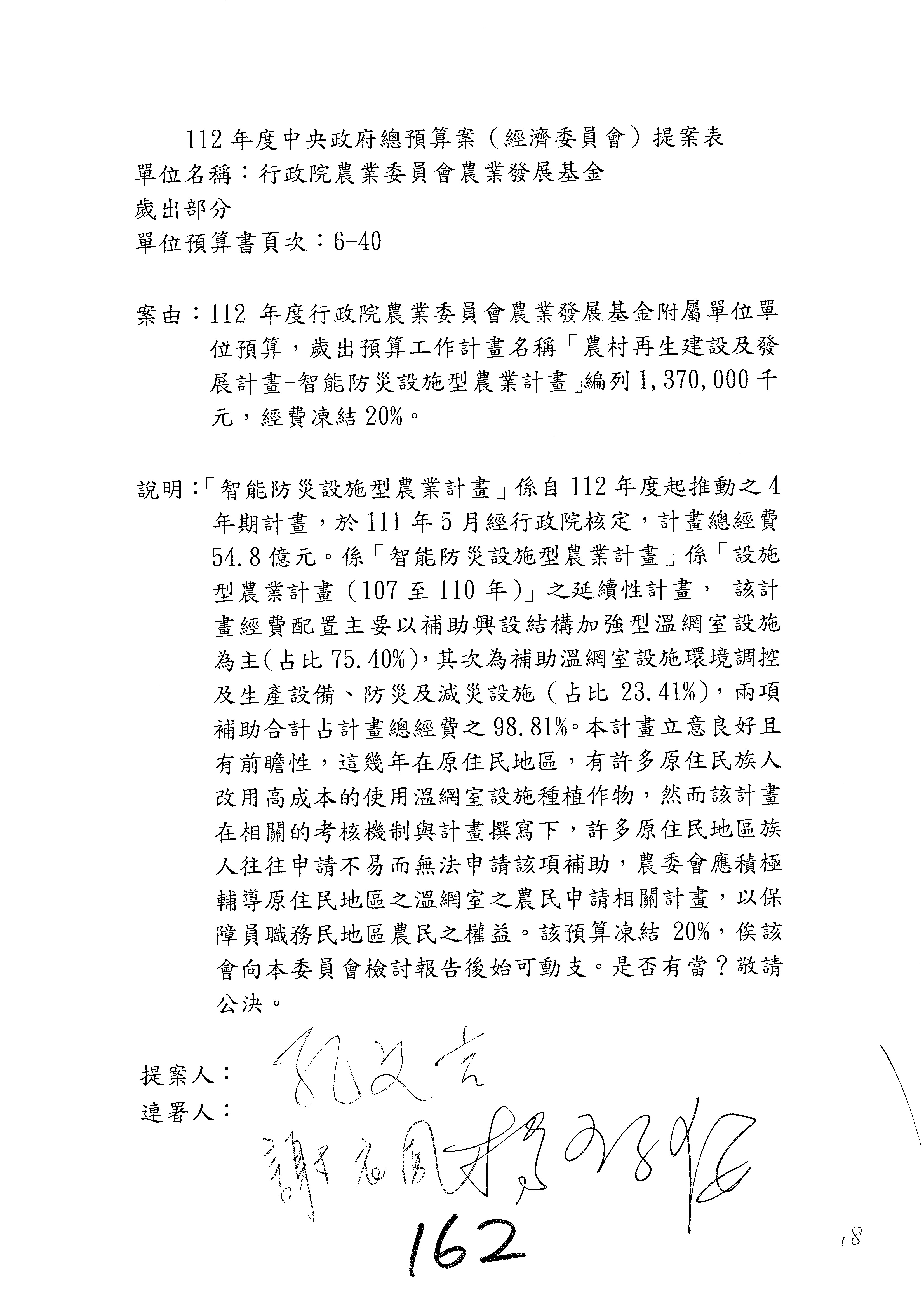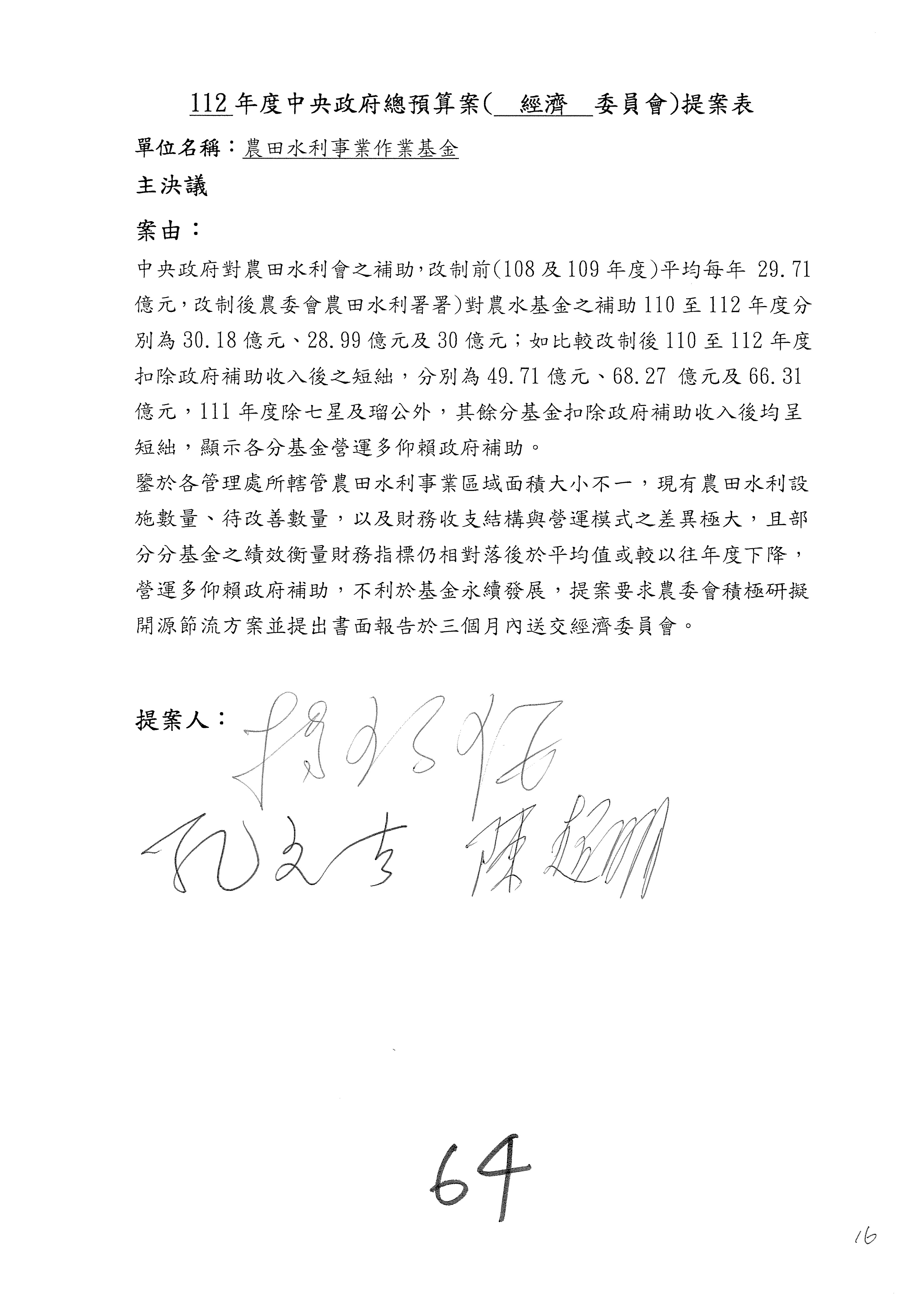 第153案到第168案,農村再生基金凍結2,000萬元,提出書面報告後始得動支。