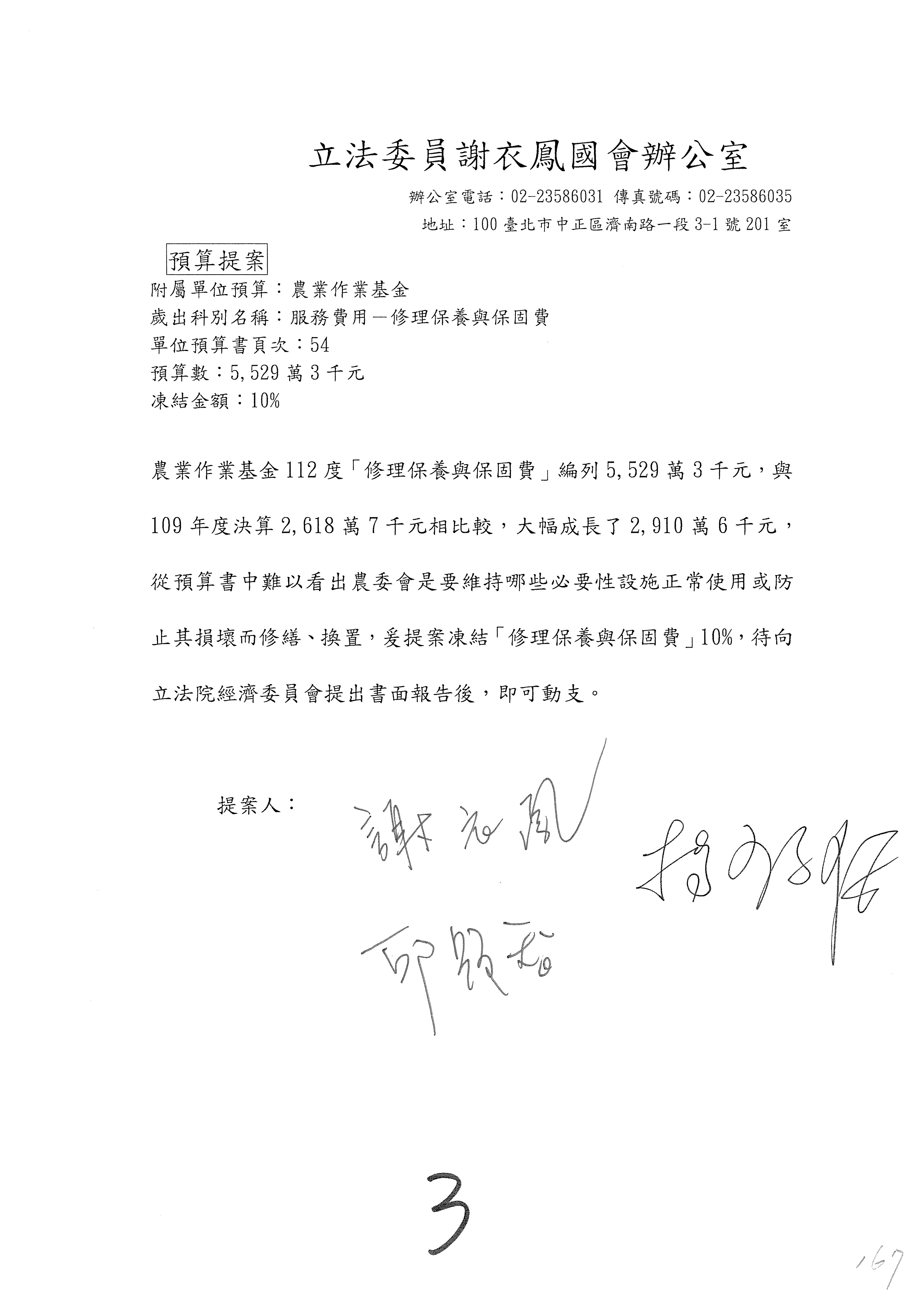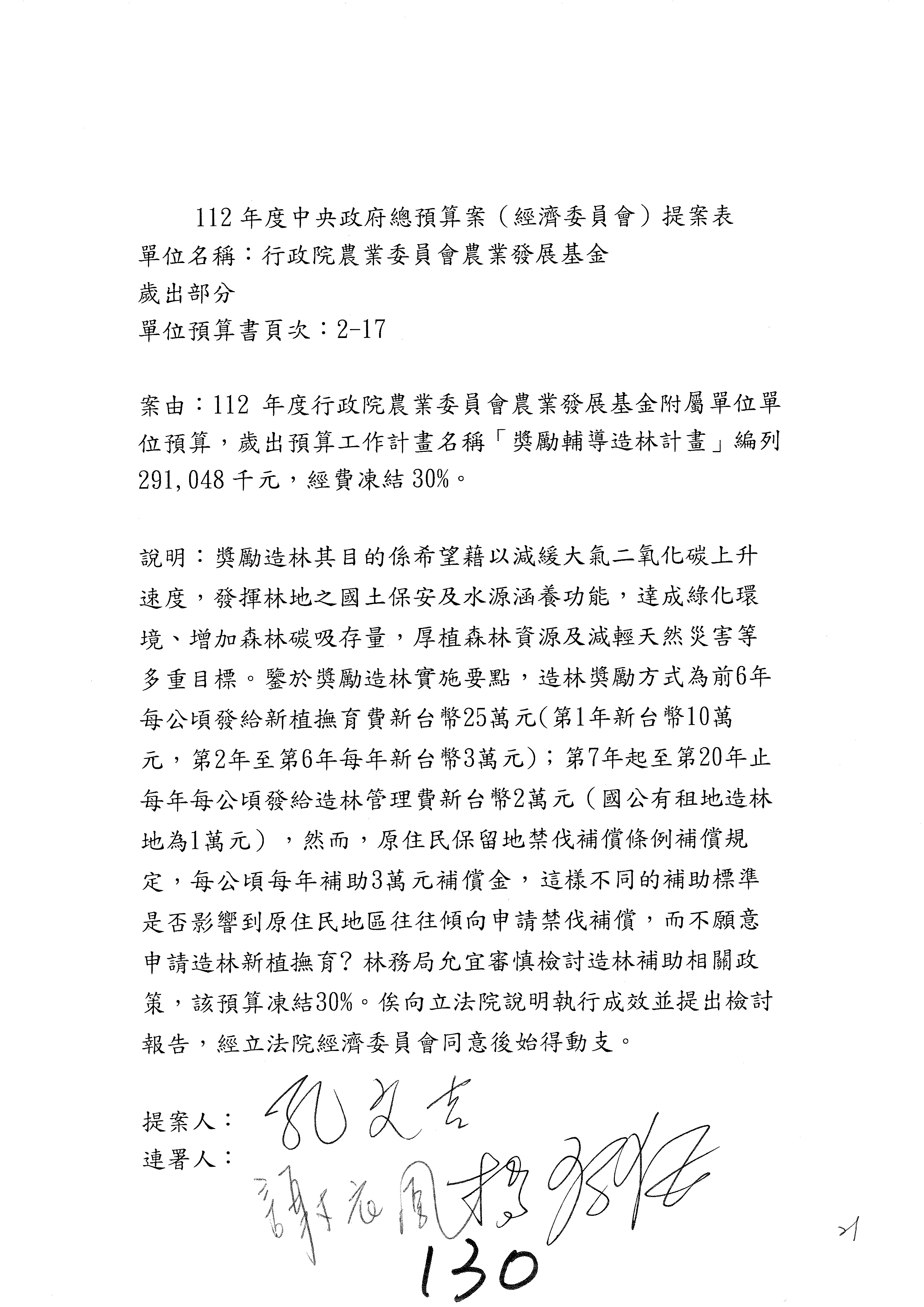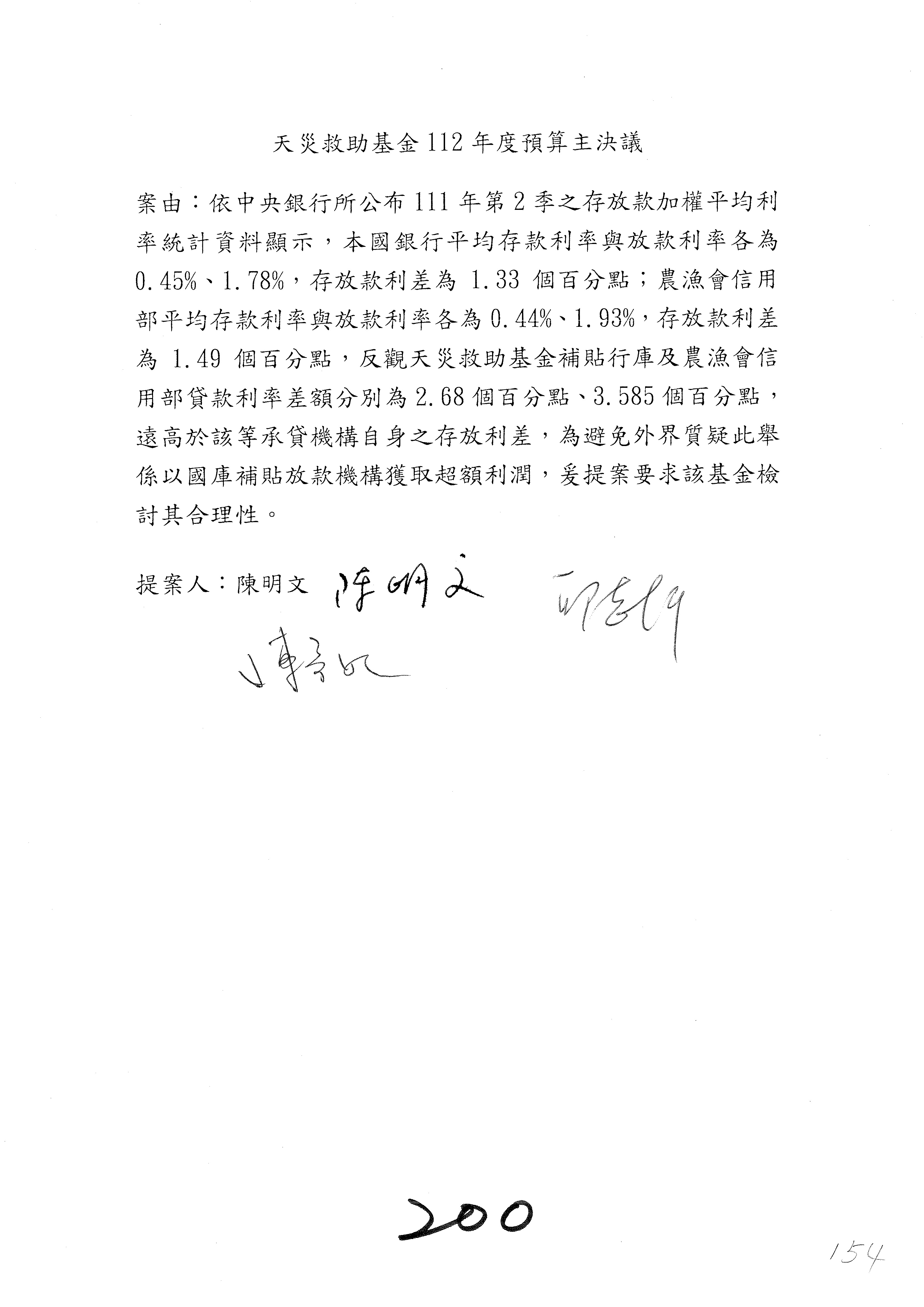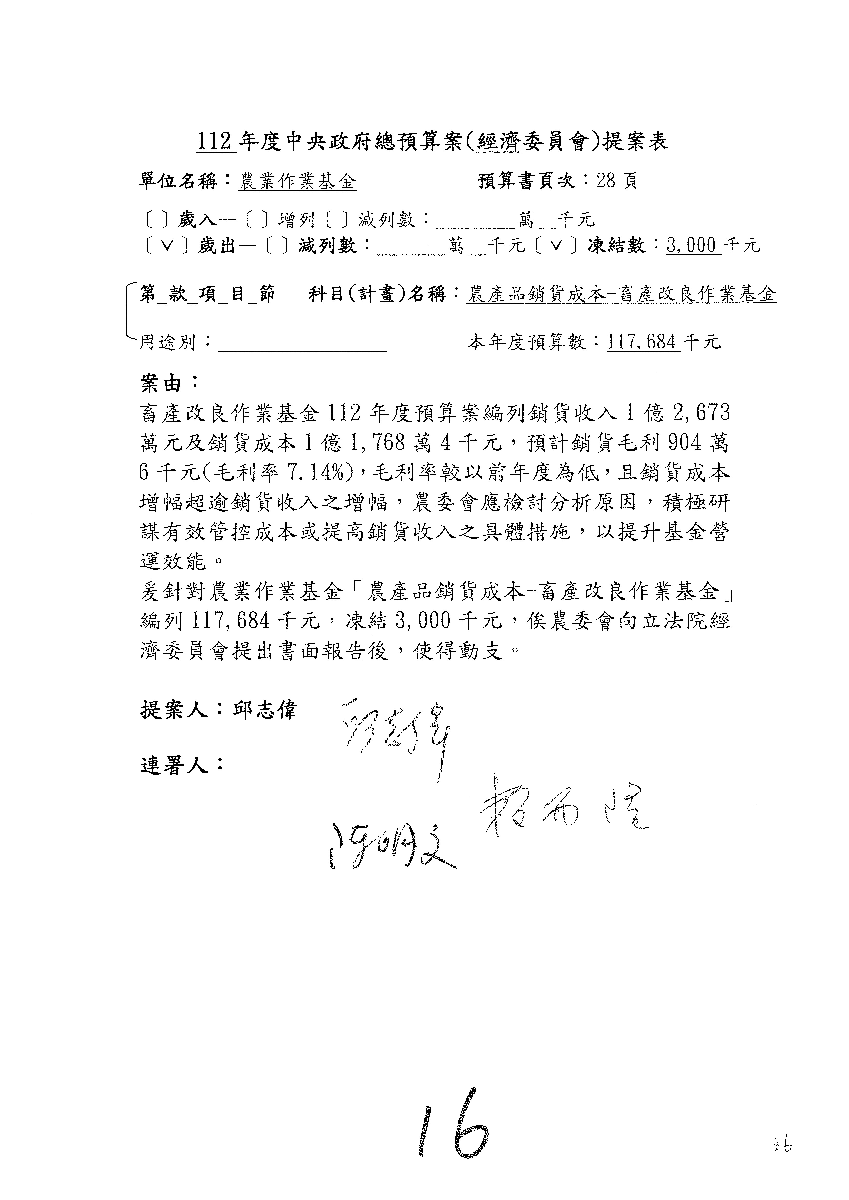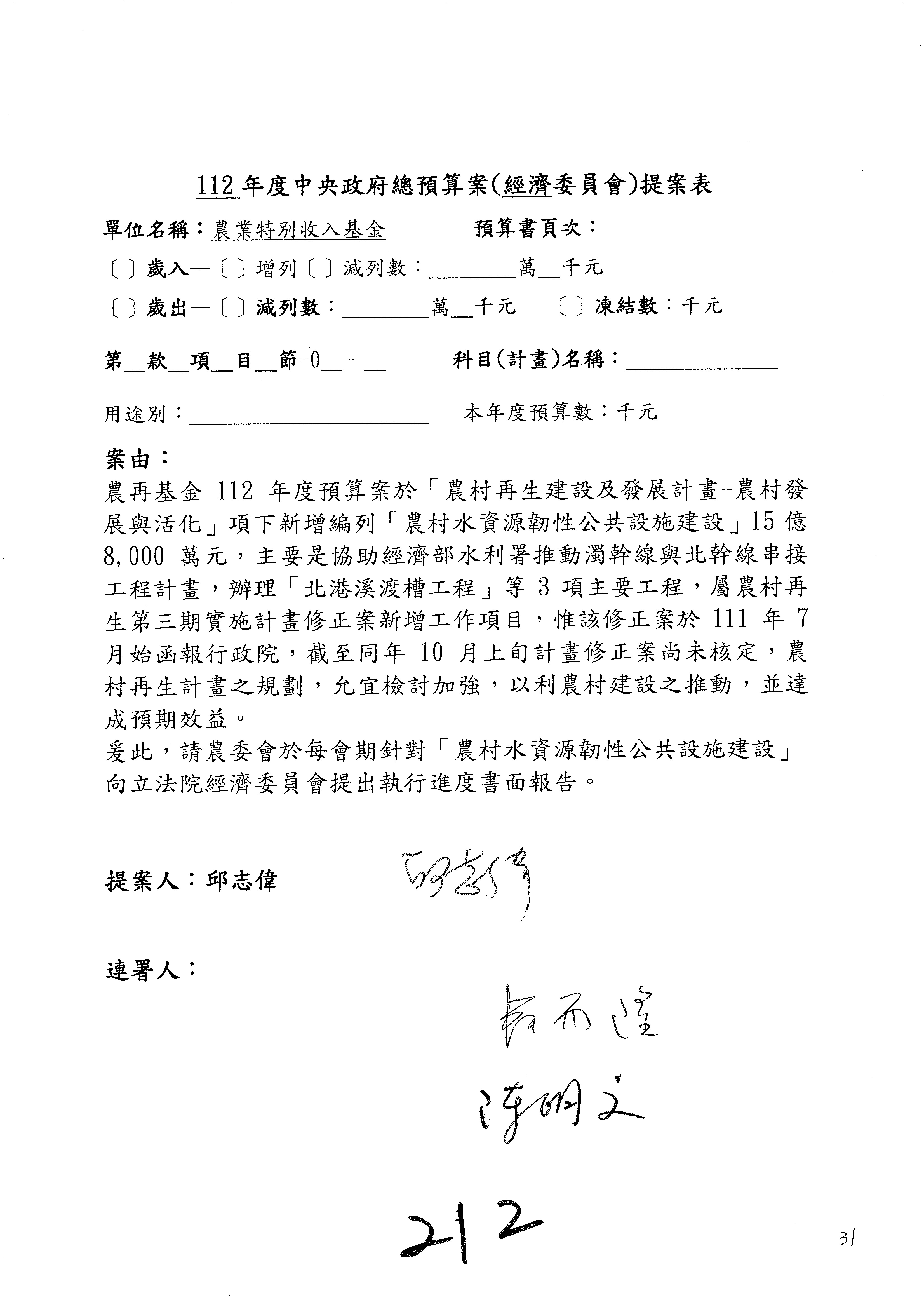 第153案到第168案,農村再生基金凍結2,000萬元,提出書面報告後始得動支。