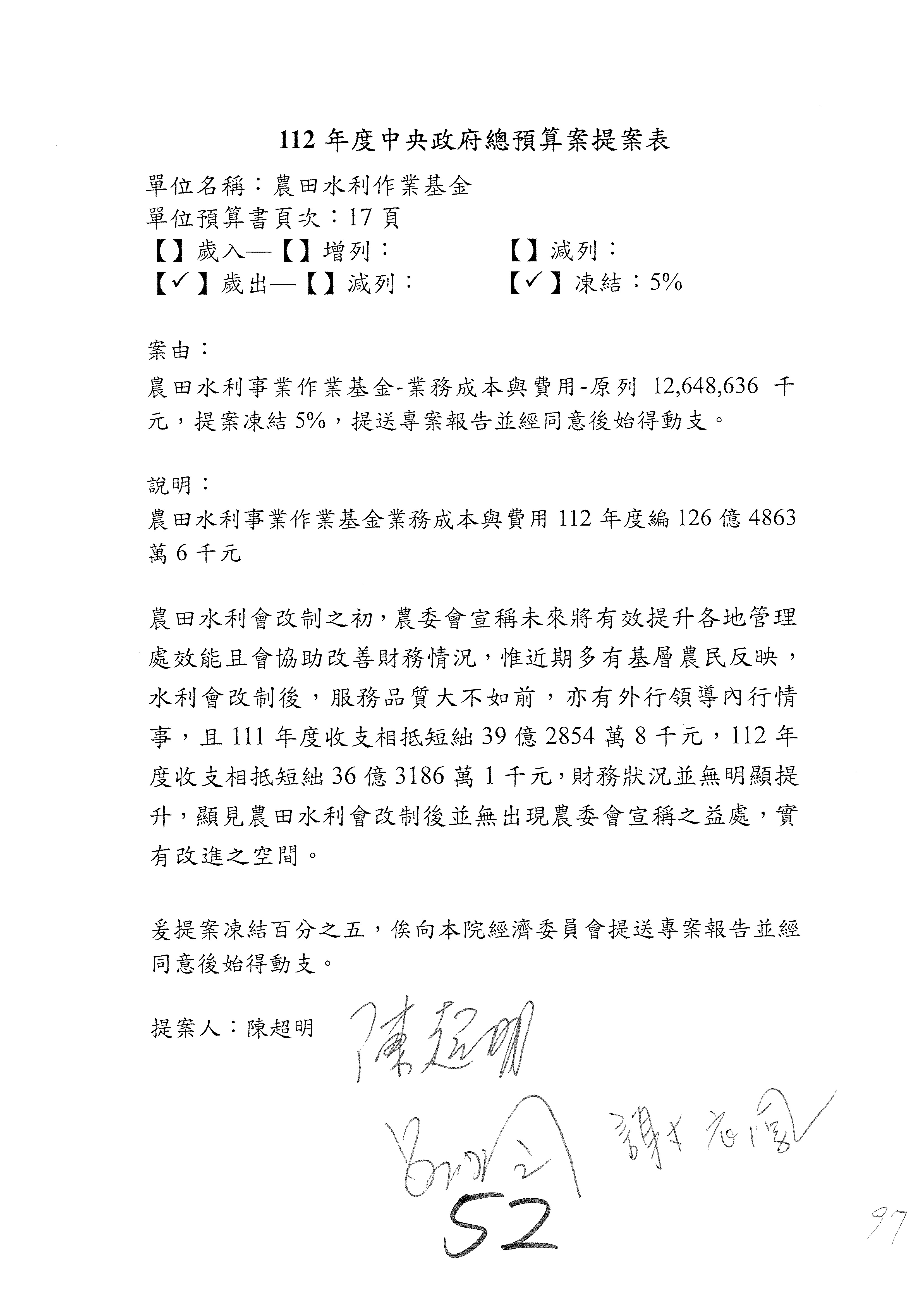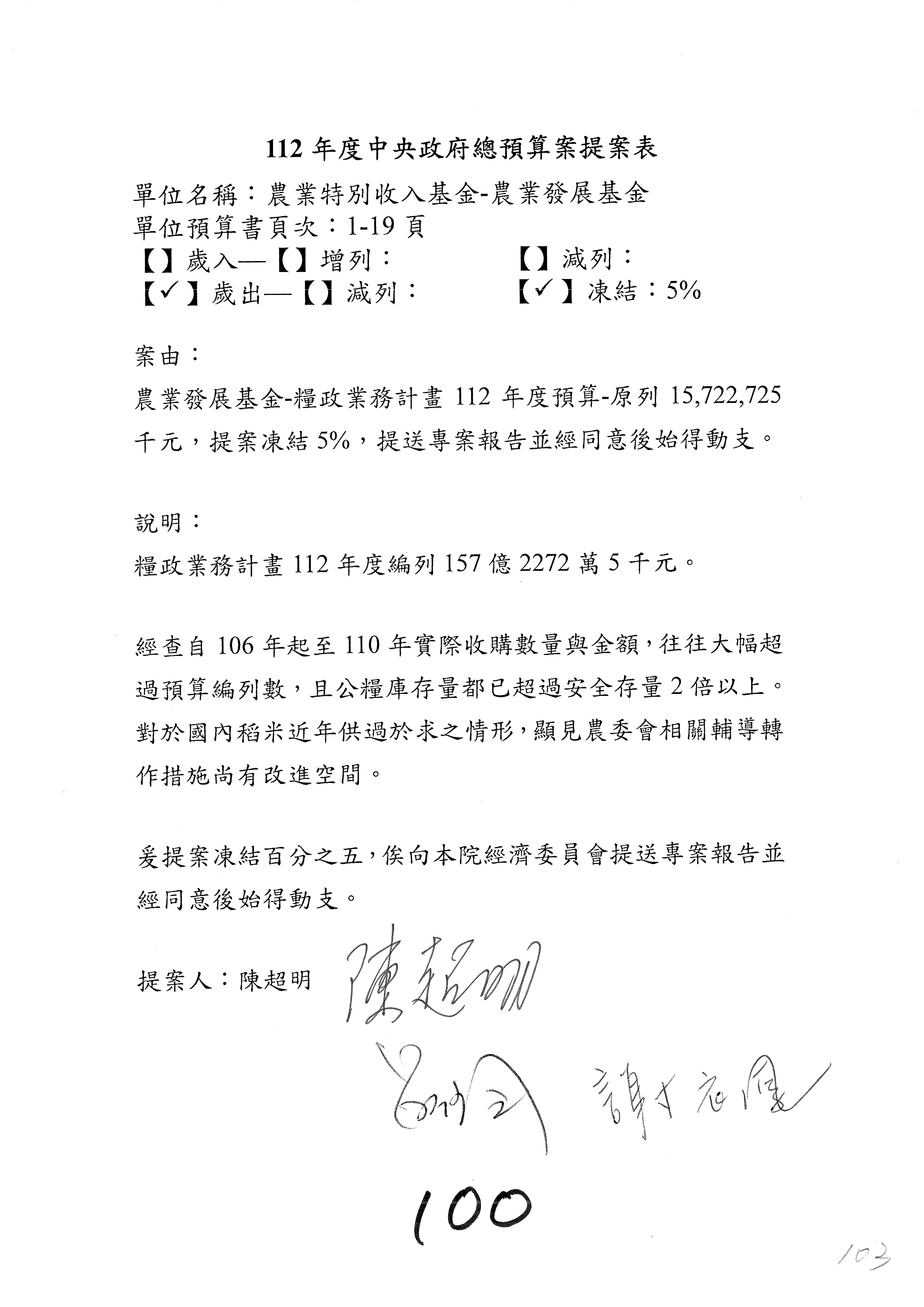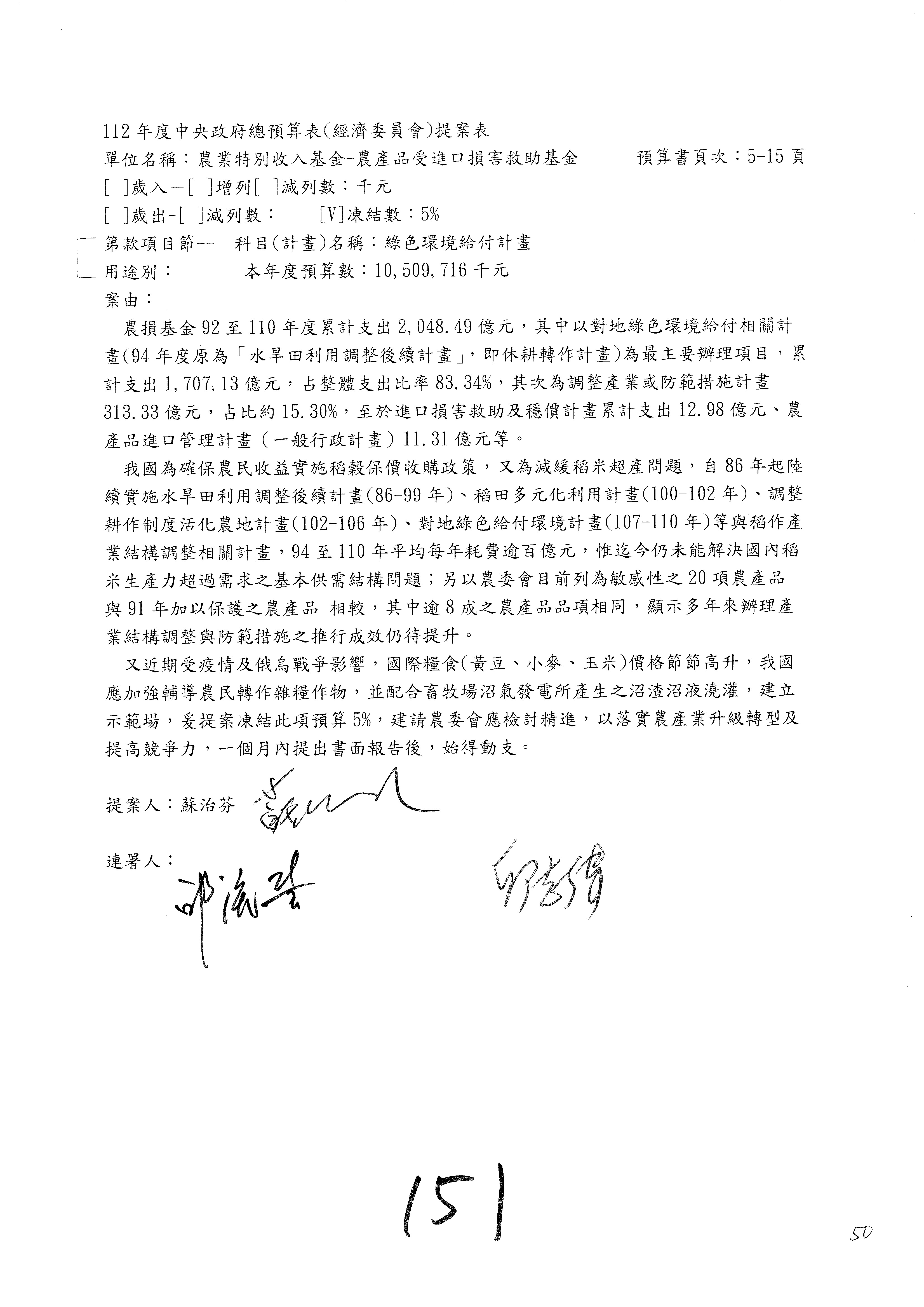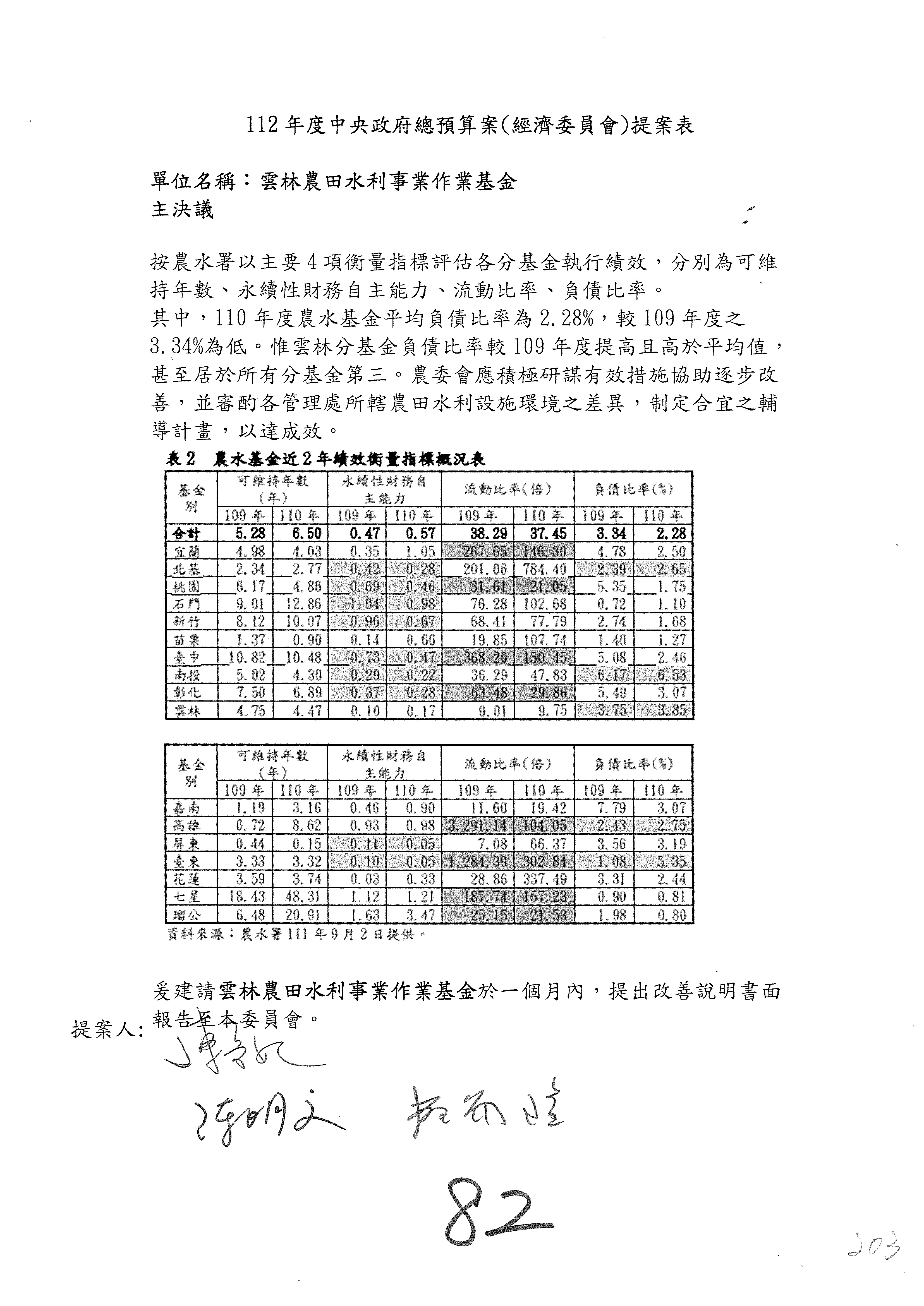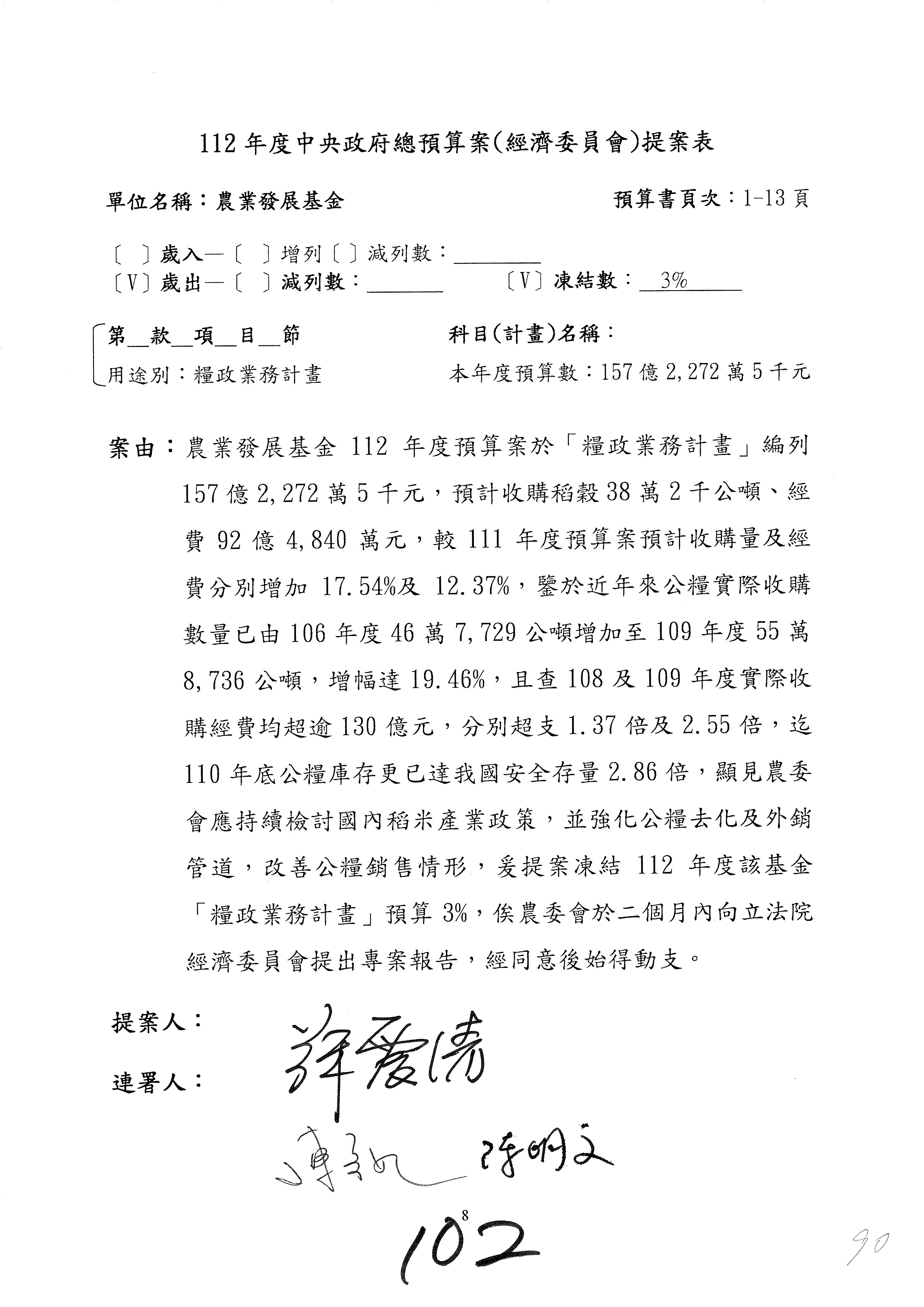 第153案到第168案,農村再生基金凍結2,000萬元,提出書面報告後始得動支。