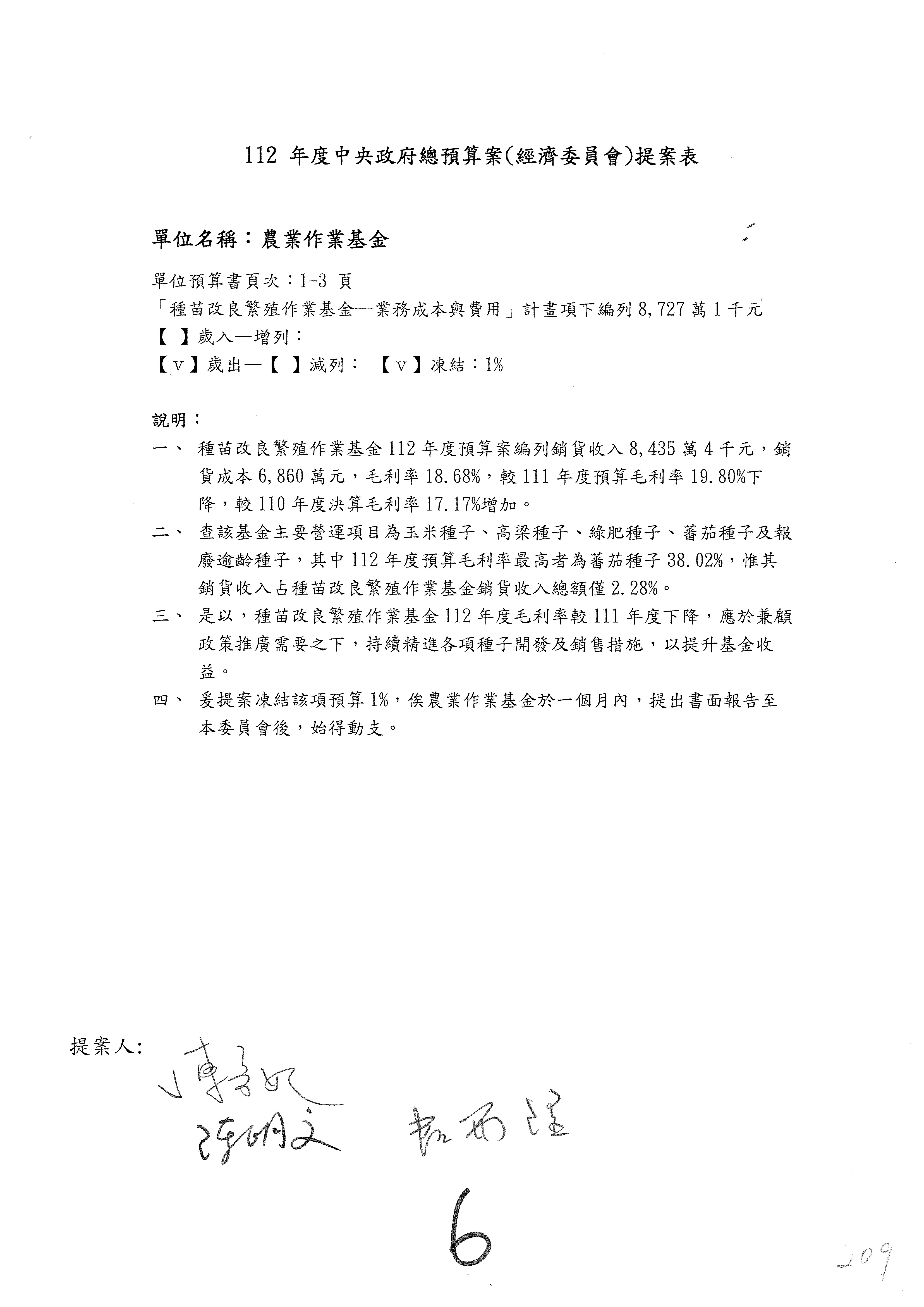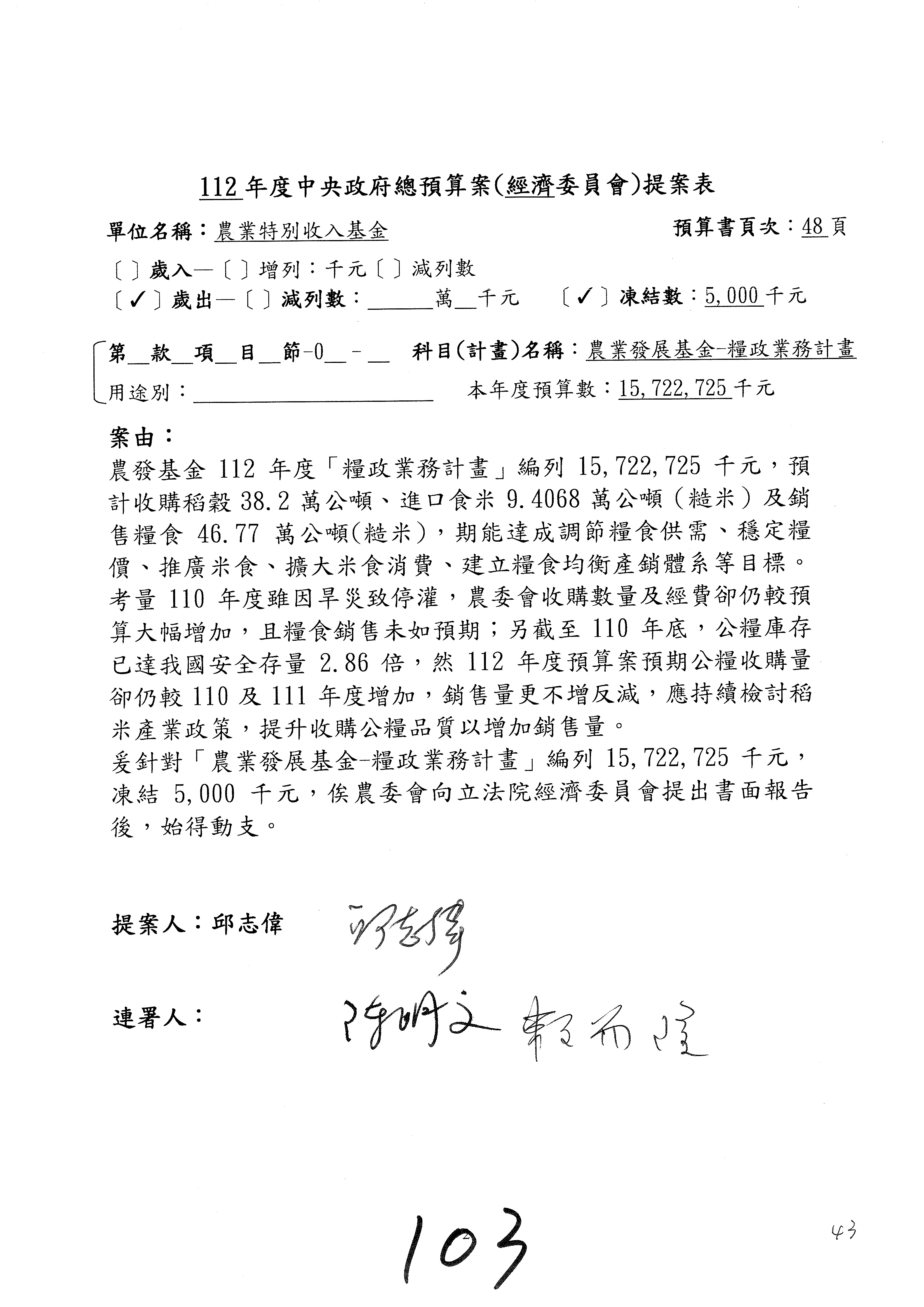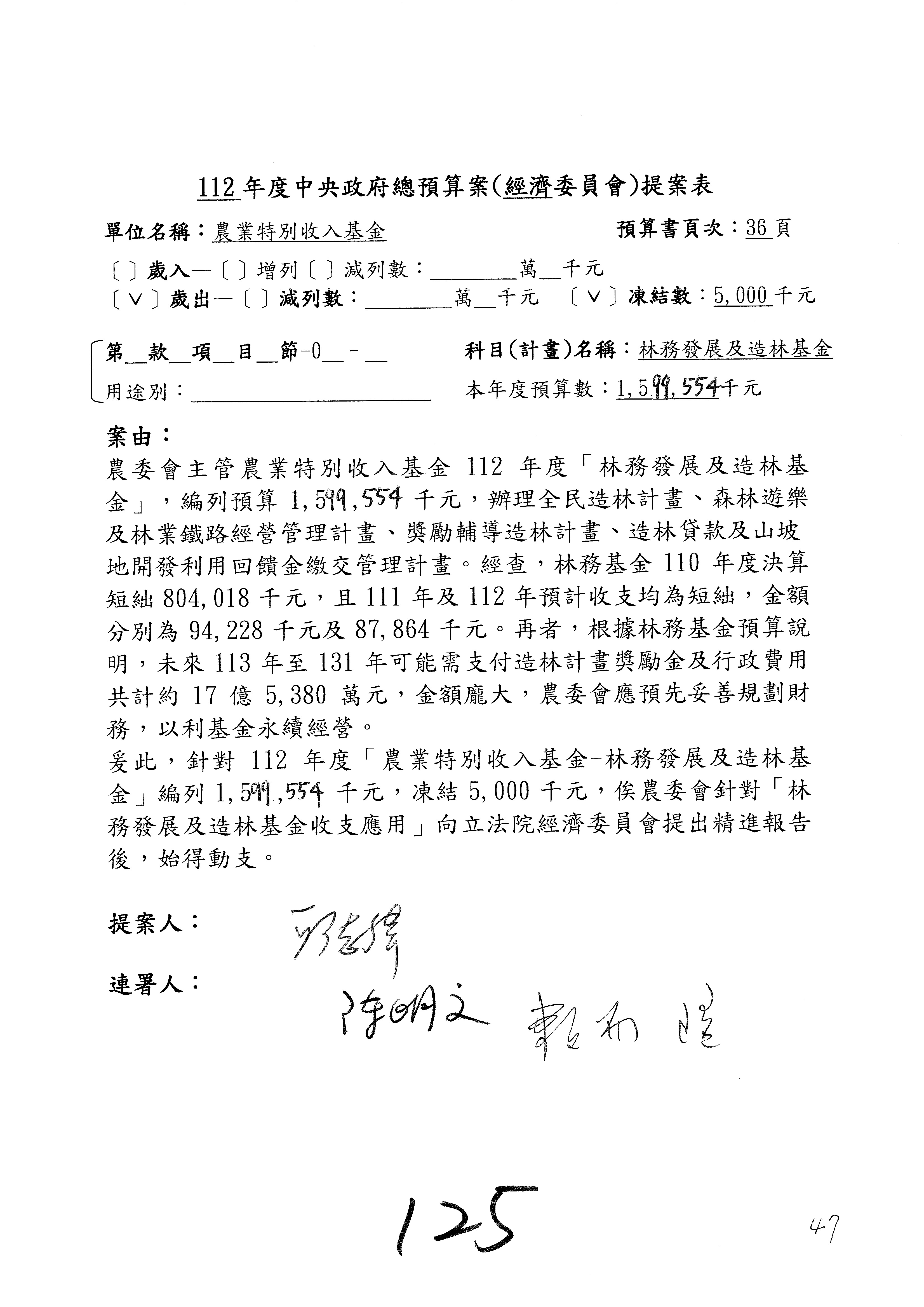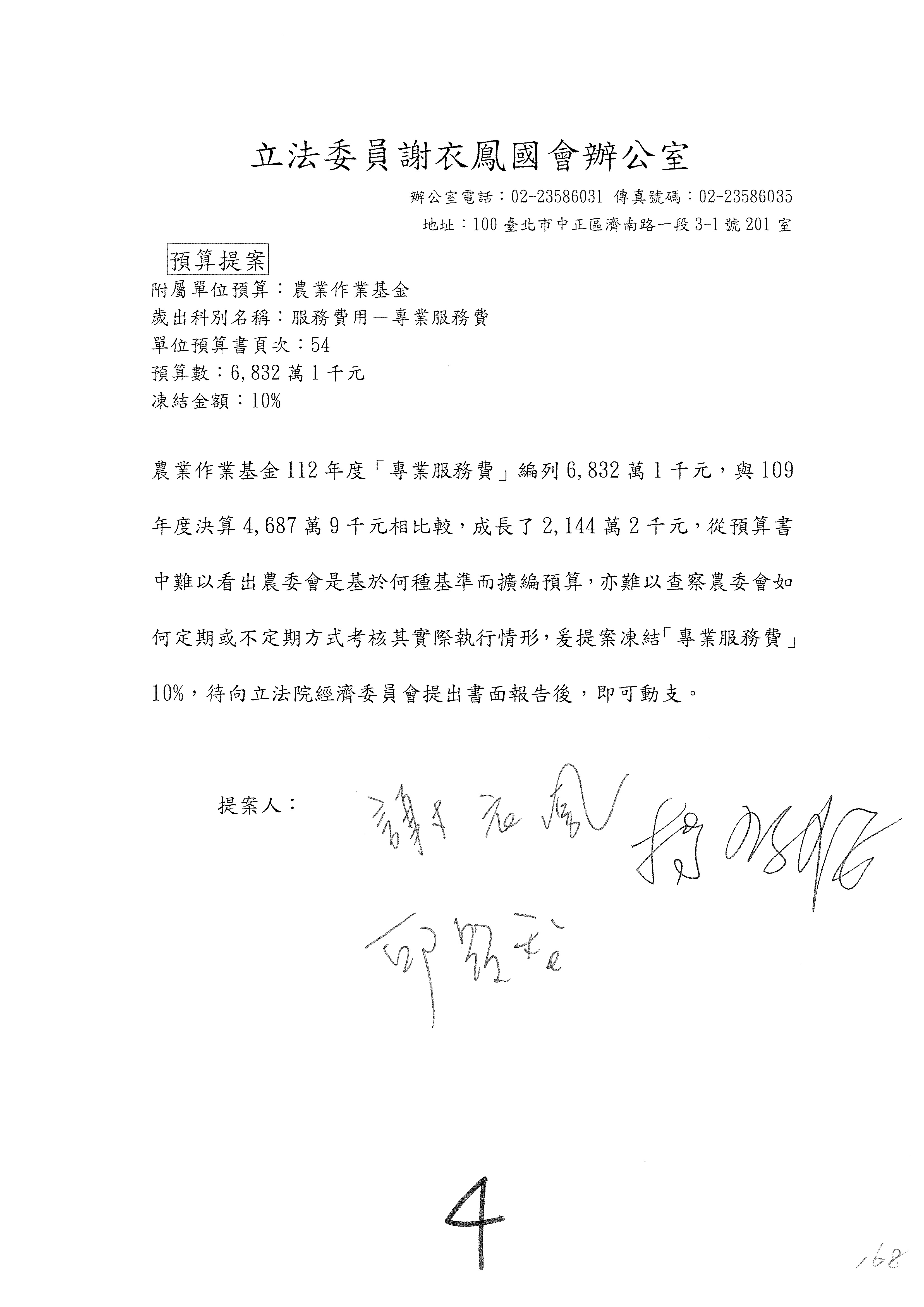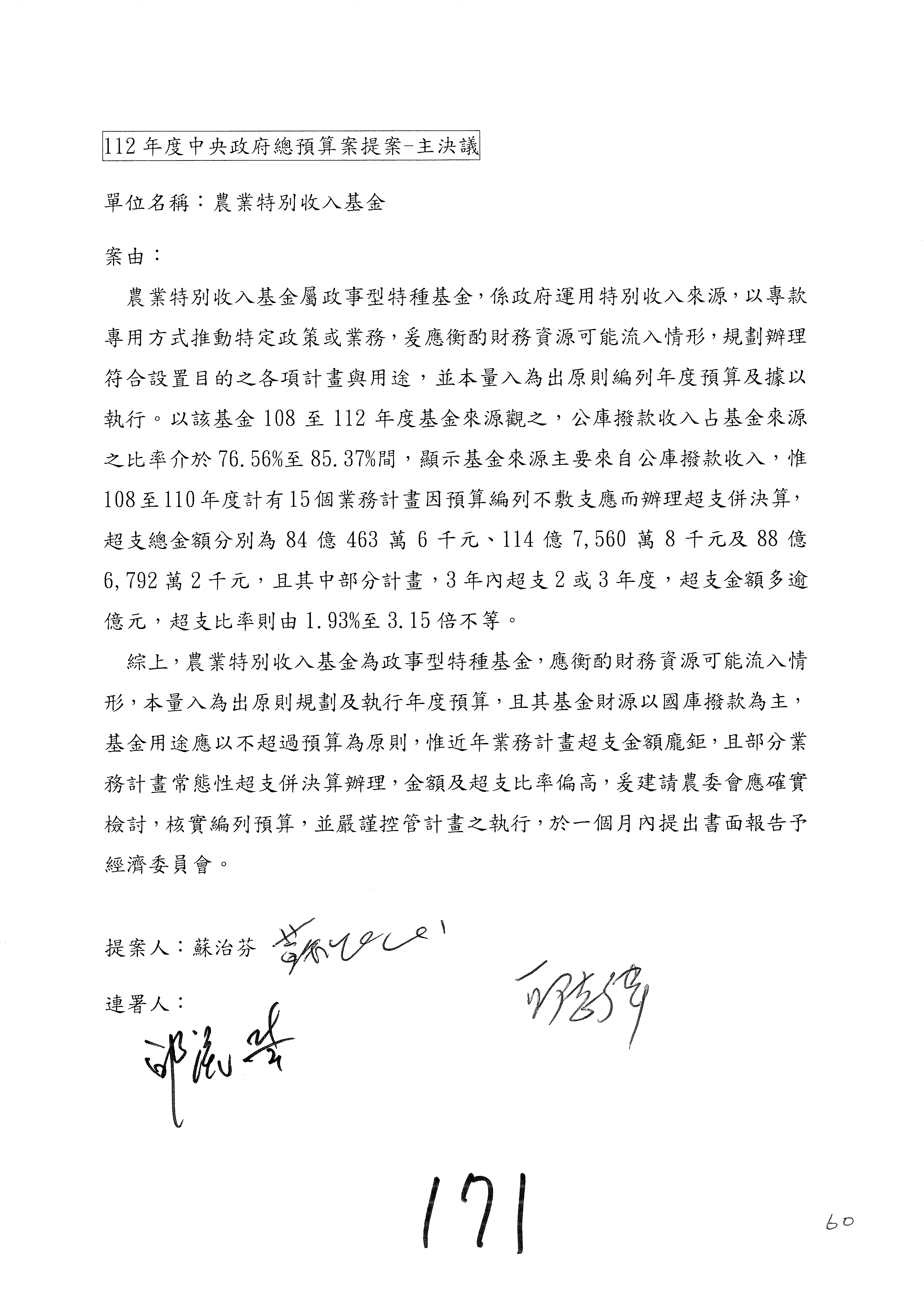 第153案到第168案,農村再生基金凍結2,000萬元,提出書面報告後始得動支。