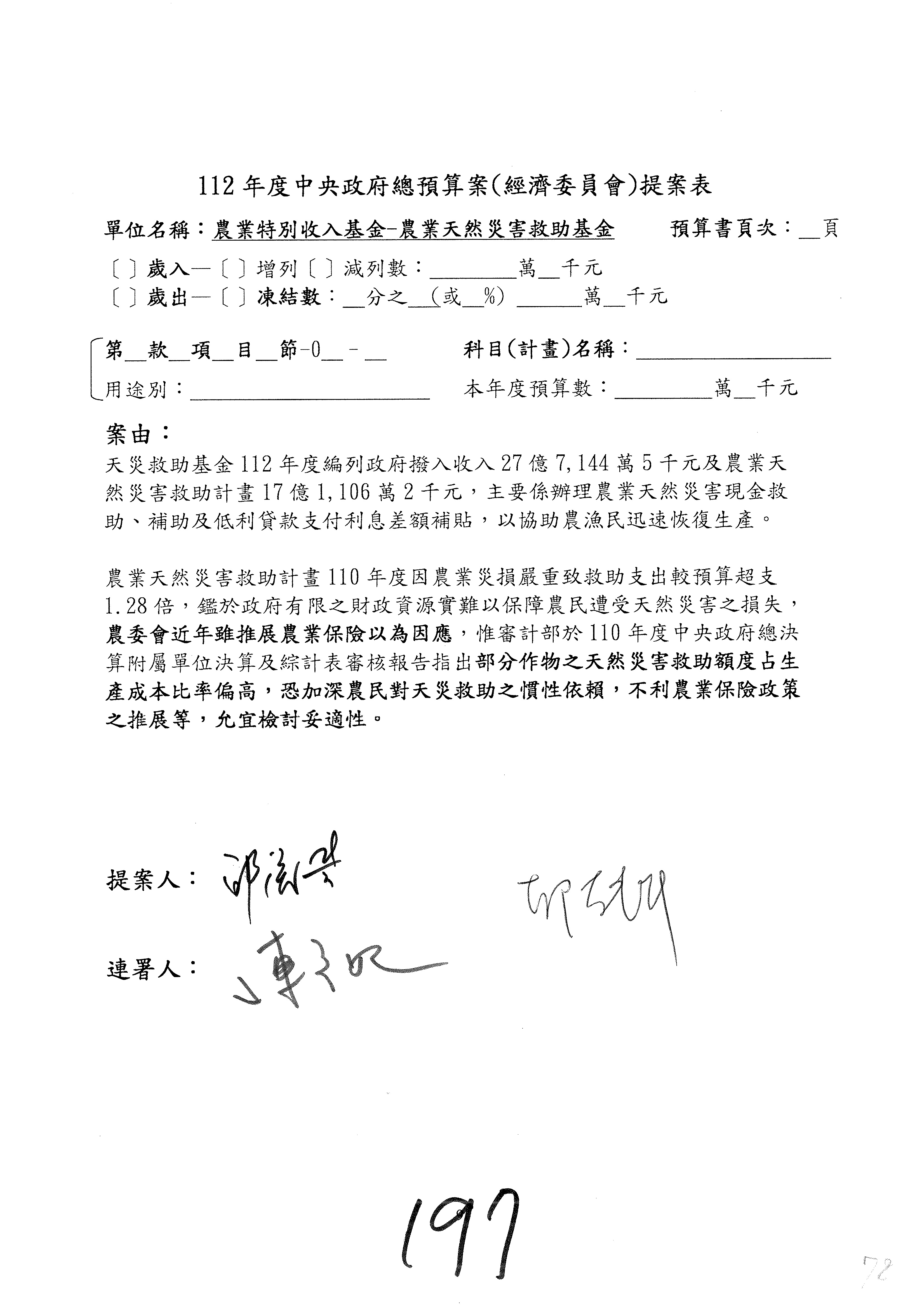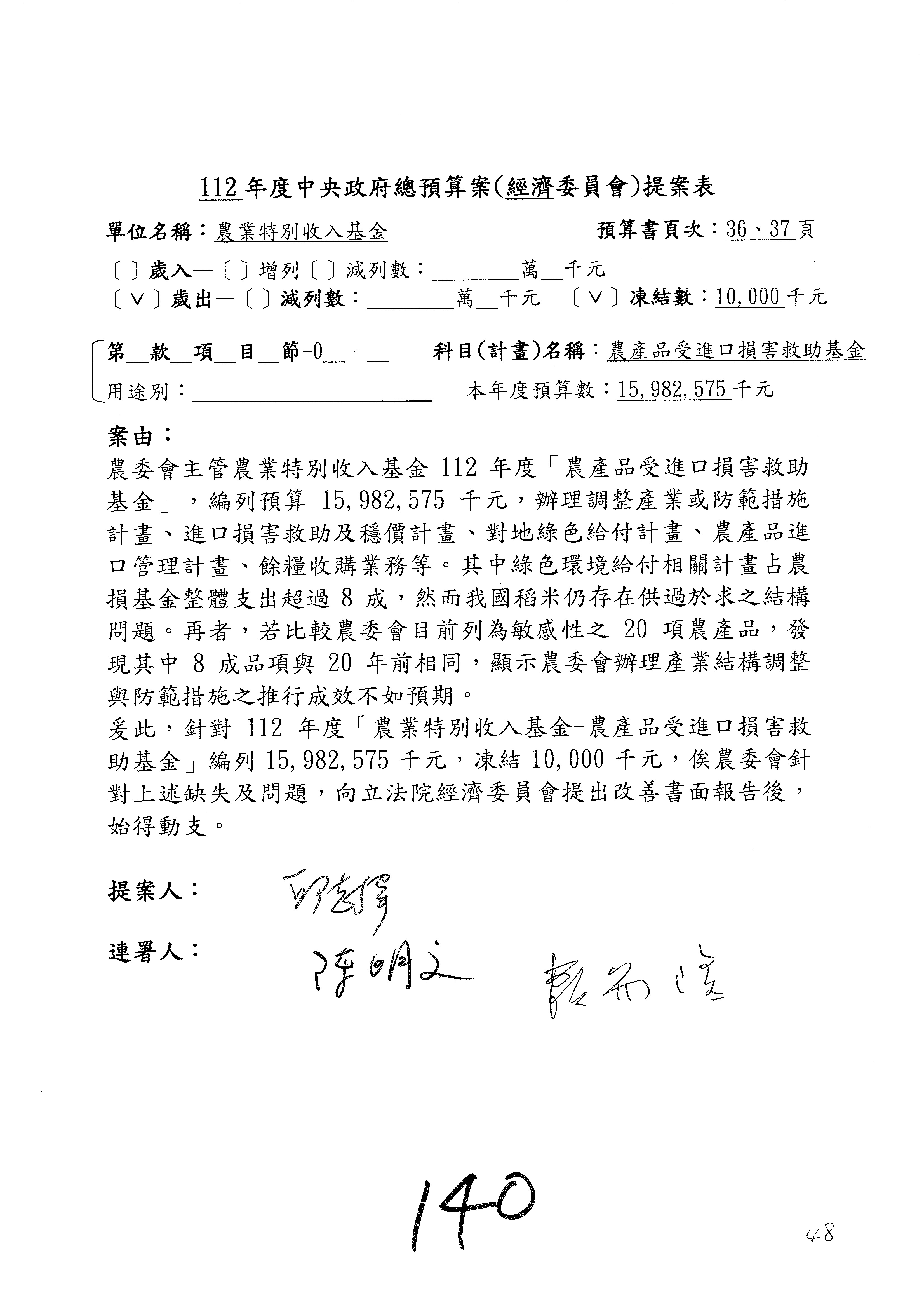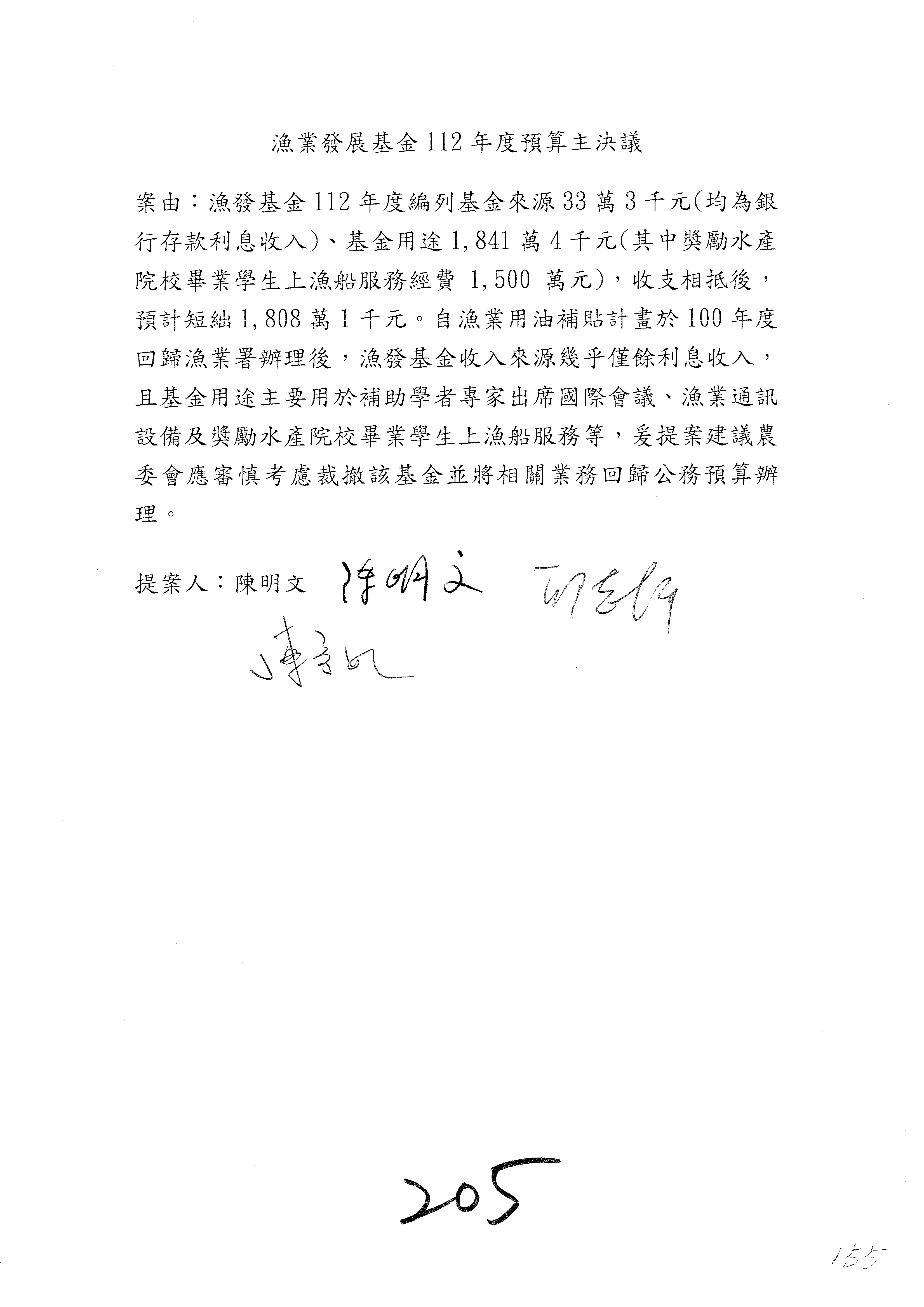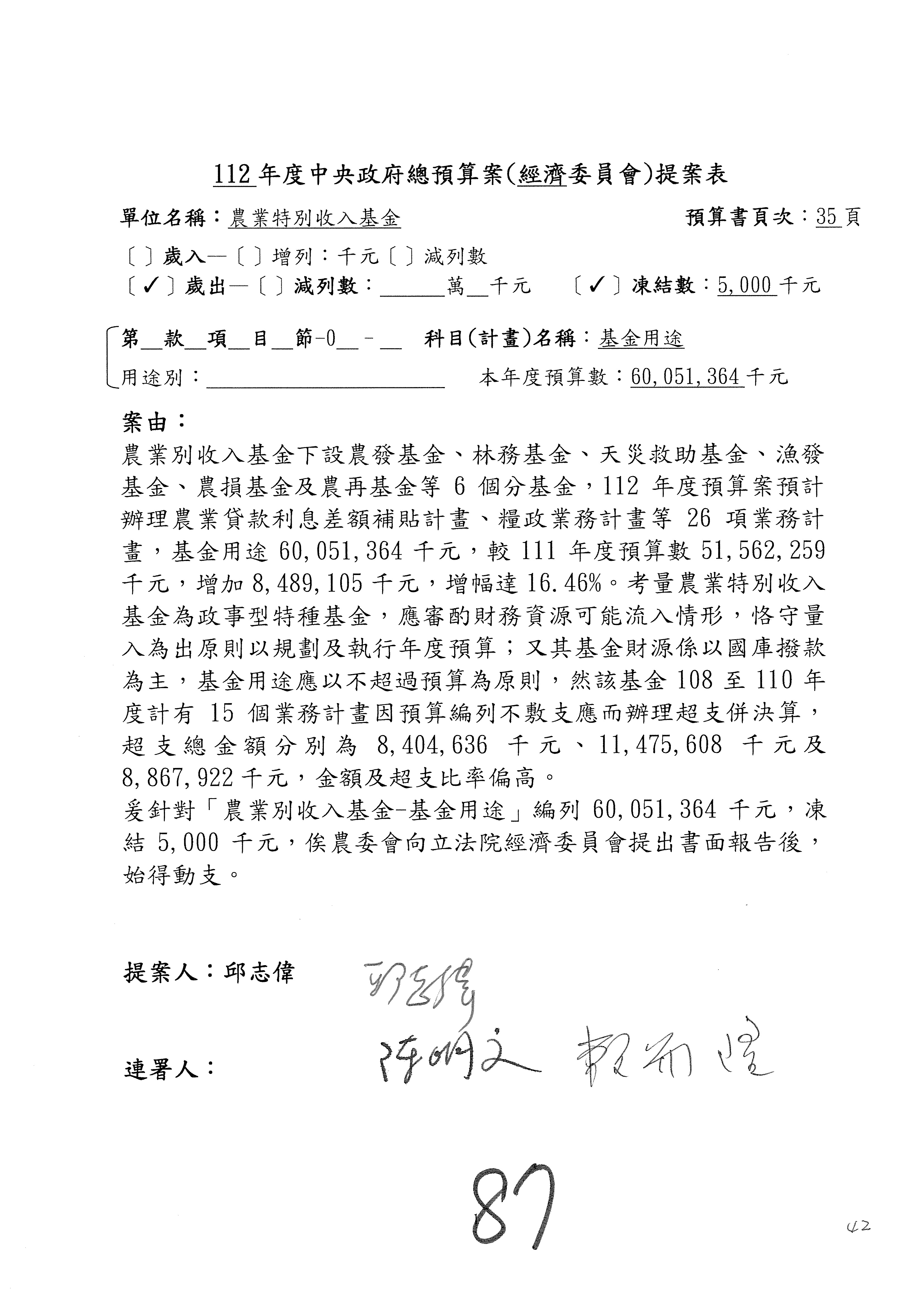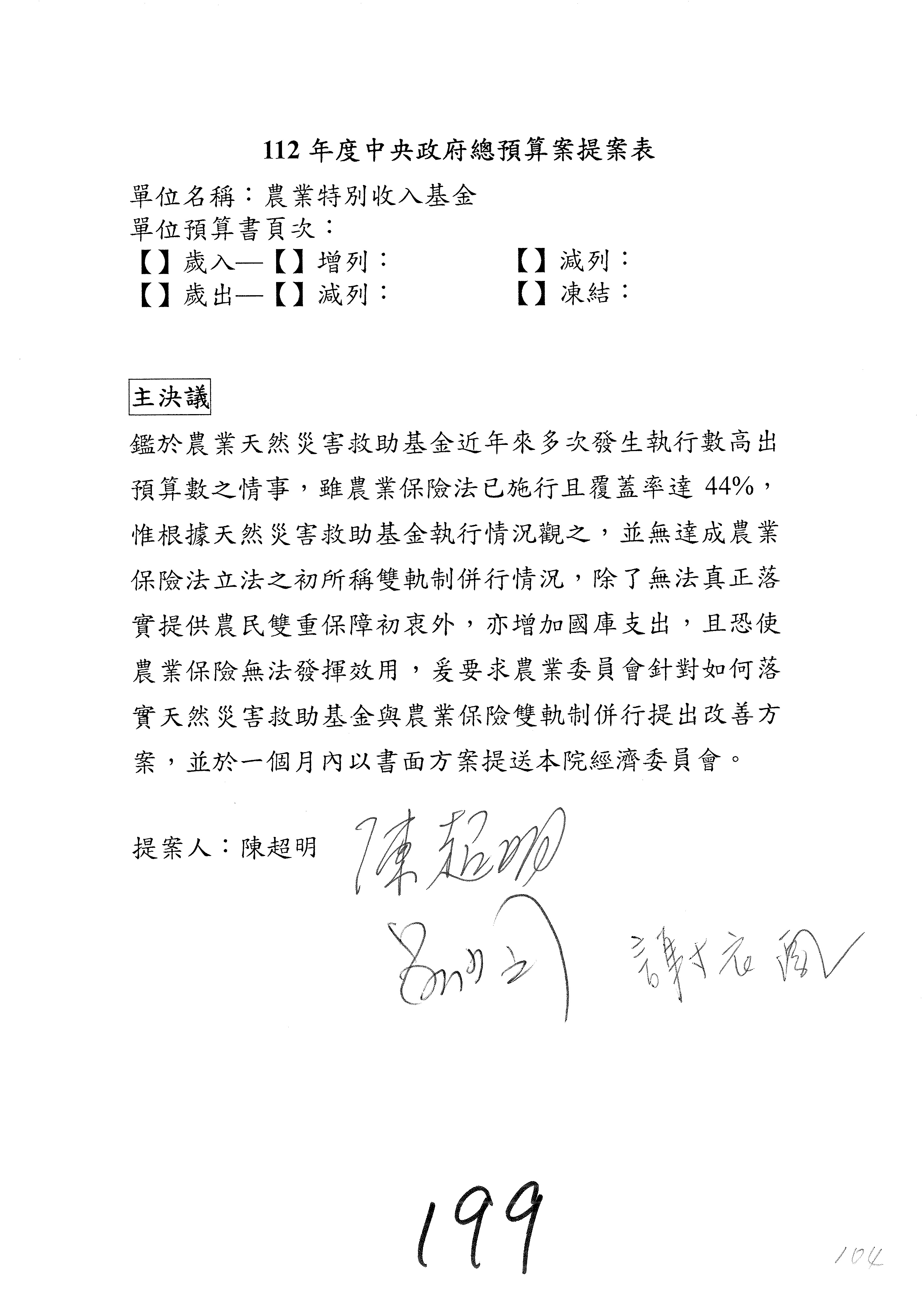 第153案到第168案,農村再生基金凍結2,000萬元,提出書面報告後始得動支。
