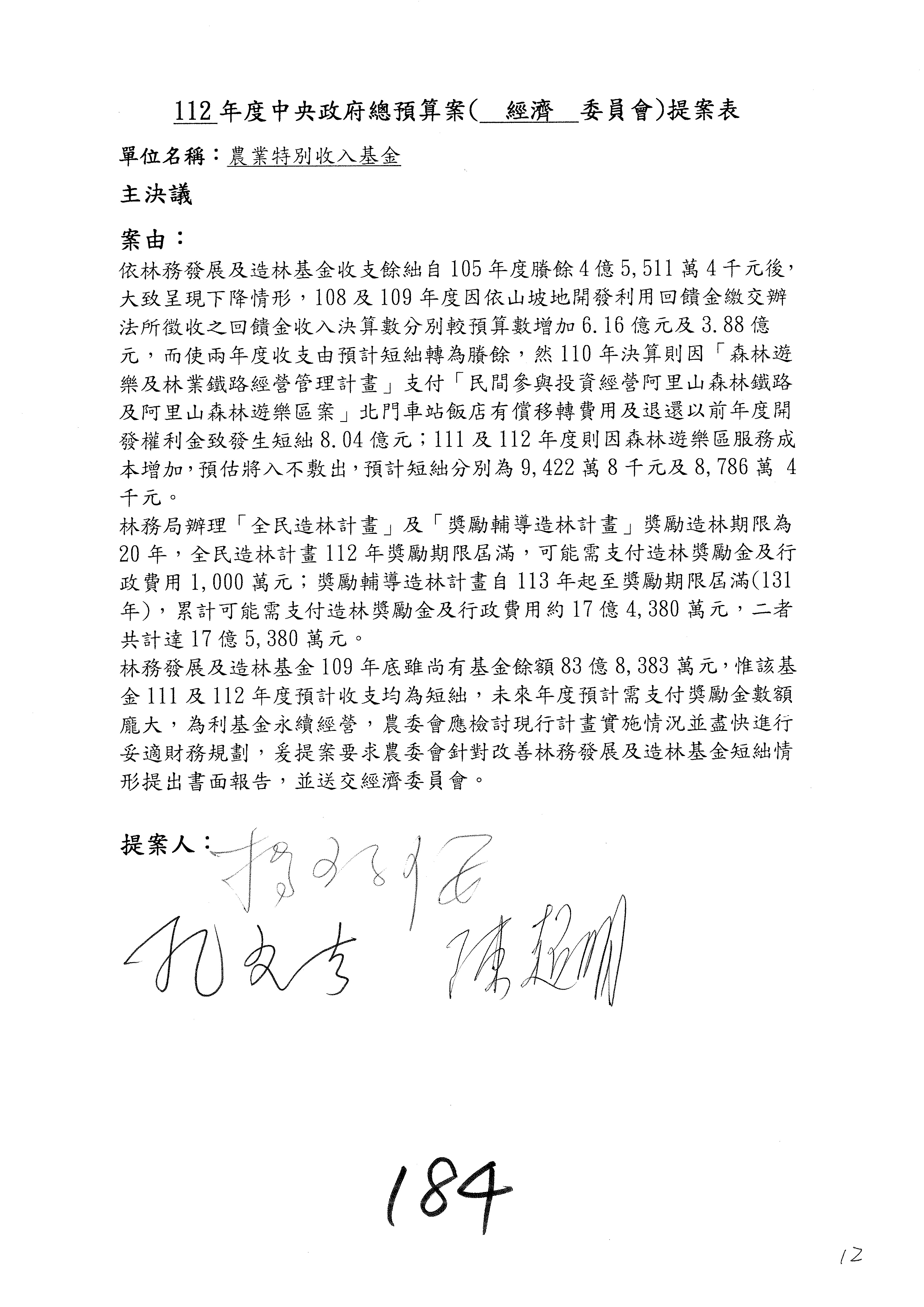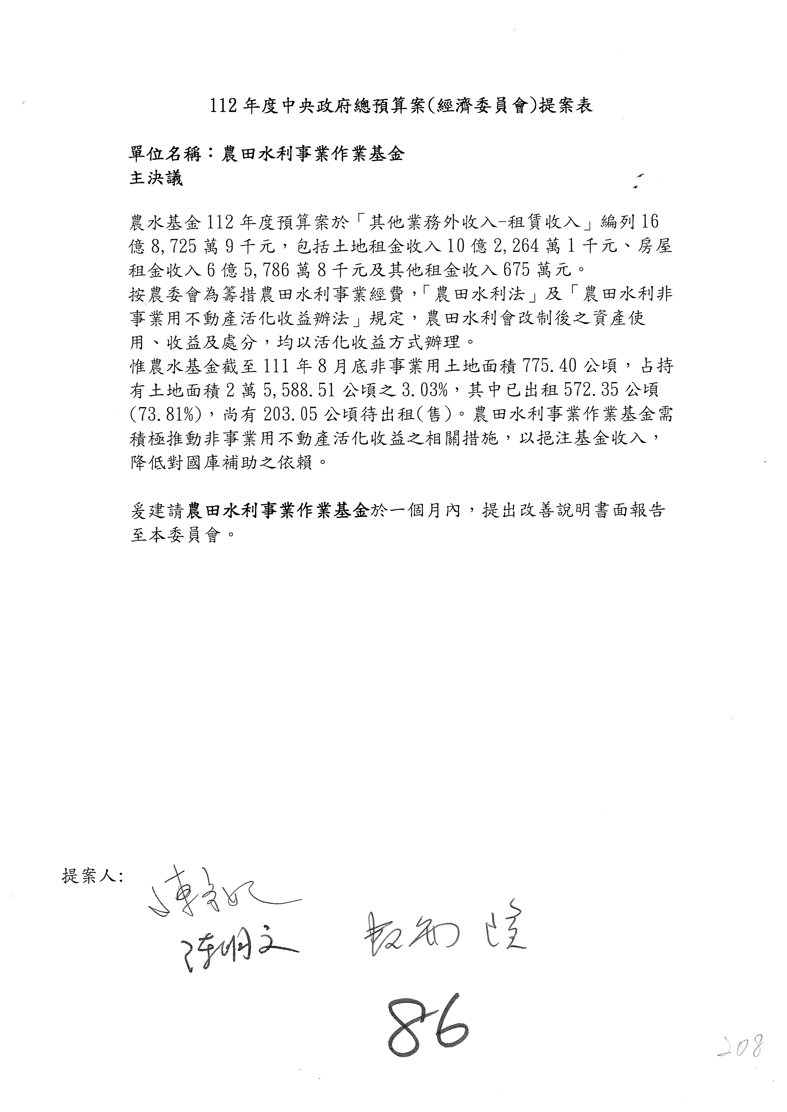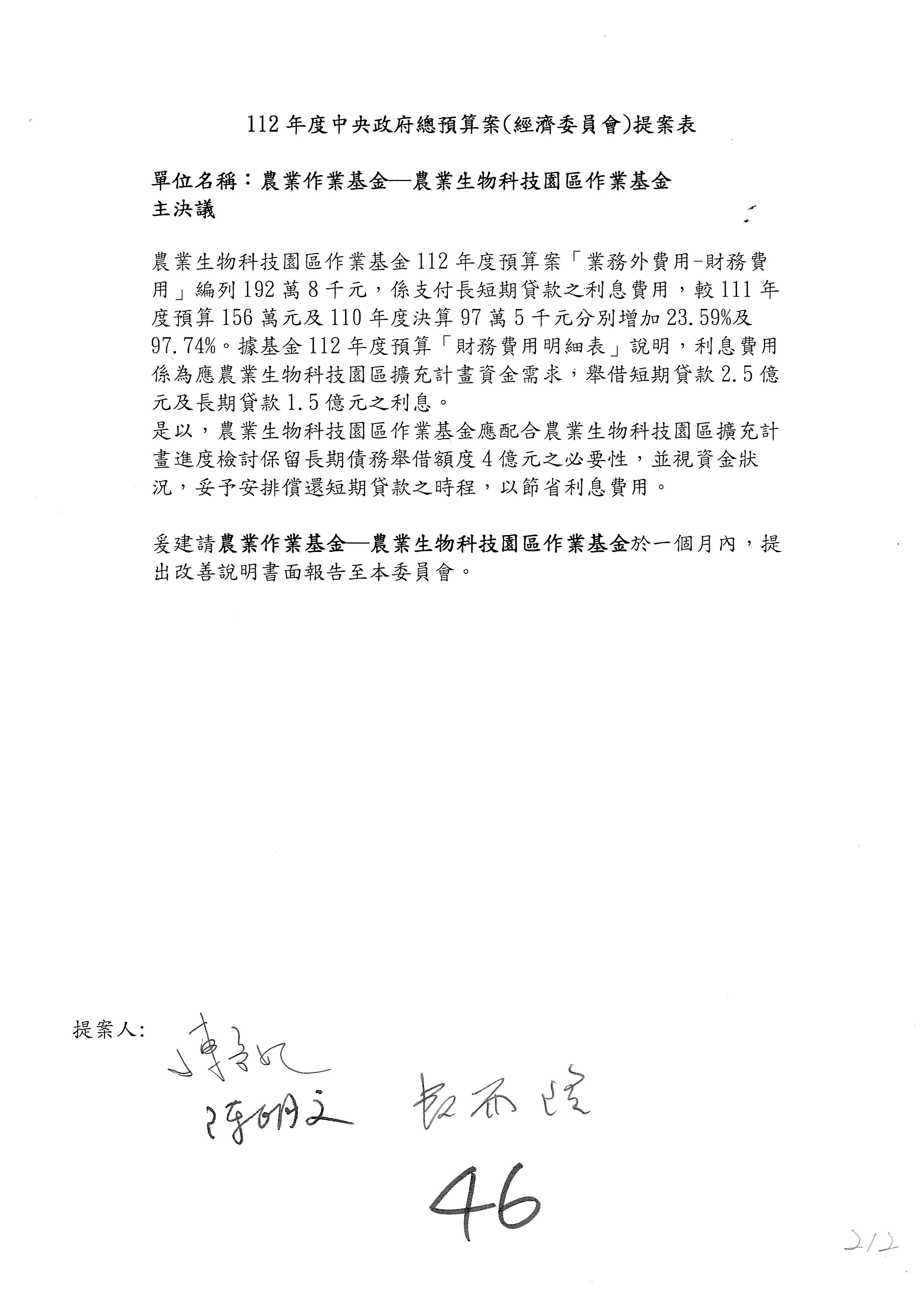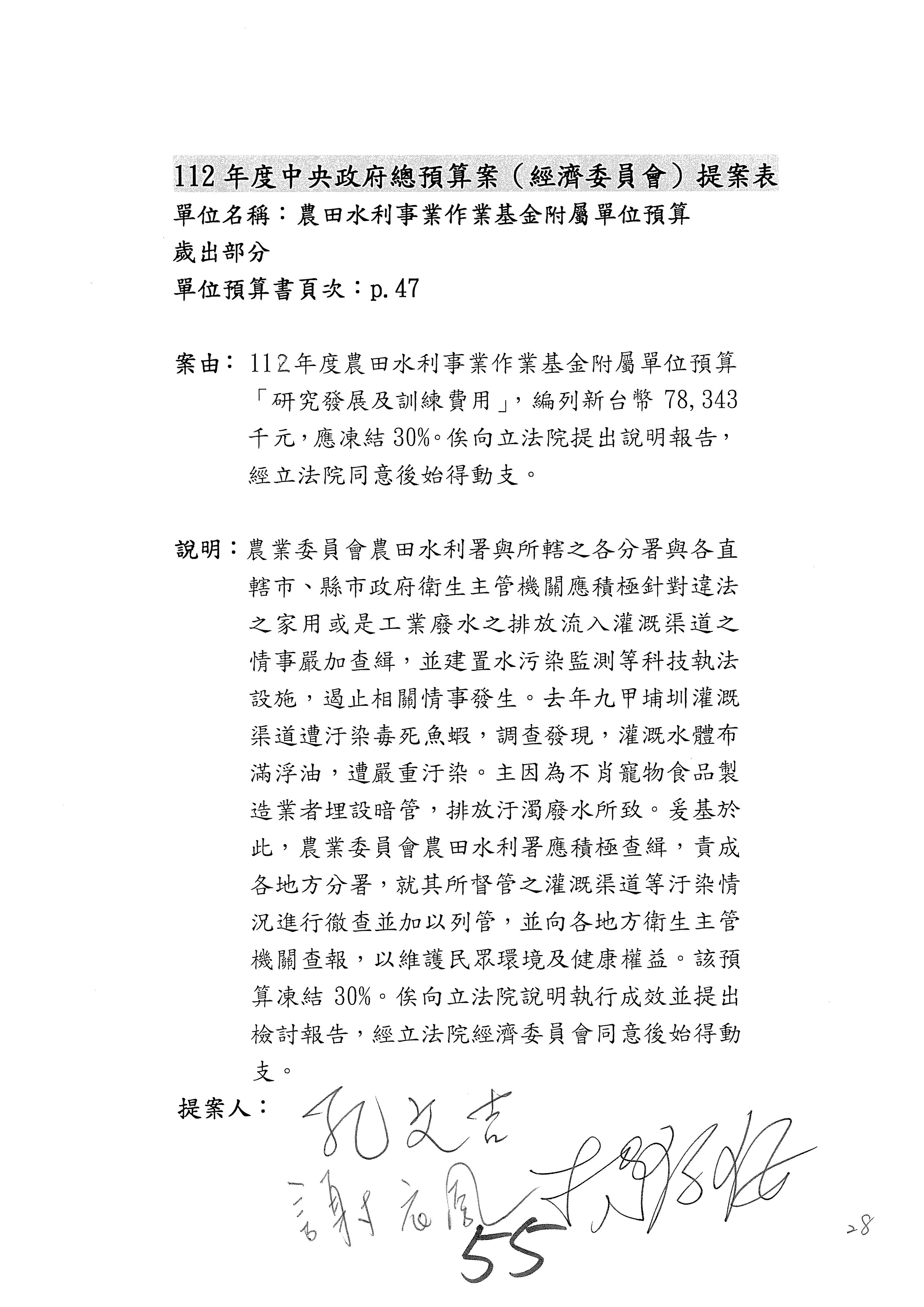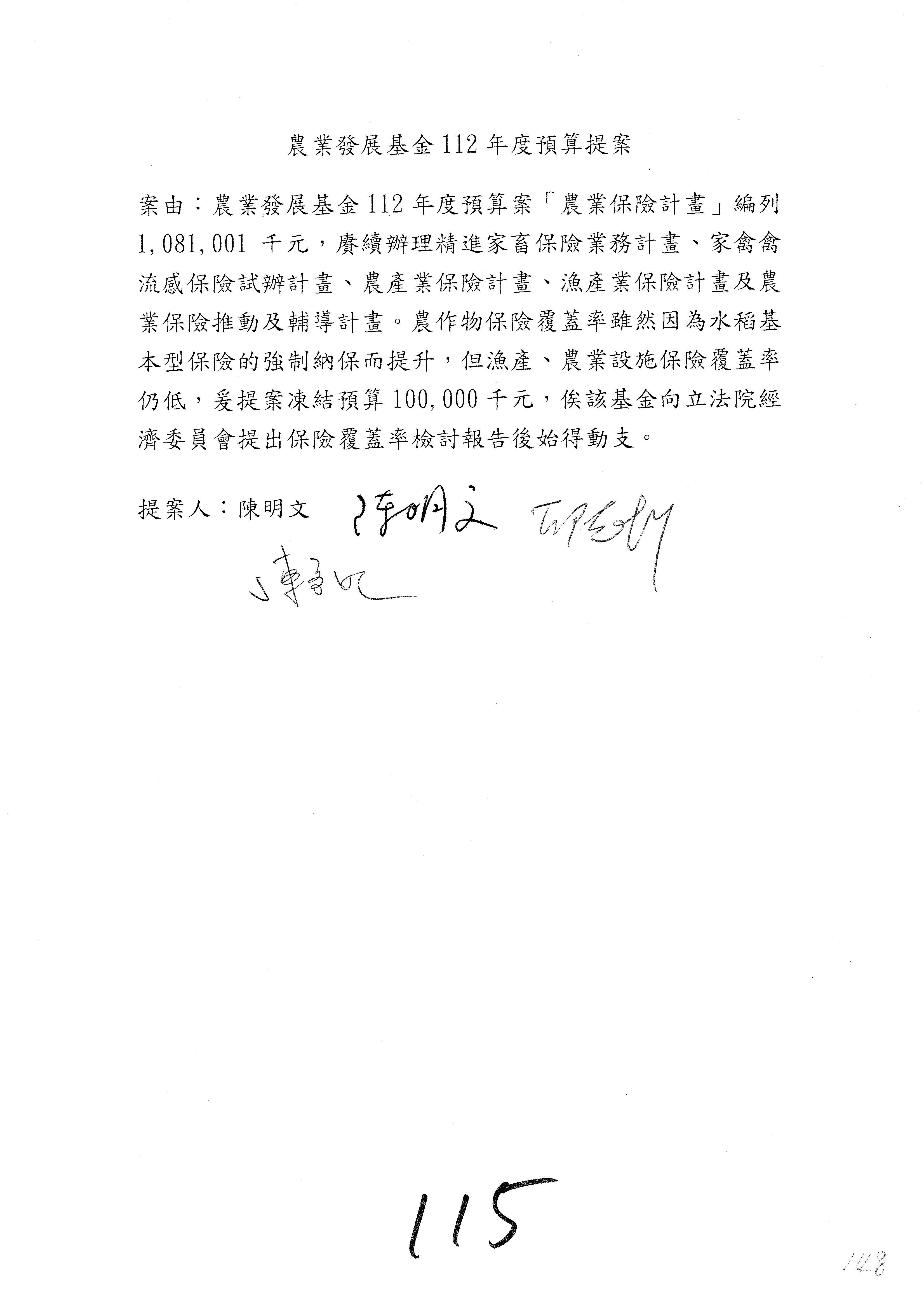 第153案到第168案,農村再生基金凍結2,000萬元,提出書面報告後始得動支。