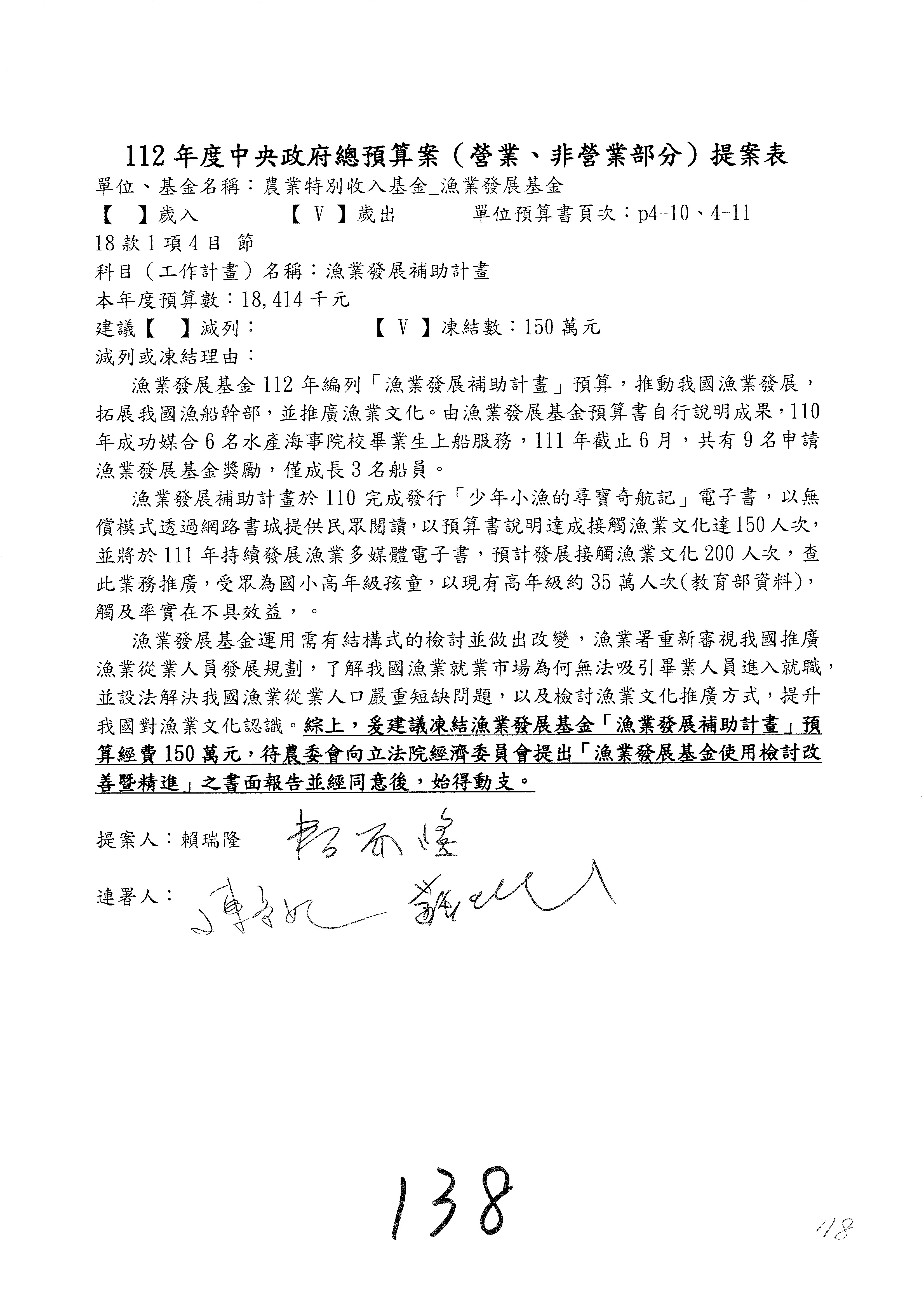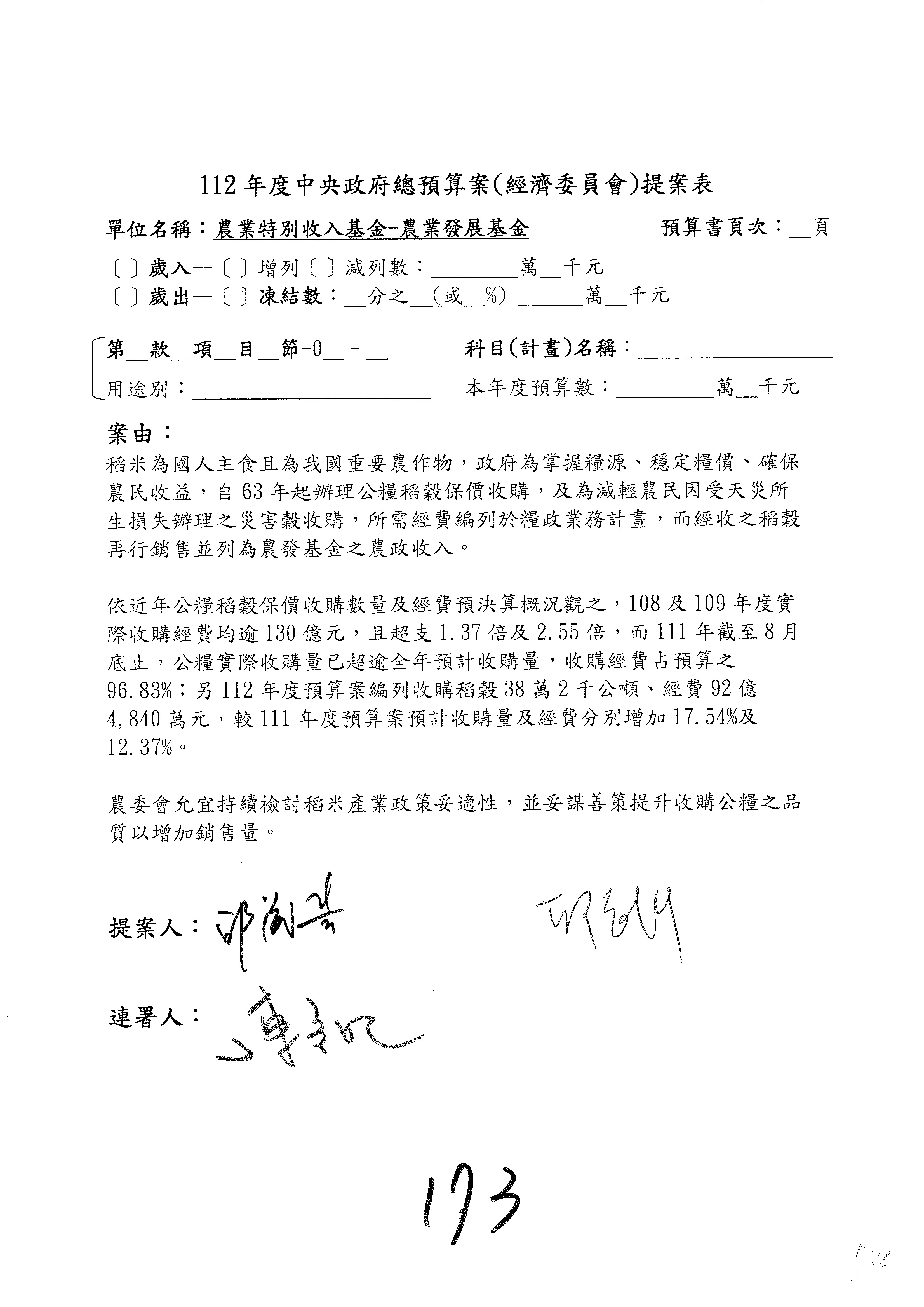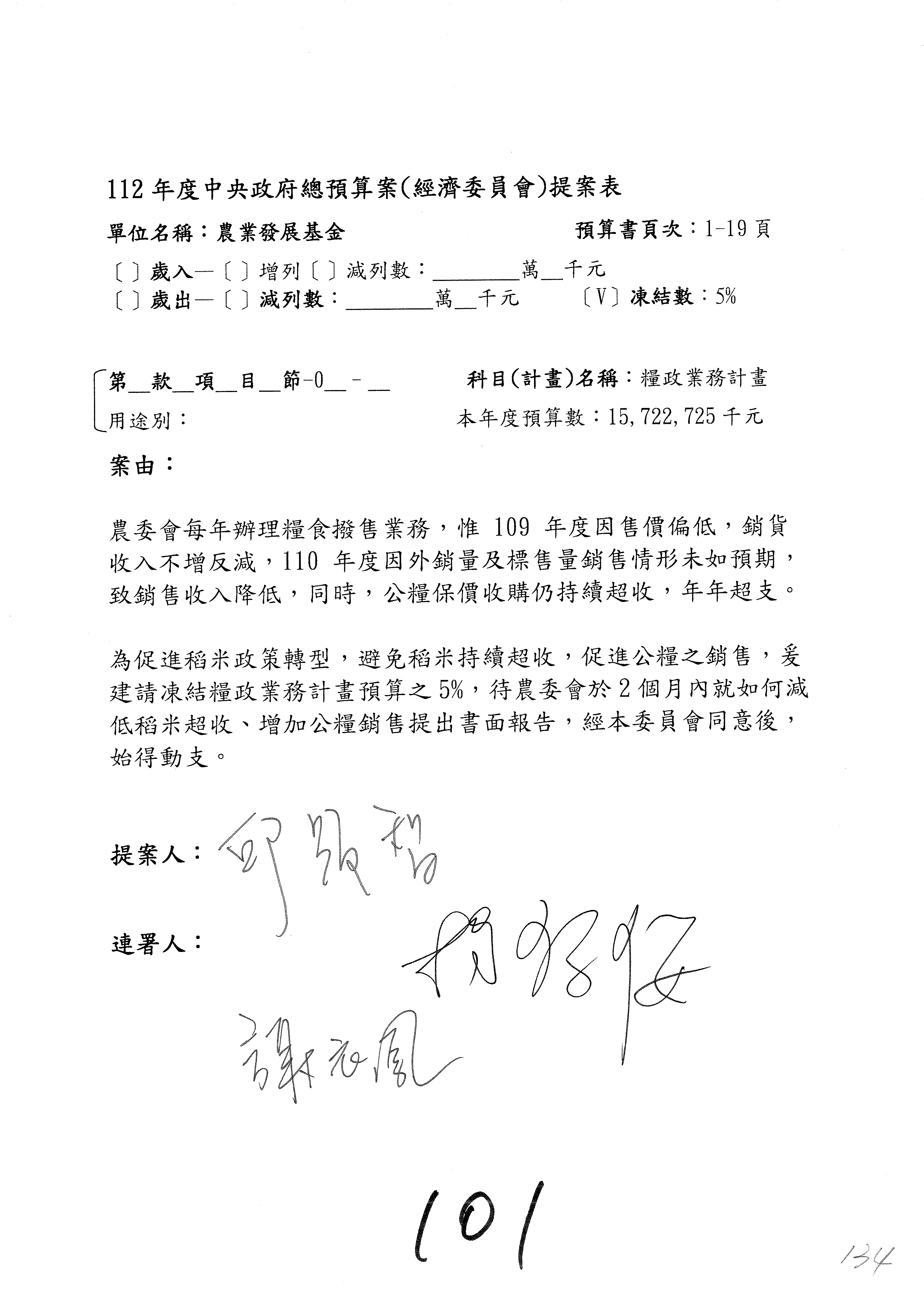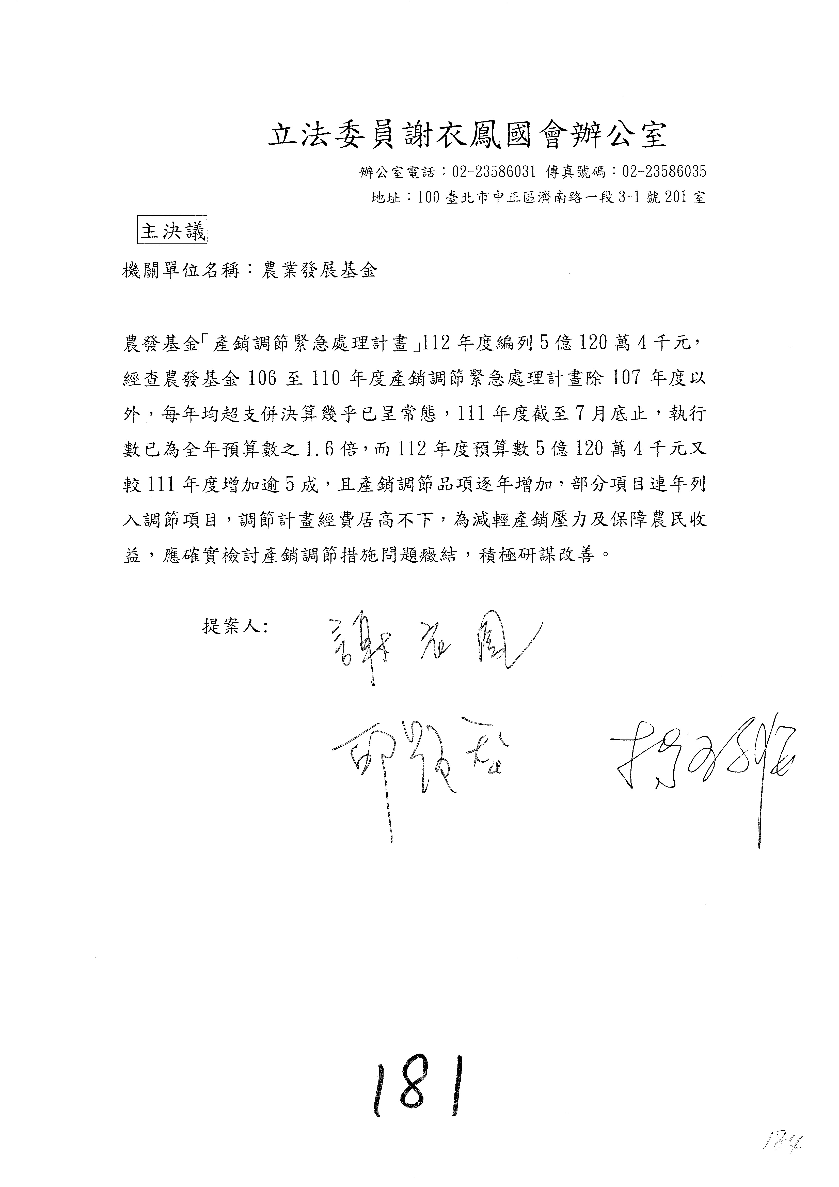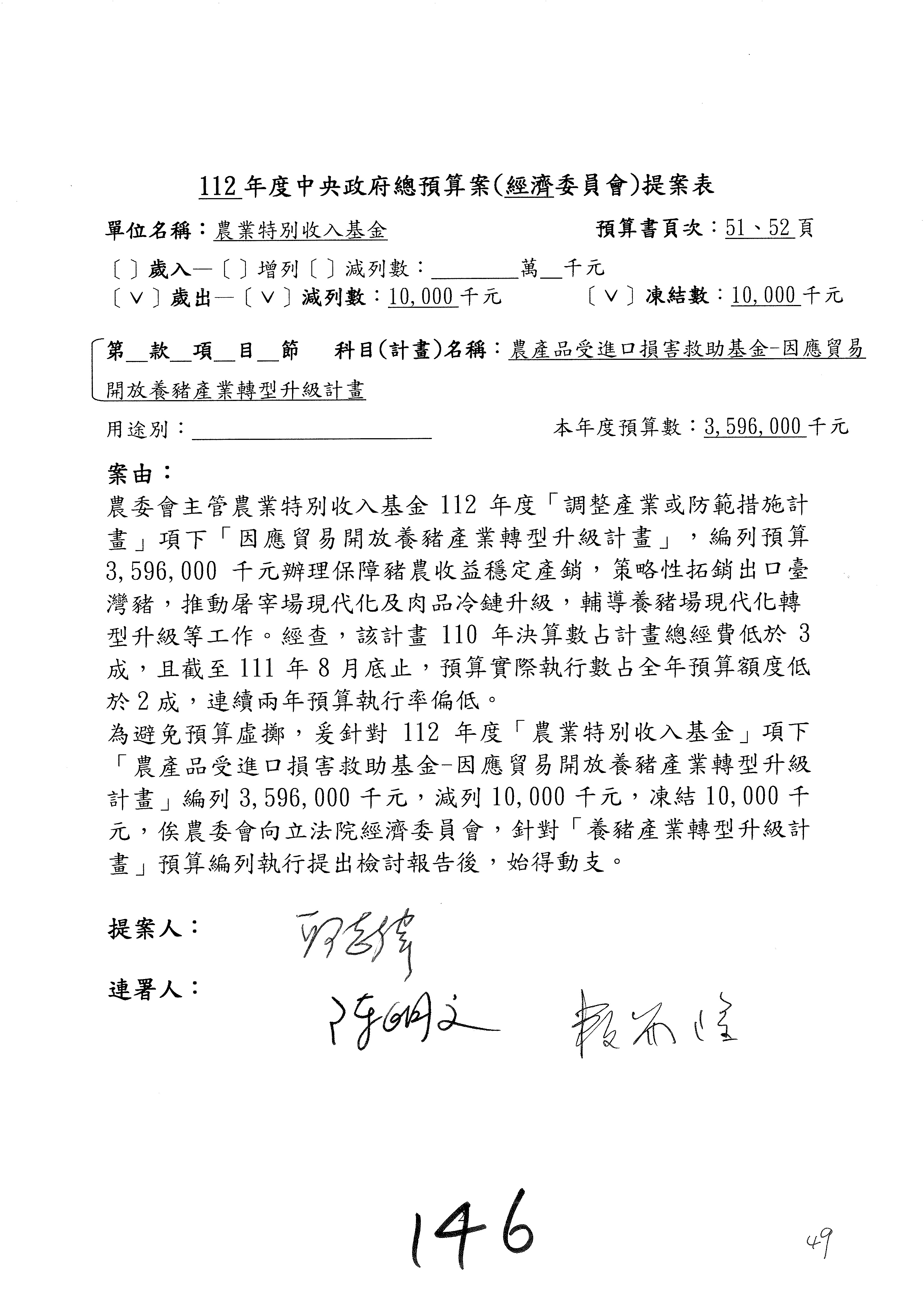 第153案到第168案,農村再生基金凍結2,000萬元,提出書面報告後始得動支。