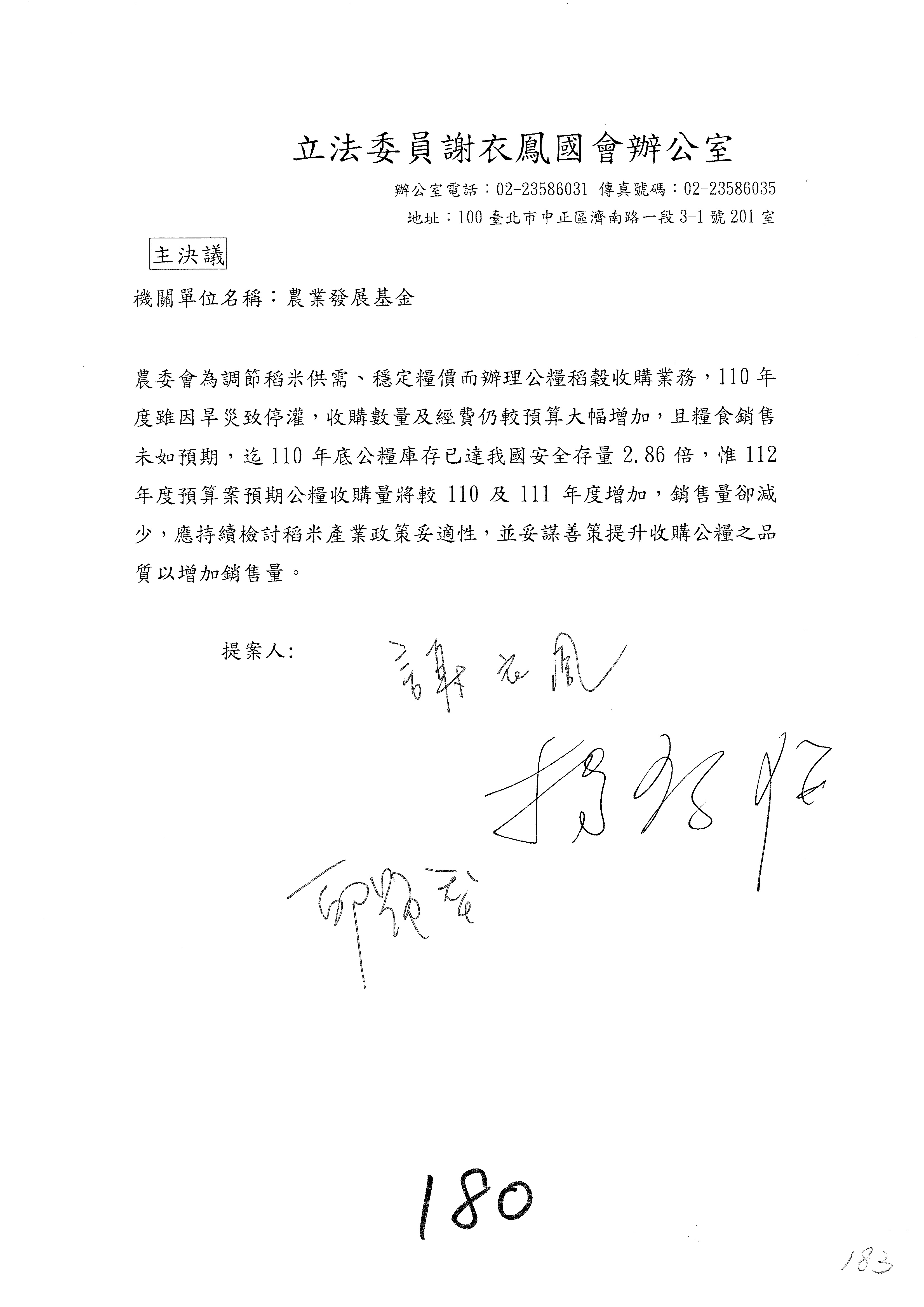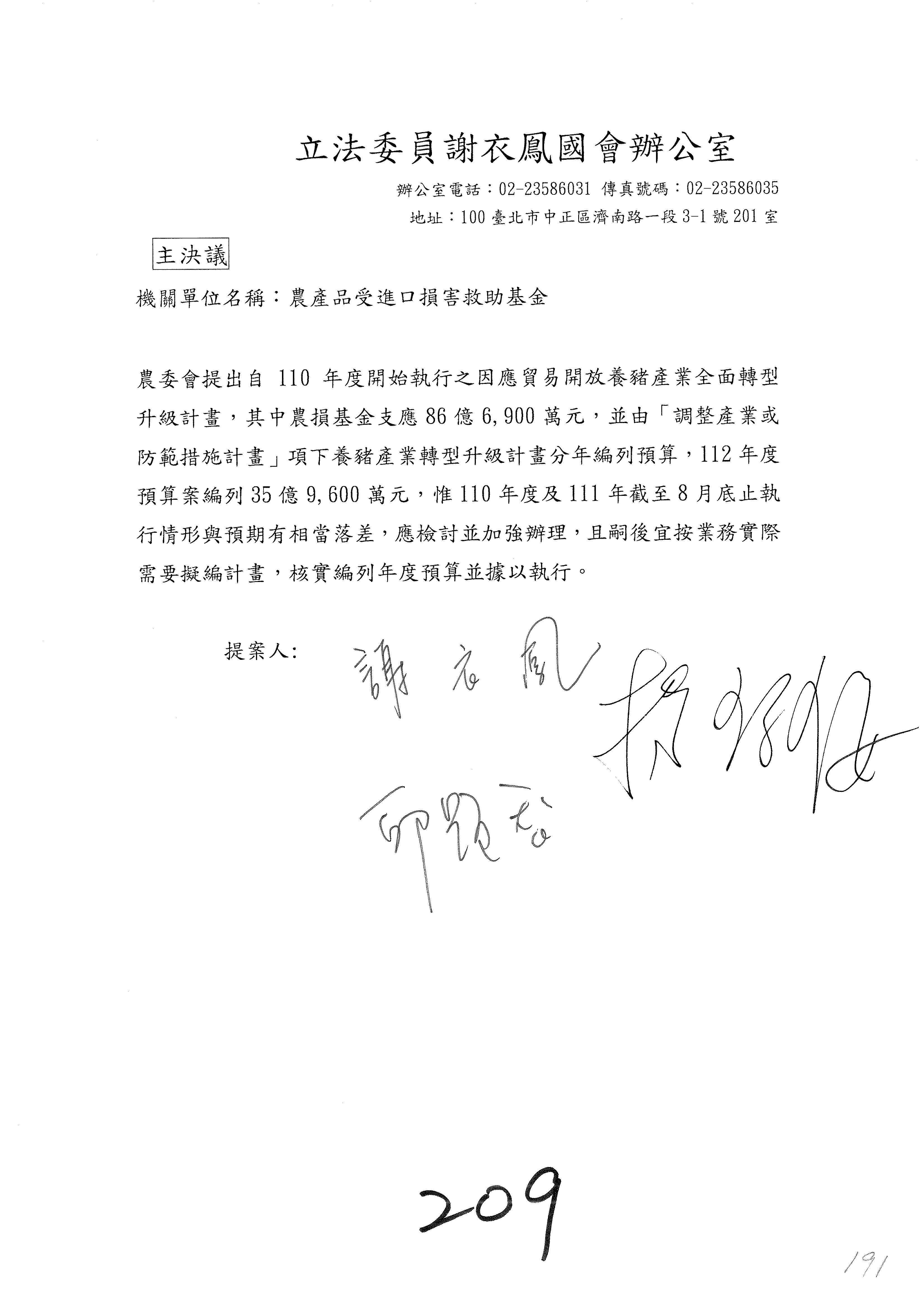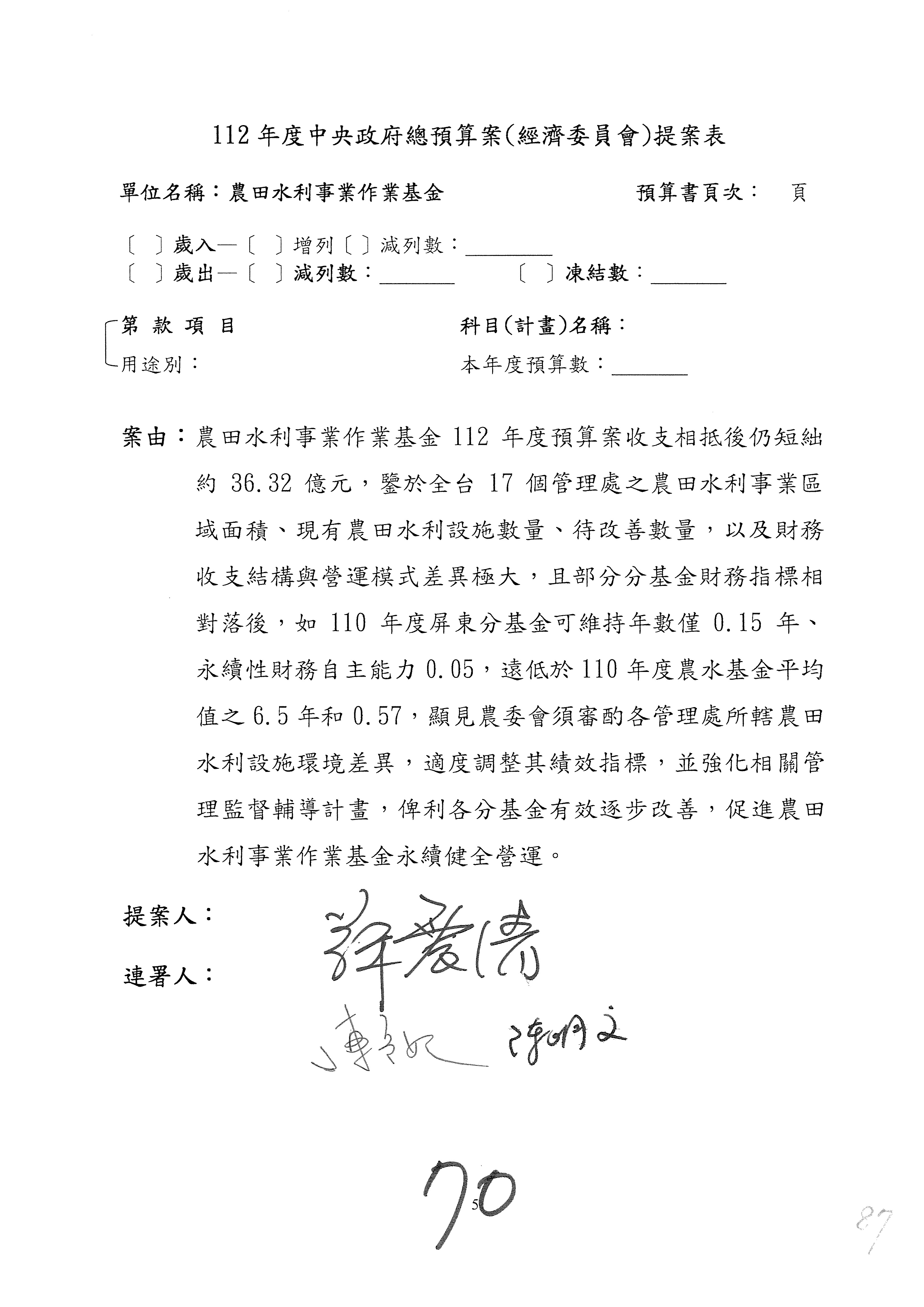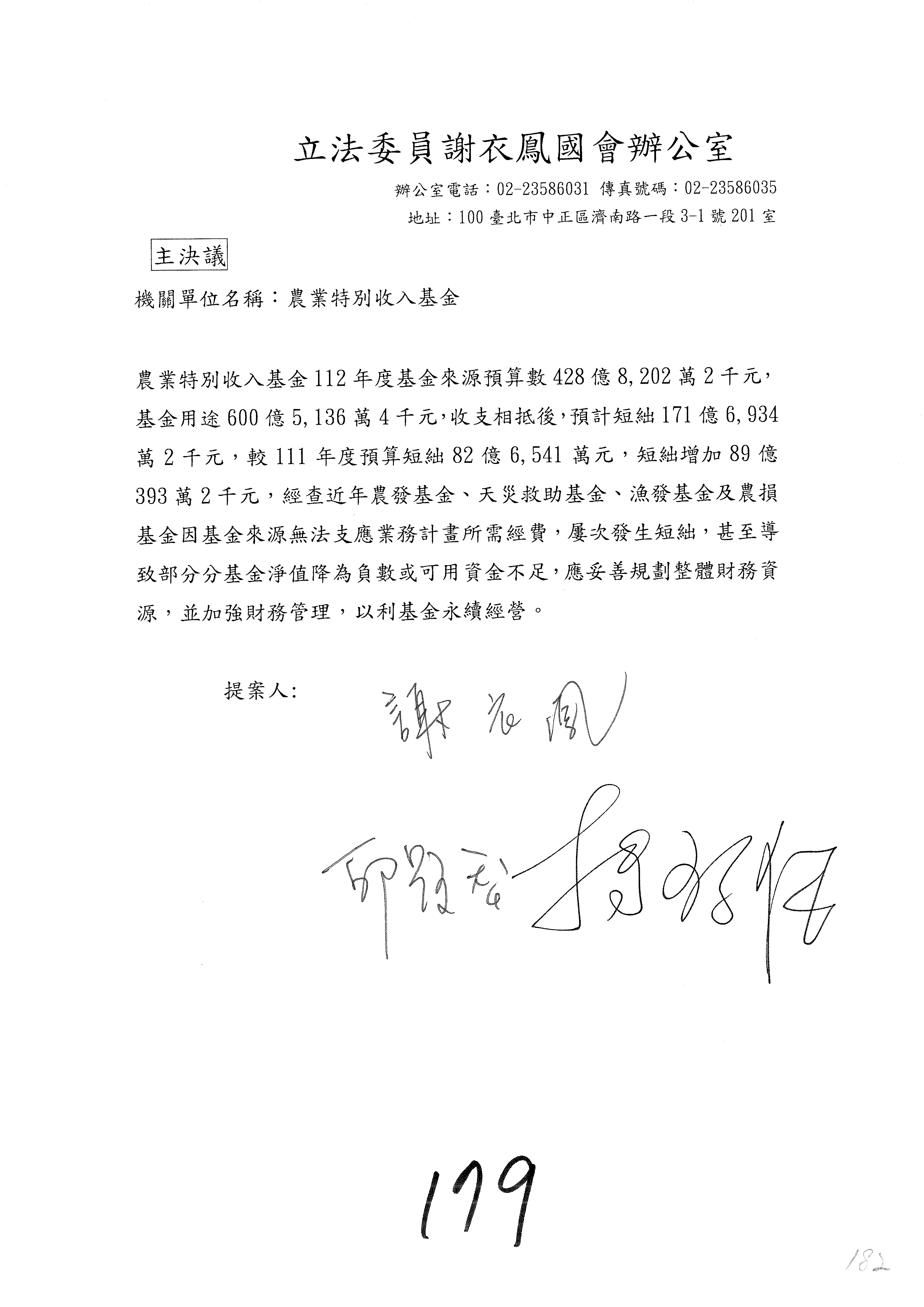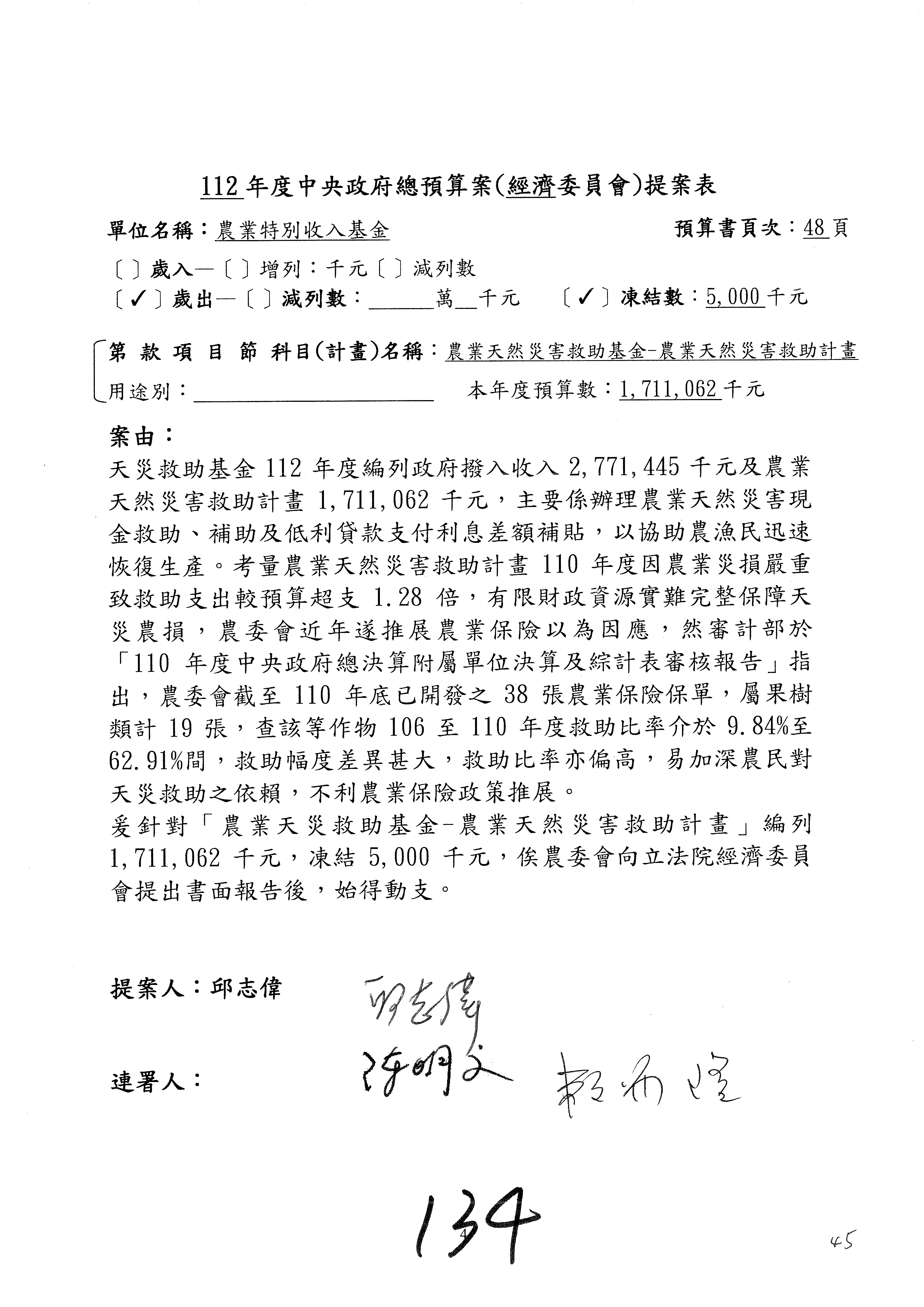 第153案到第168案,農村再生基金凍結2,000萬元,提出書面報告後始得動支。