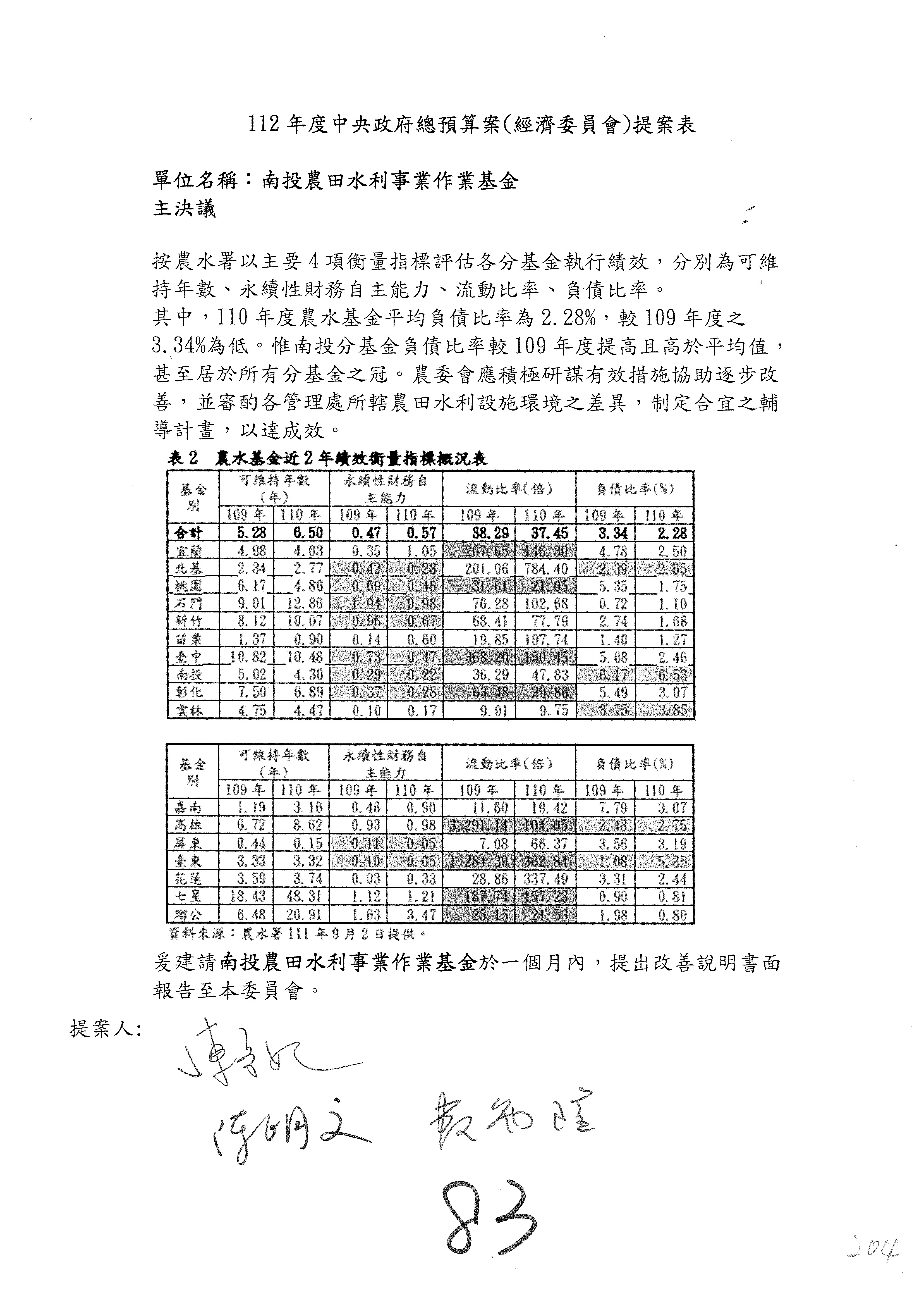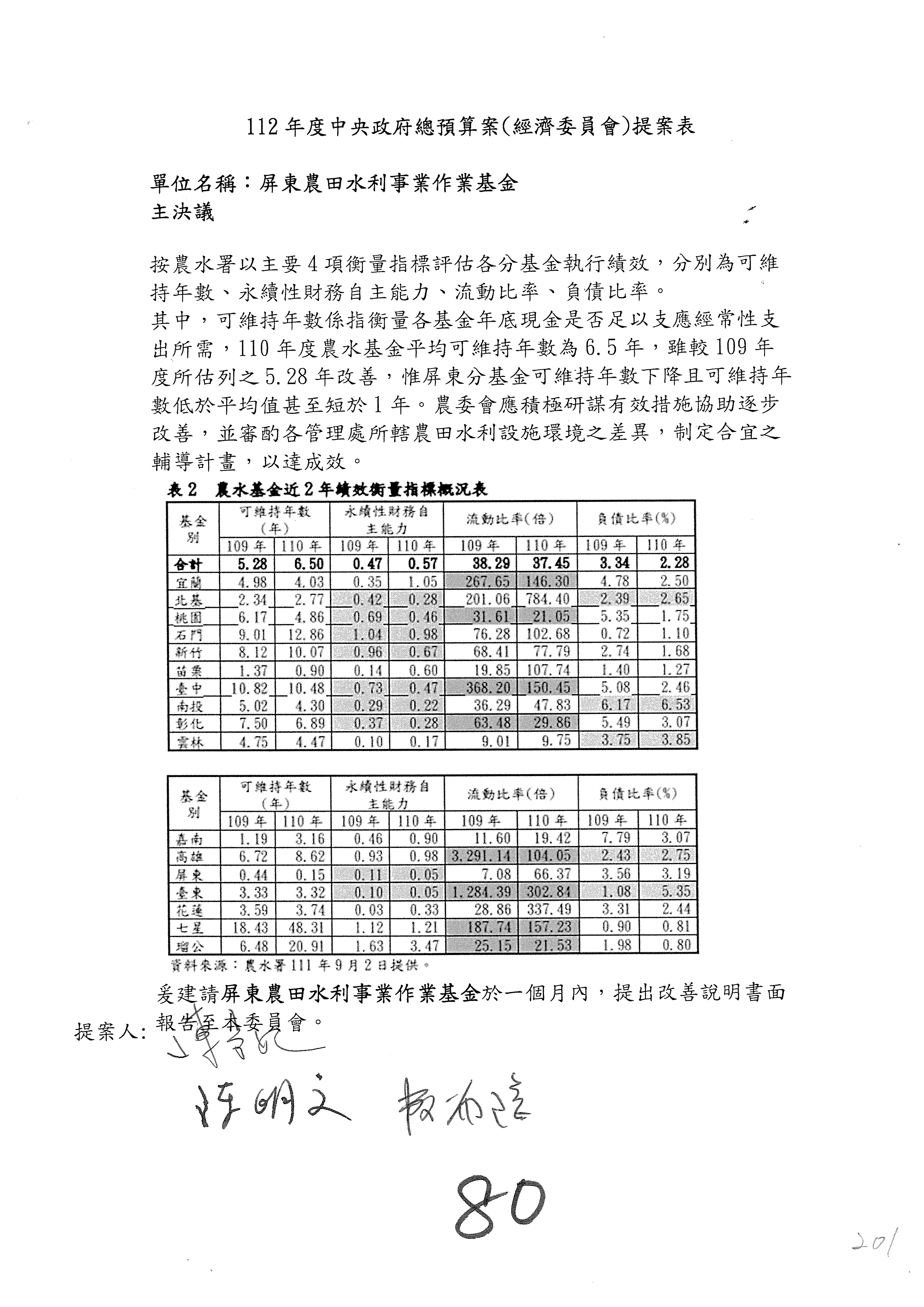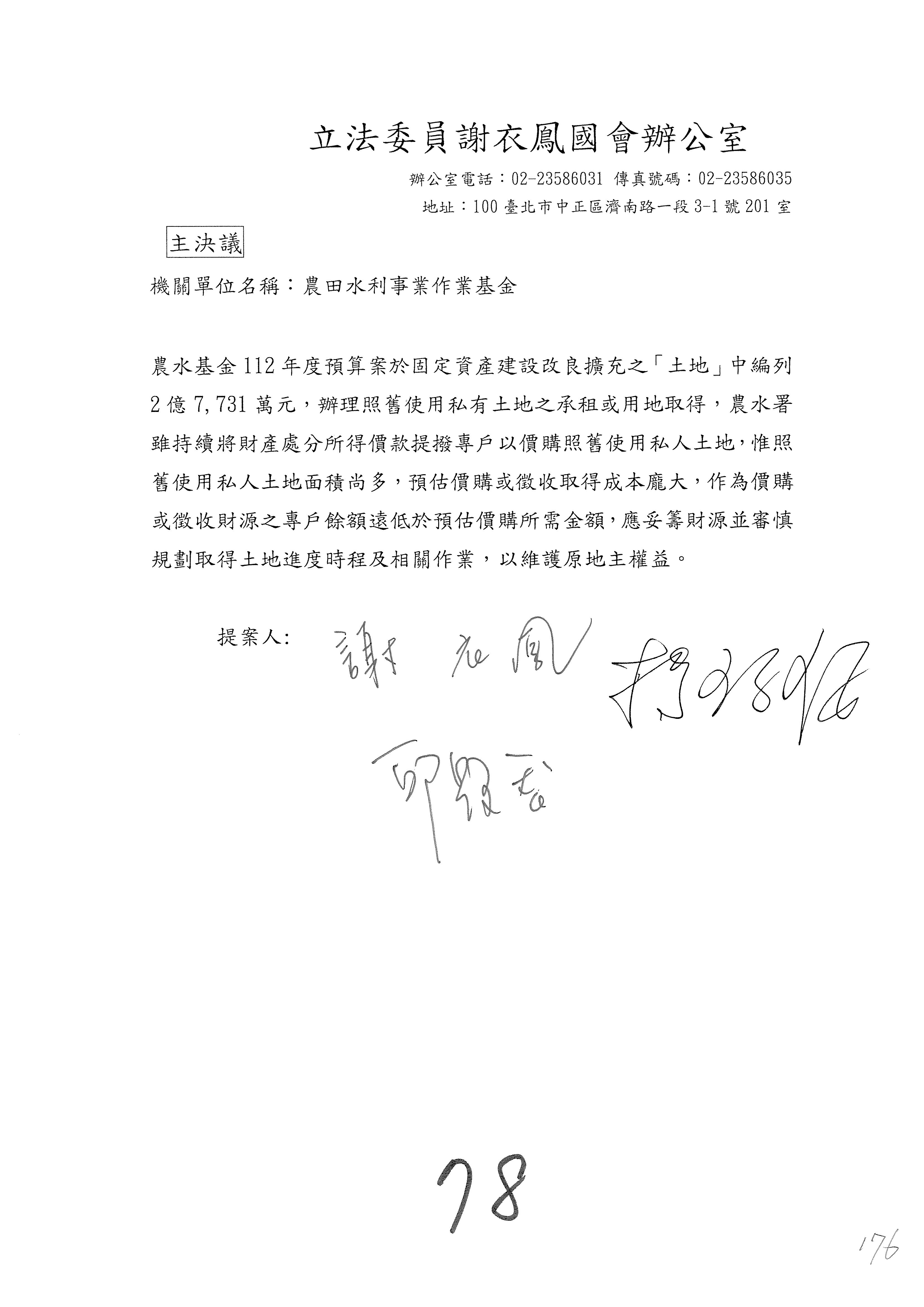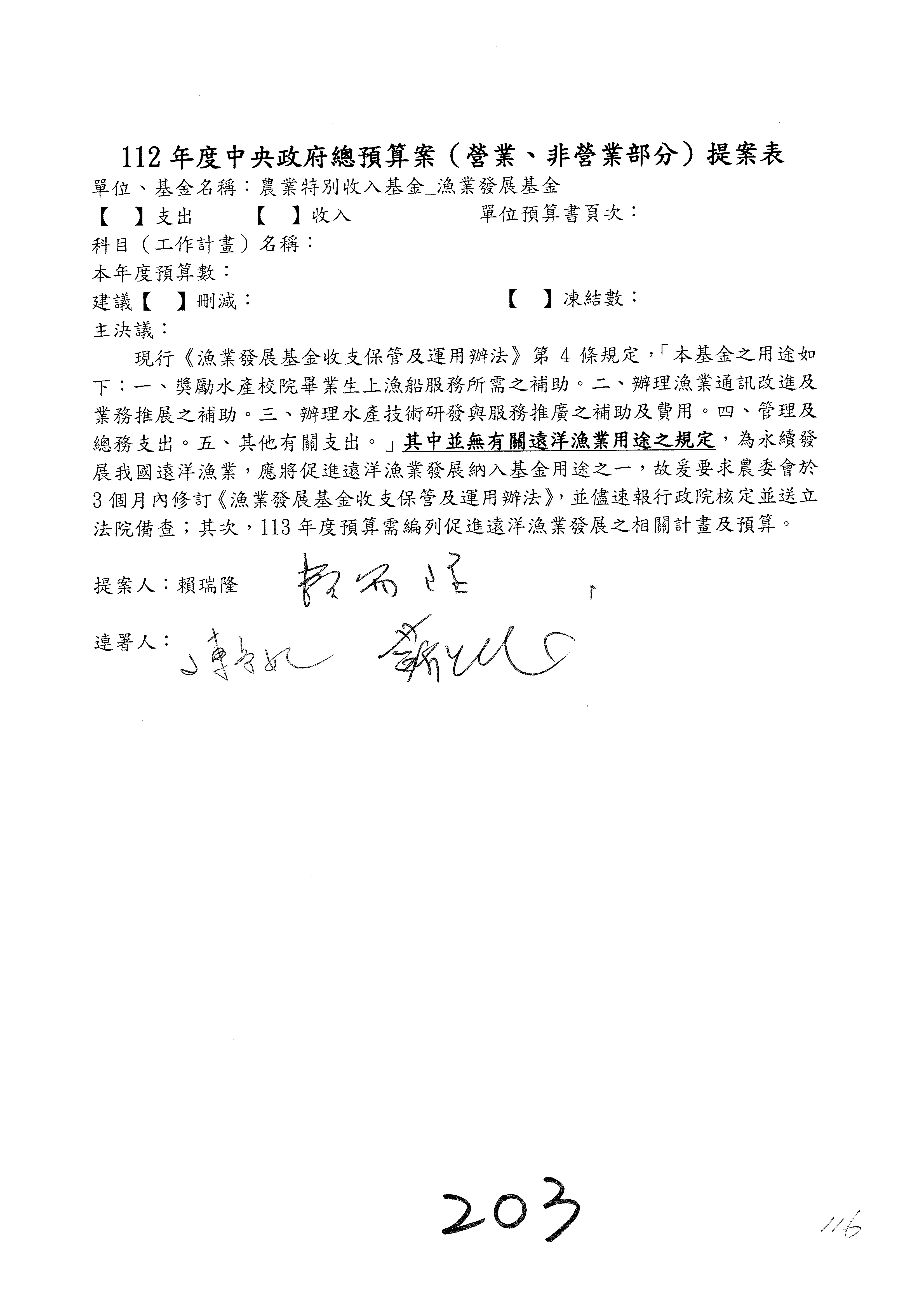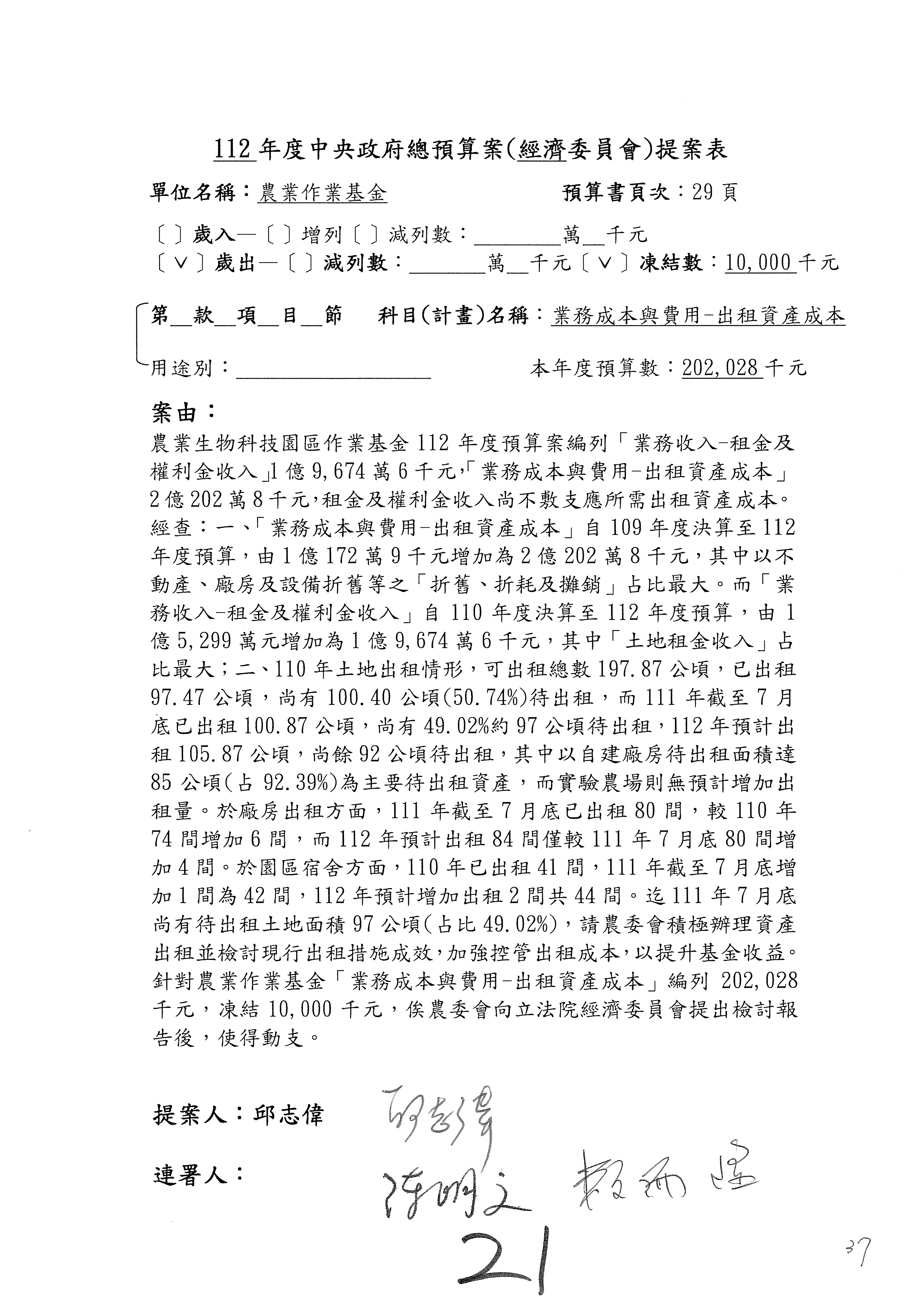 第153案到第168案,農村再生基金凍結2,000萬元,提出書面報告後始得動支。