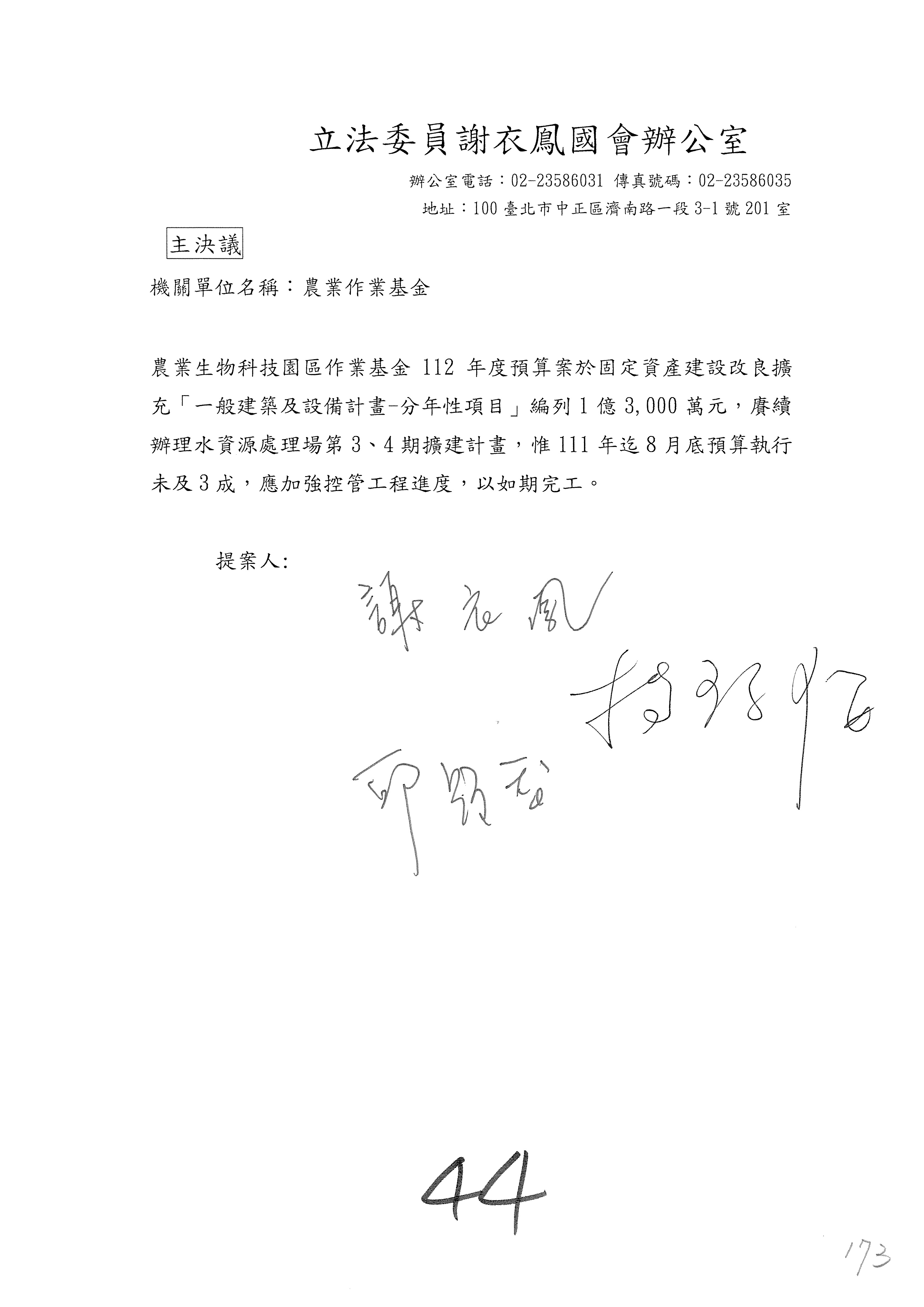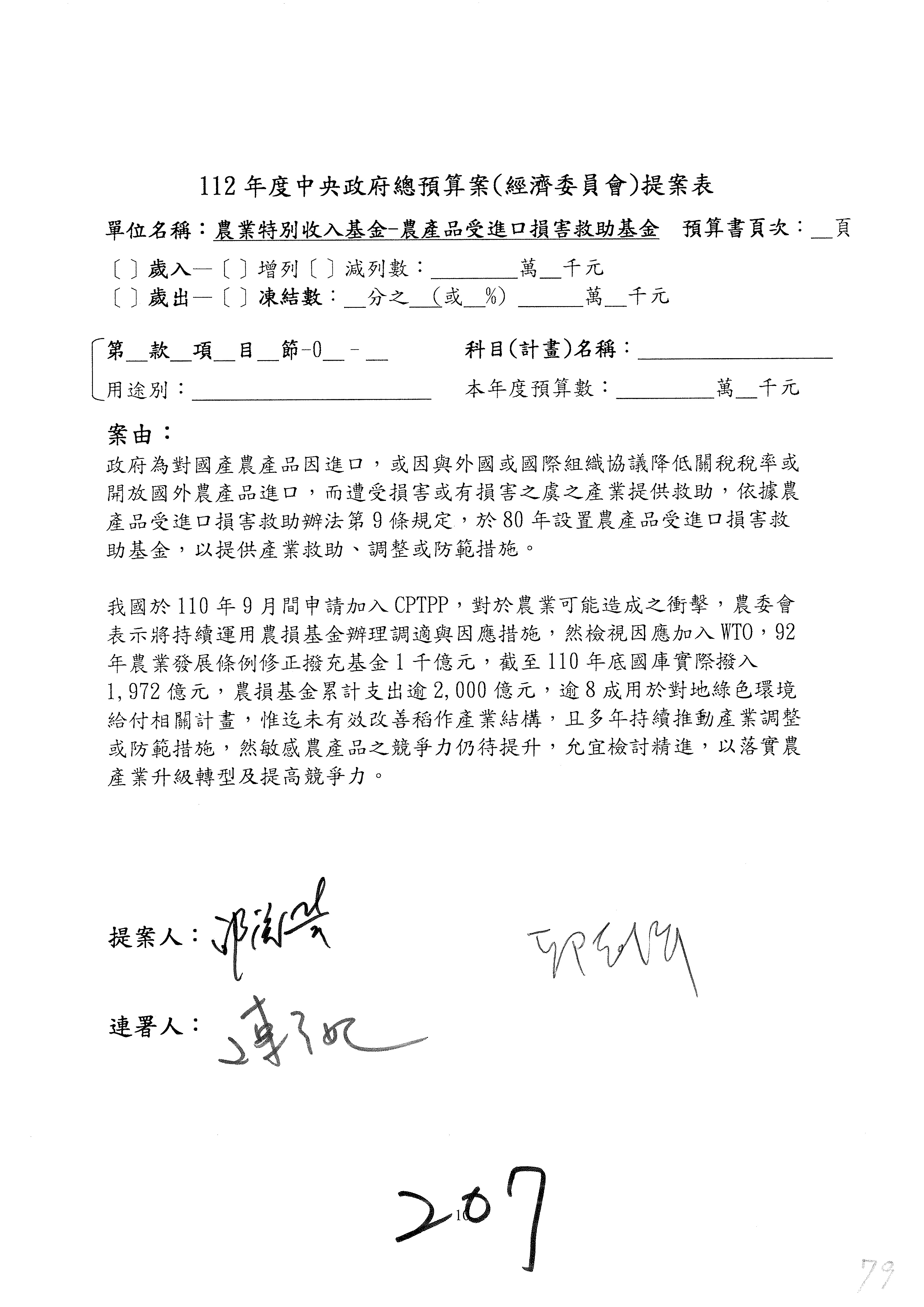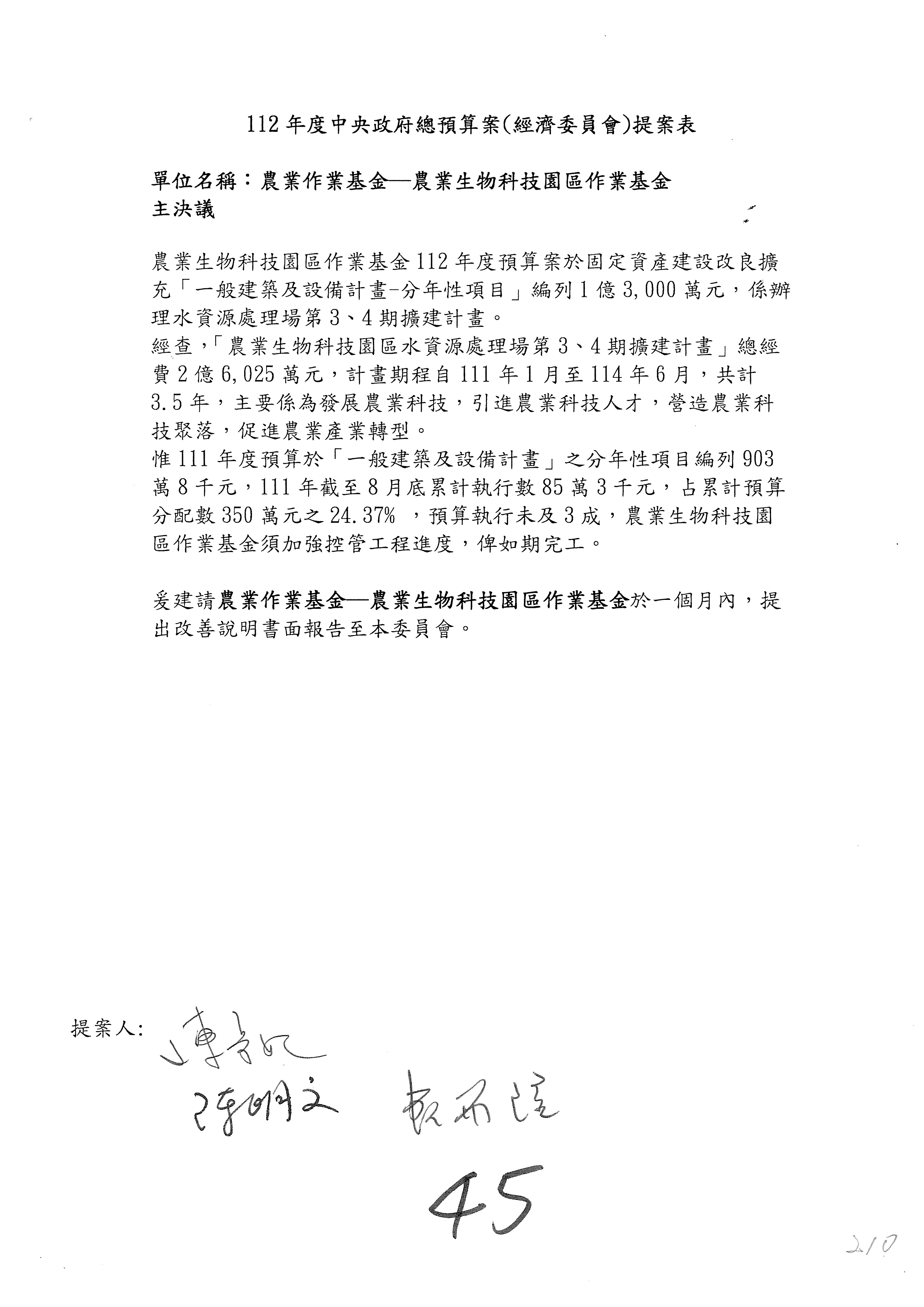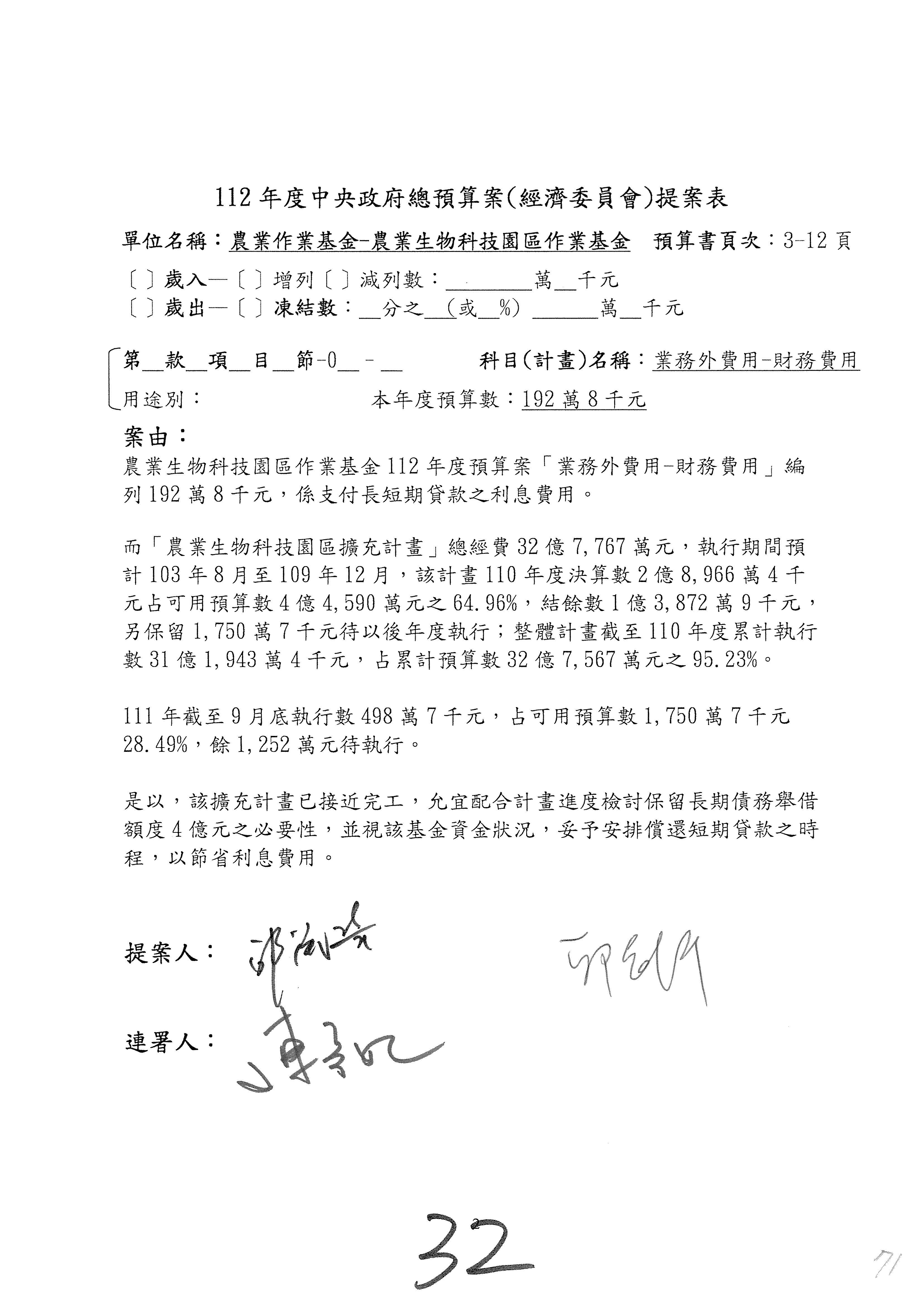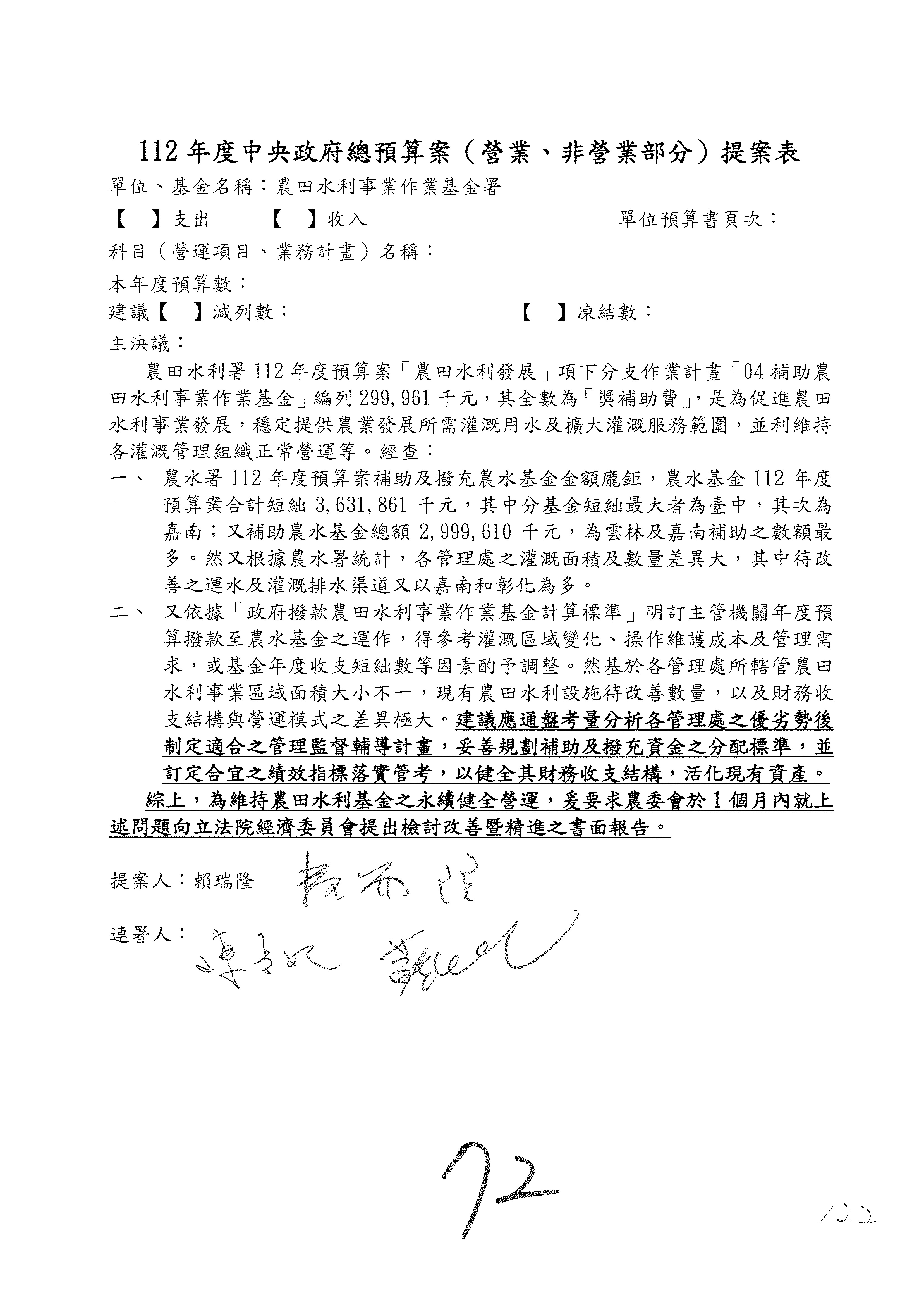 第153案到第168案,農村再生基金凍結2,000萬元,提出書面報告後始得動支。