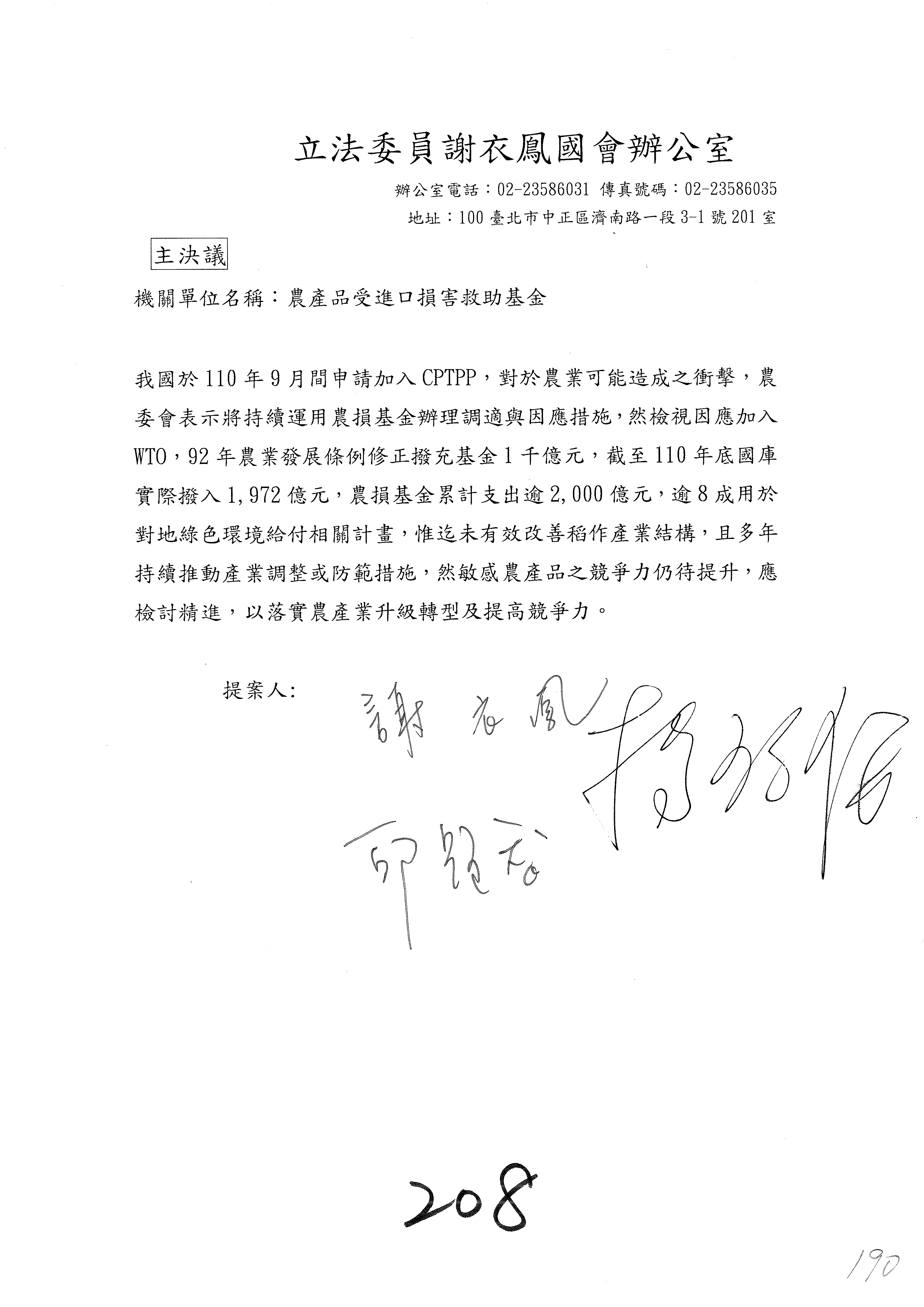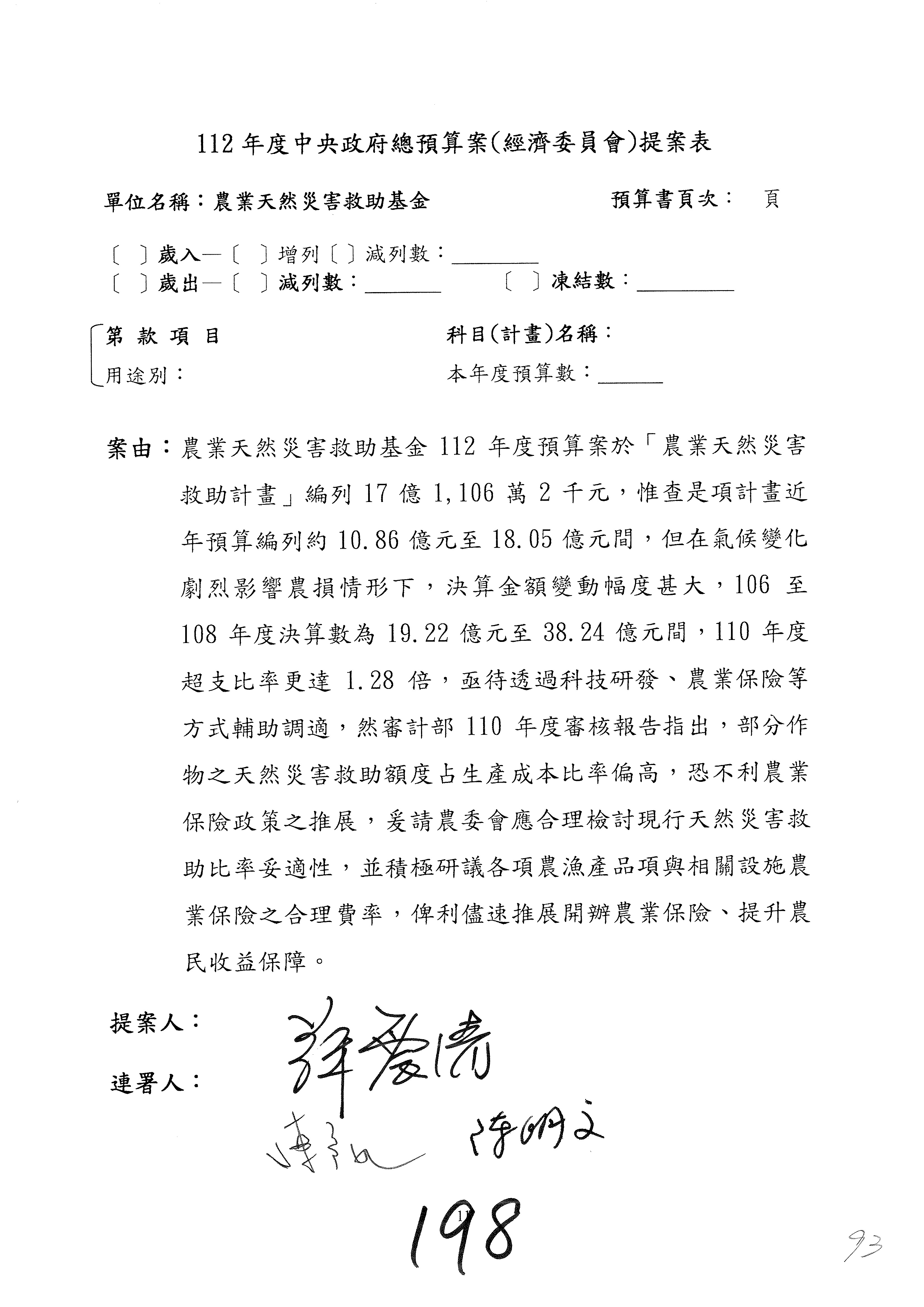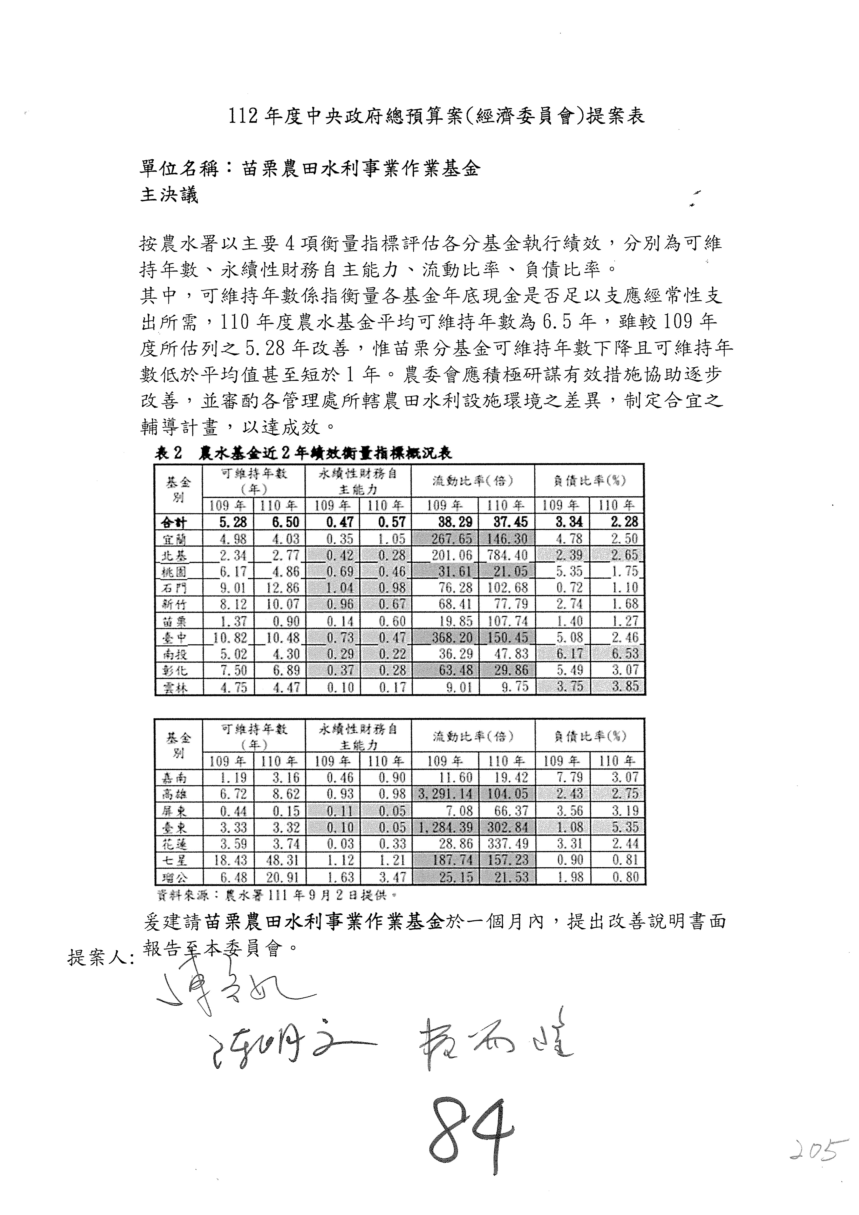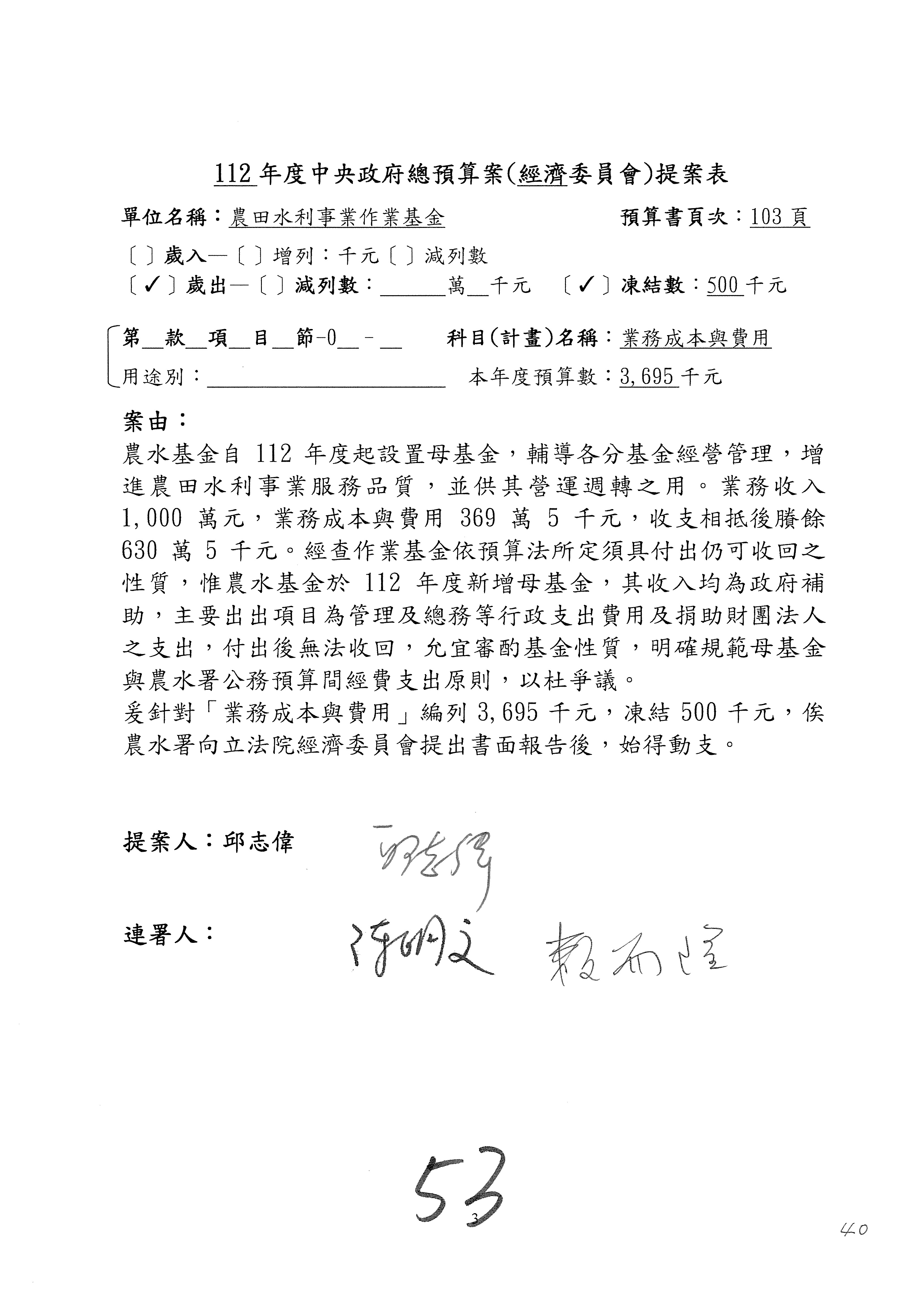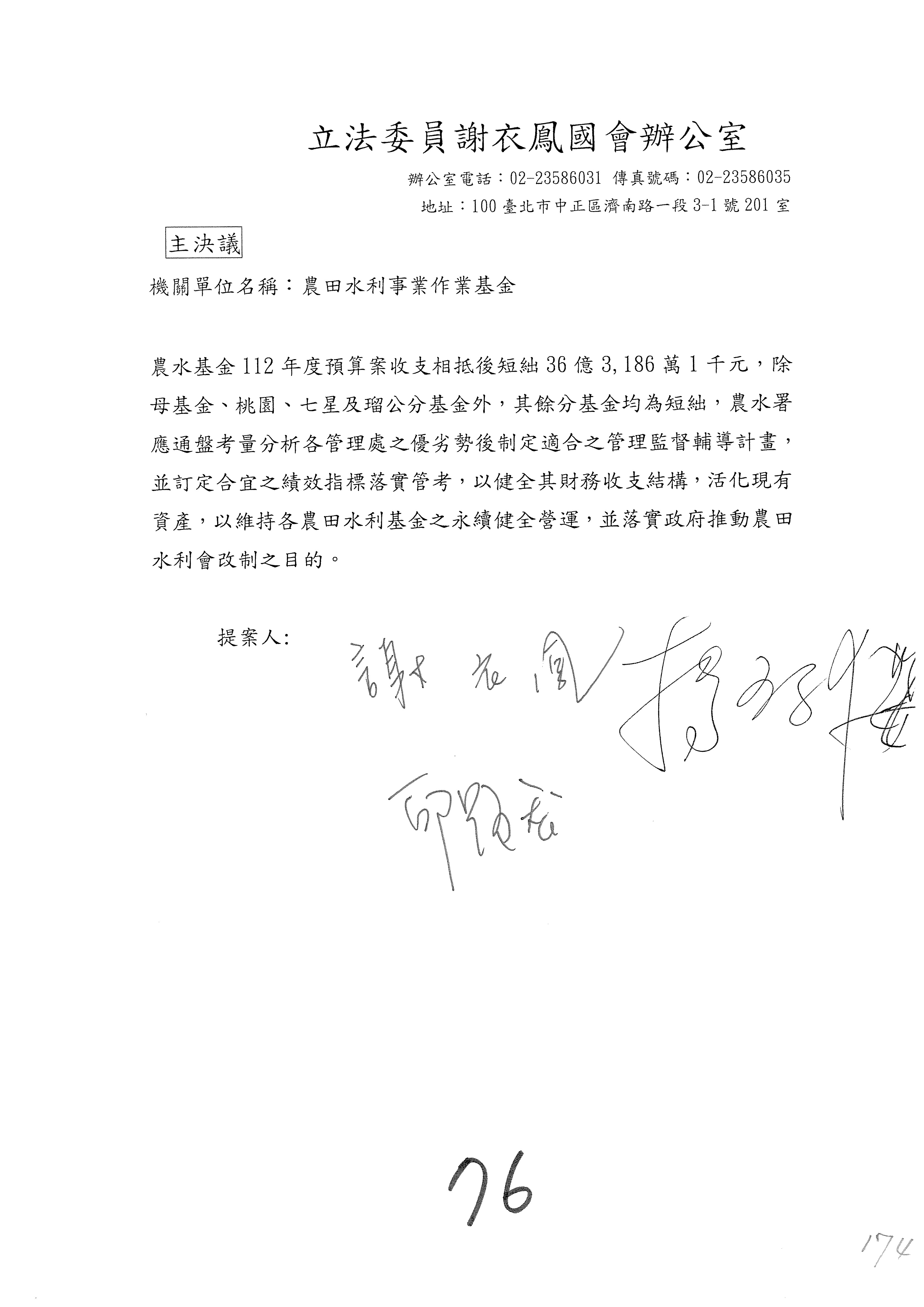 第153案到第168案,農村再生基金凍結2,000萬元,提出書面報告後始得動支。