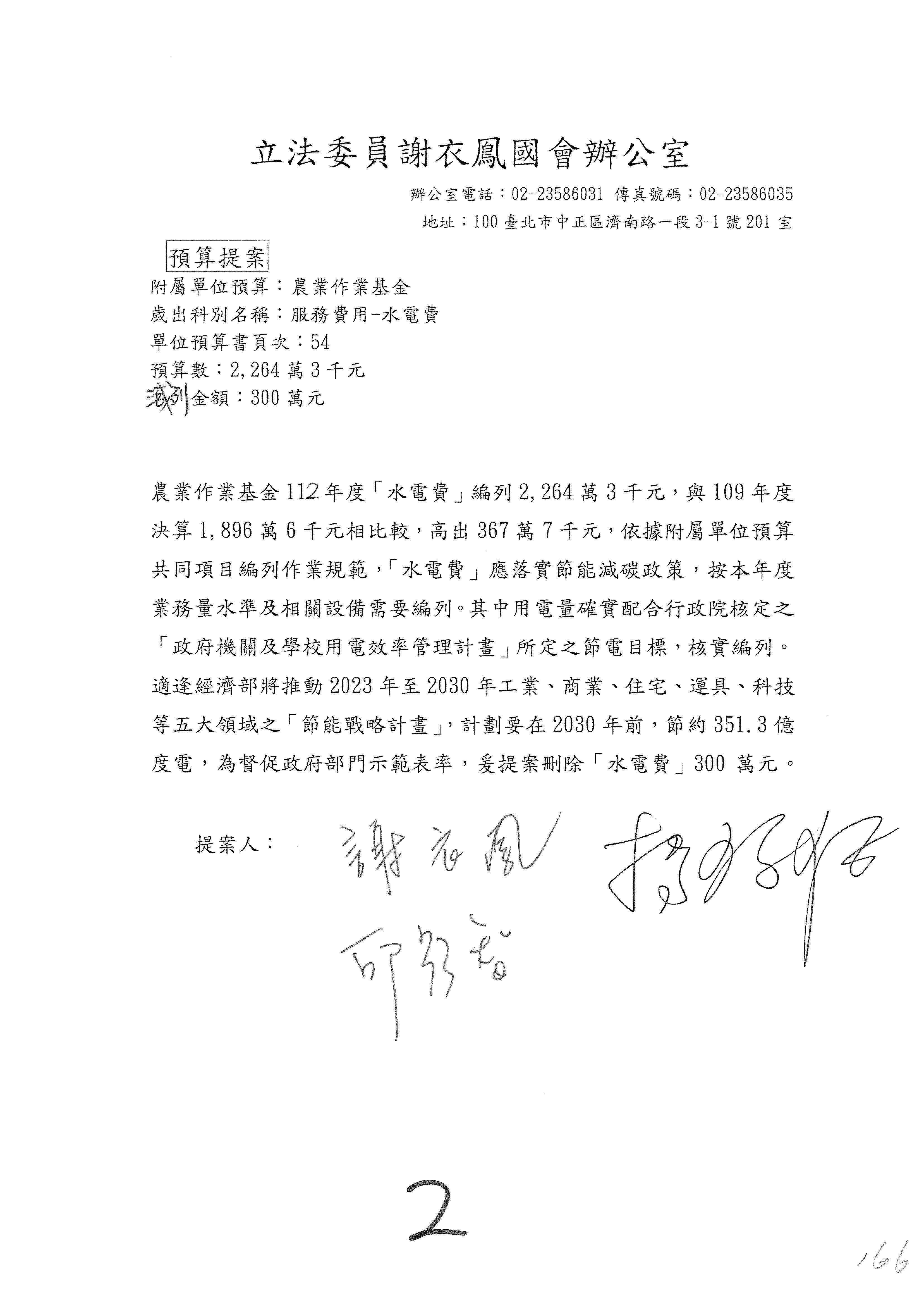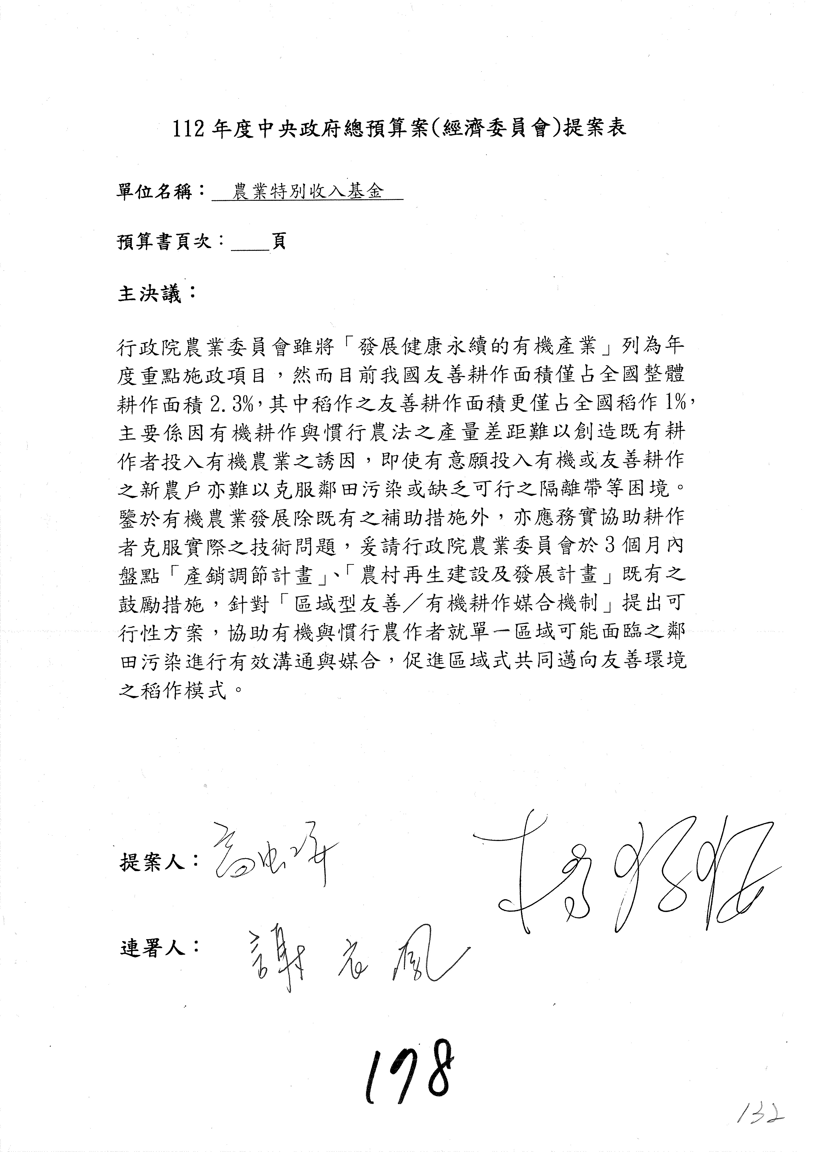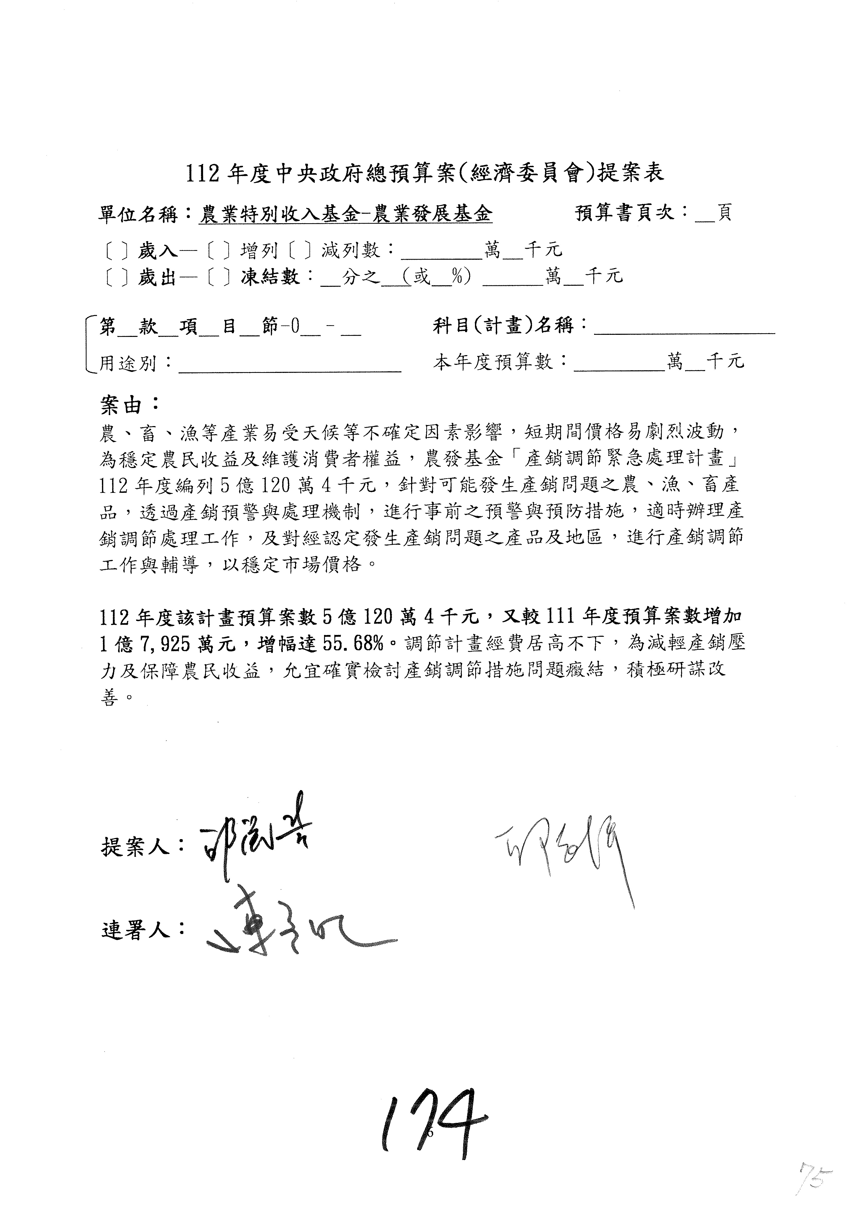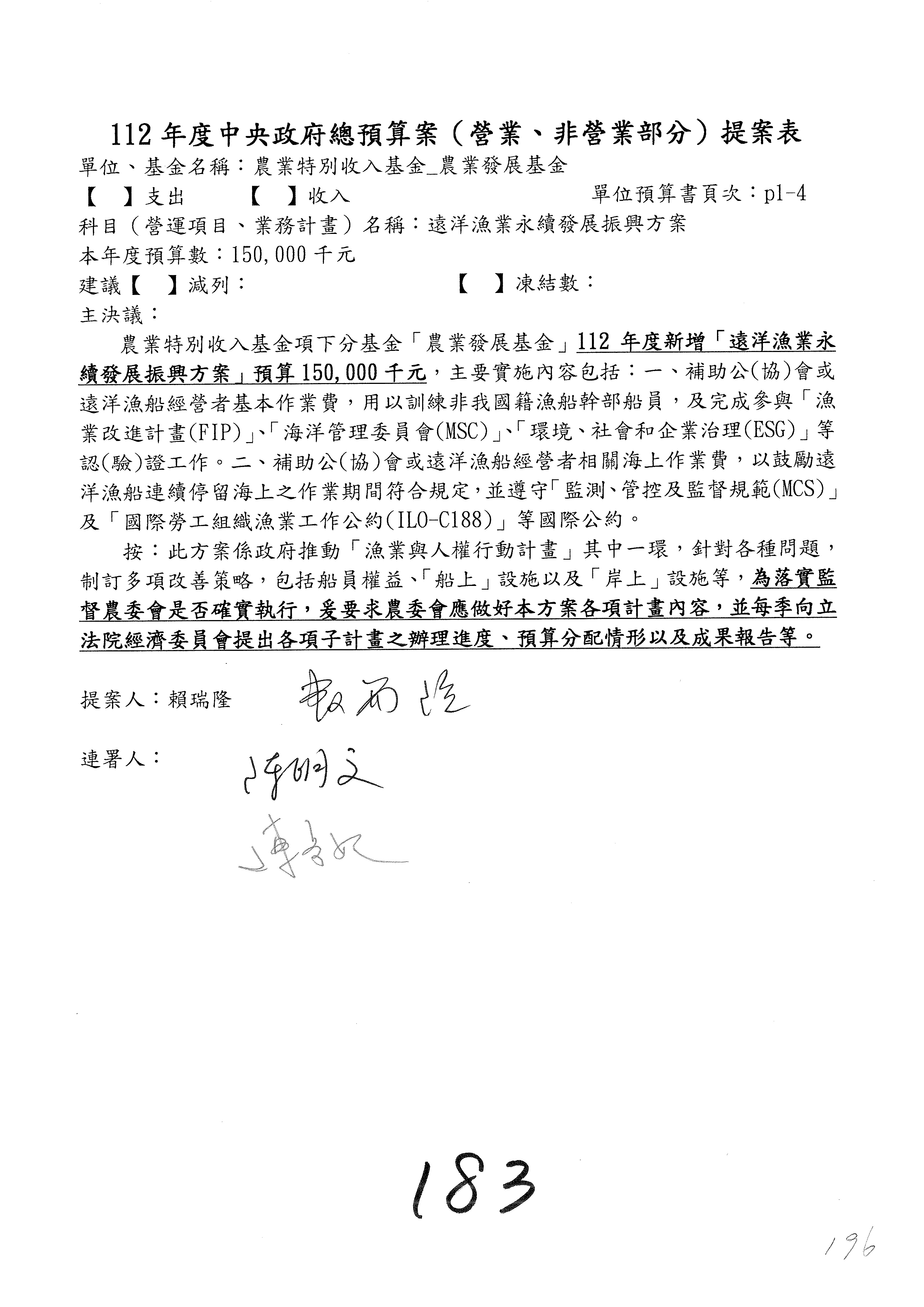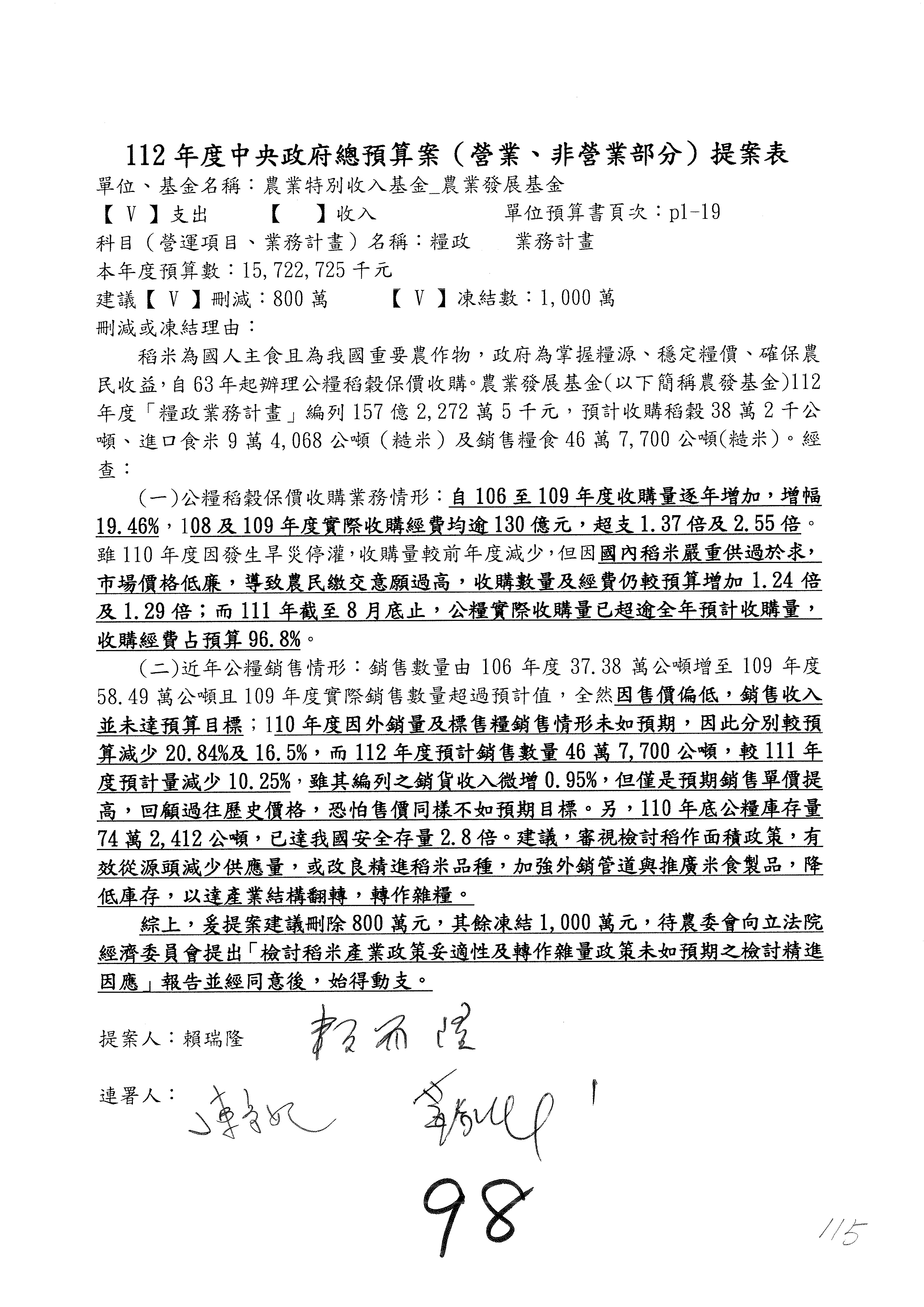 第153案到第168案,農村再生基金凍結2,000萬元,提出書面報告後始得動支。