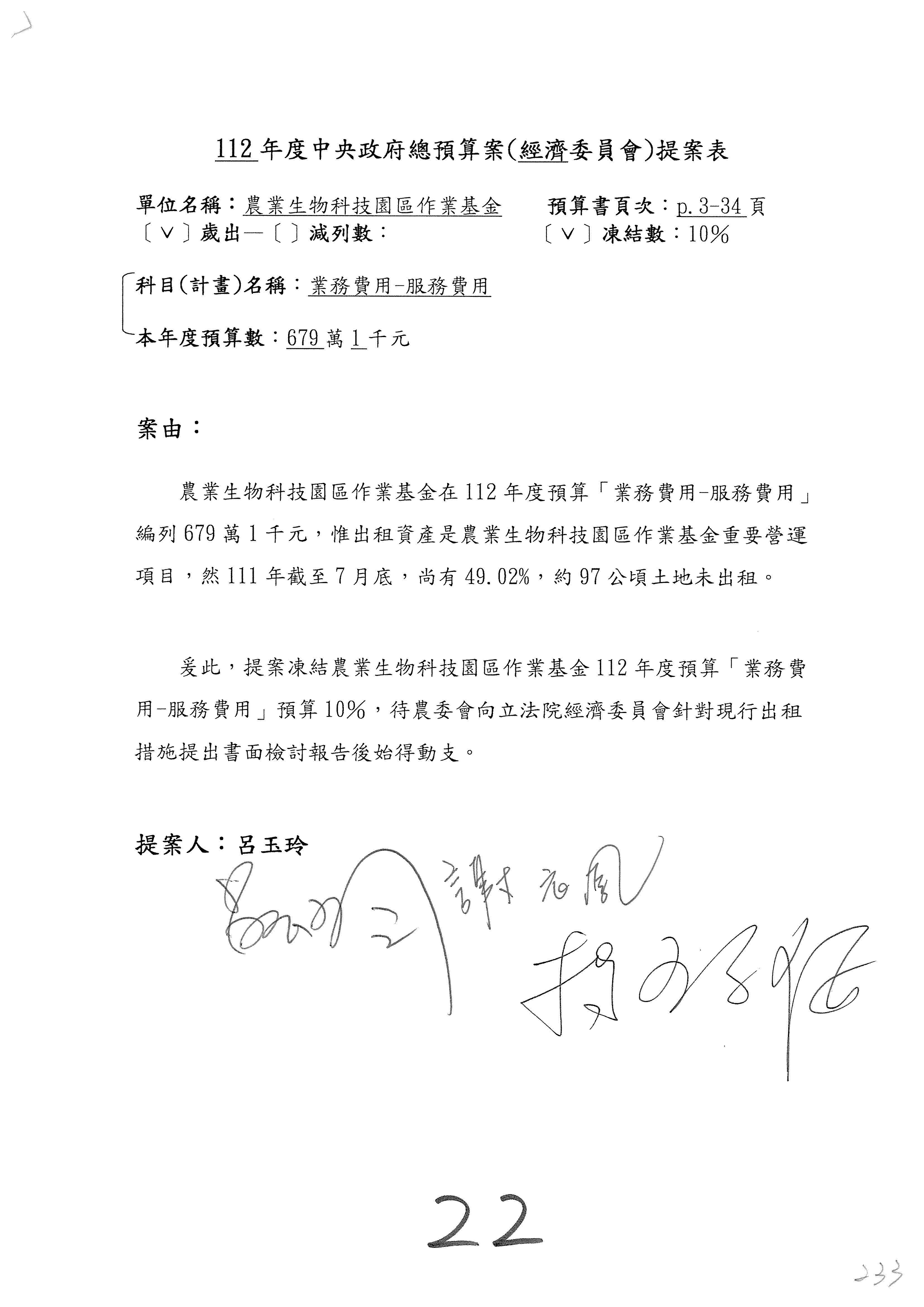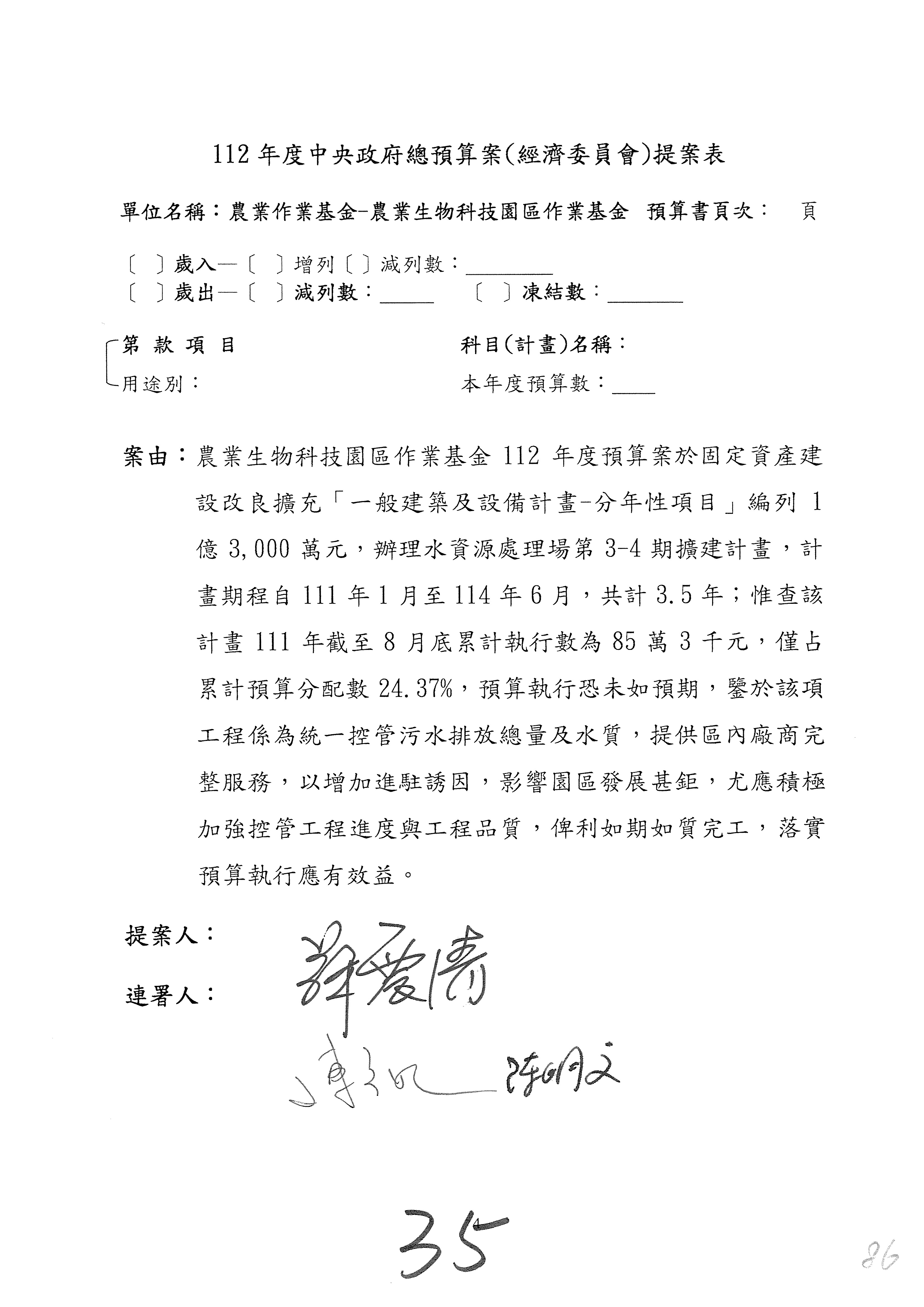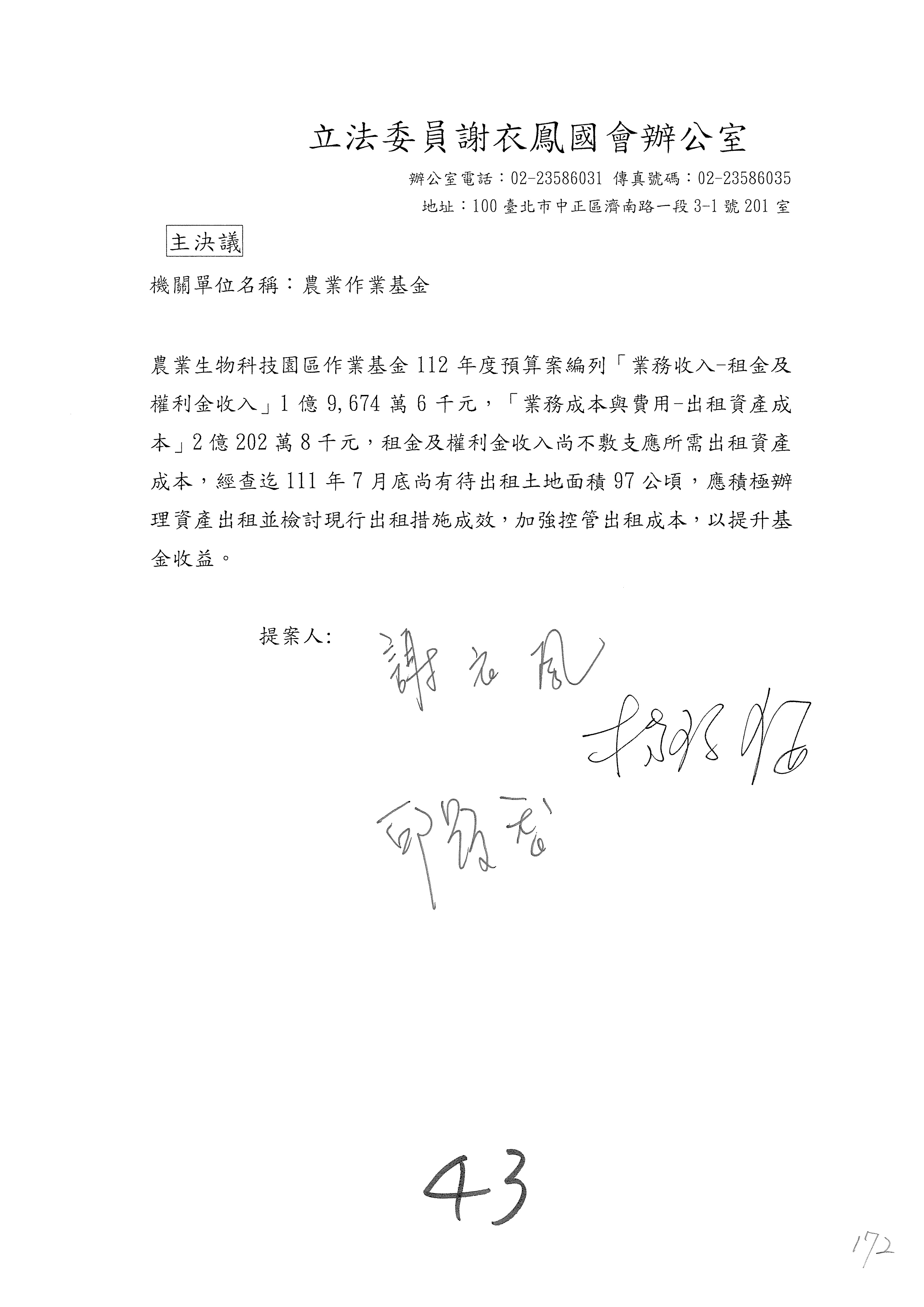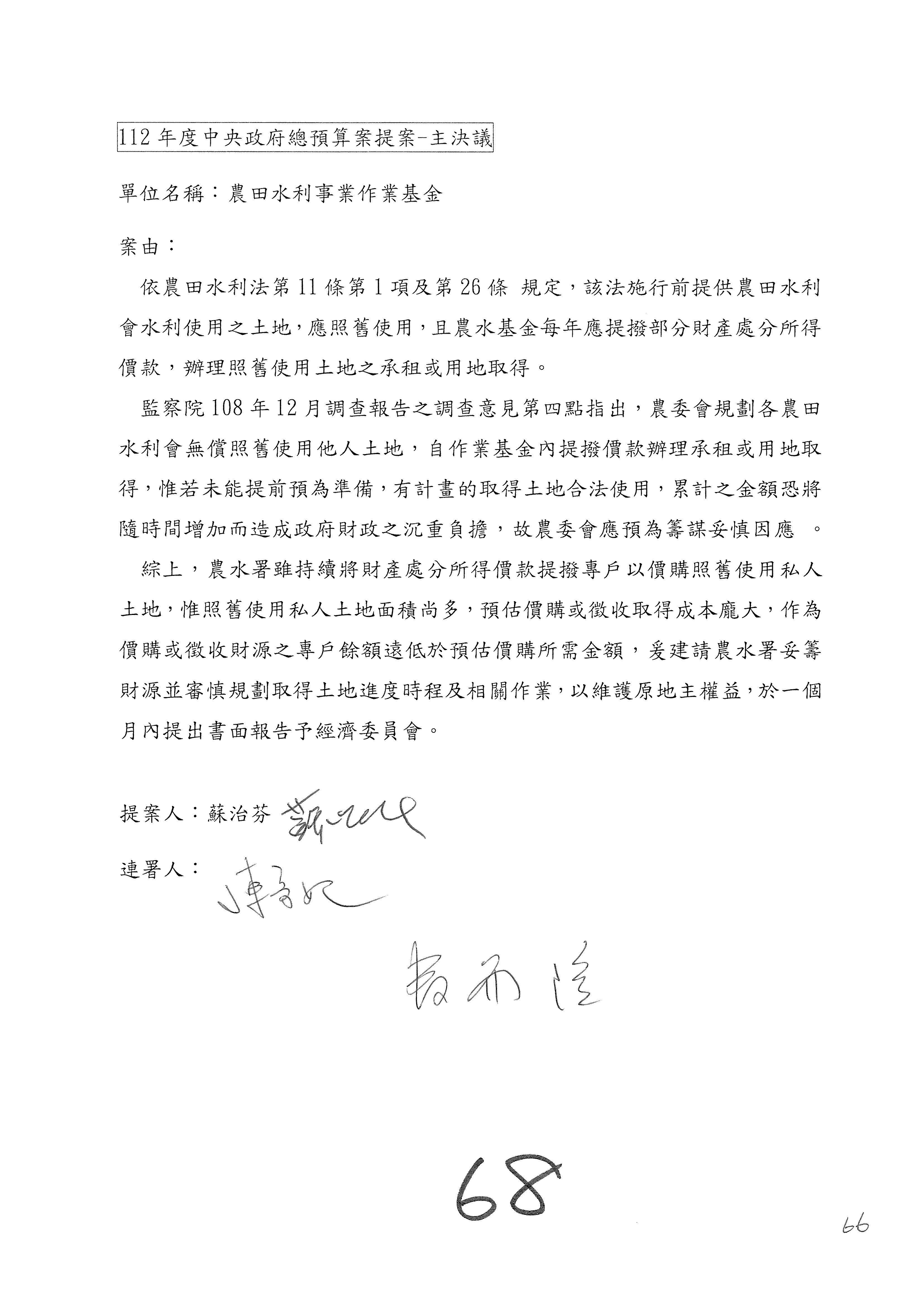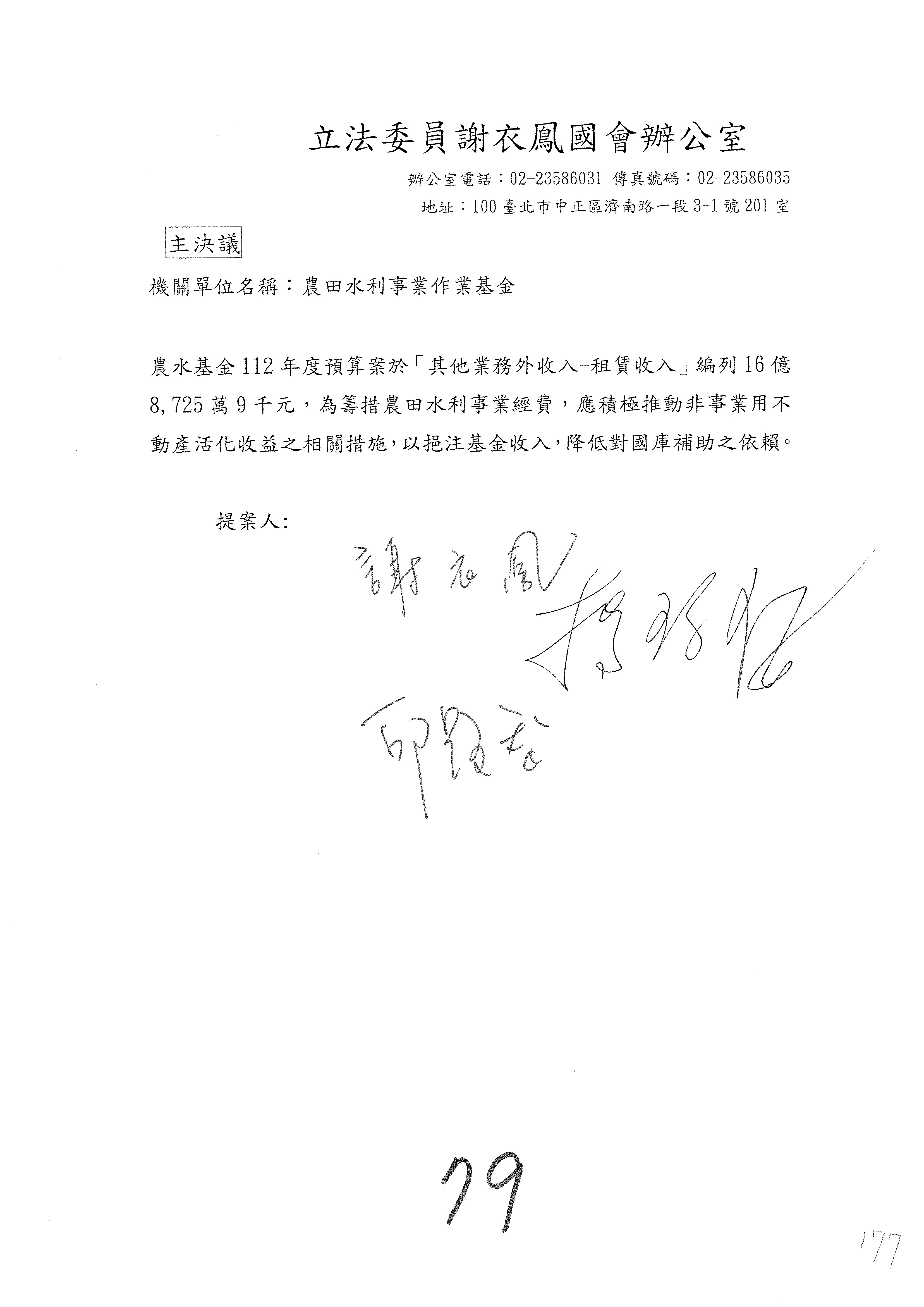 第153案到第168案,農村再生基金凍結2,000萬元,提出書面報告後始得動支。