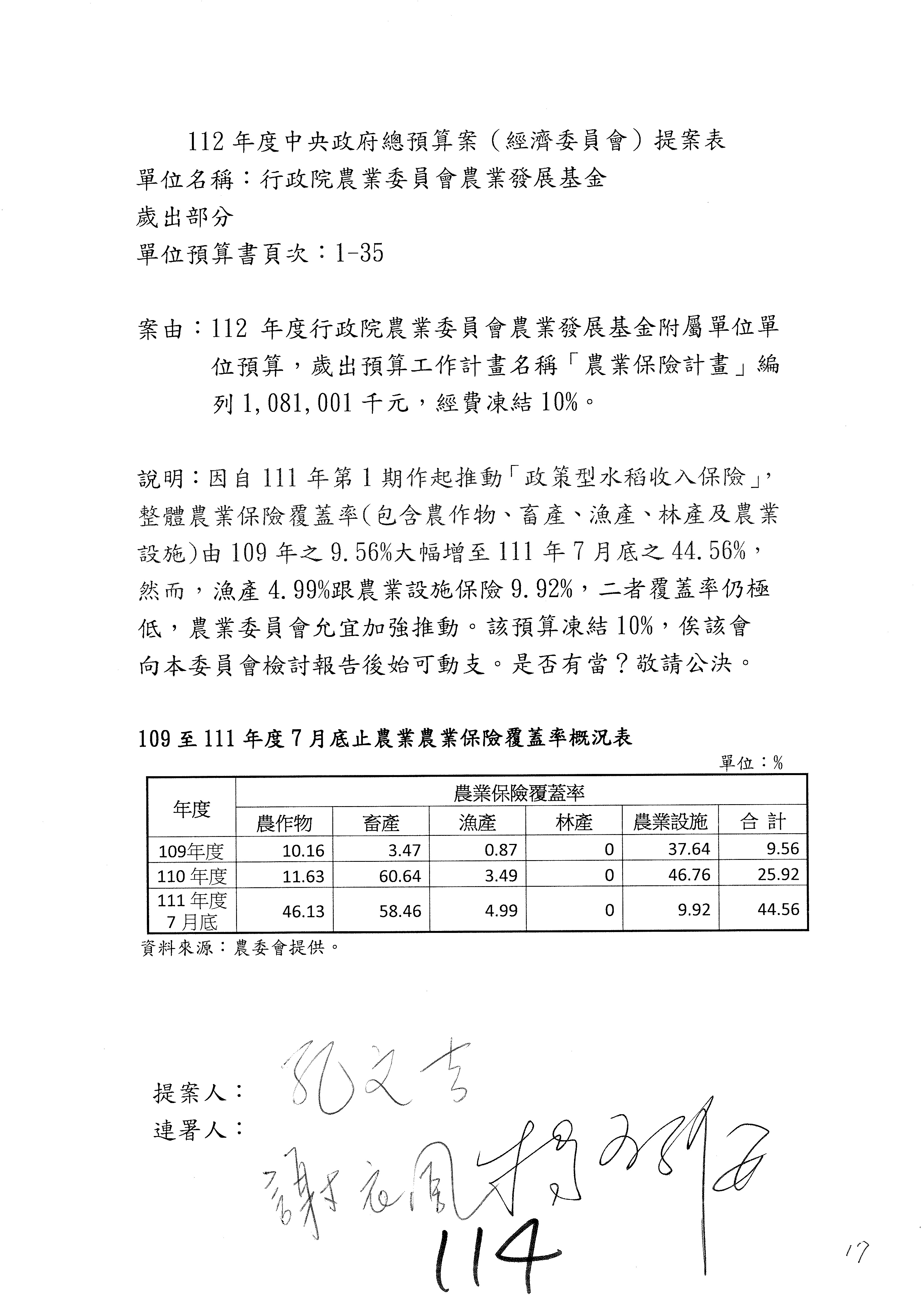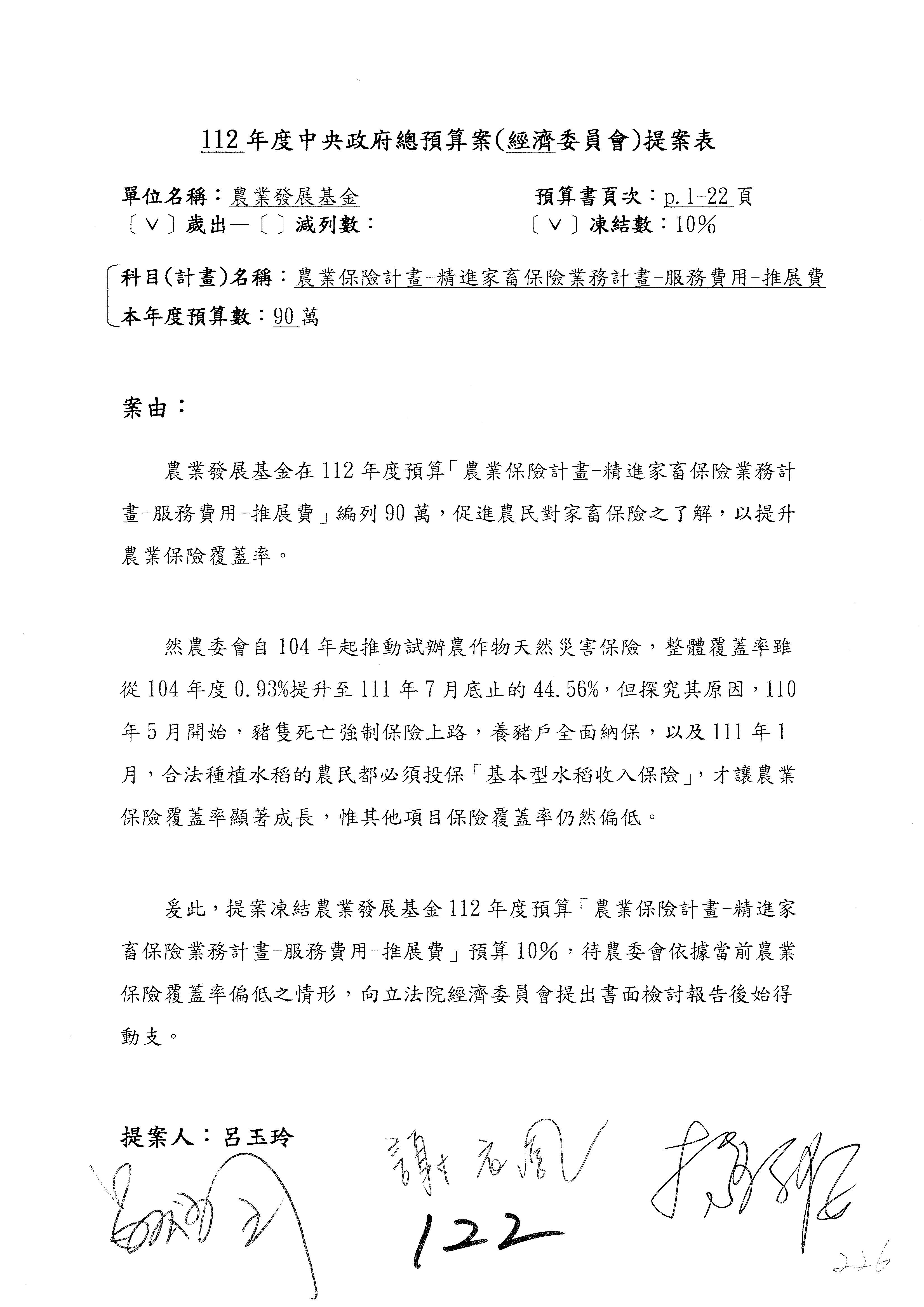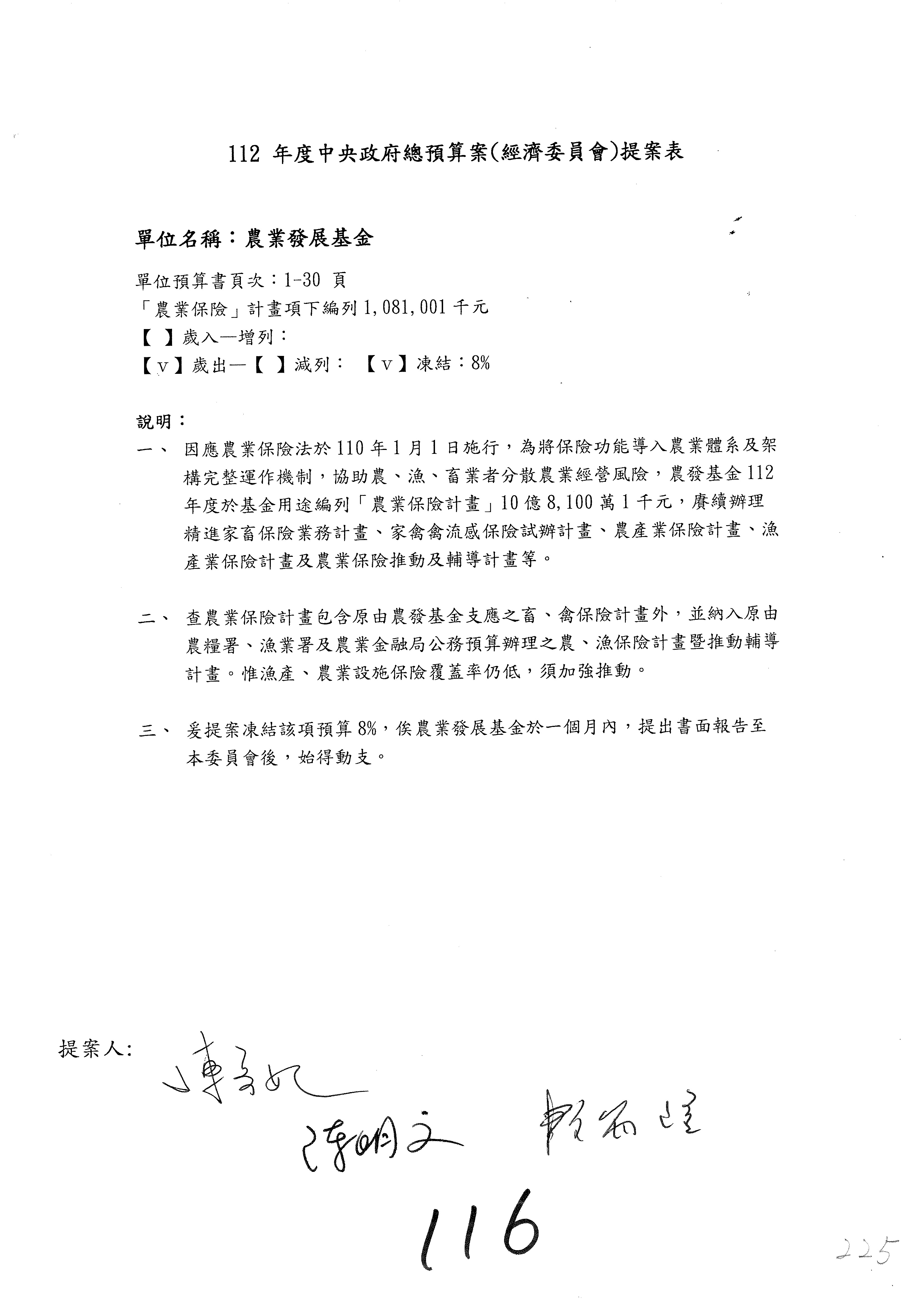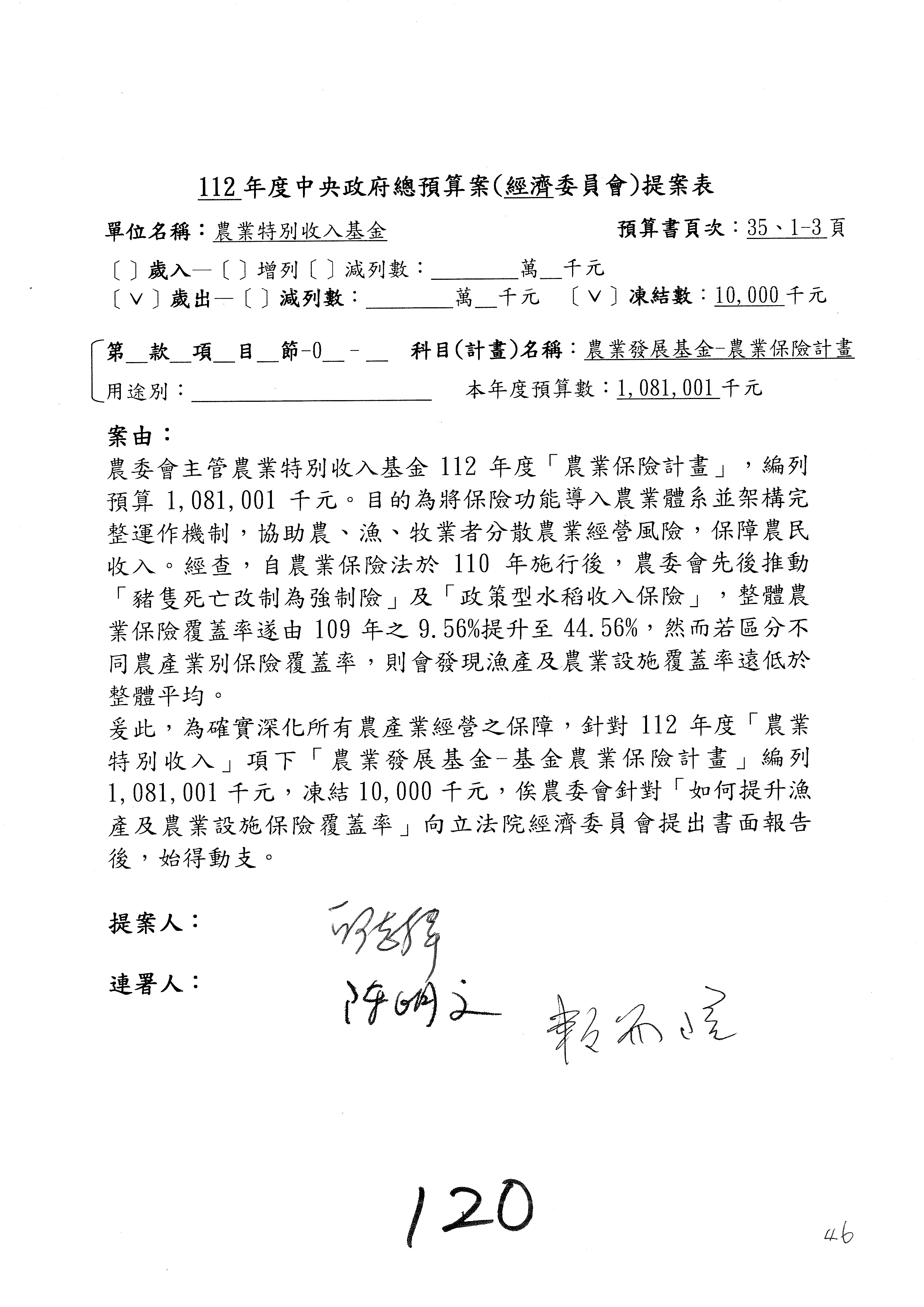 農業保險計畫凍結1,000萬元,提出書面報告後始得動支。