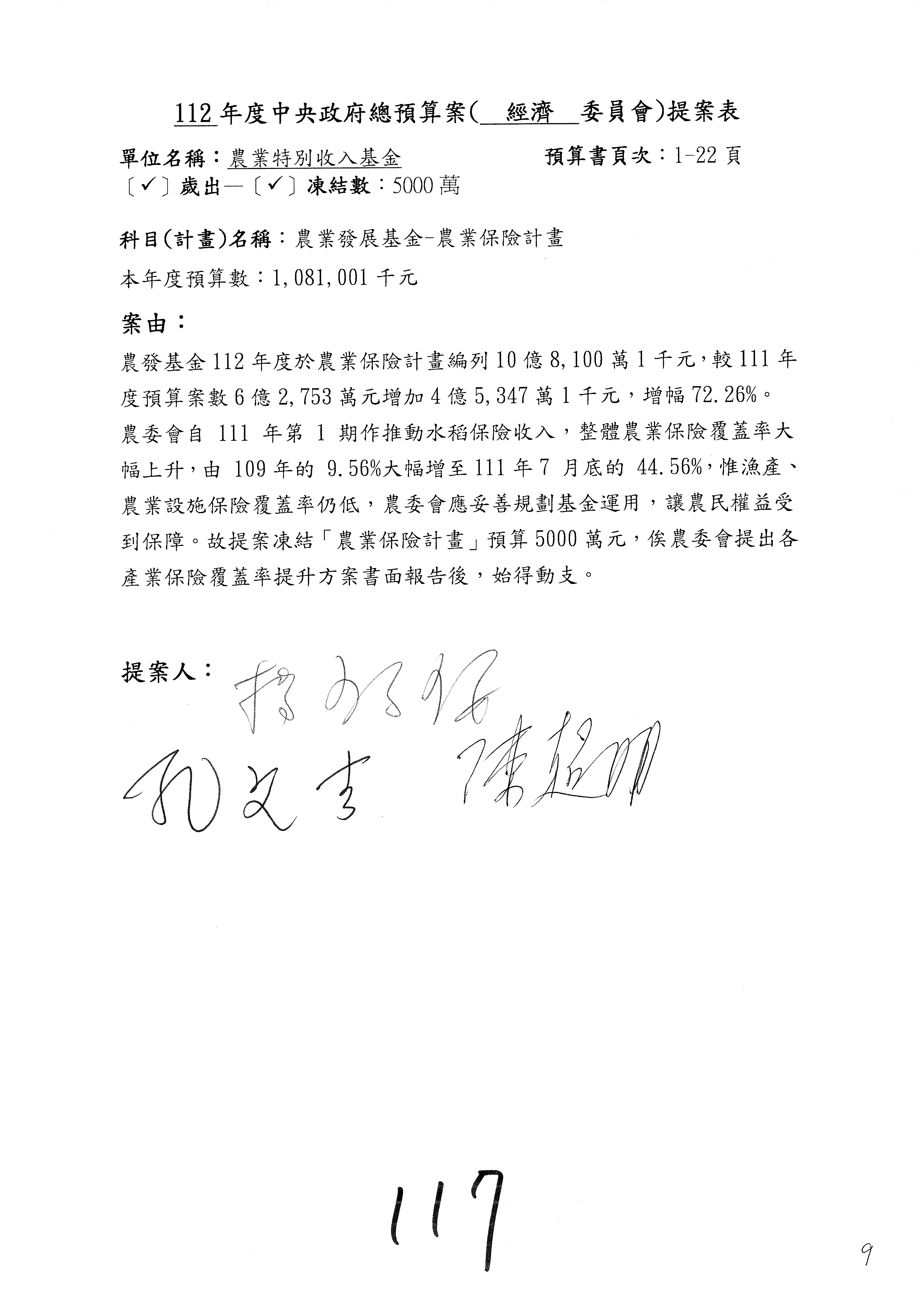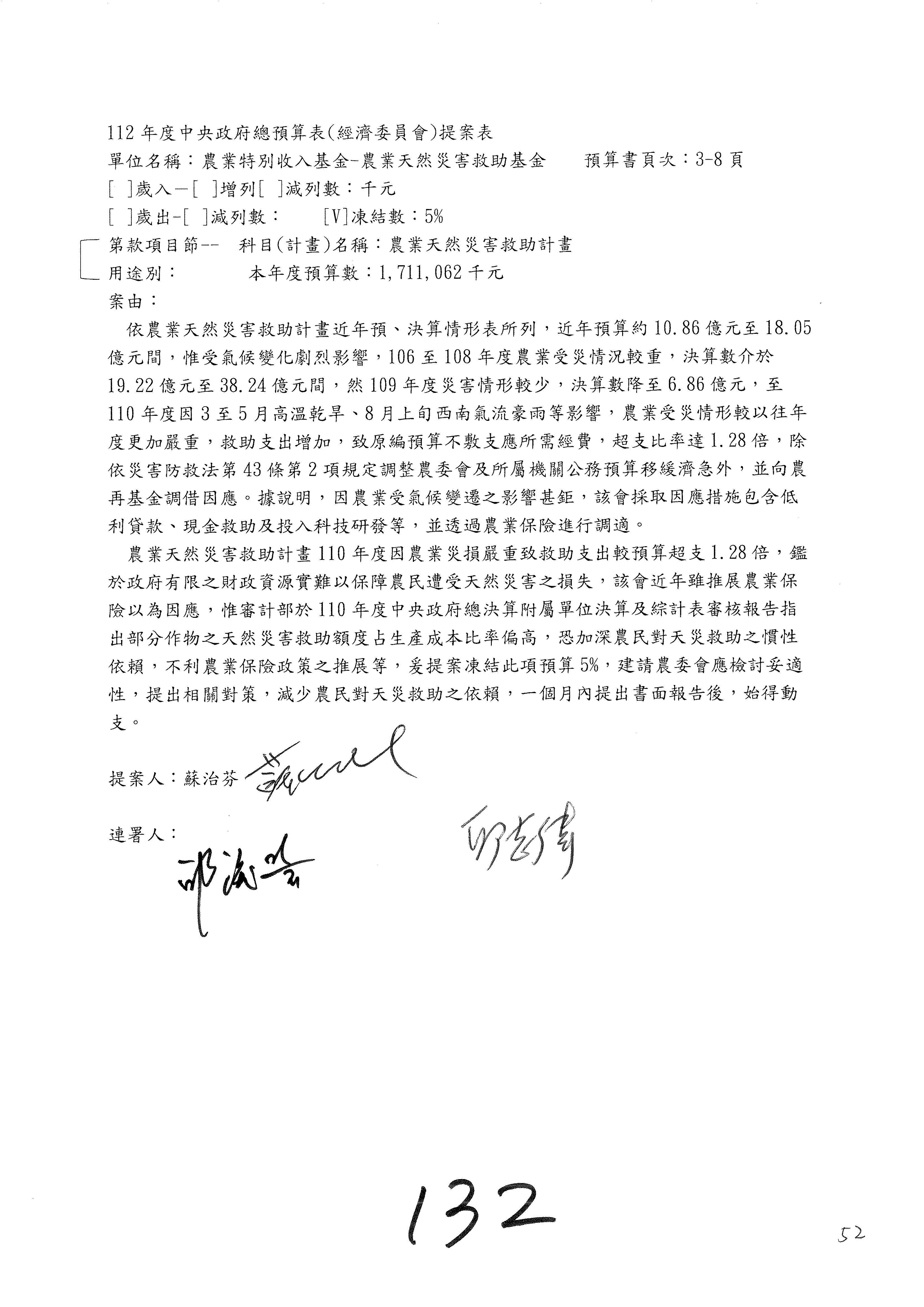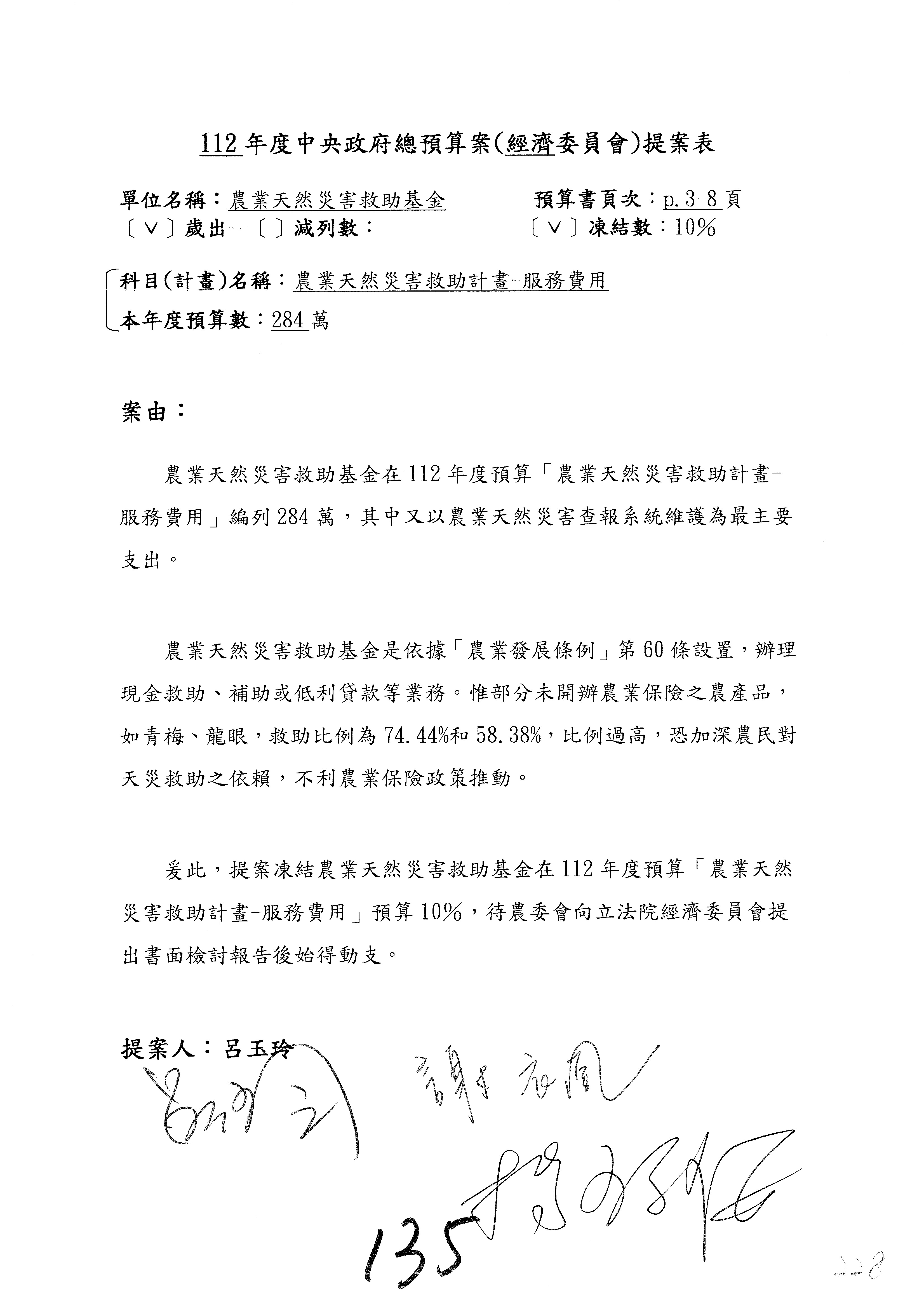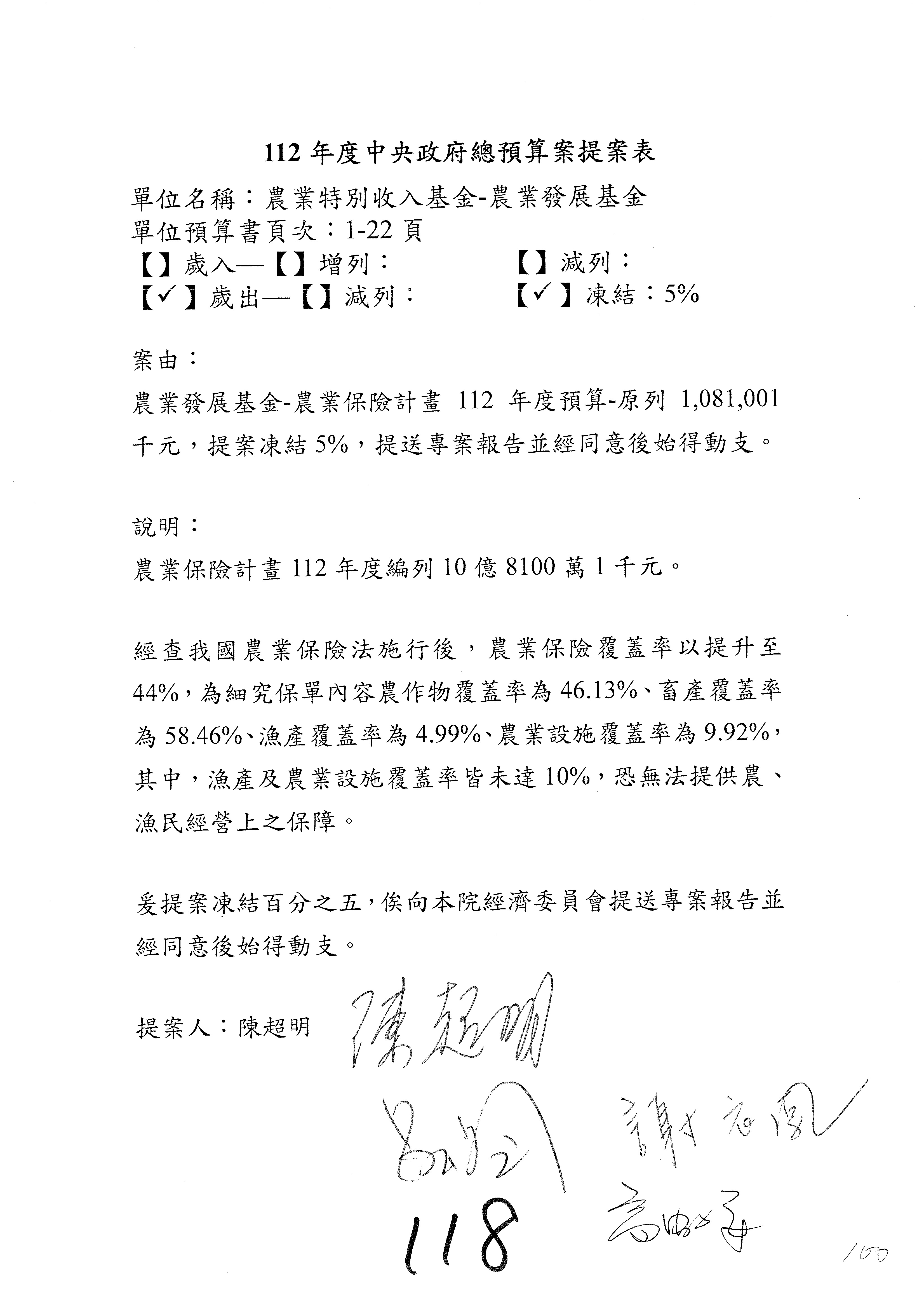 農業保險計畫凍結1,000萬元,提出書面報告後始得動支。
