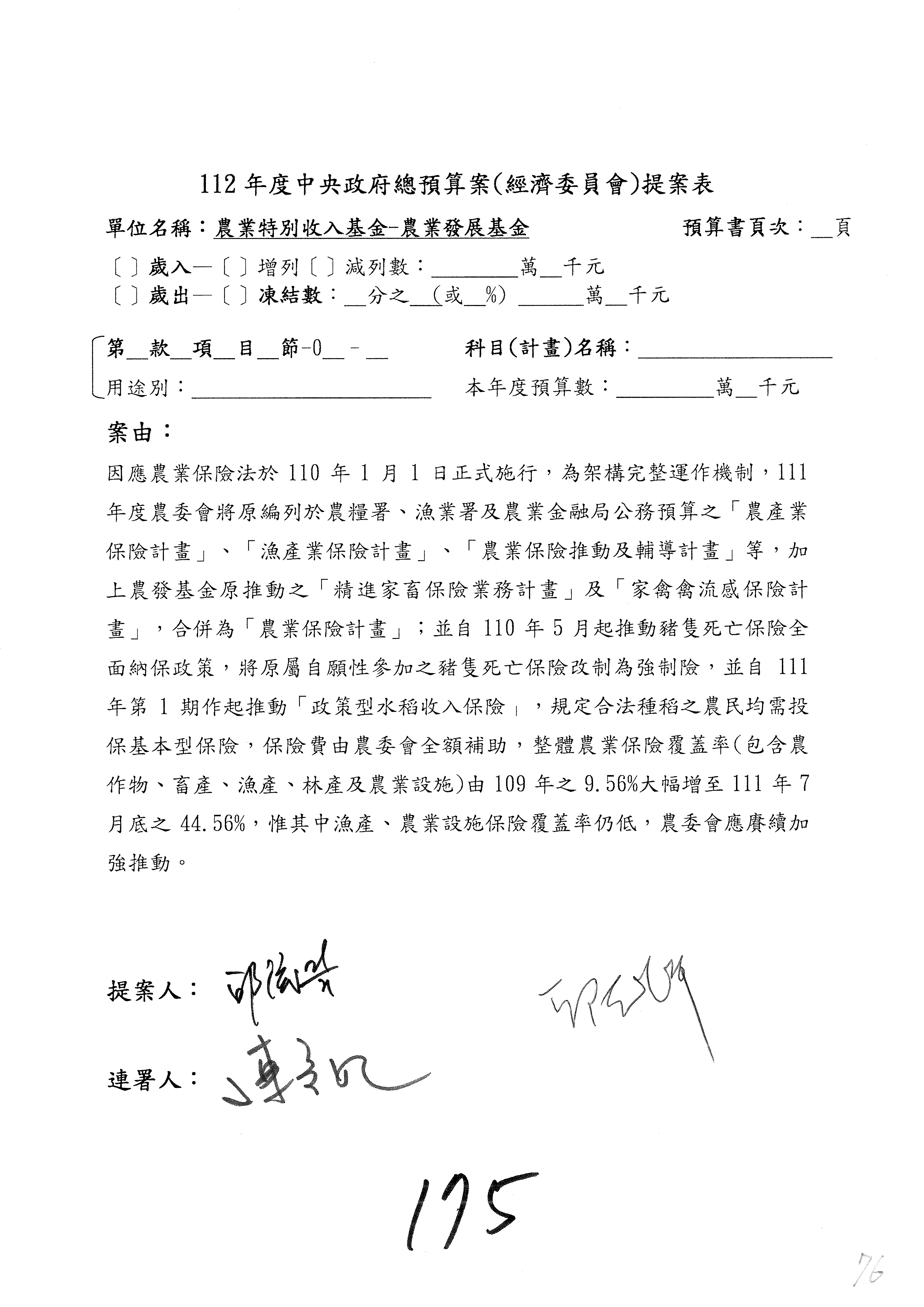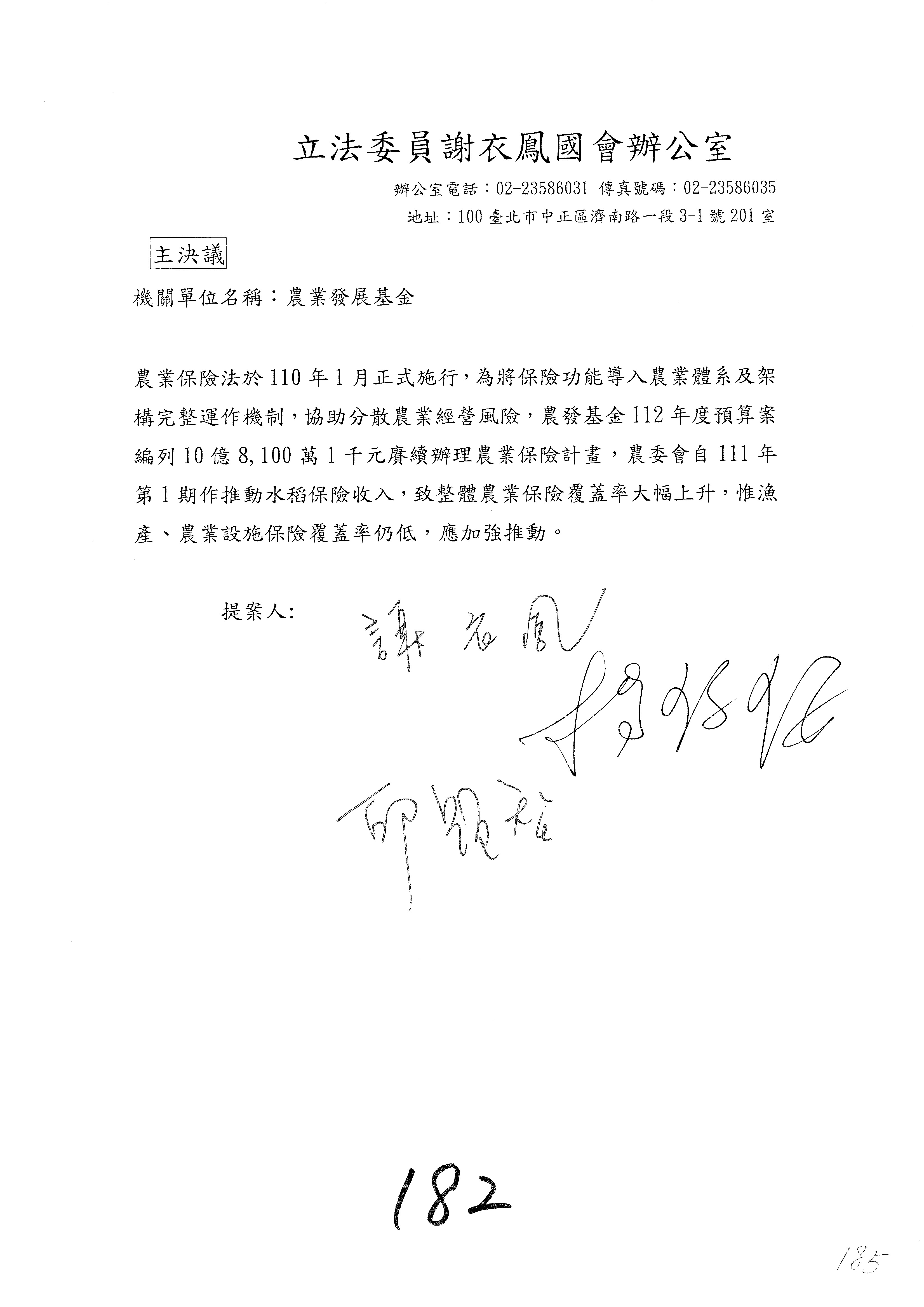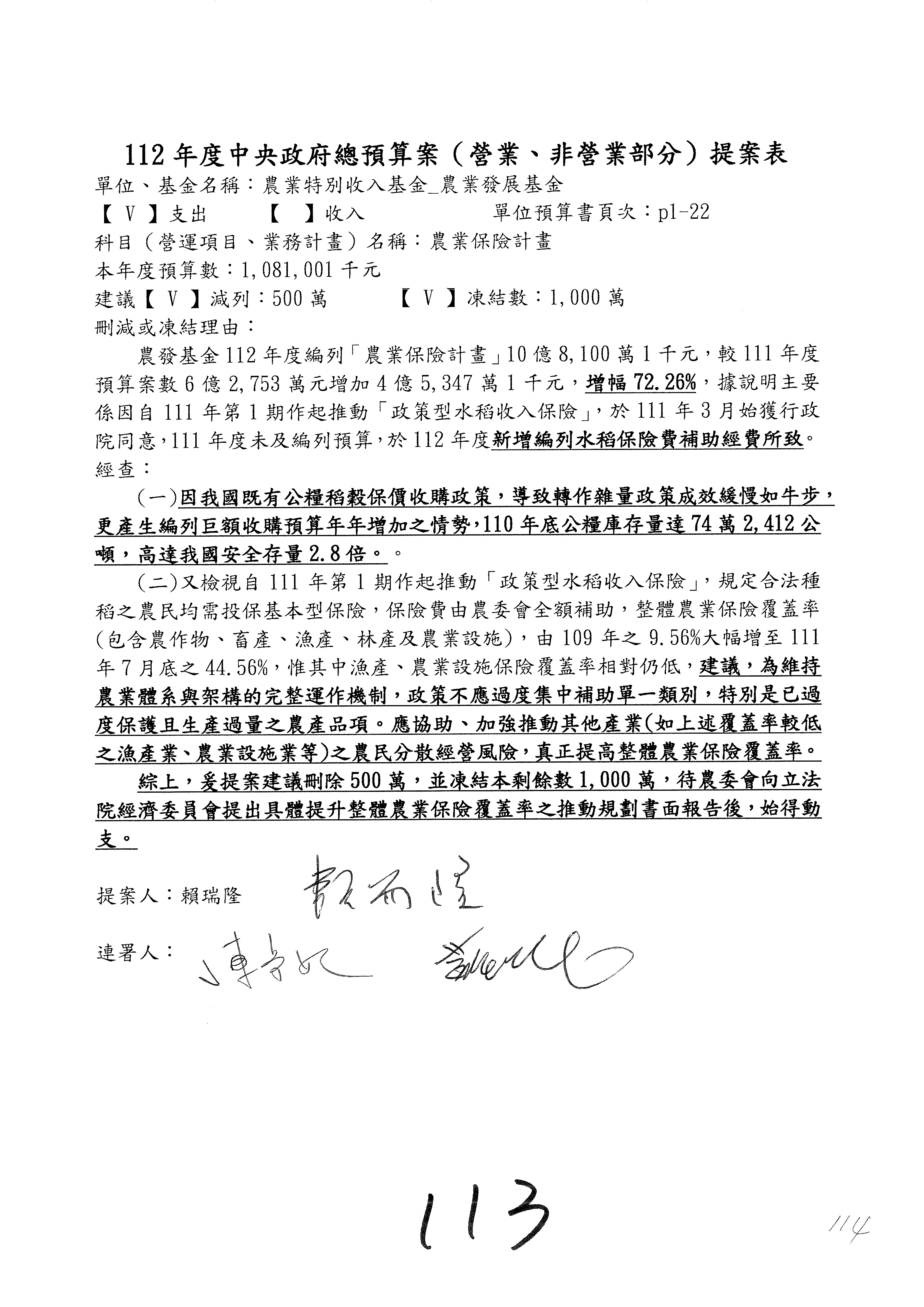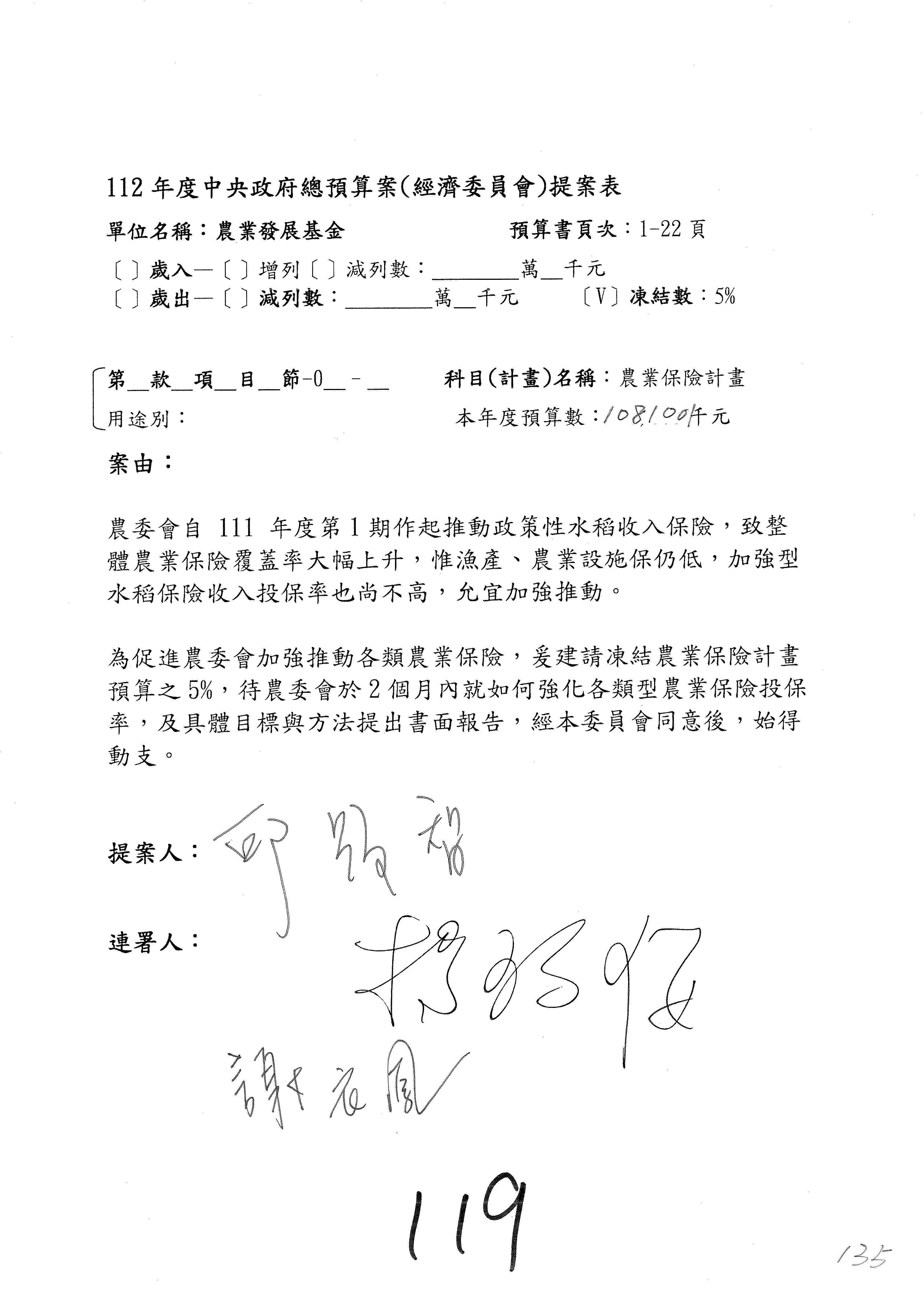 農業保險計畫凍結1,000萬元,提出書面報告後始得動支。