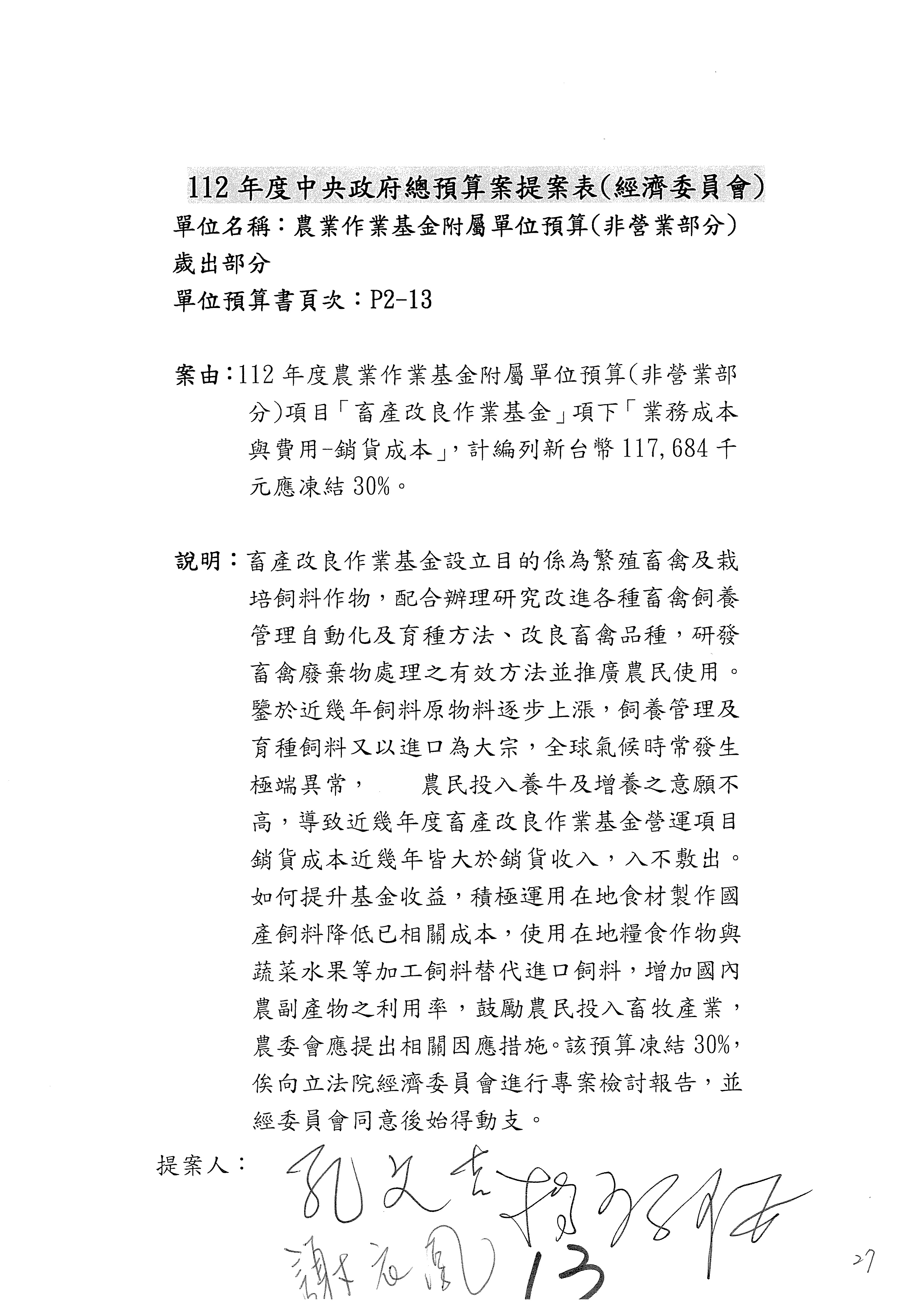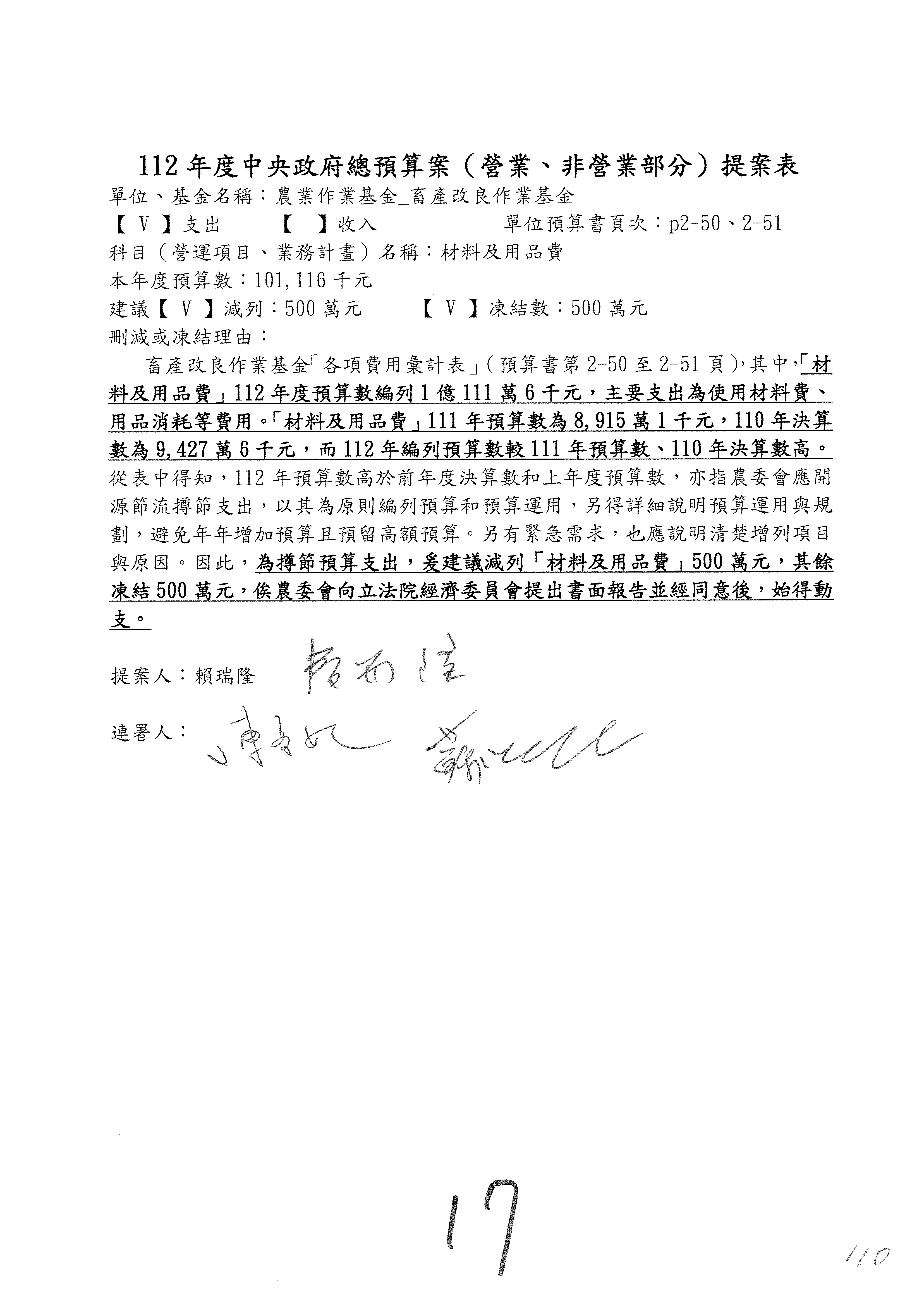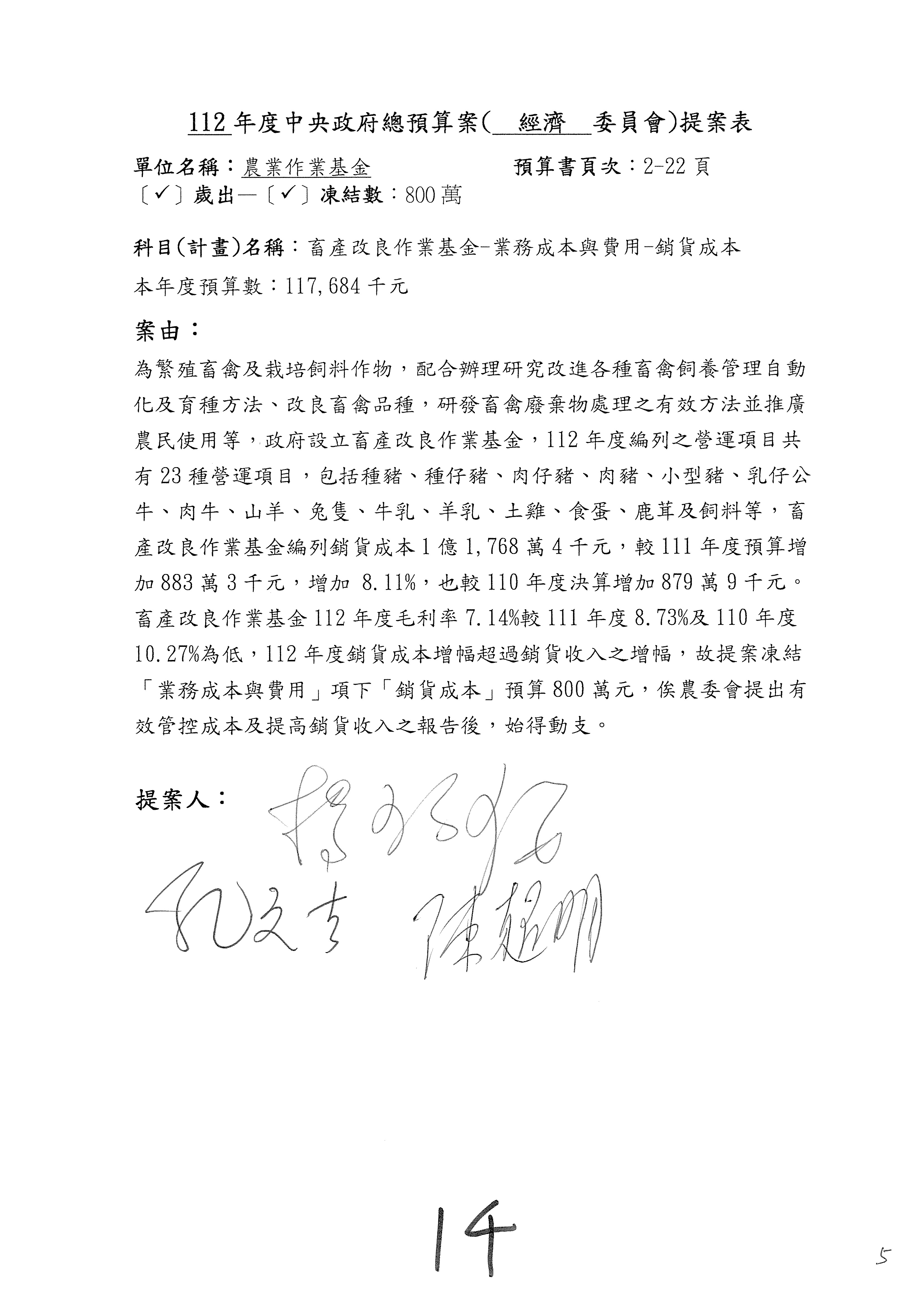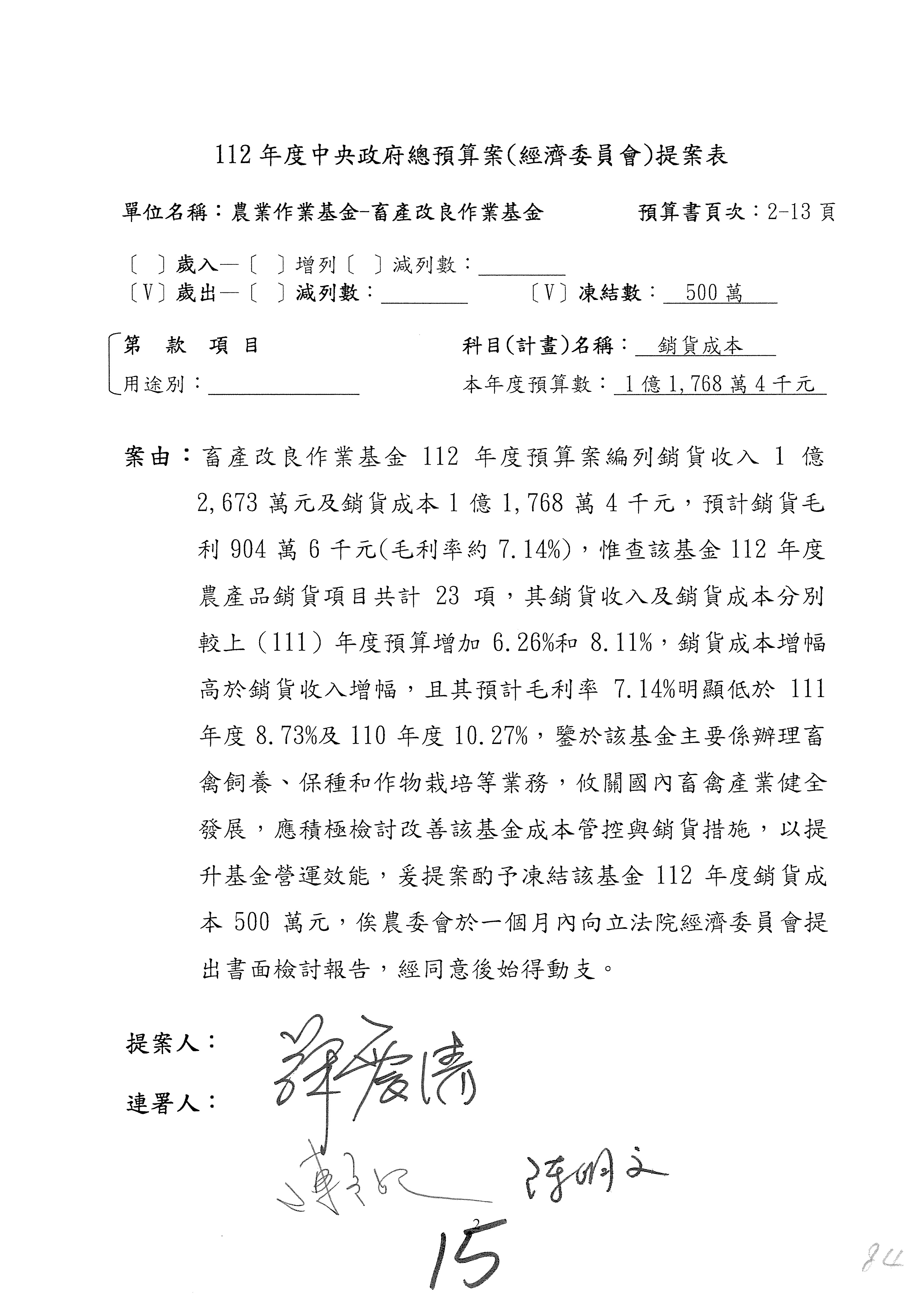 畜產改良作業基金凍結500萬元,提出書面報告後始得動支。