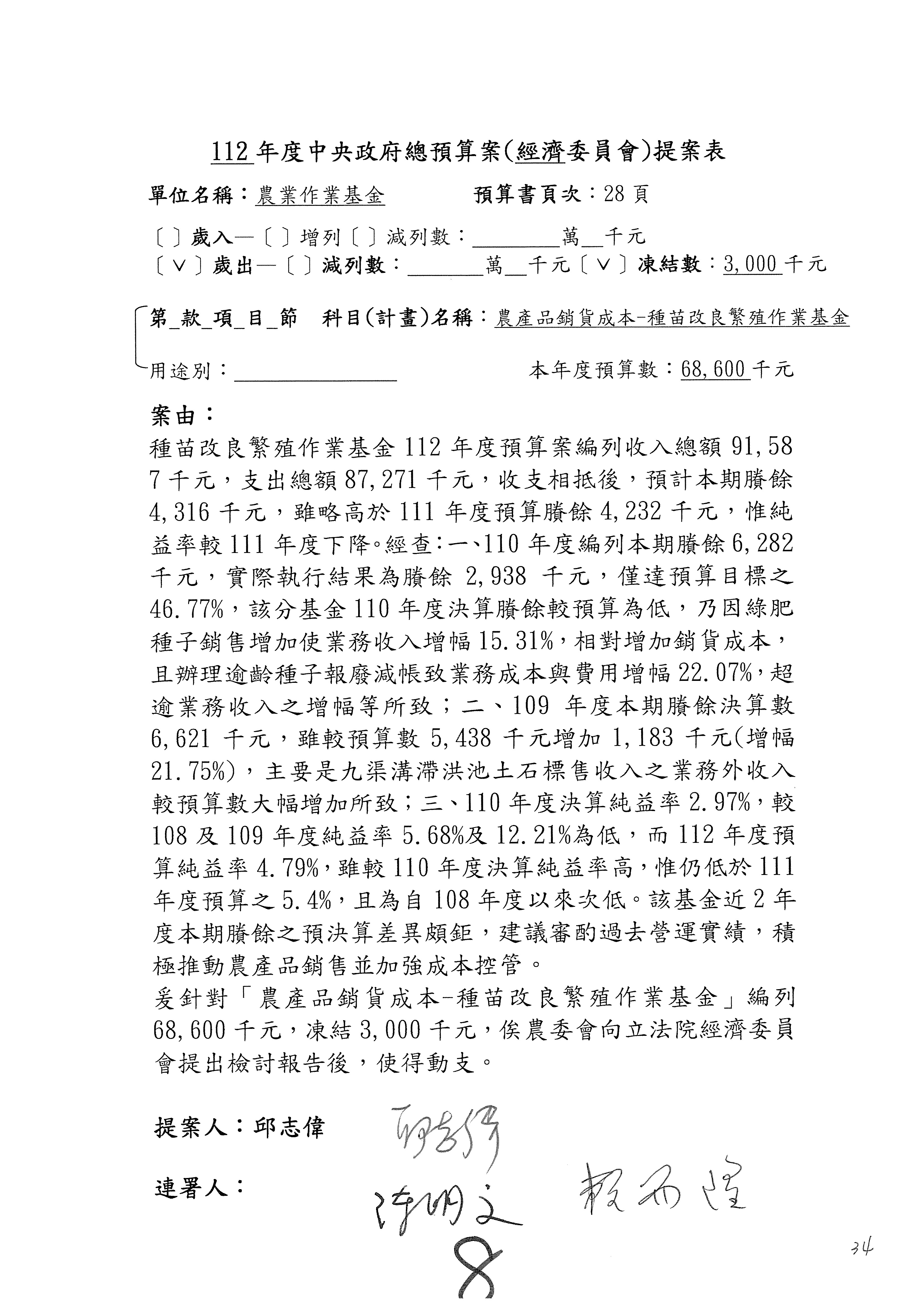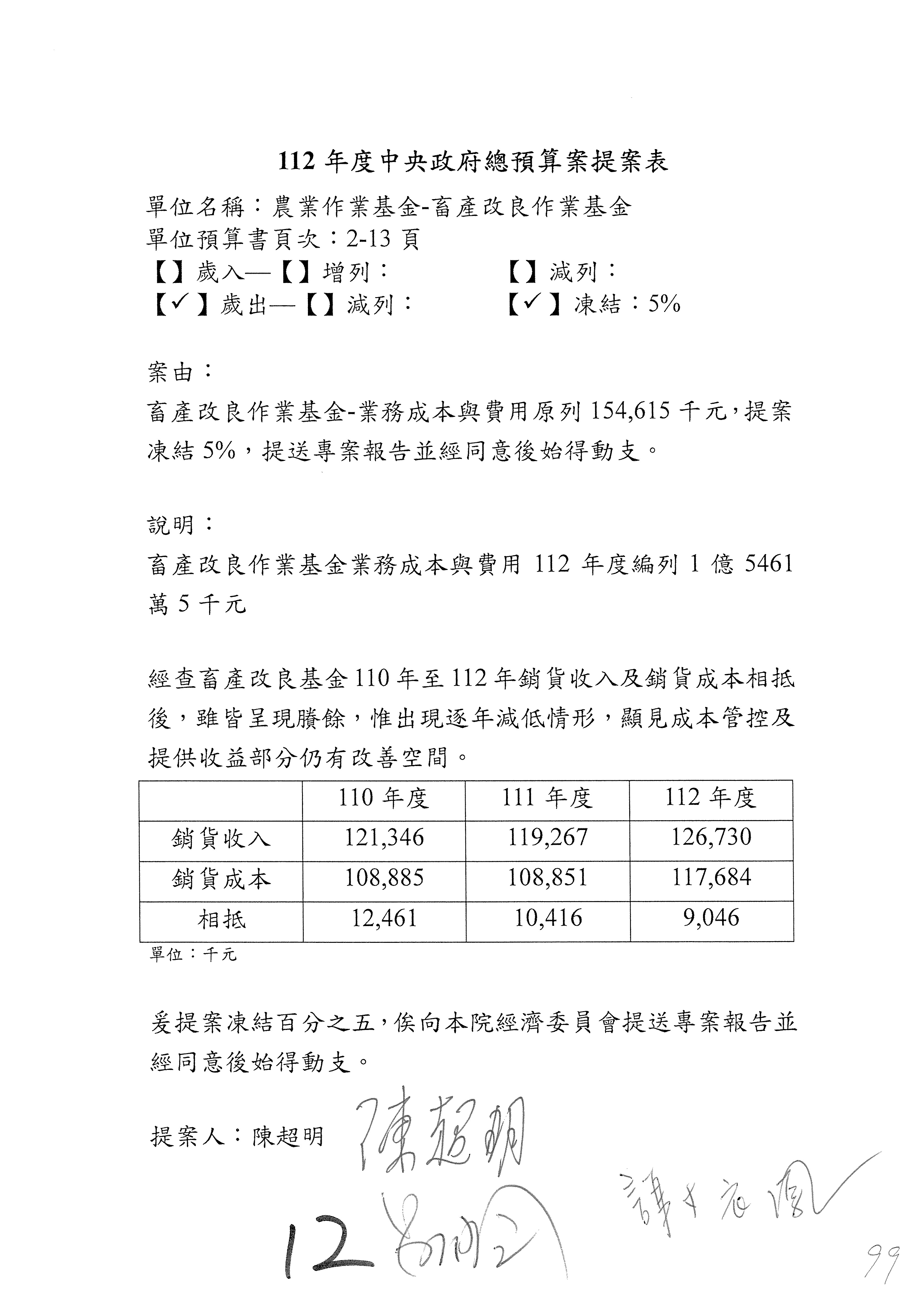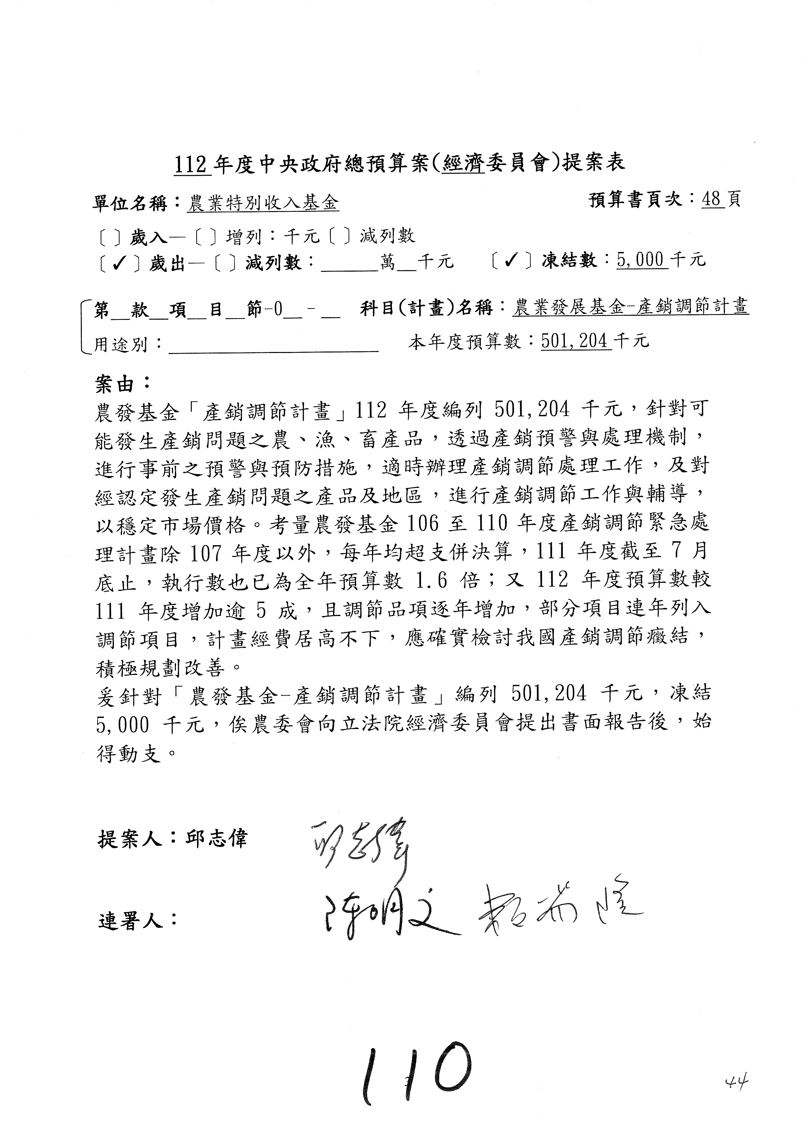 畜產改良作業基金凍結500萬元,提出書面報告後始得動支。