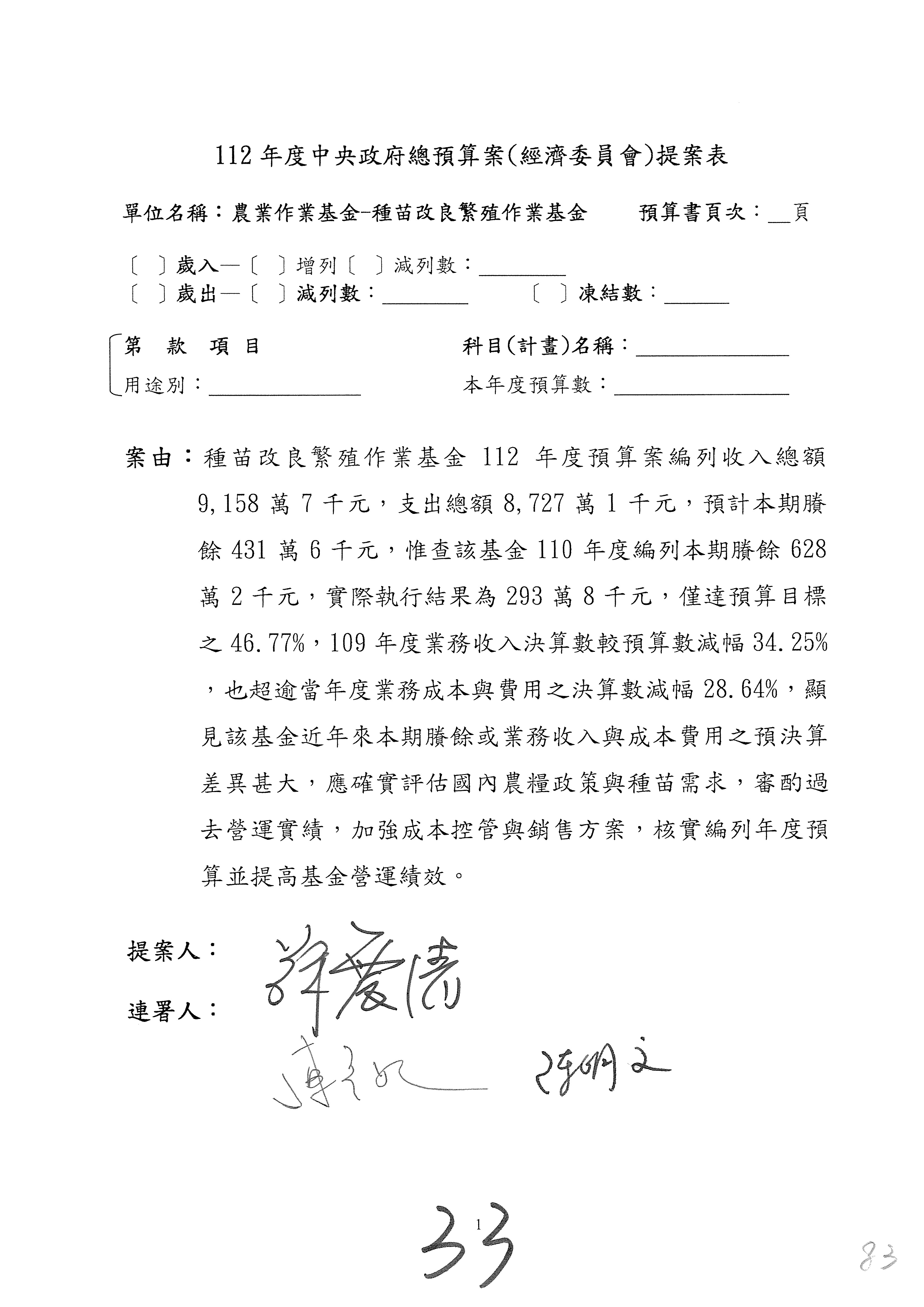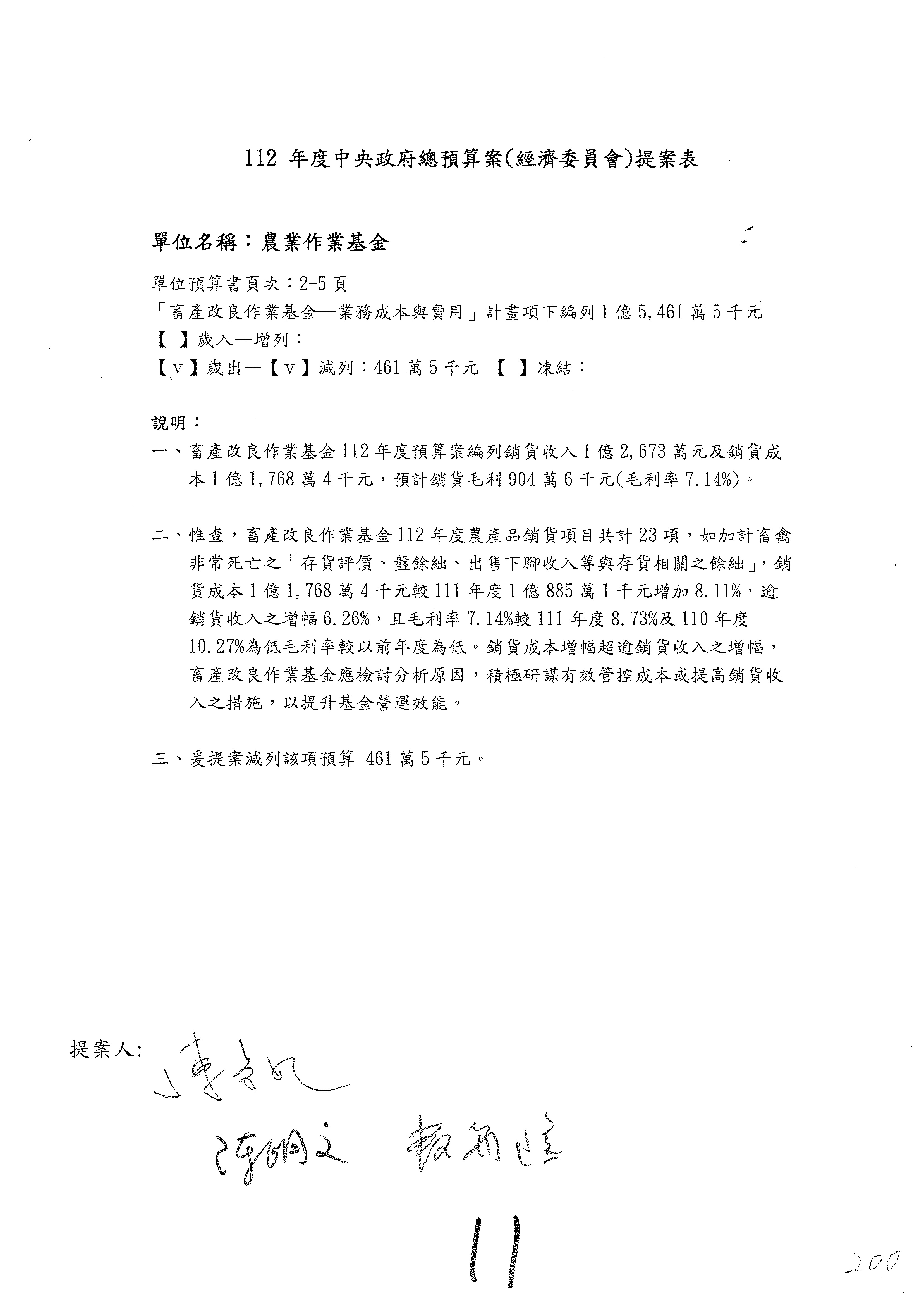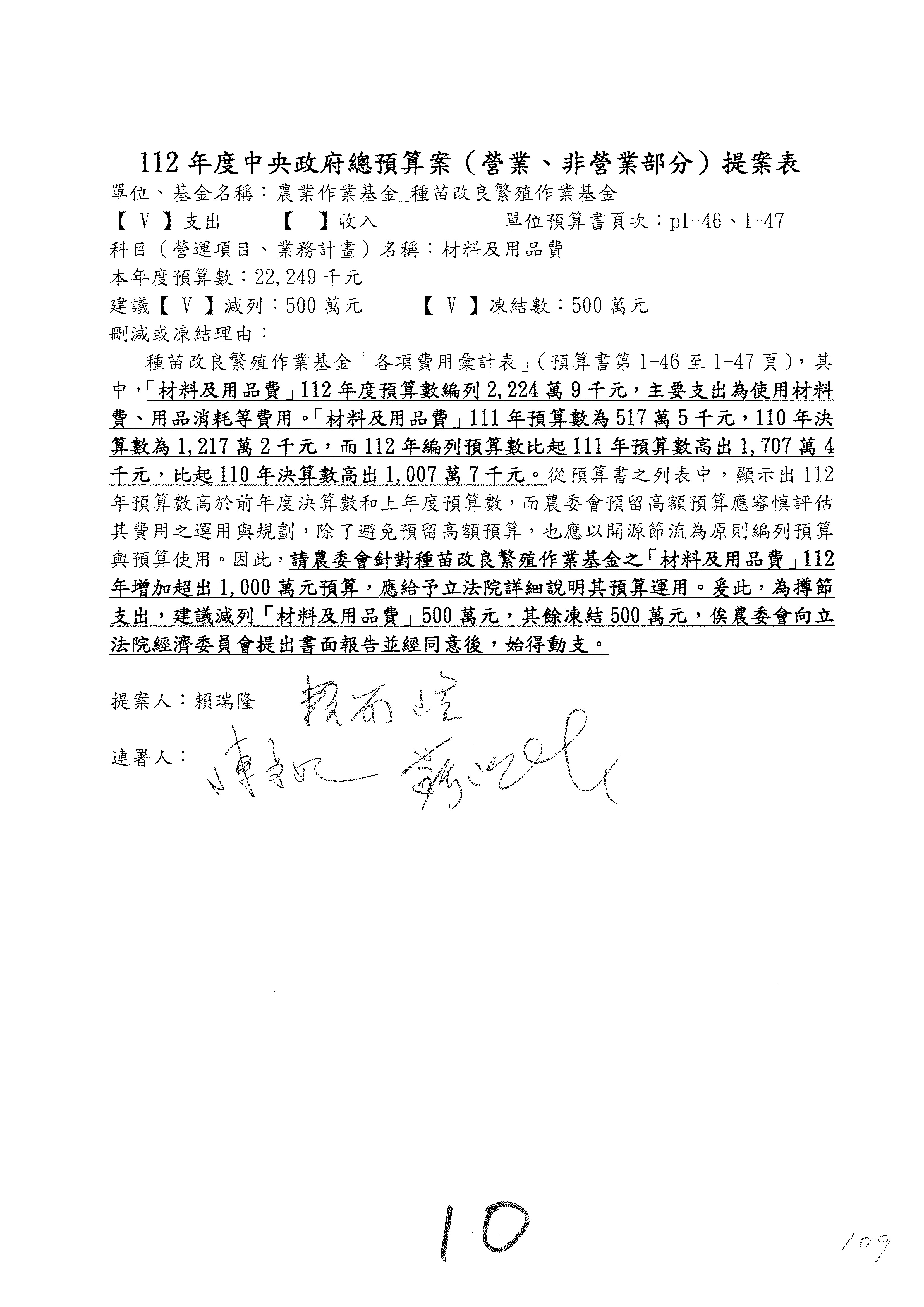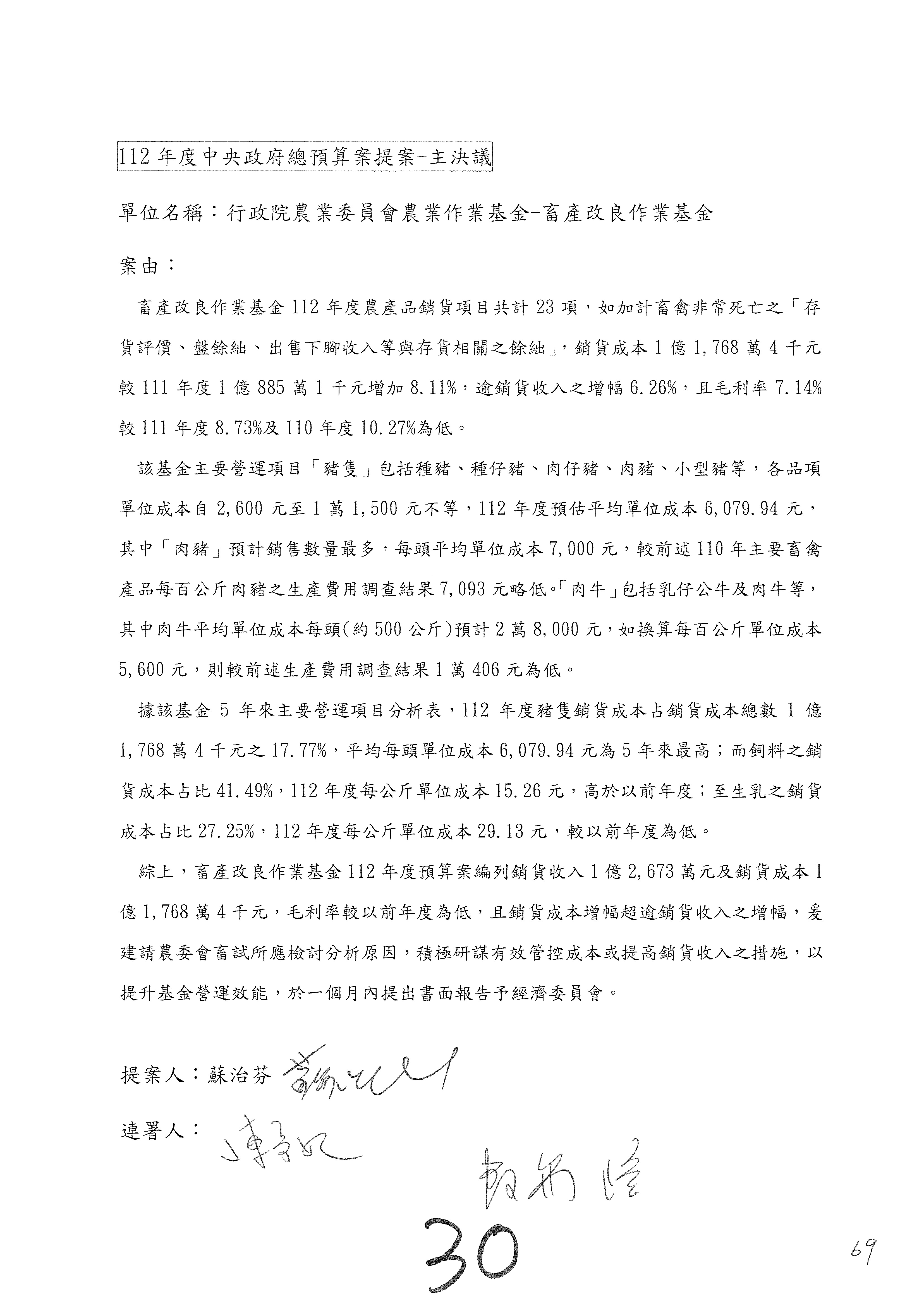 畜產改良作業基金凍結500萬元,提出書面報告後始得動支。