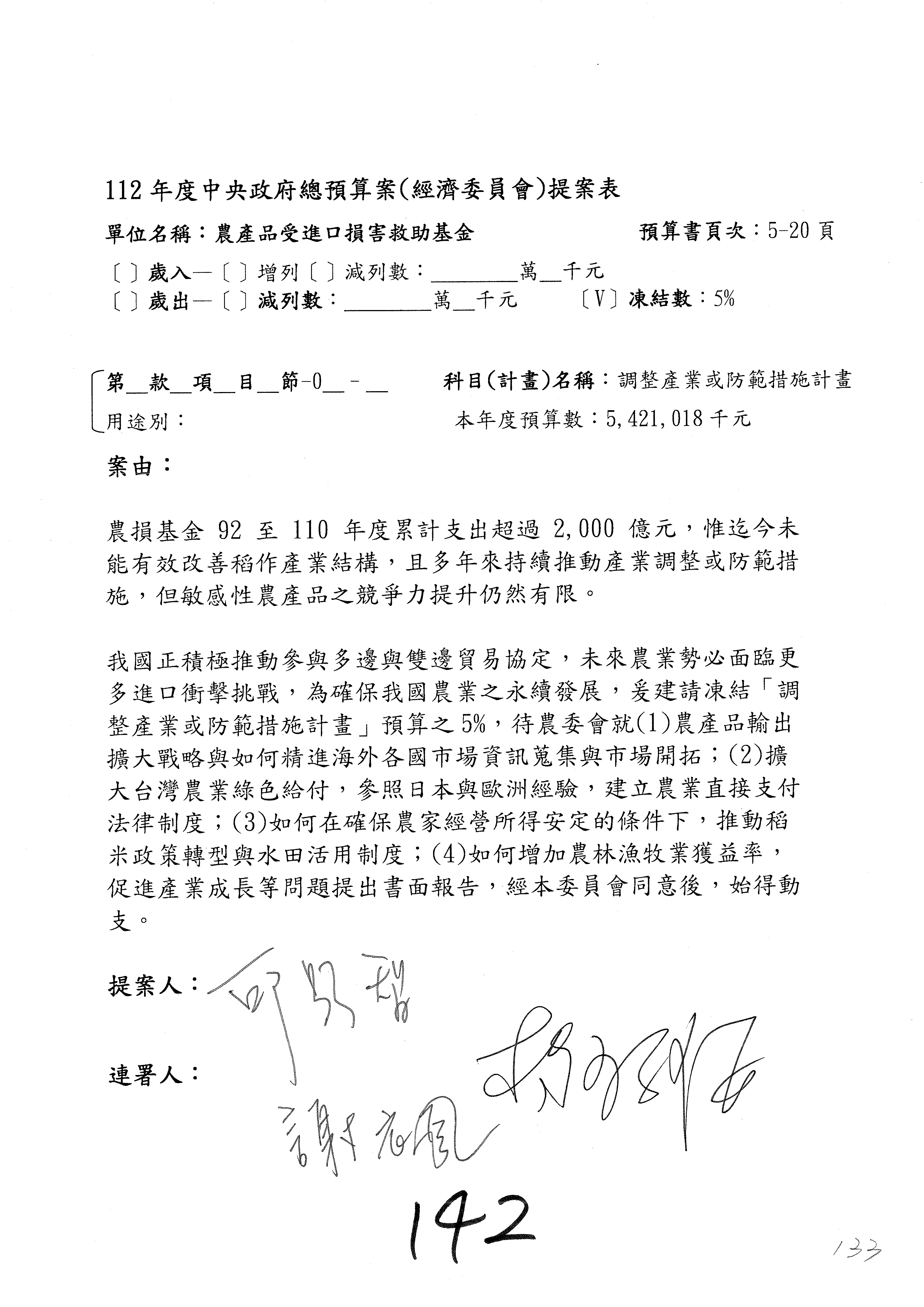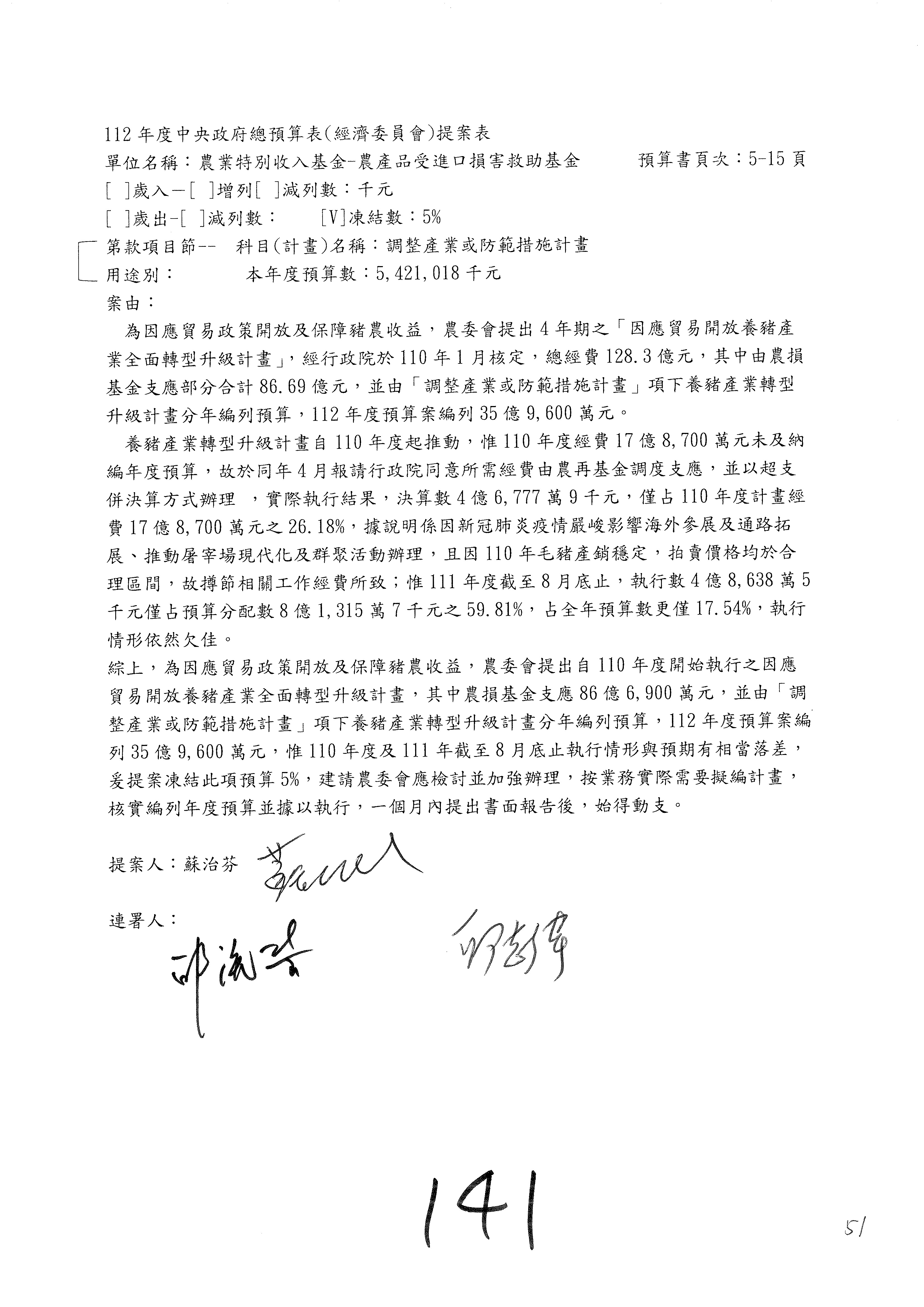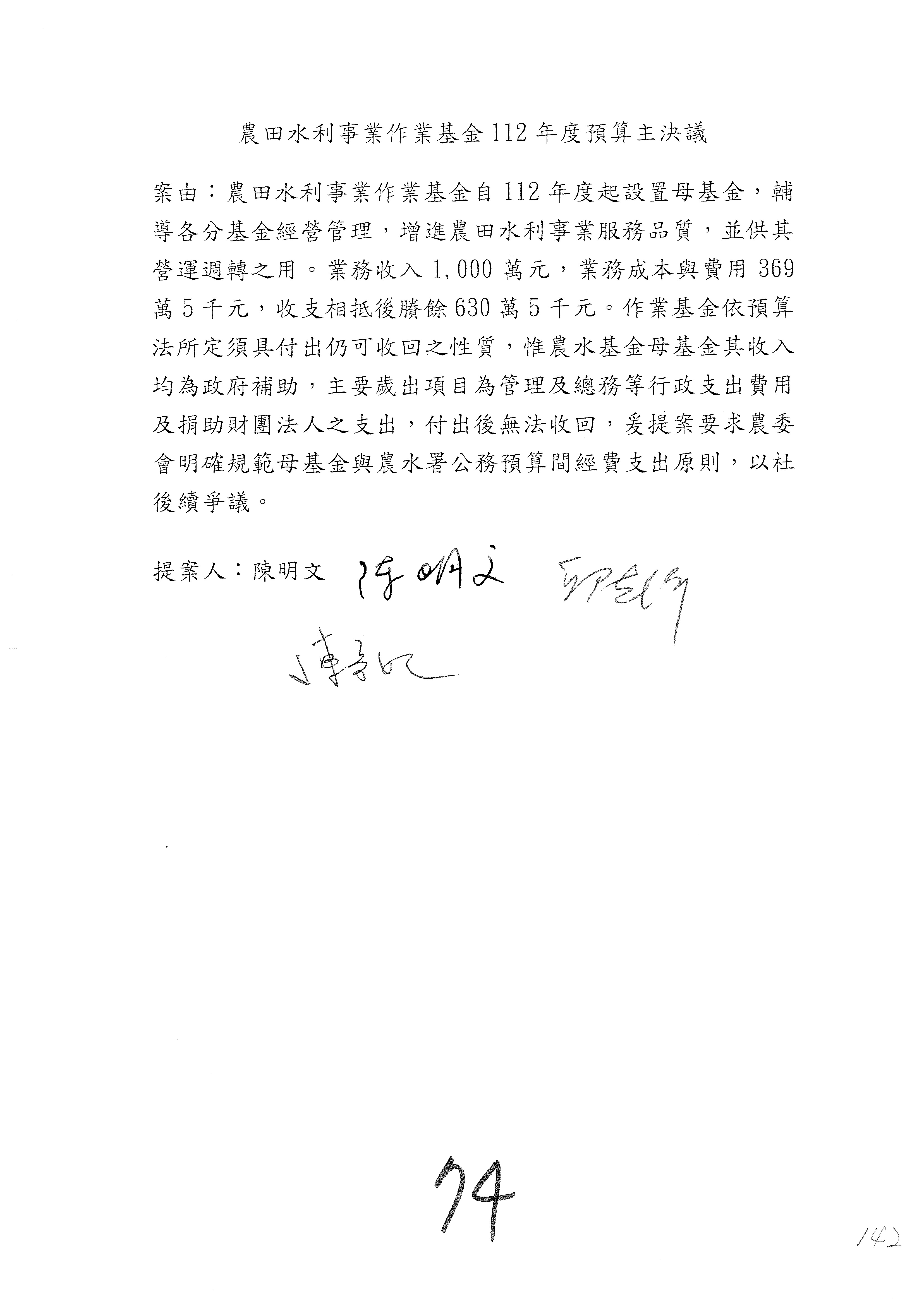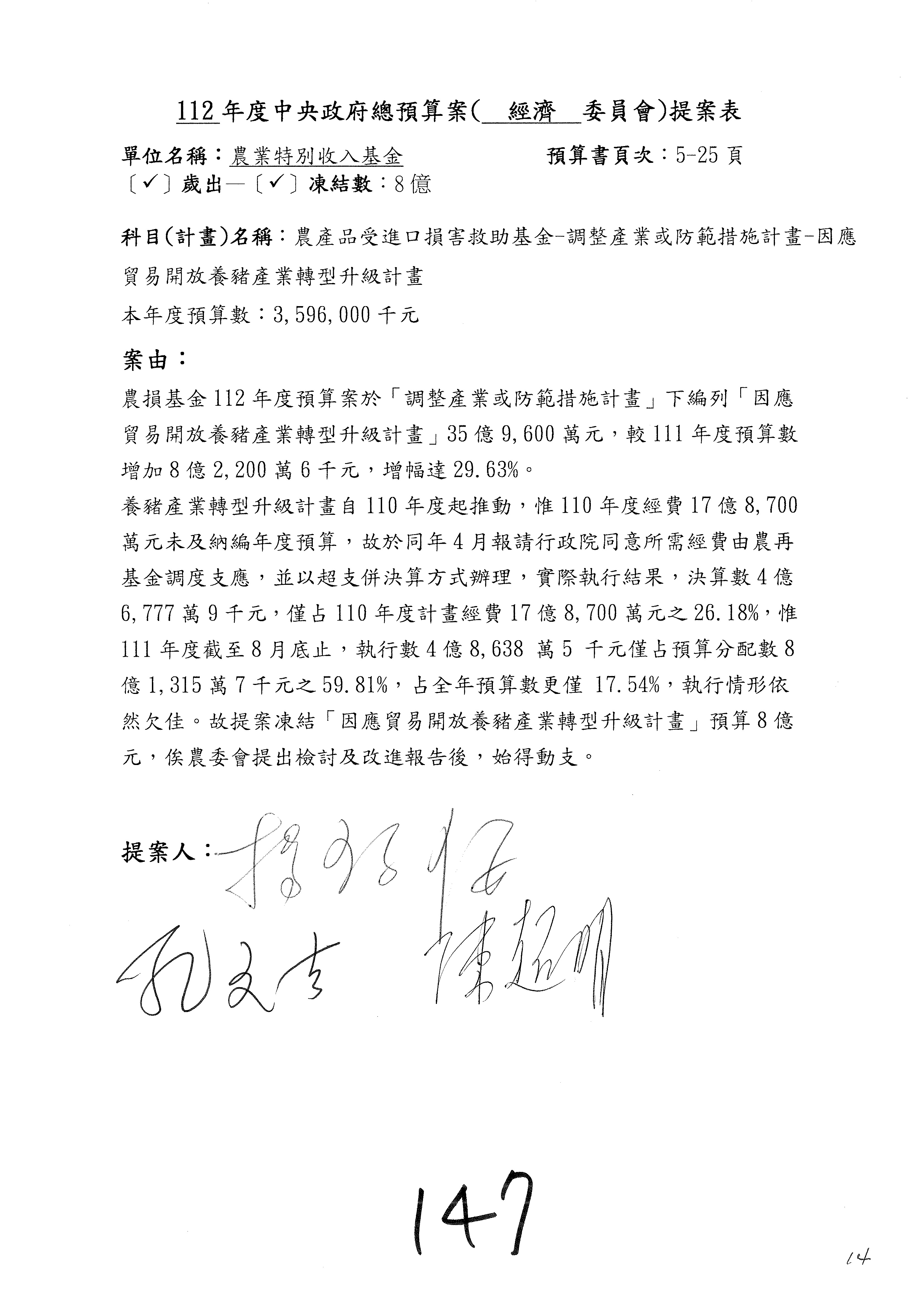 第140案至第152案預算照列,其中第142案、第147案改主決議。