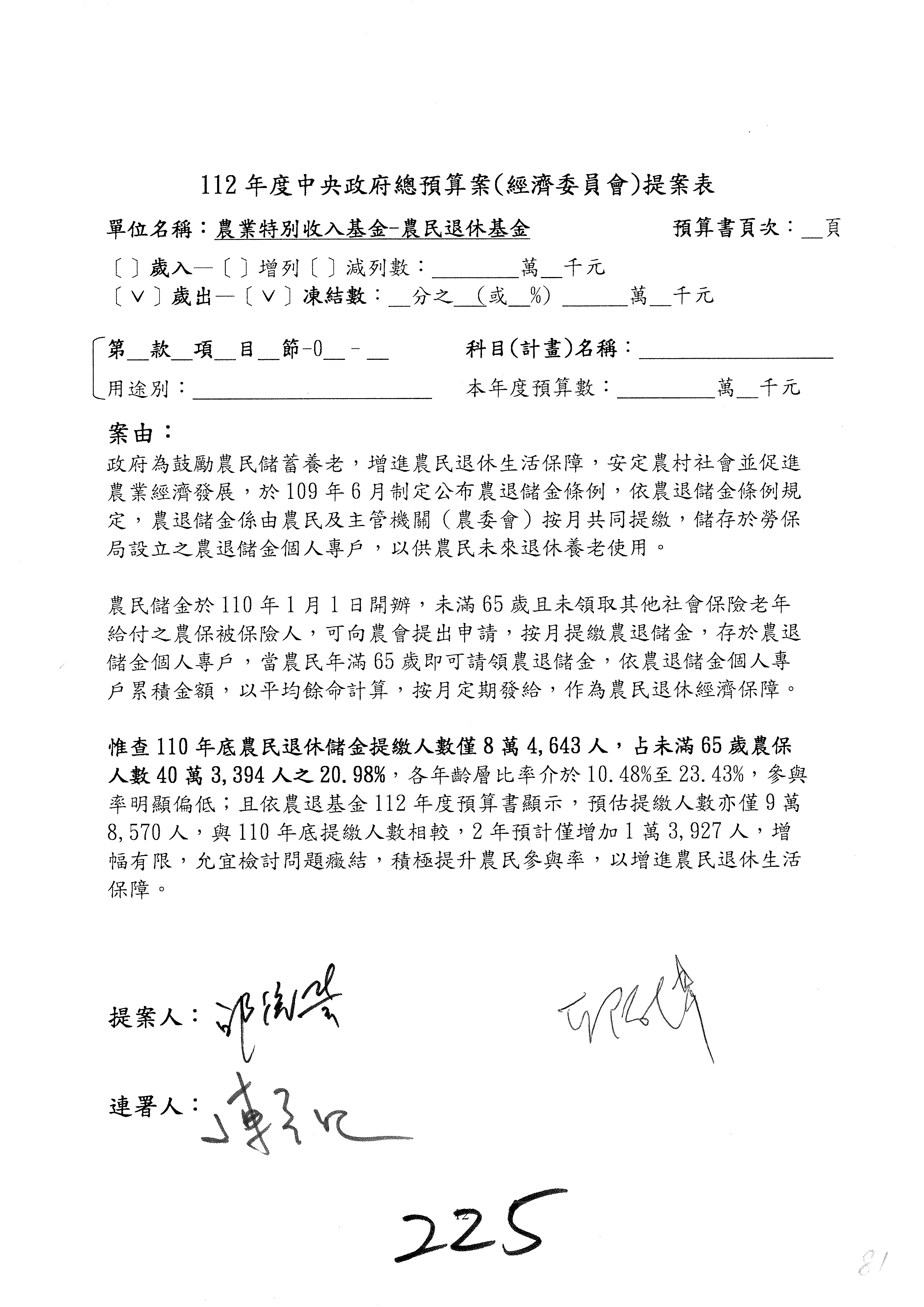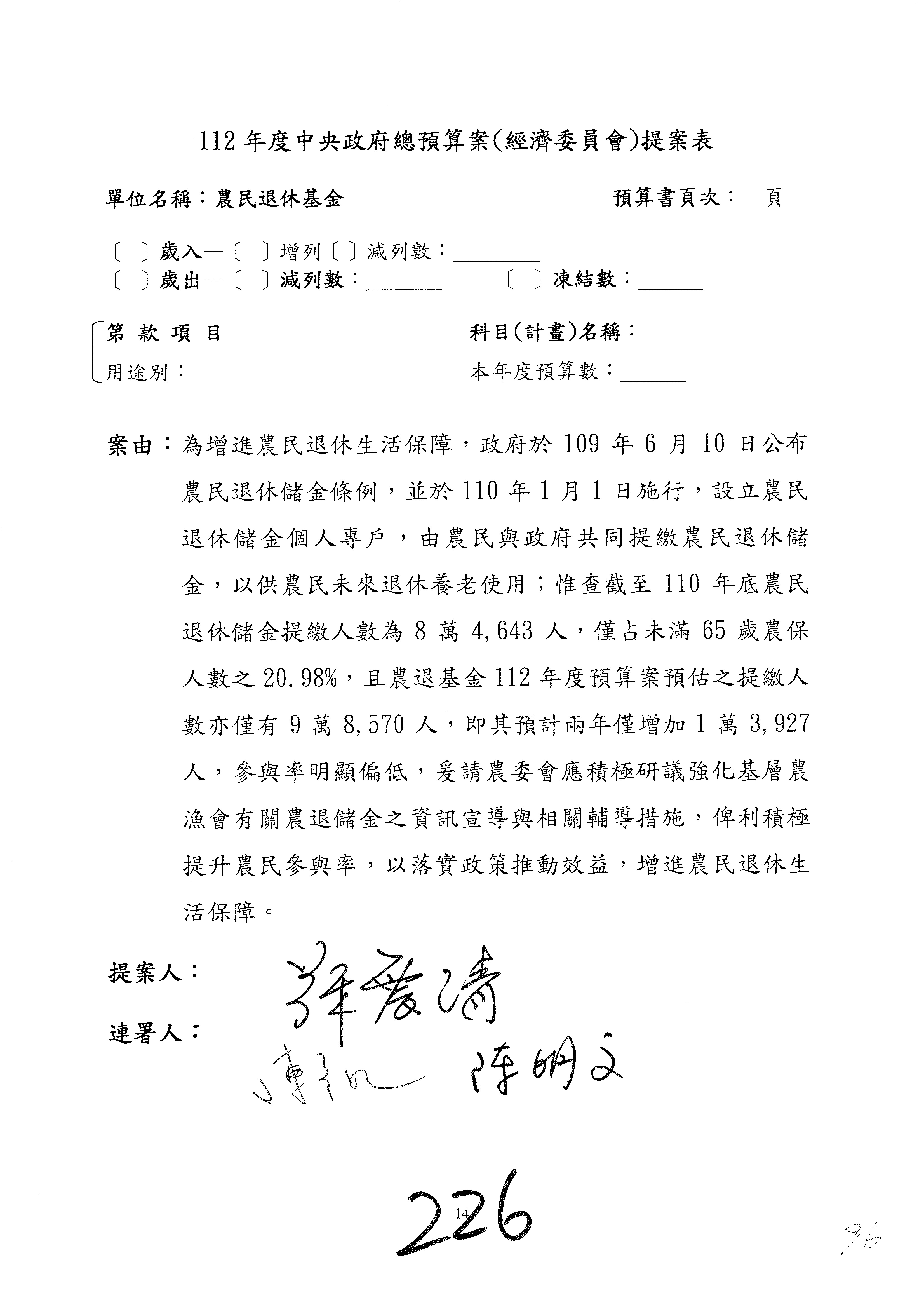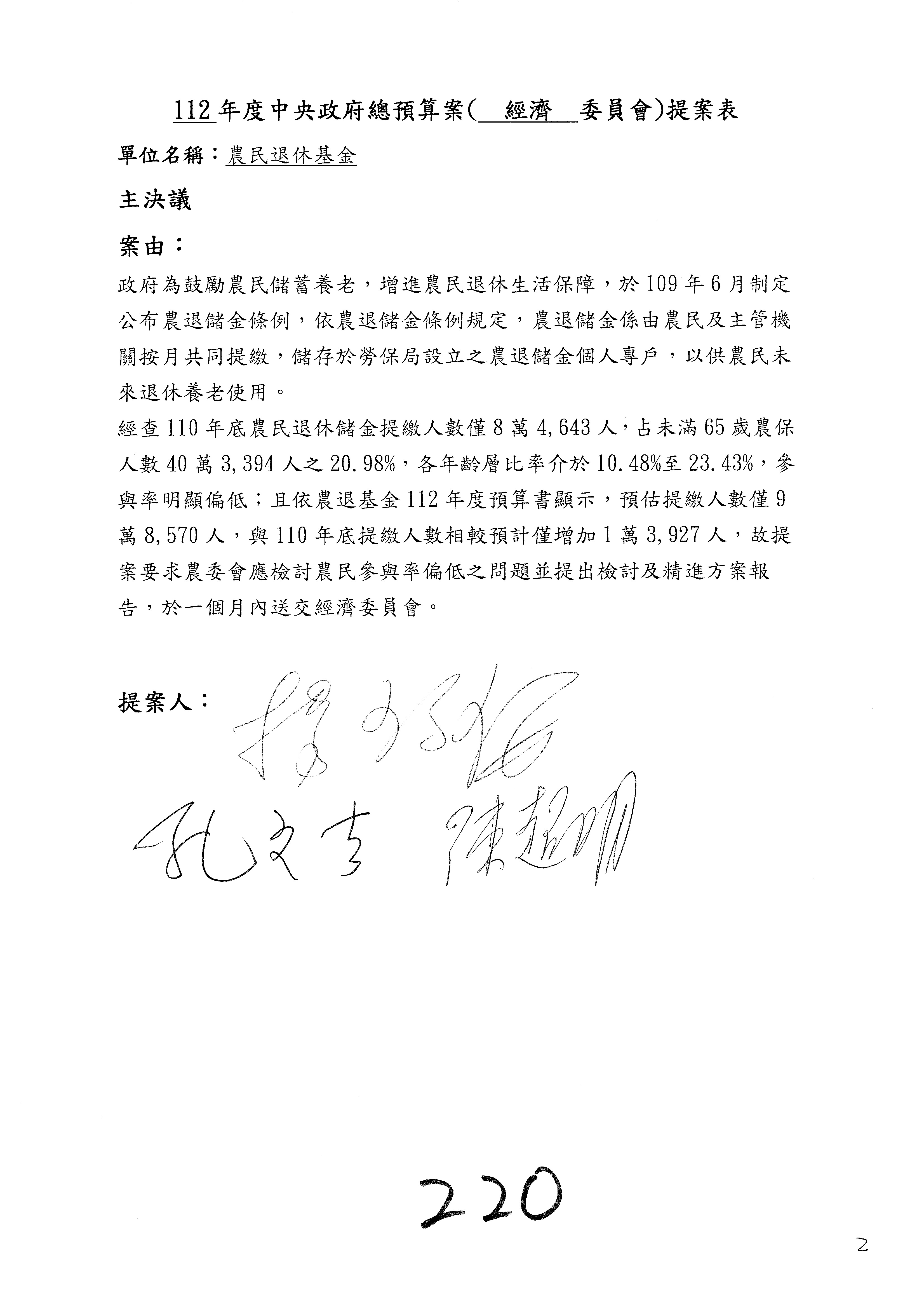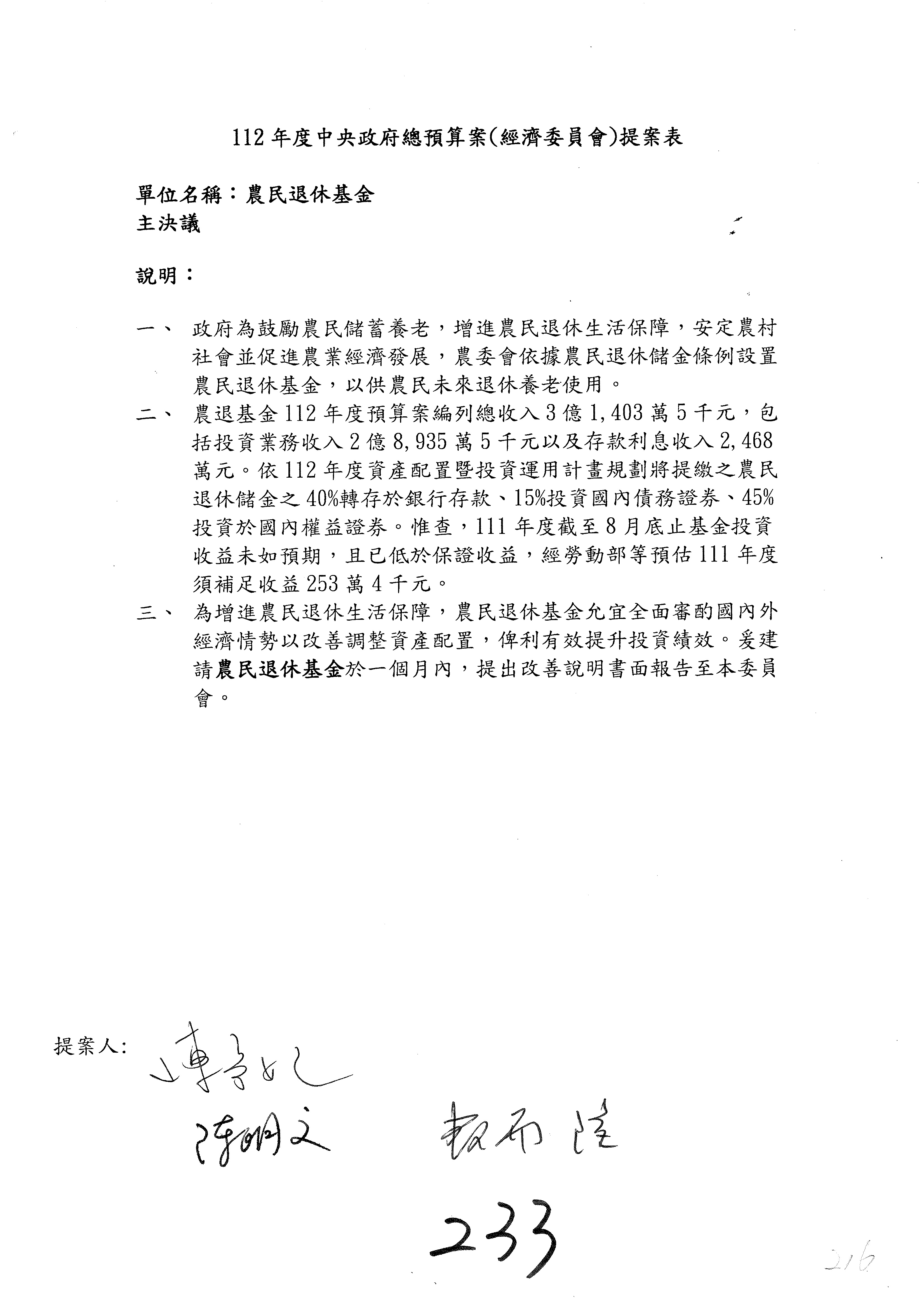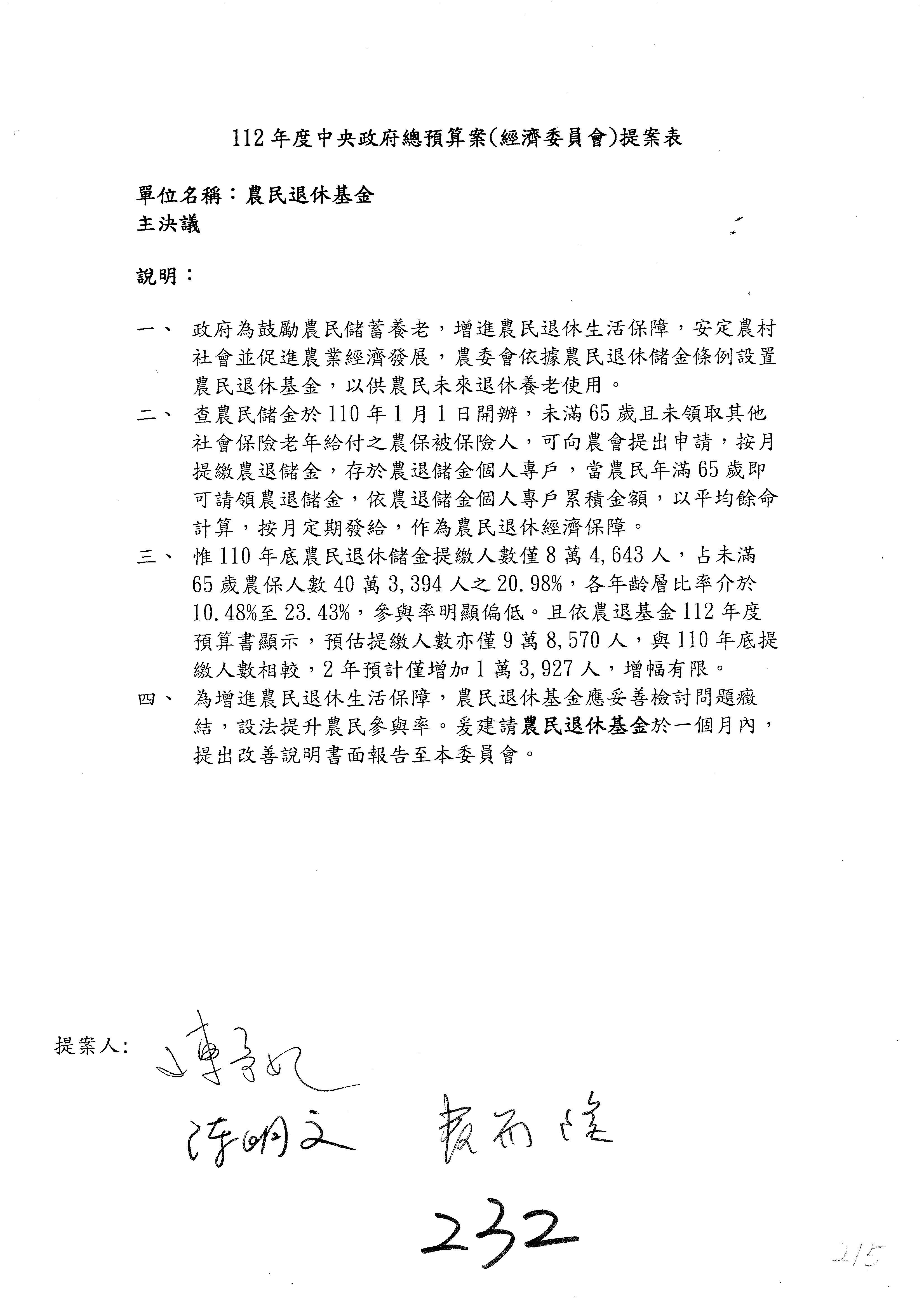 陳處長俊言:這個案子我們建議修改為:「請於三個月內針對如何提高農民參加農民退休儲金之比例,提出具體可行之書面報告及訂定目標於經濟委員會,以利國會監督。」