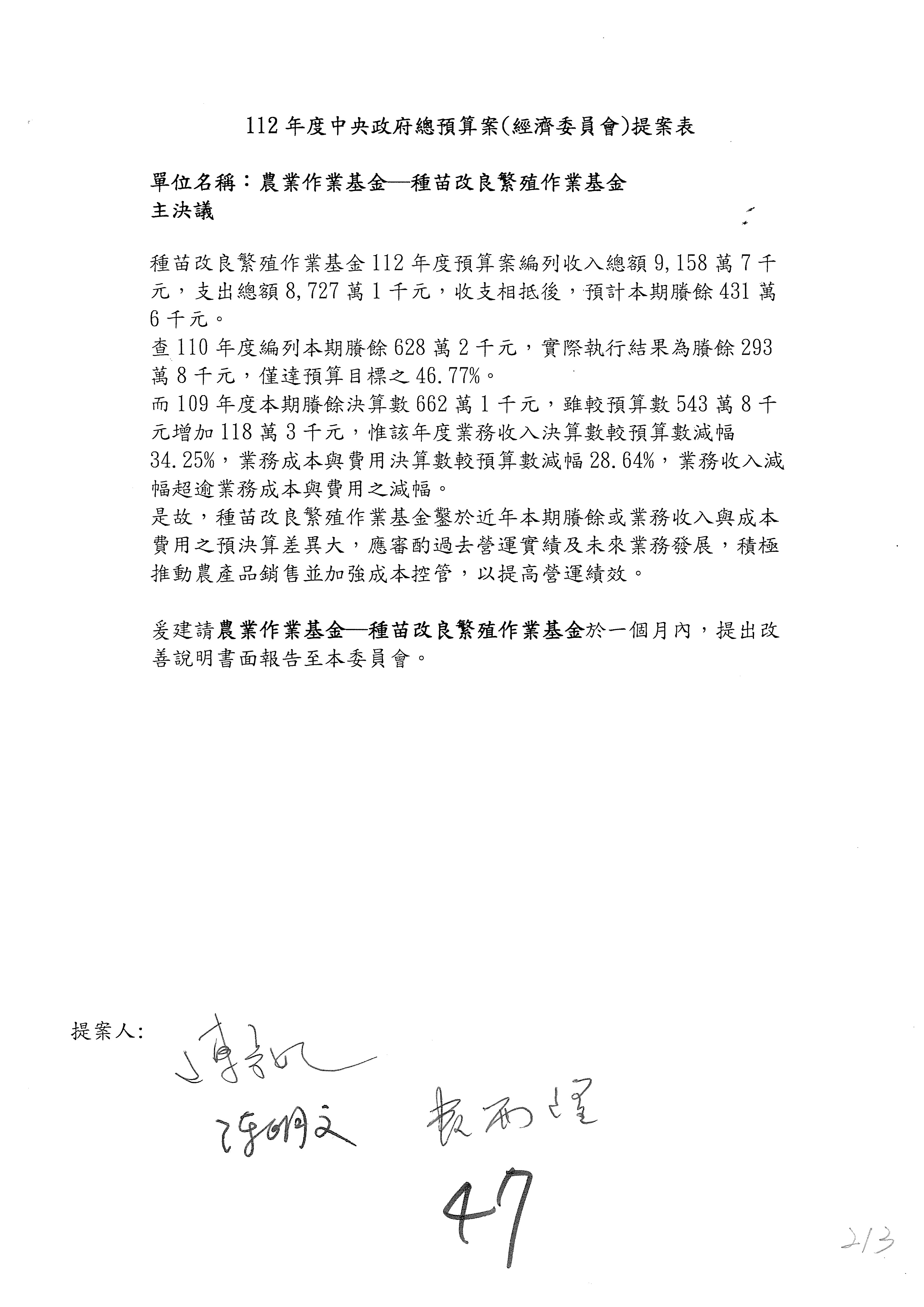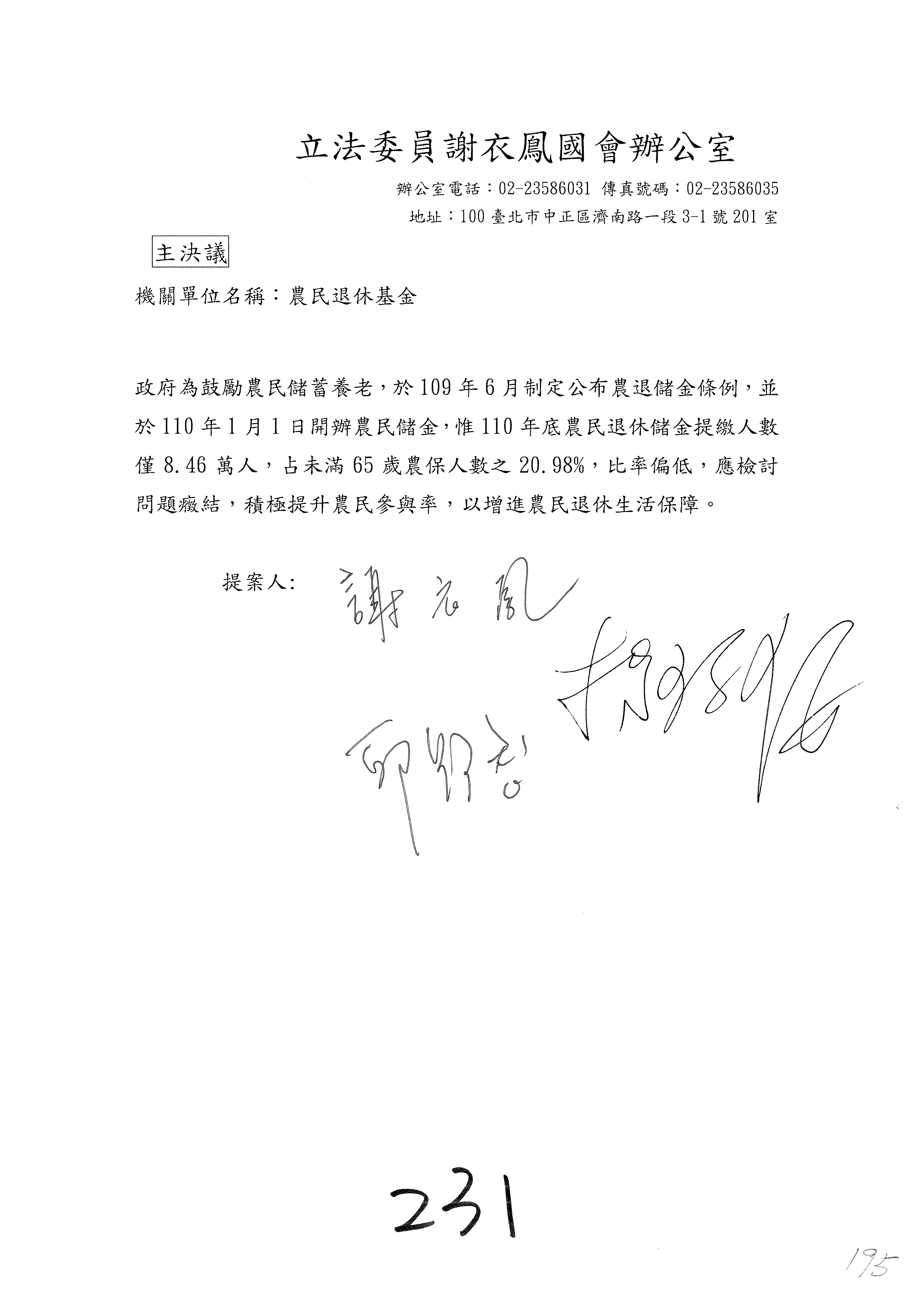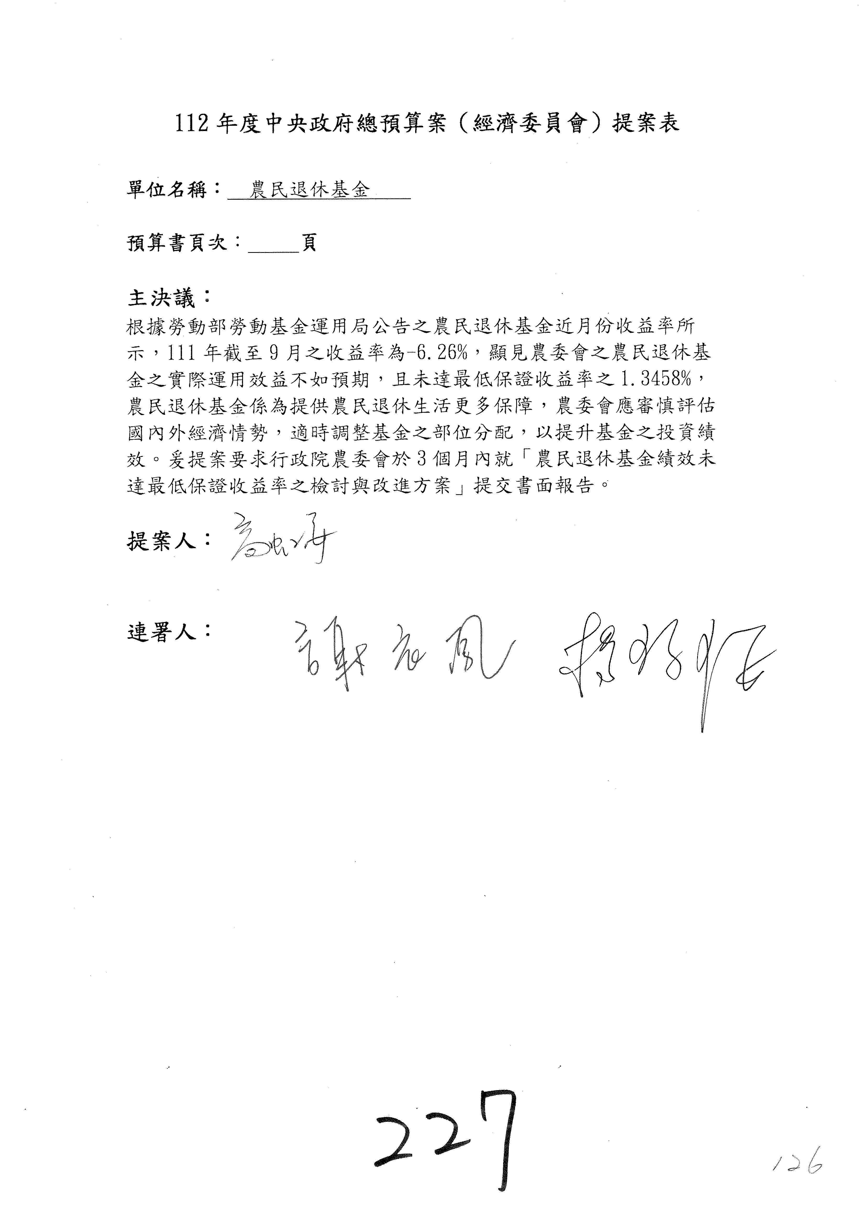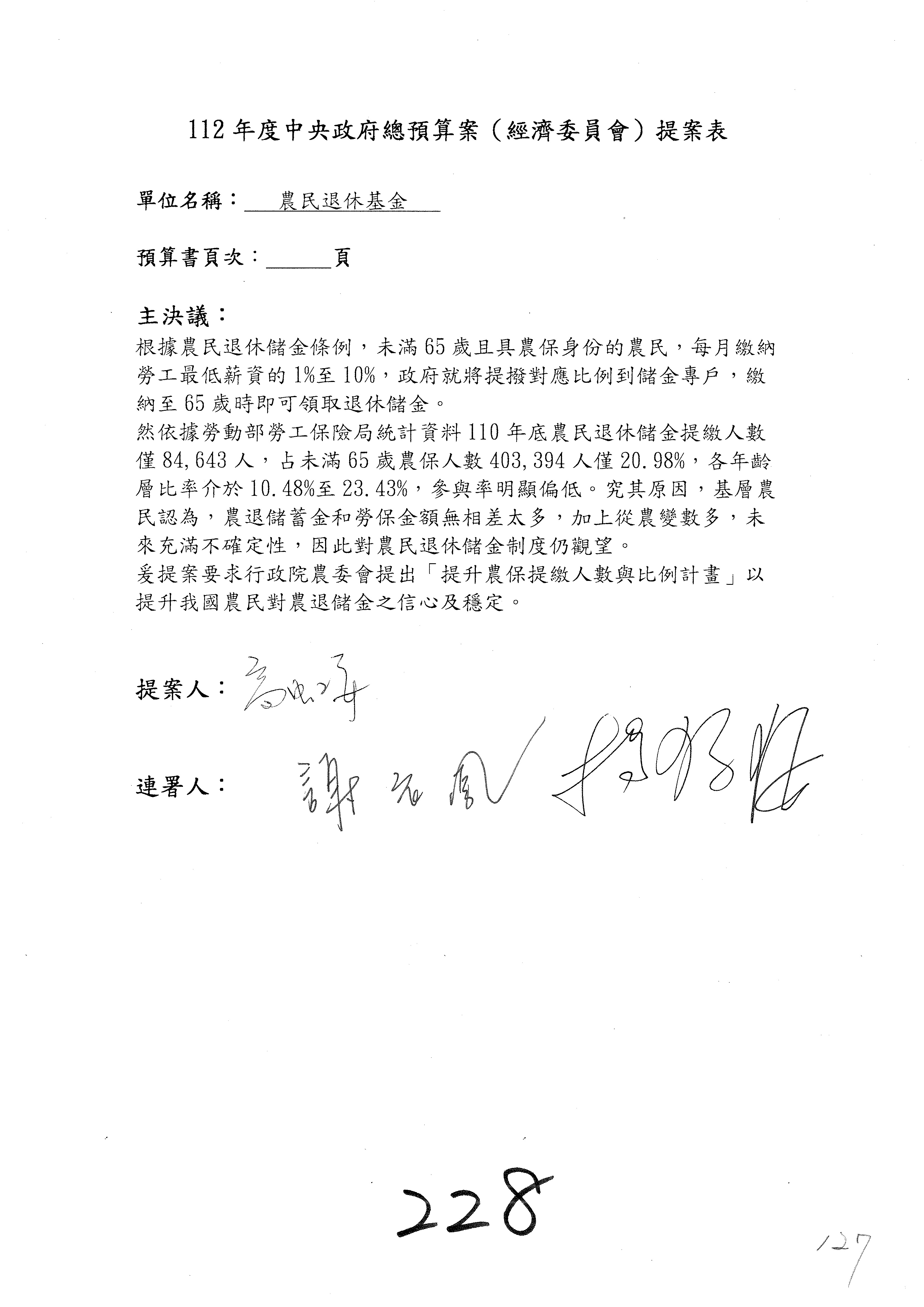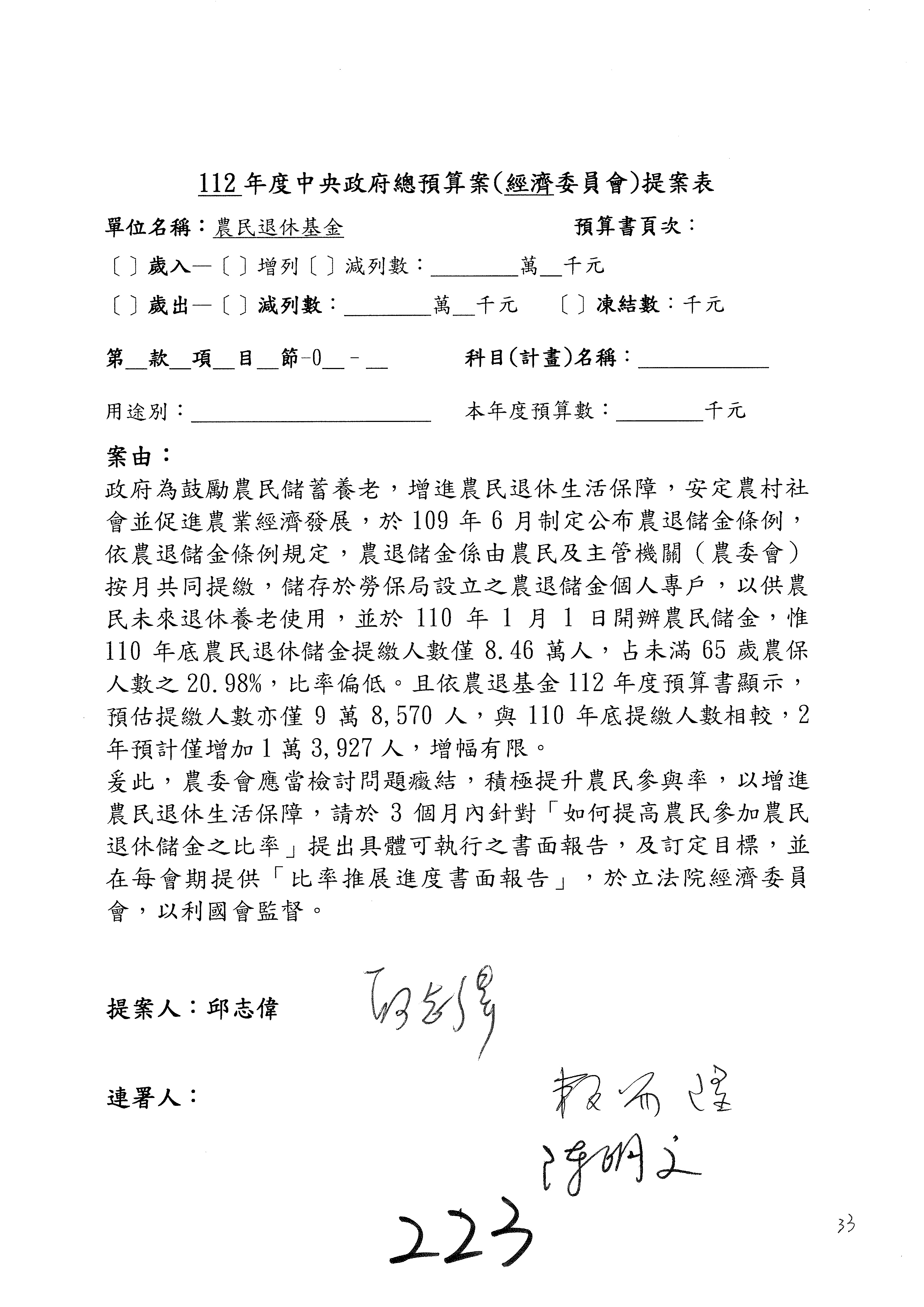 陳處長俊言:這個案子我們建議修改為:「請於三個月內針對如何提高農民參加農民退休儲金之比例,提出具體可行之書面報告及訂定目標於經濟委員會,以利國會監督。」