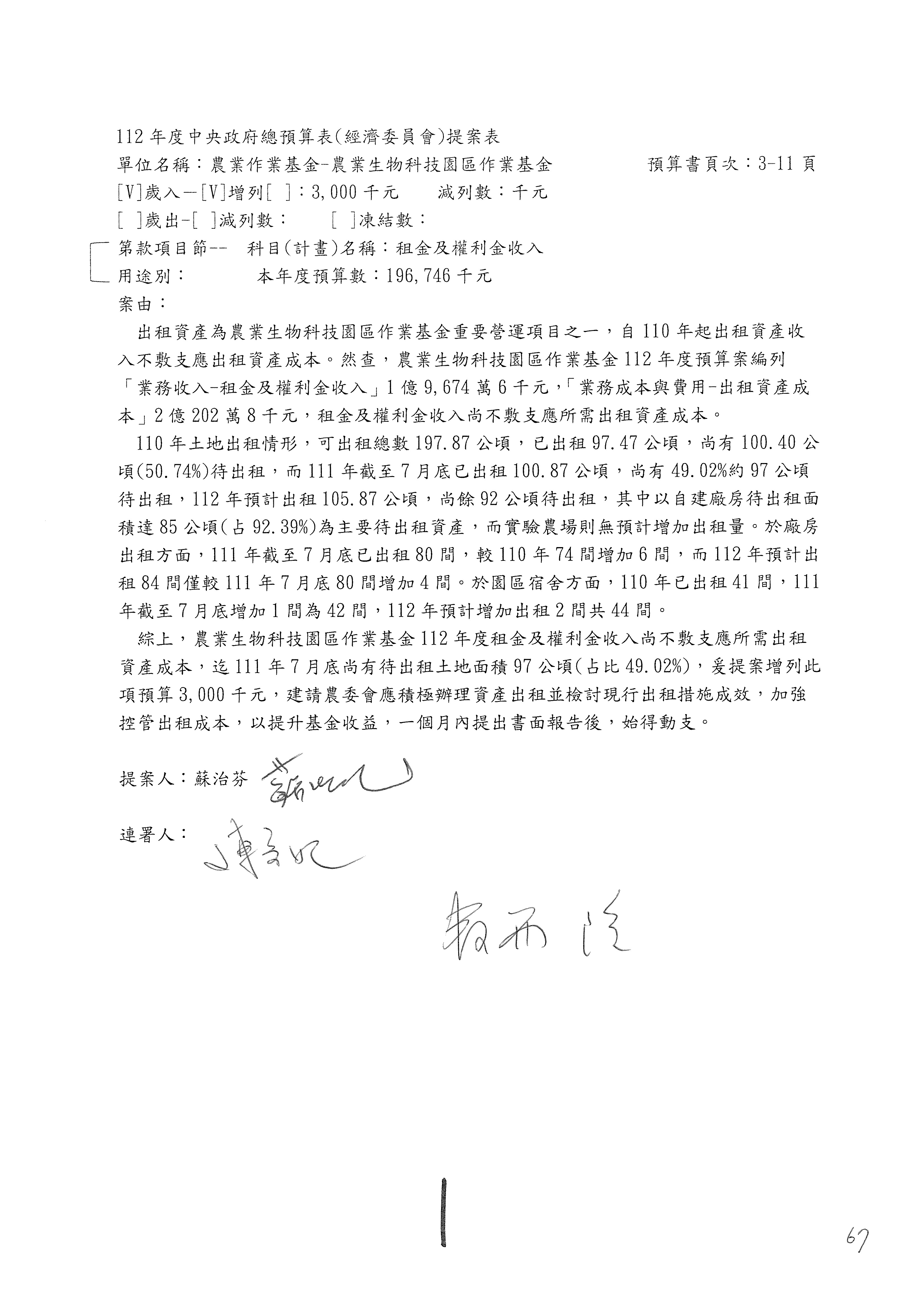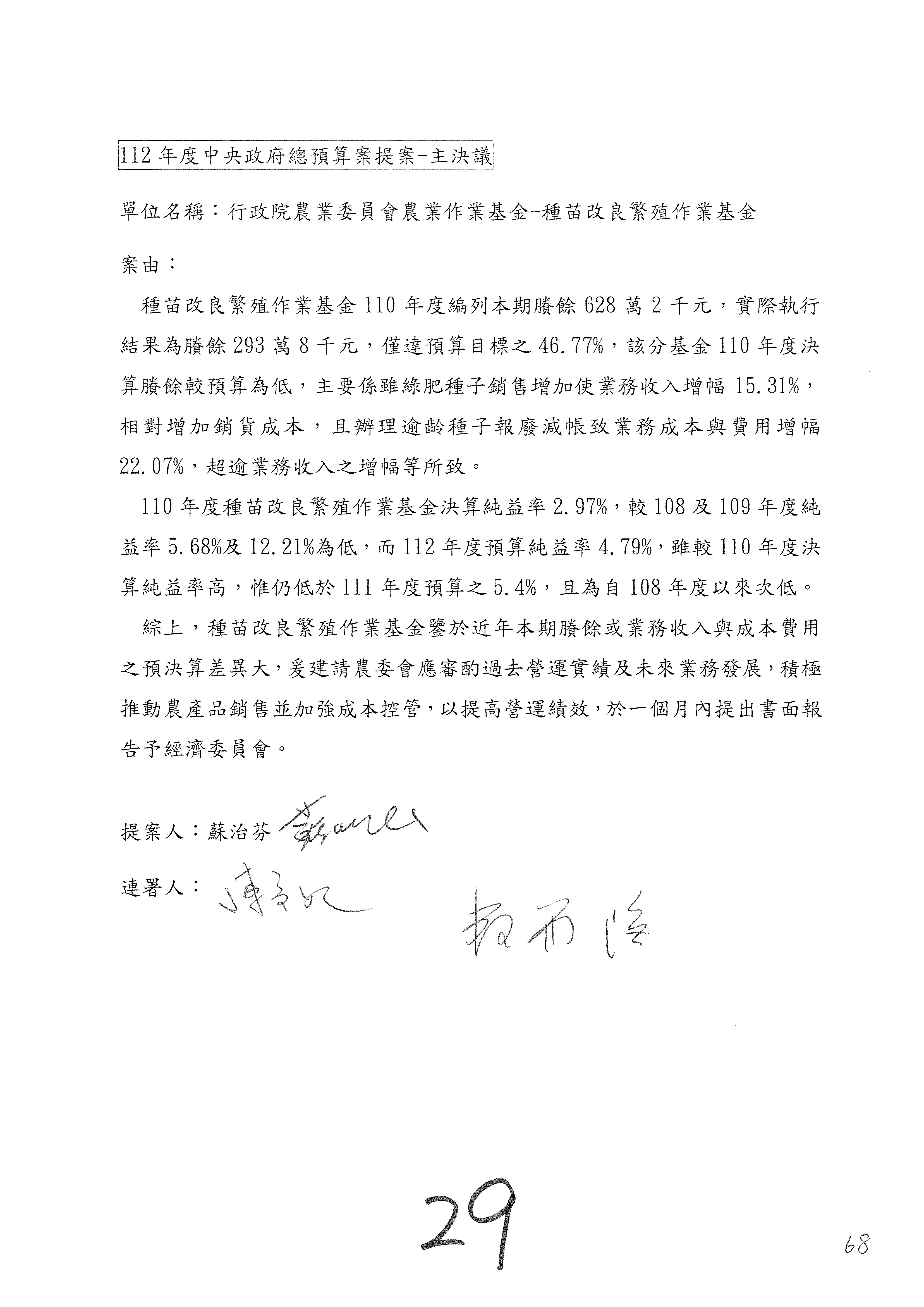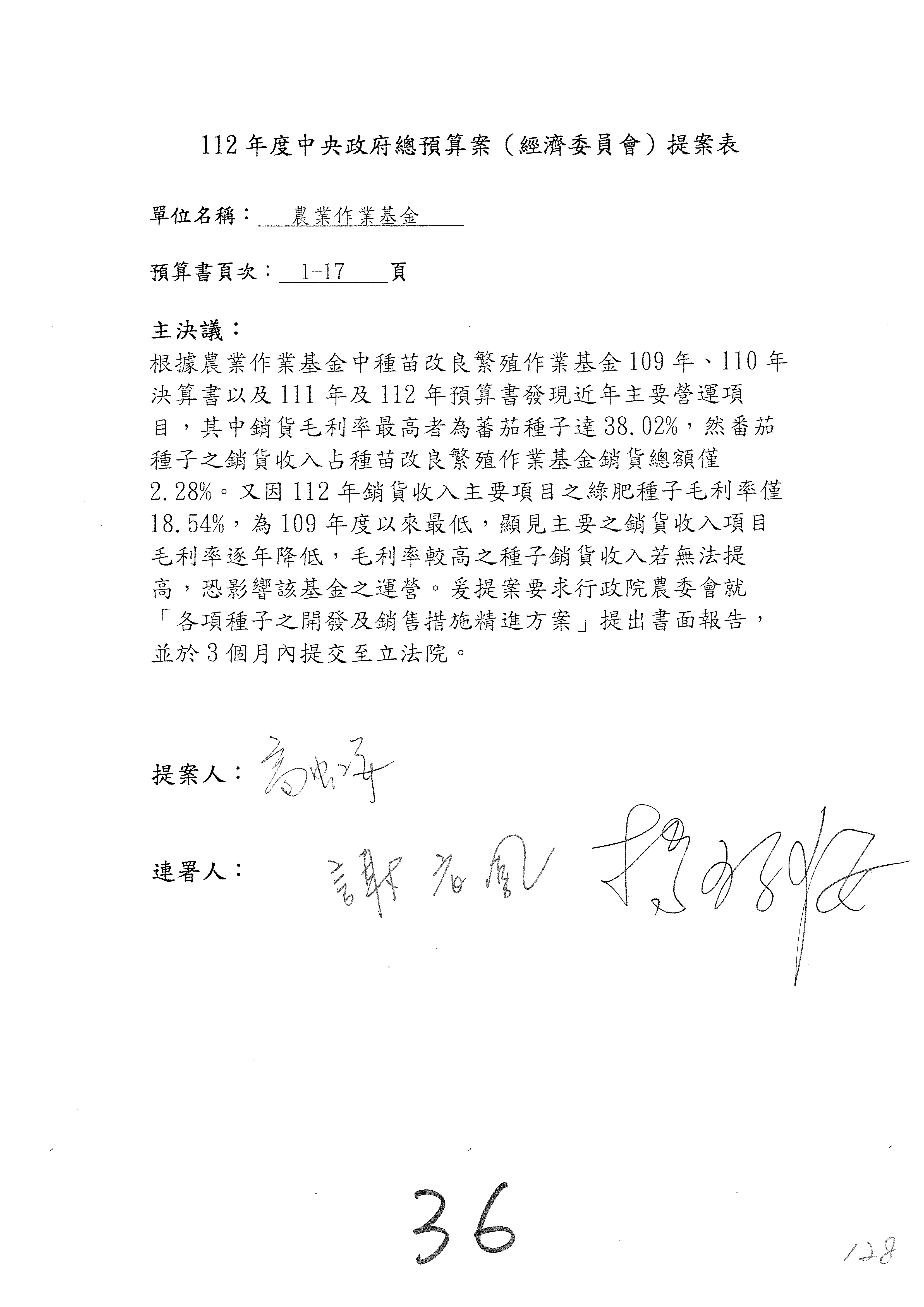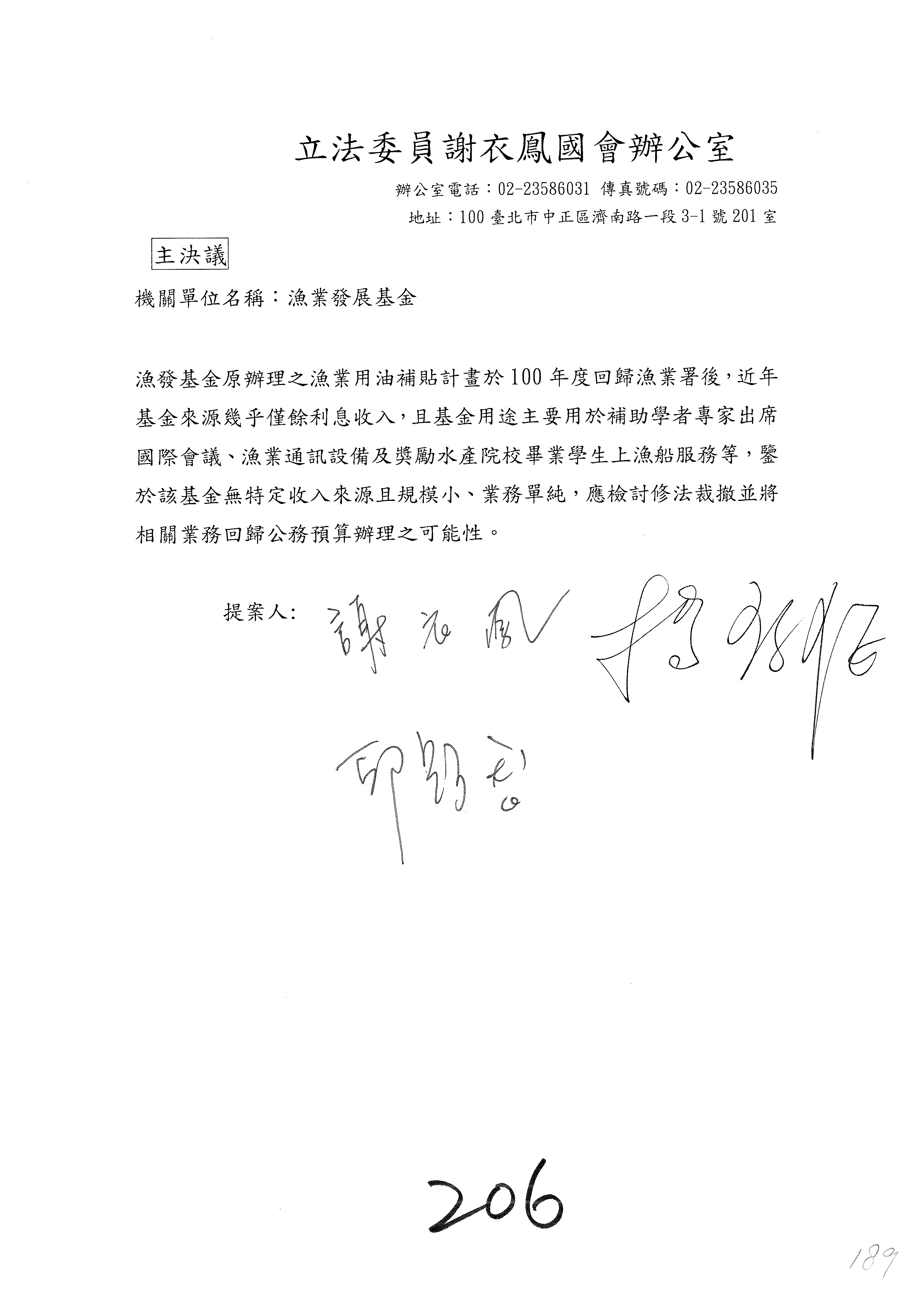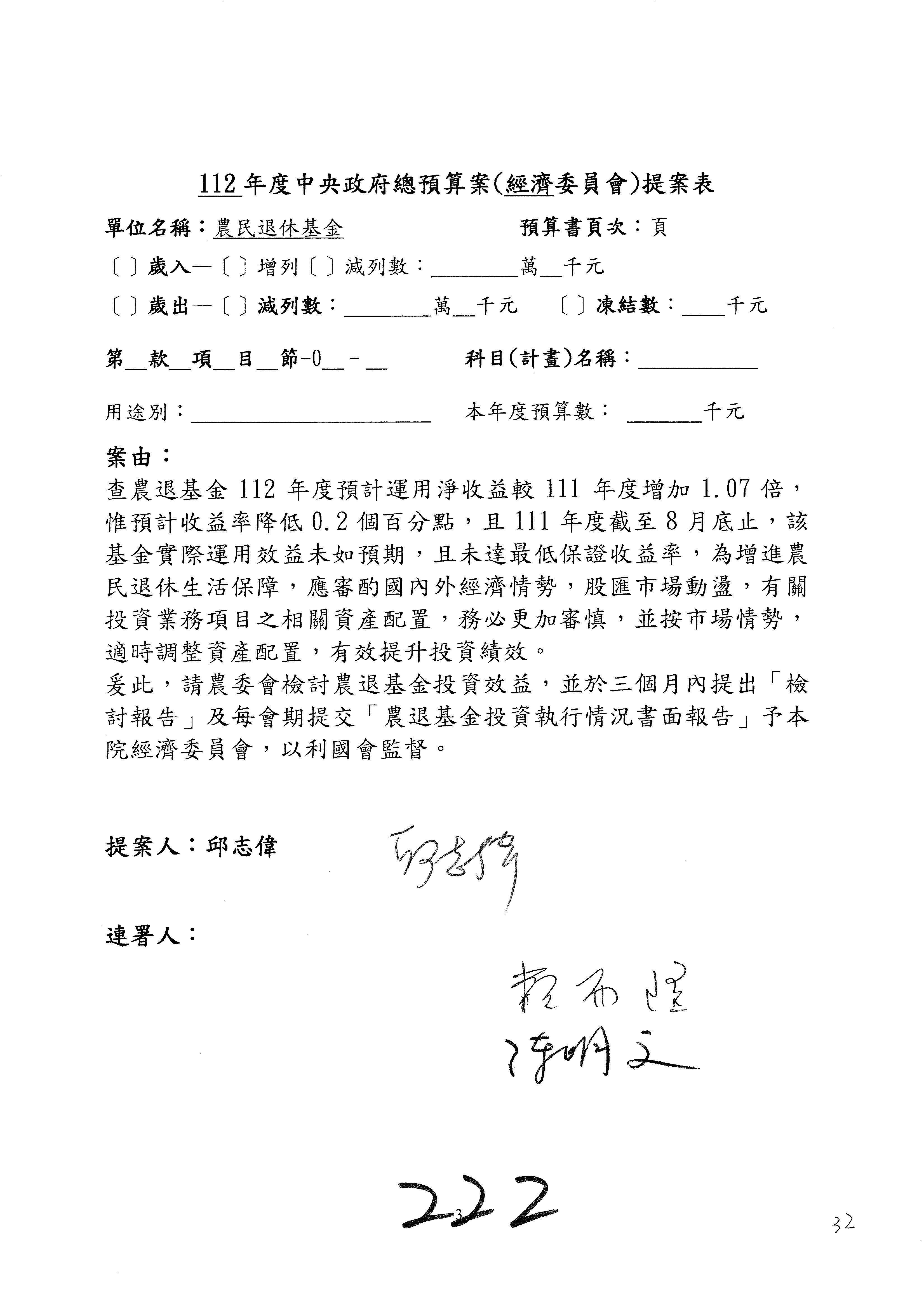 陳處長俊言:這個案子我們建議修改為:「請於三個月內針對如何提高農民參加農民退休儲金之比例,提出具體可行之書面報告及訂定目標於經濟委員會,以利國會監督。」