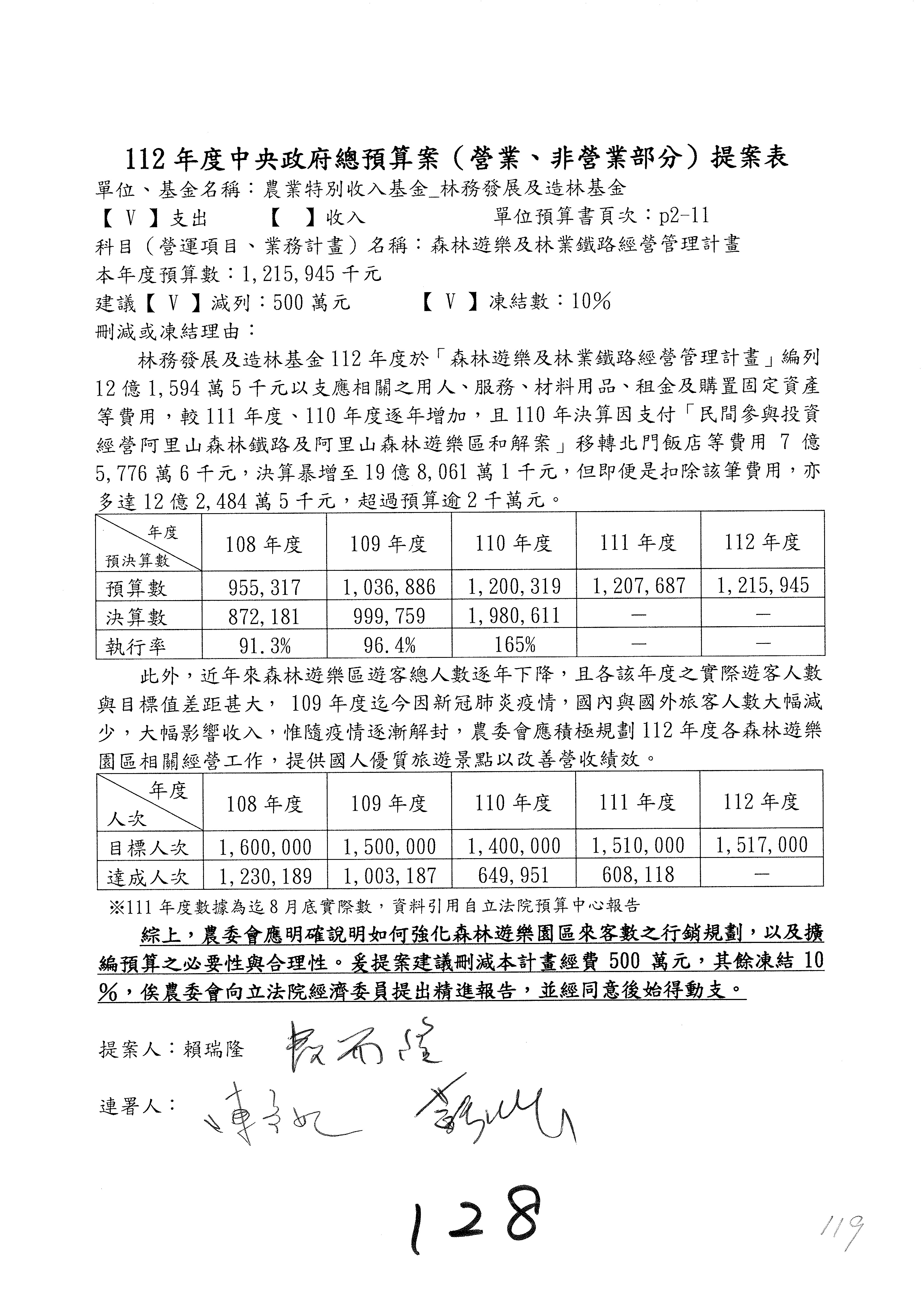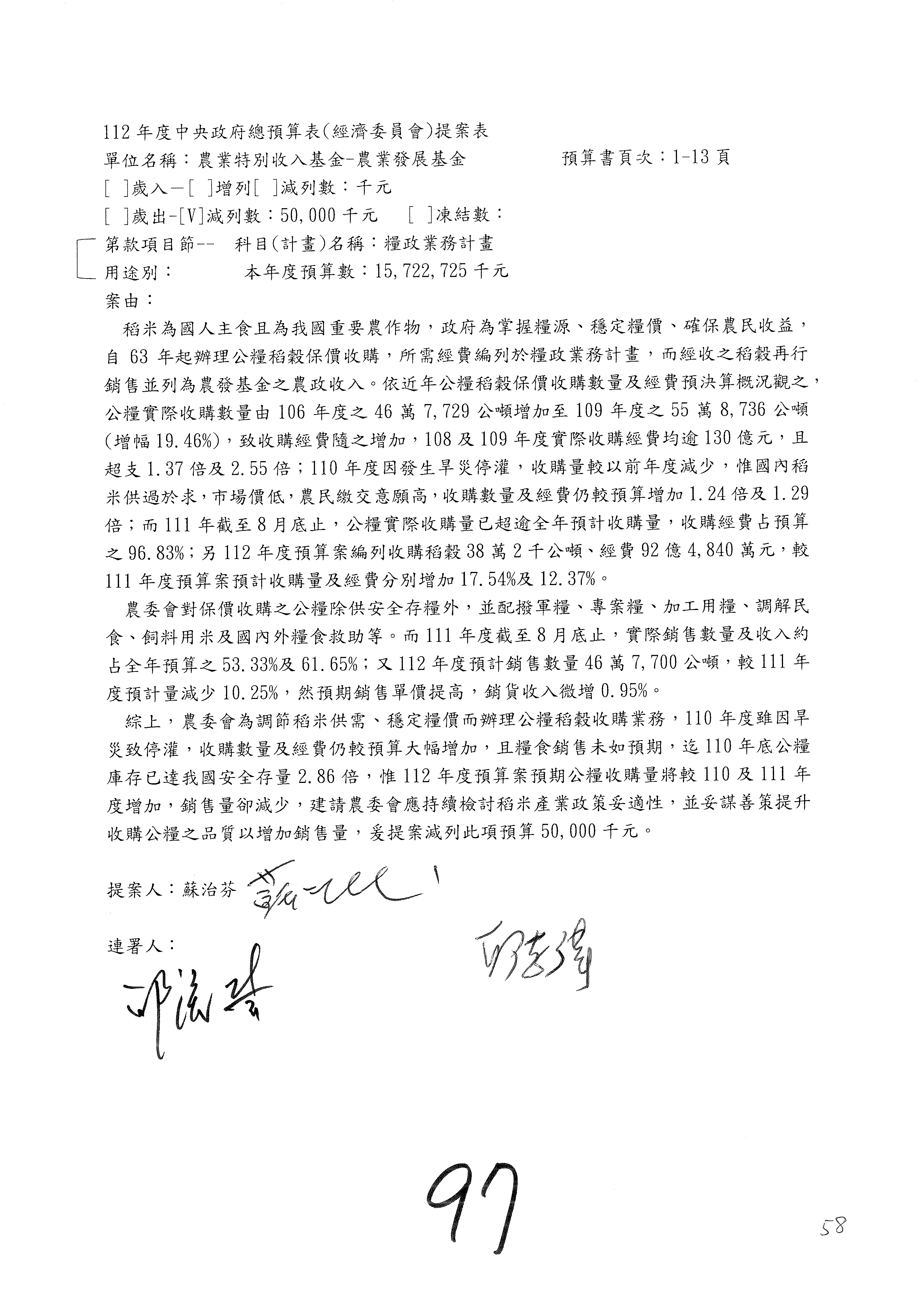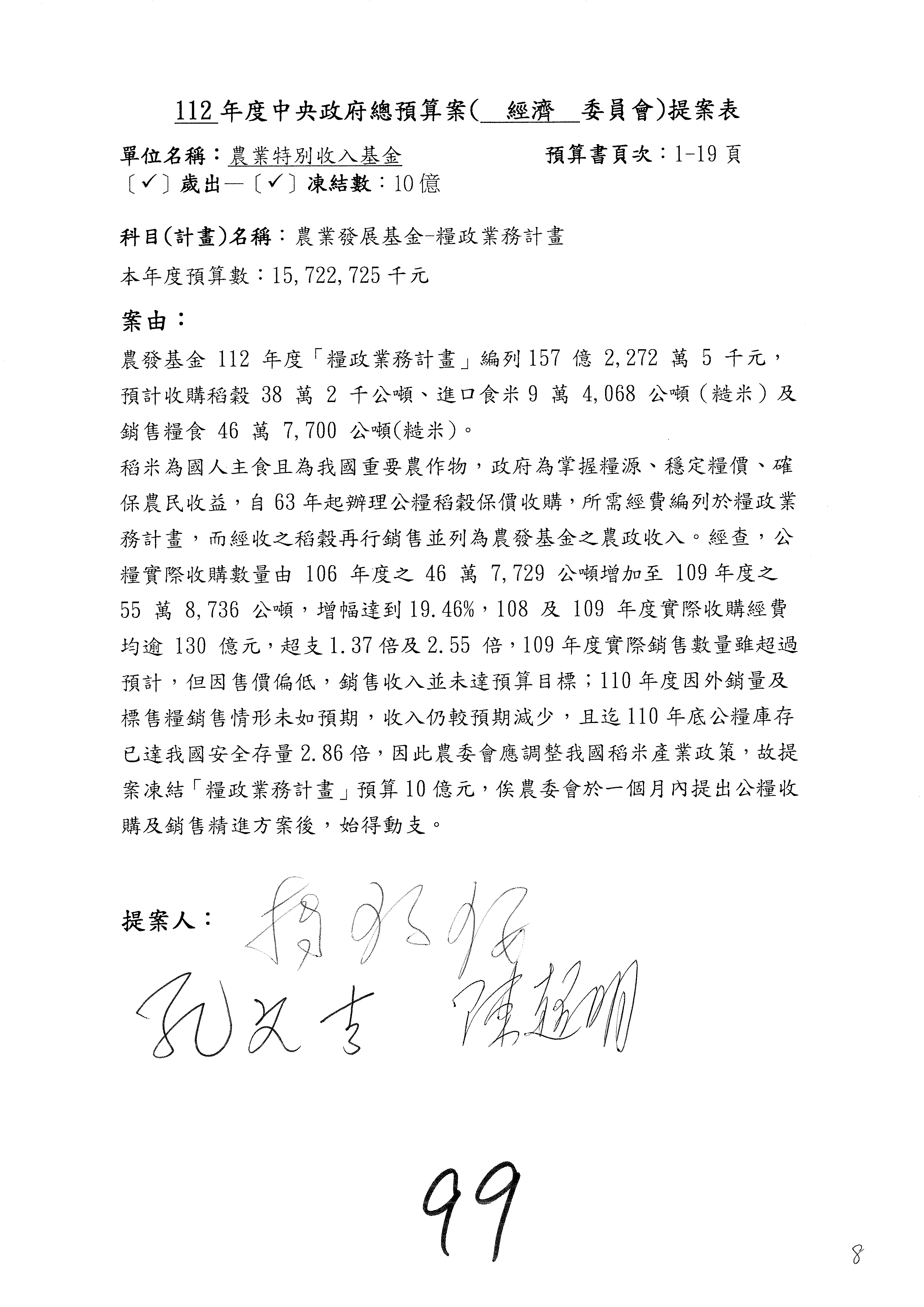 第96案至第105案預算照列,其中第98案至第99案改主決議。