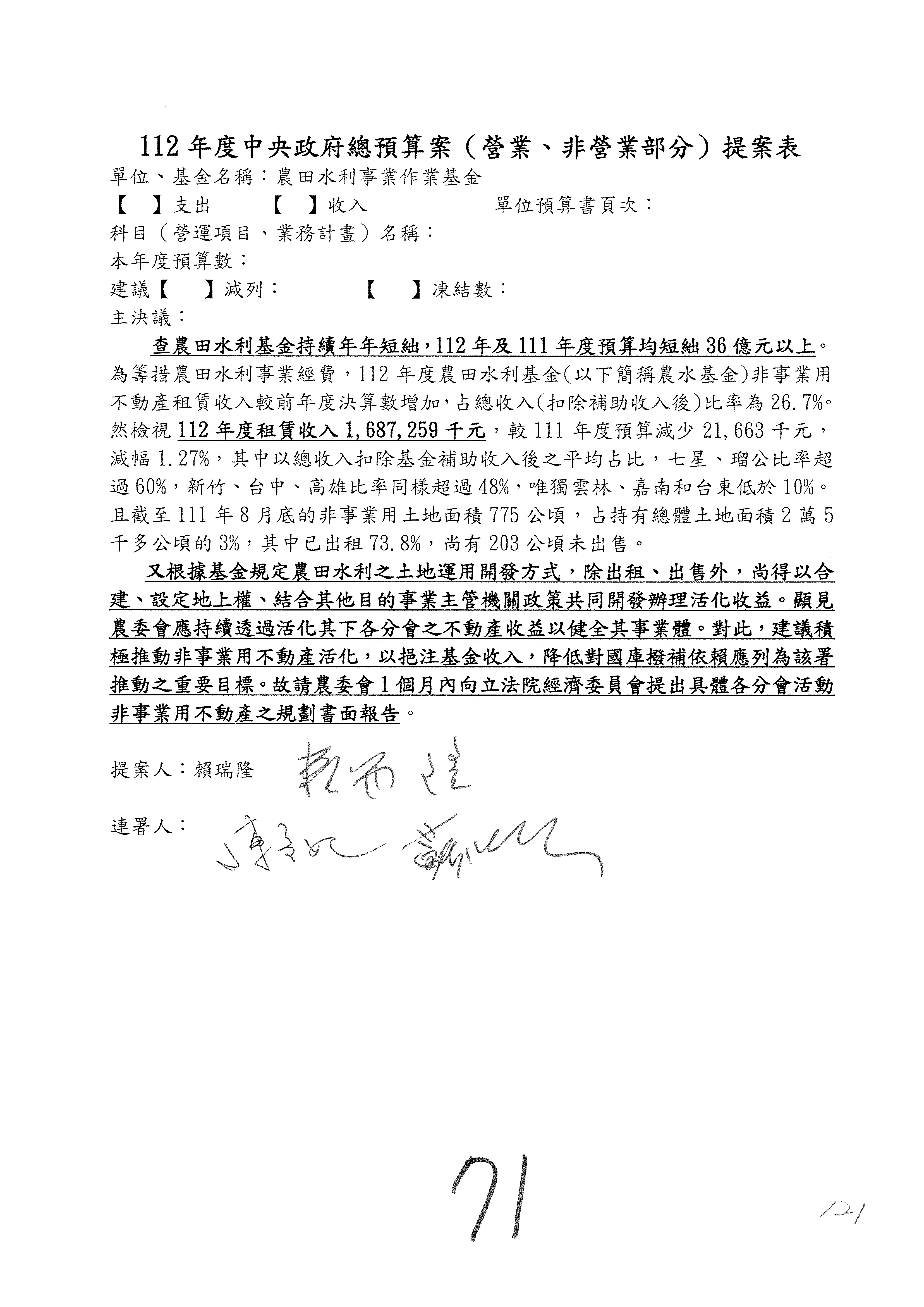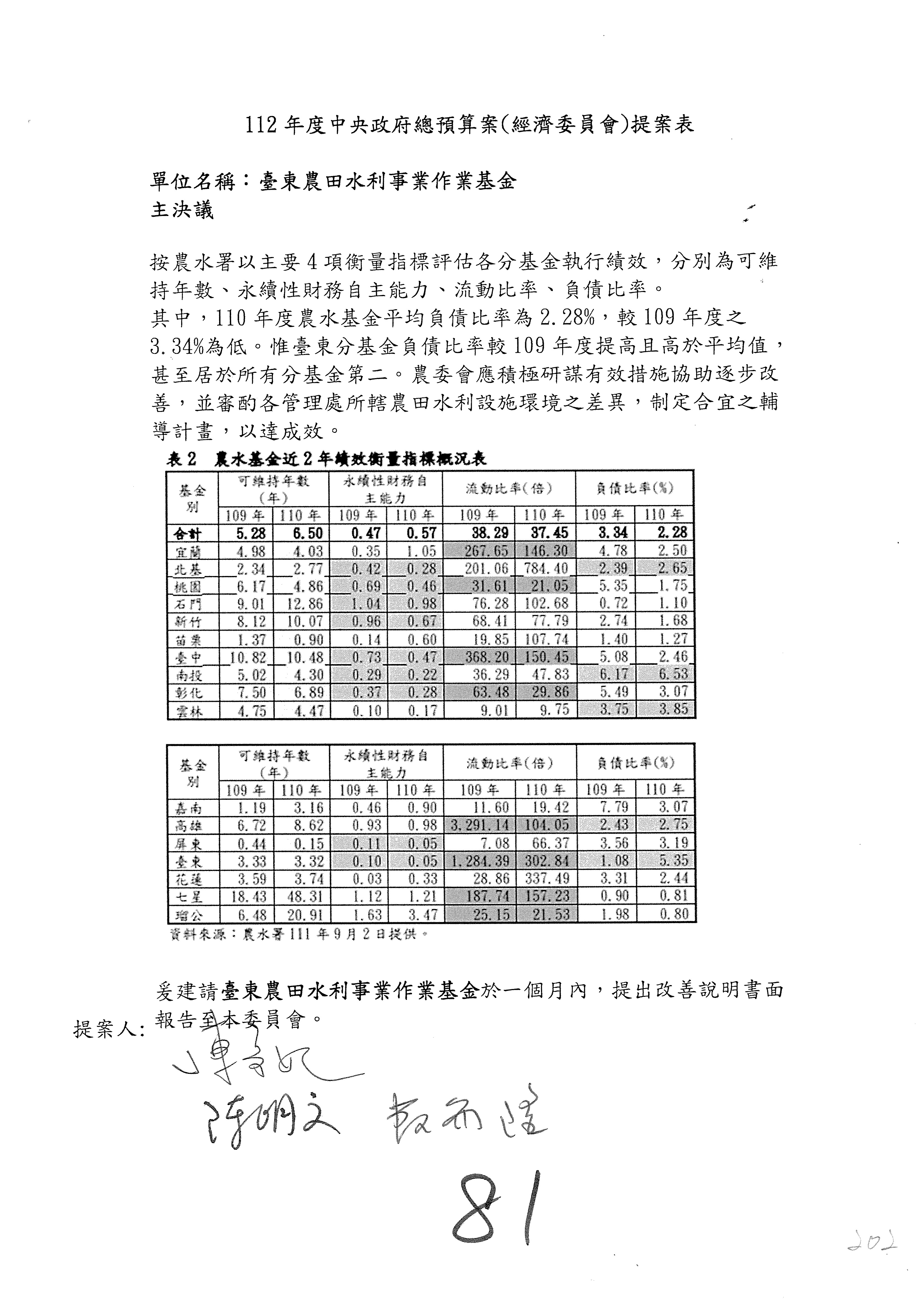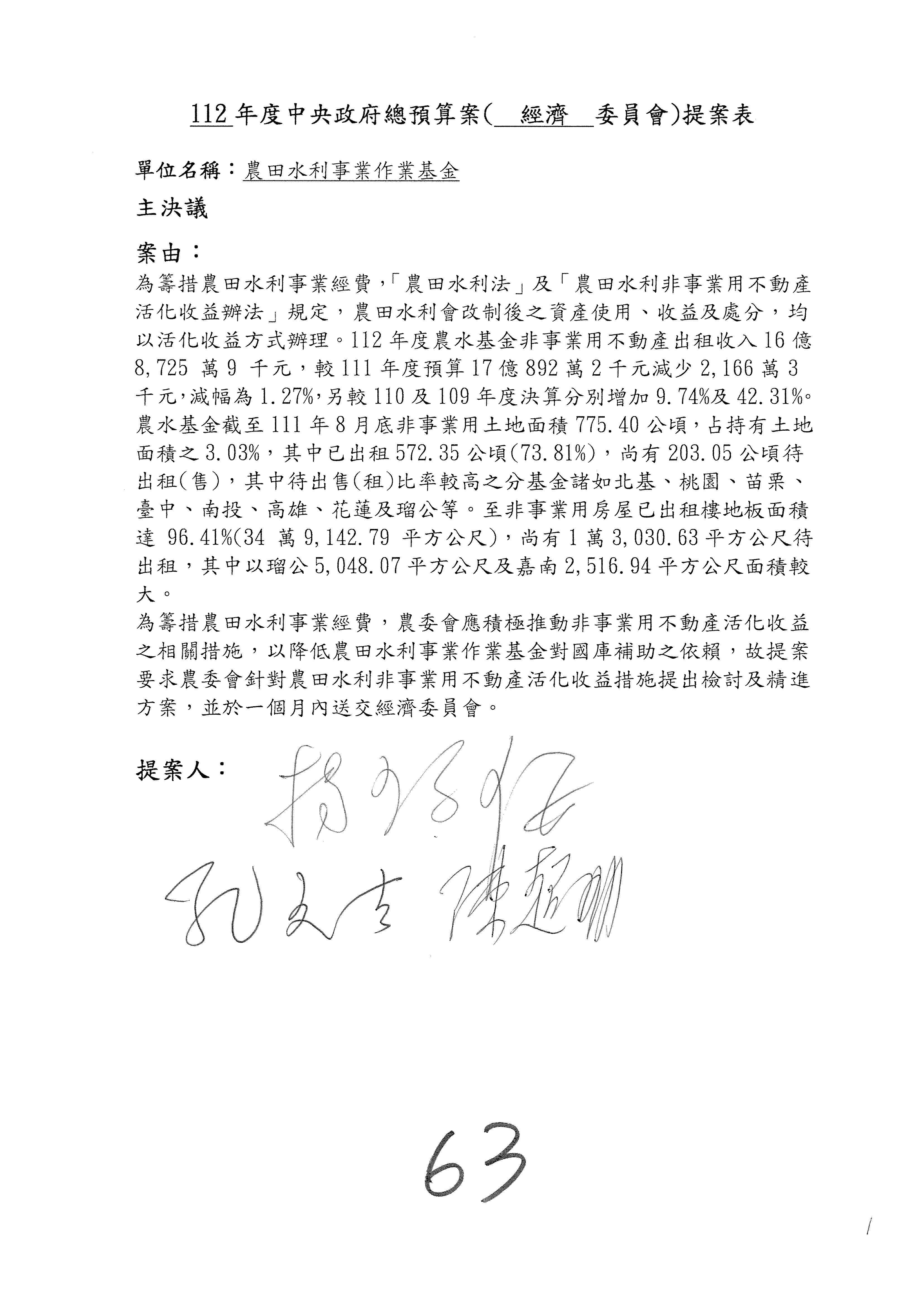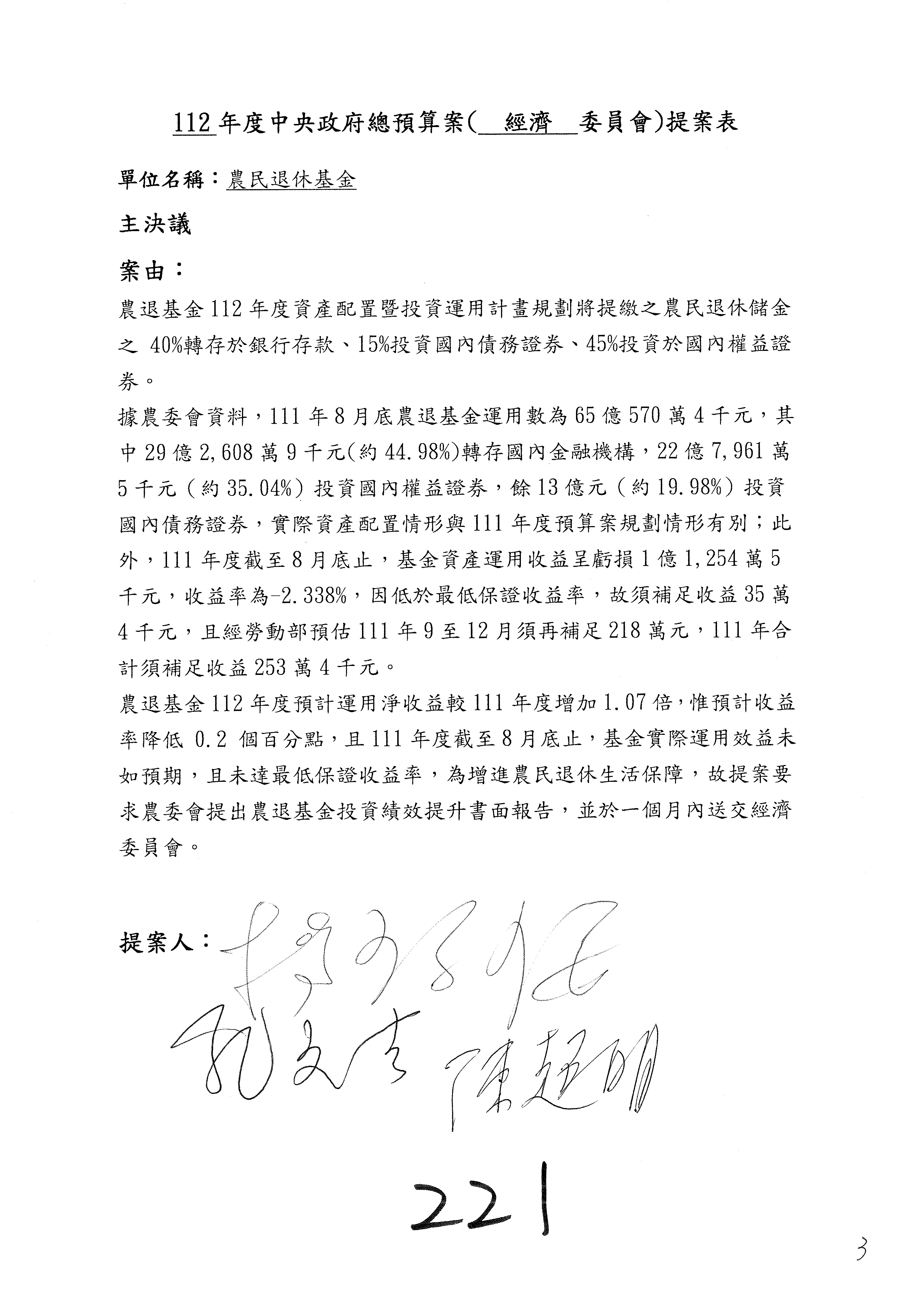 陳處長俊言:有關這個案子,委員希望我們提出檢討報告及每會期提交農退基金投資執行情況書面報告到經濟委員會,我們建議是不是可以改成三個月內提出書面報告予本院經濟委員會?