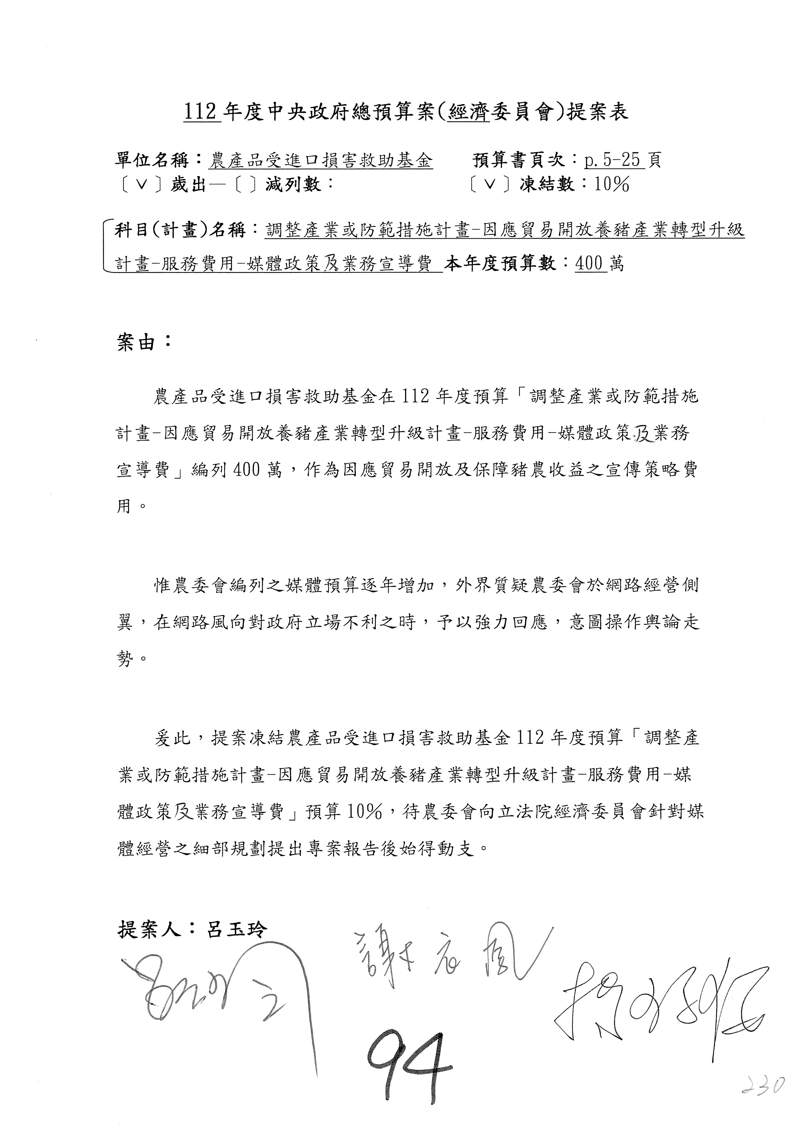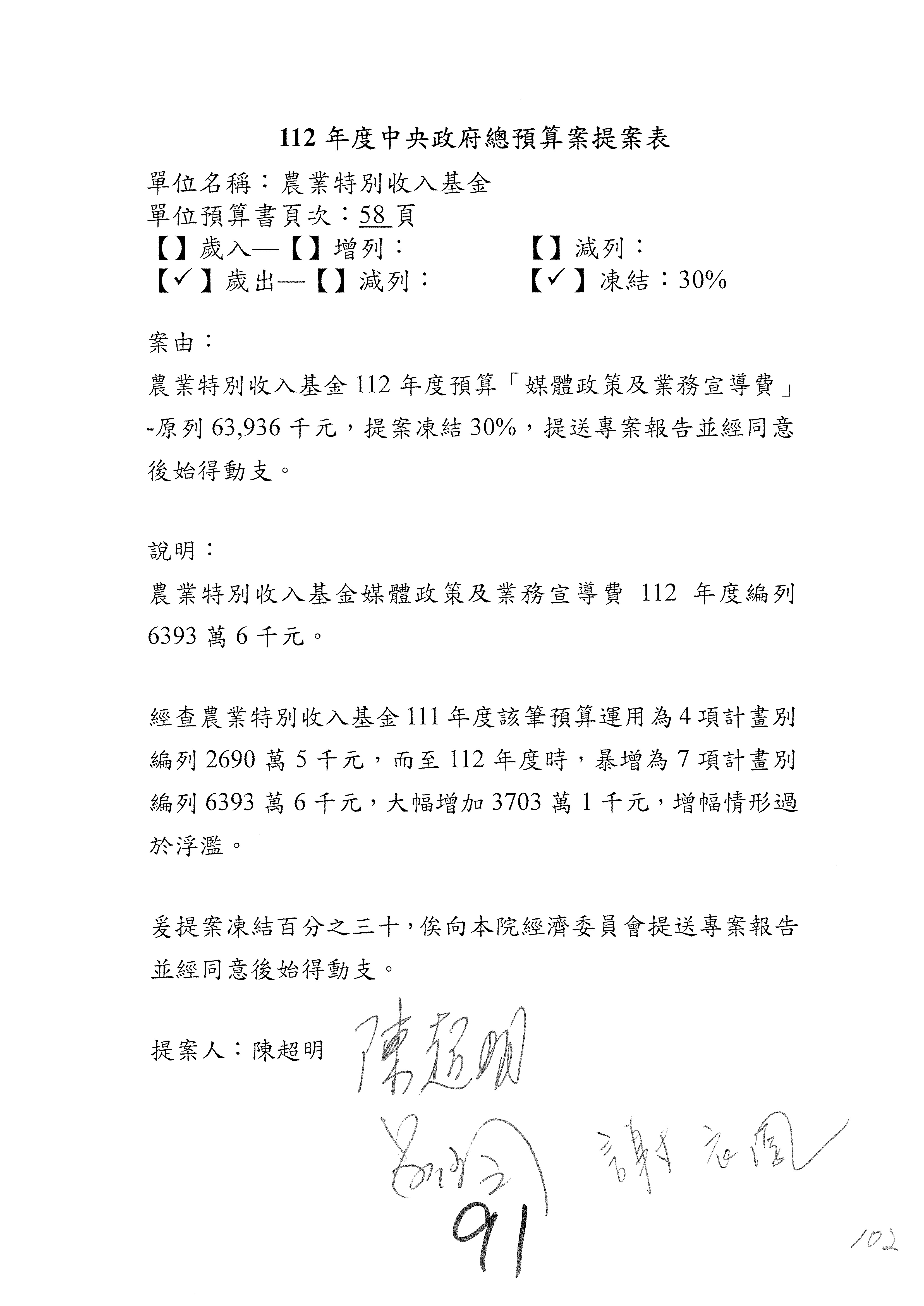 第91案至第94案,媒體政策及業務宣導費凍結100萬元,提出書面報告後始得動支。
