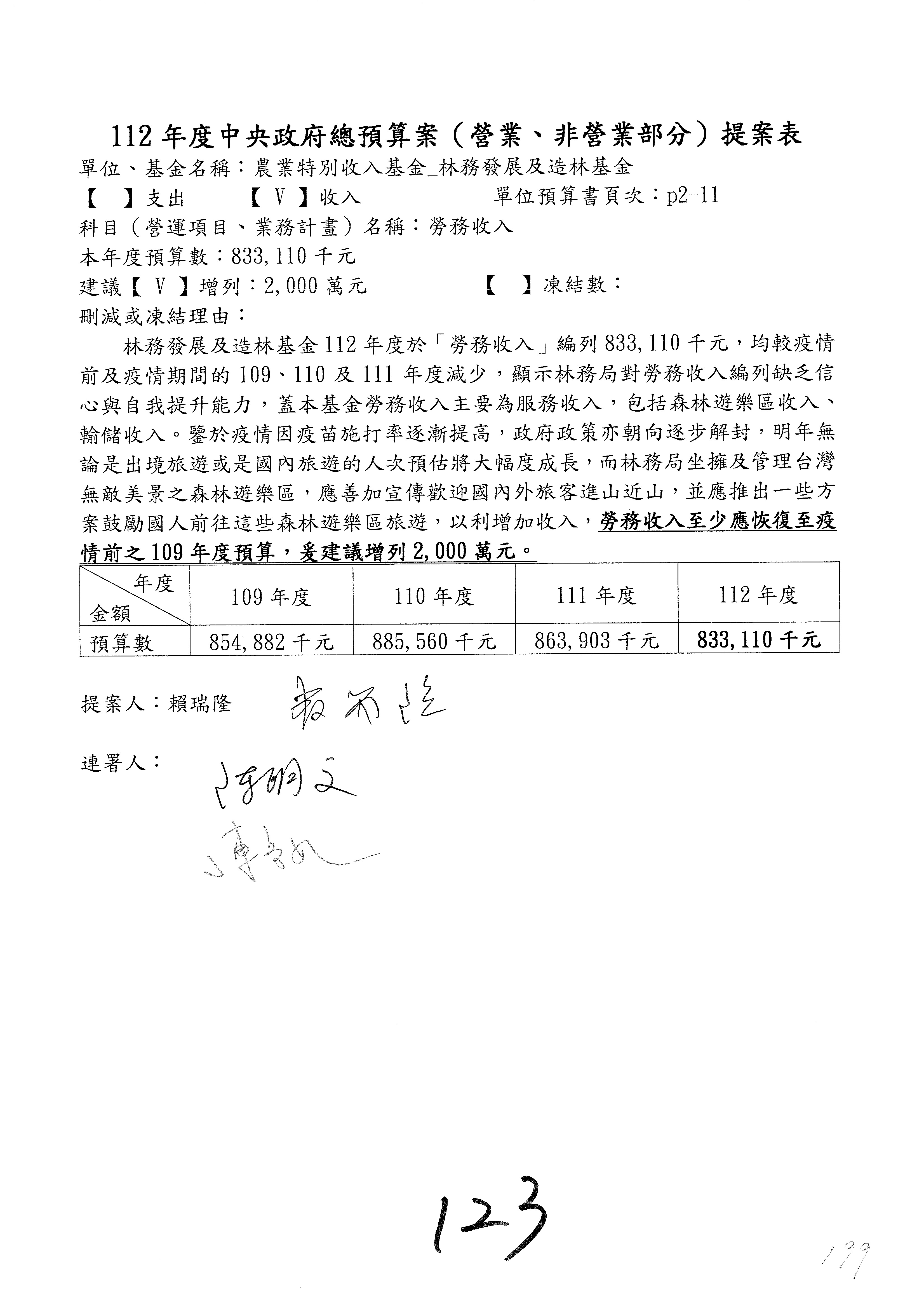 第123案、第124案勞務收入增列2,000萬元。