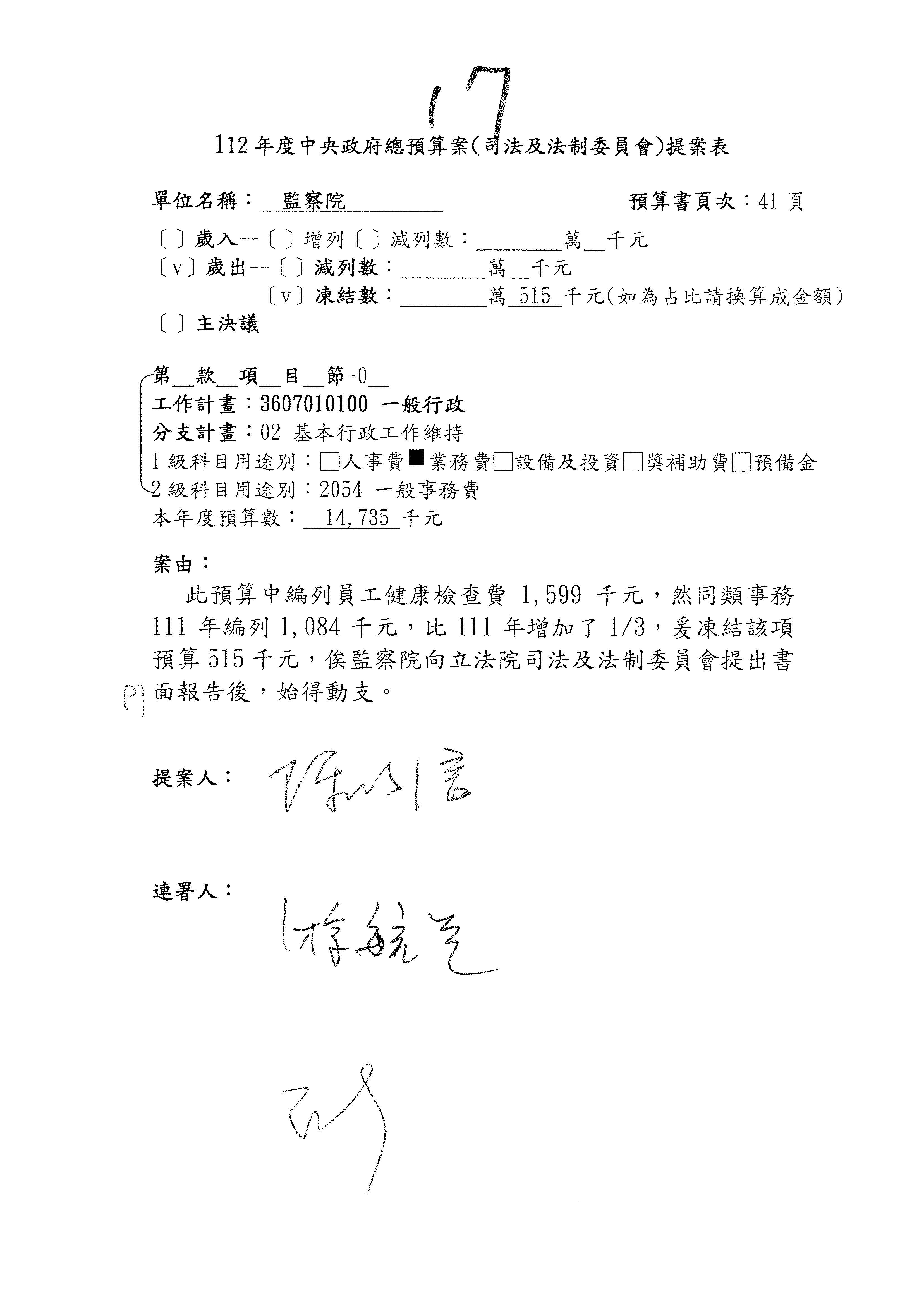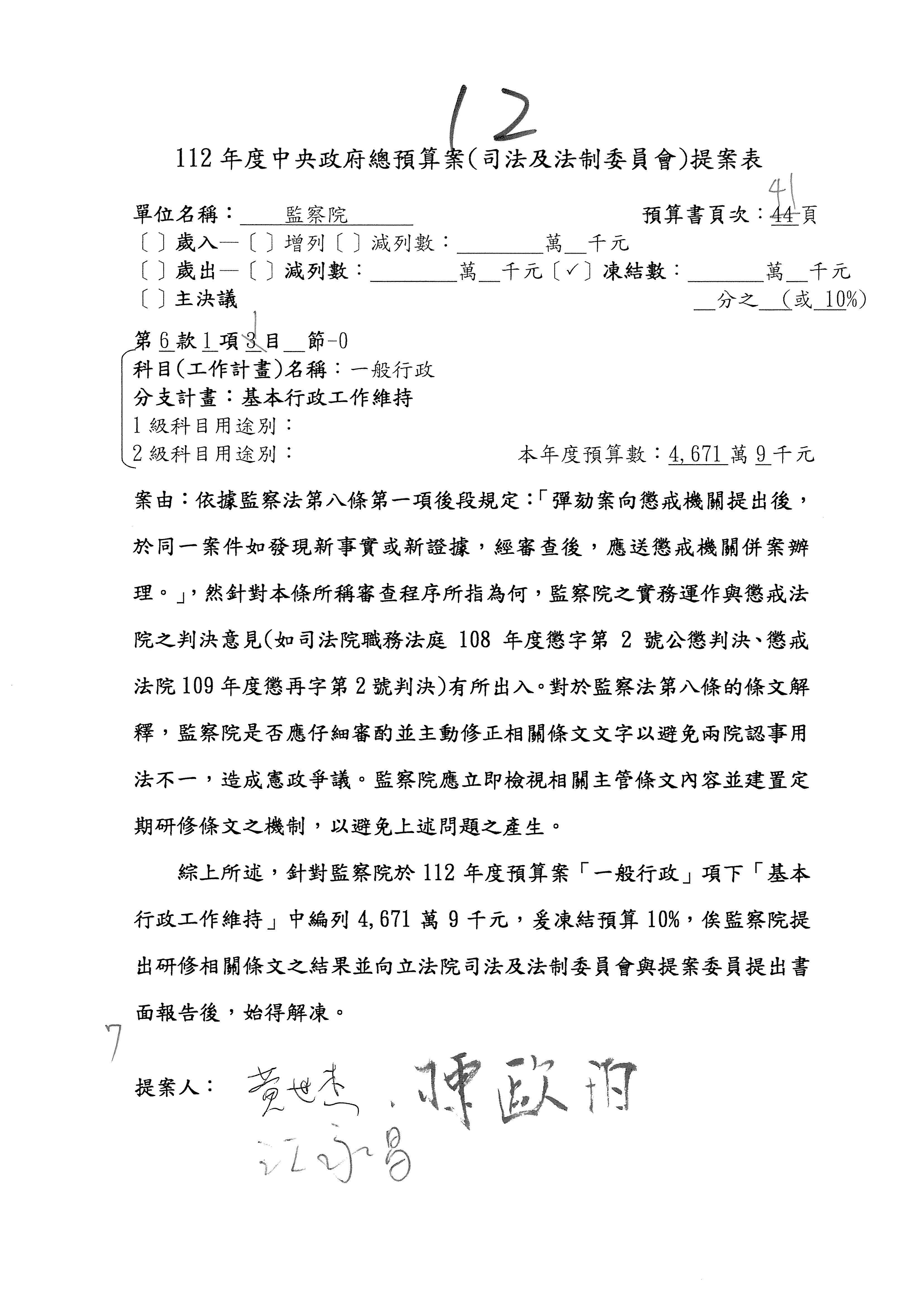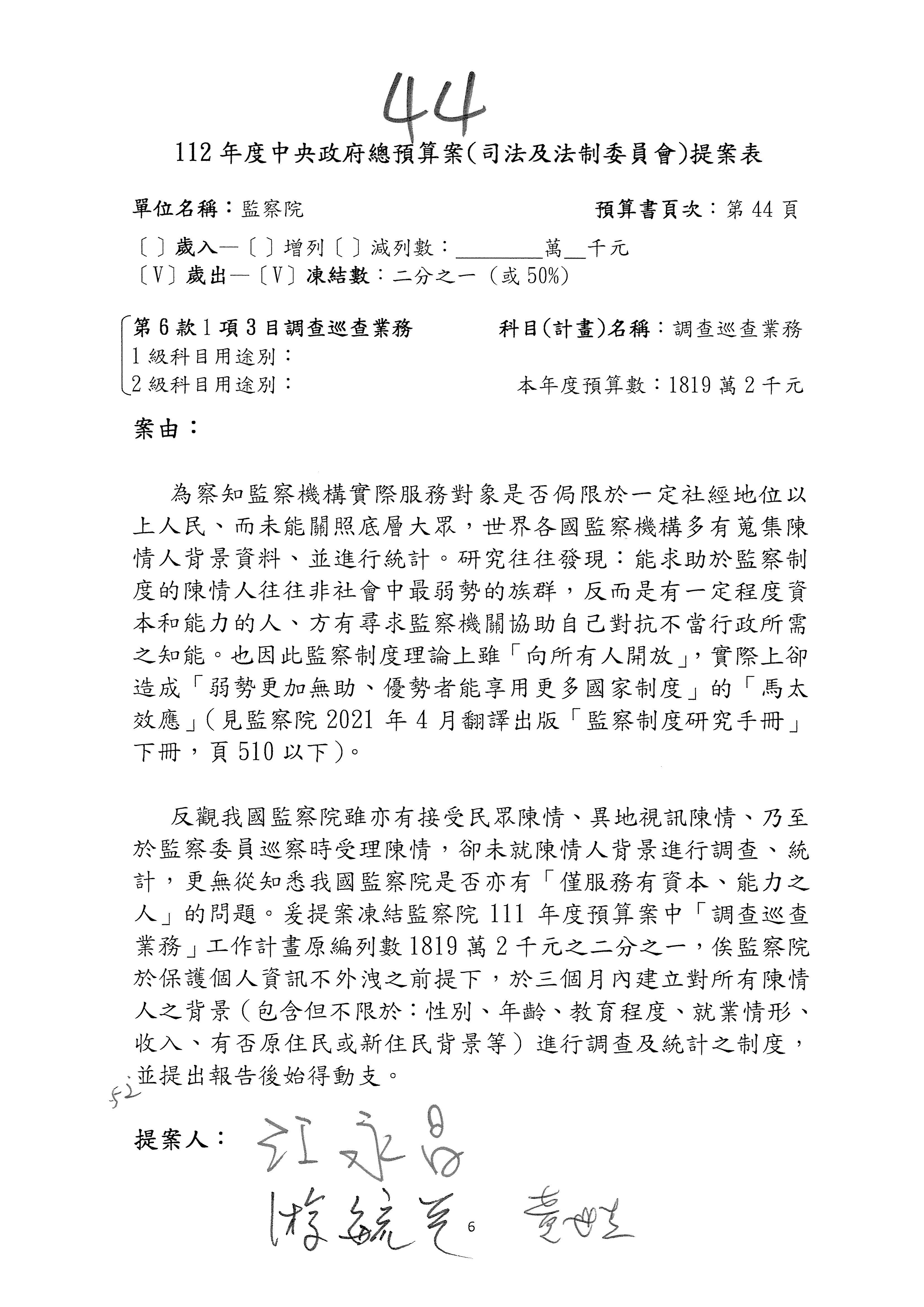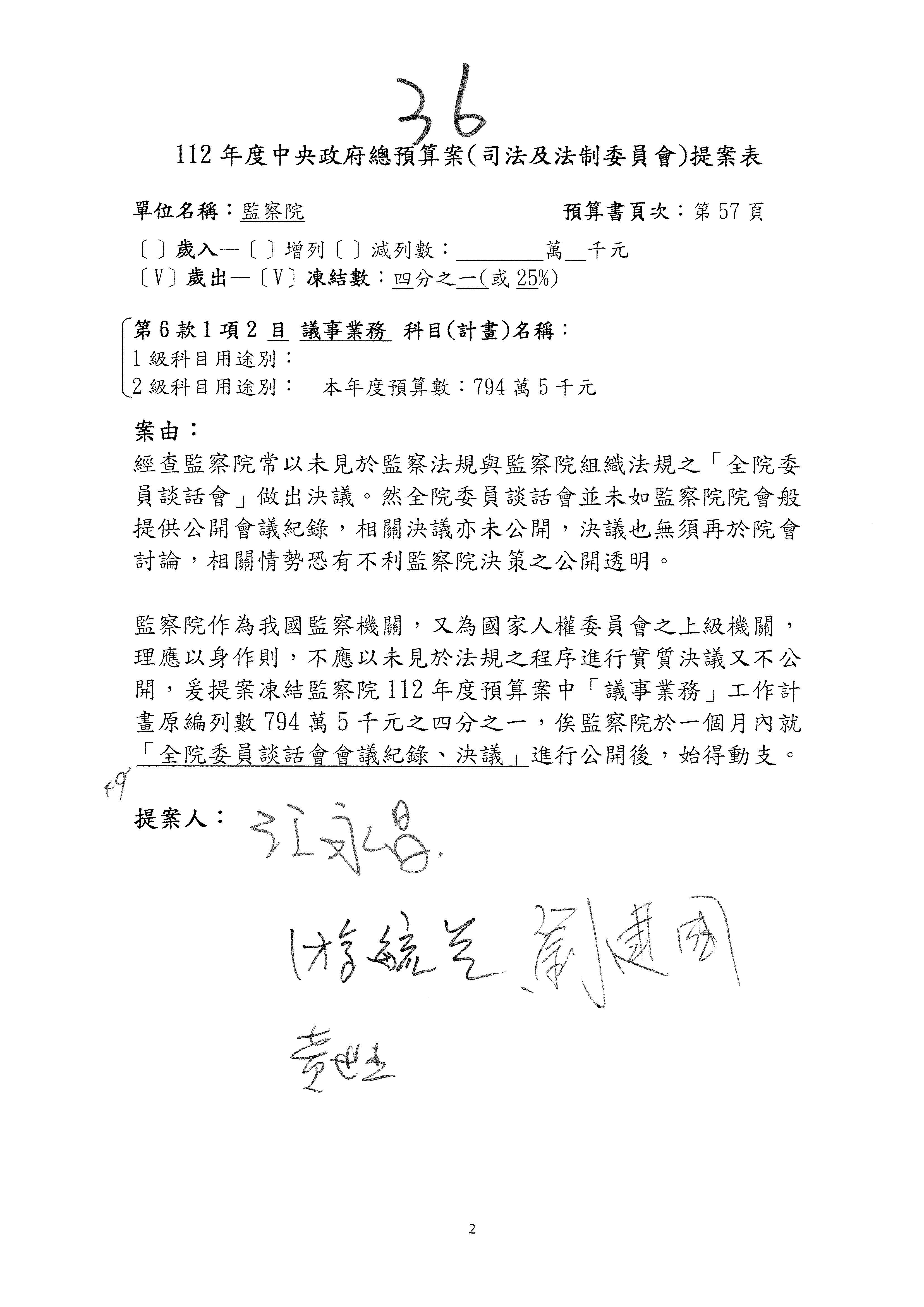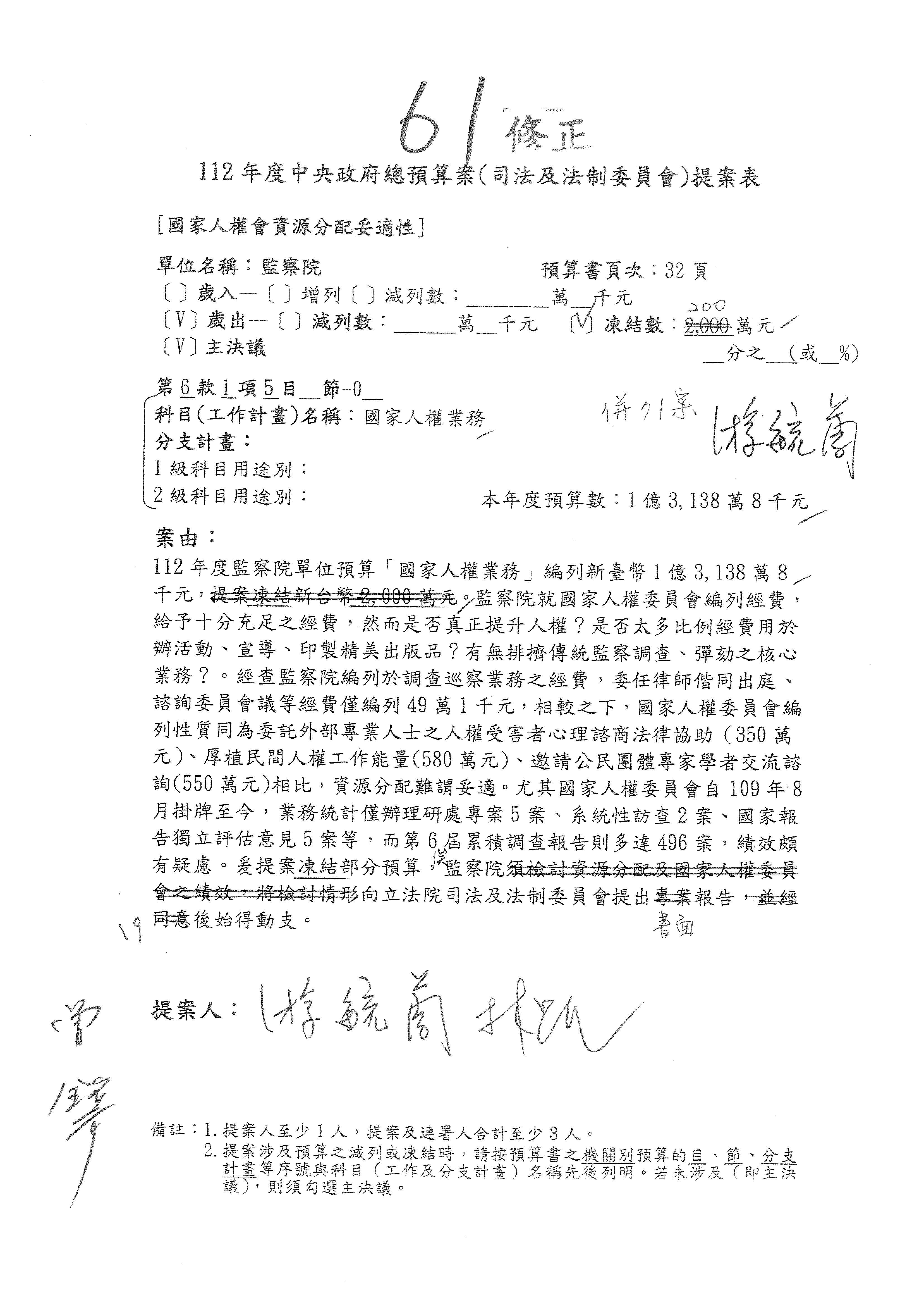 現在處理討論事項第一案─繼續審查112年度中央政府總預算案關於監察院主管收支部分,在處理之前,請議事人員一併宣讀討論事項第一案預算案之全部預算數及委員提案,請宣讀。