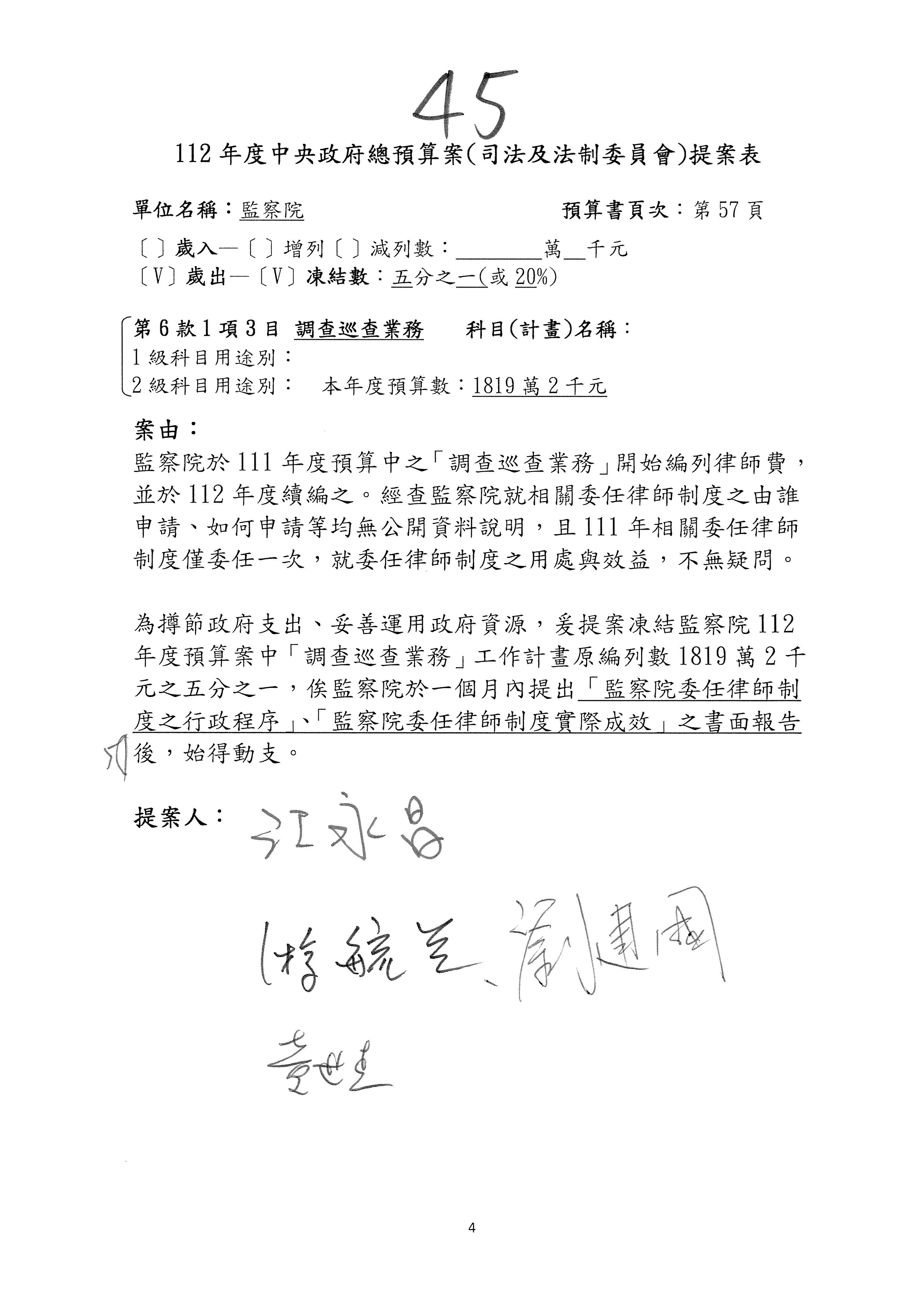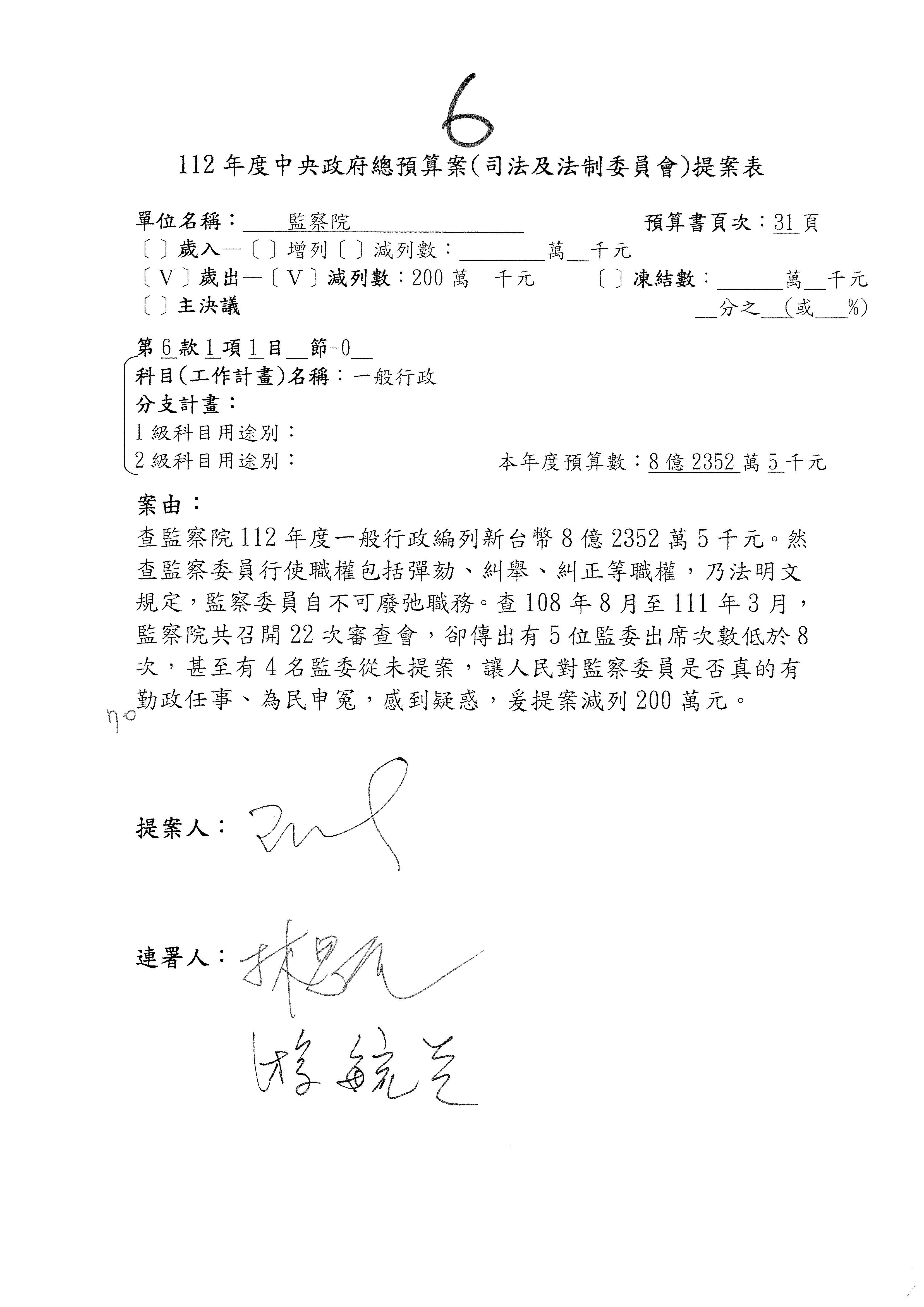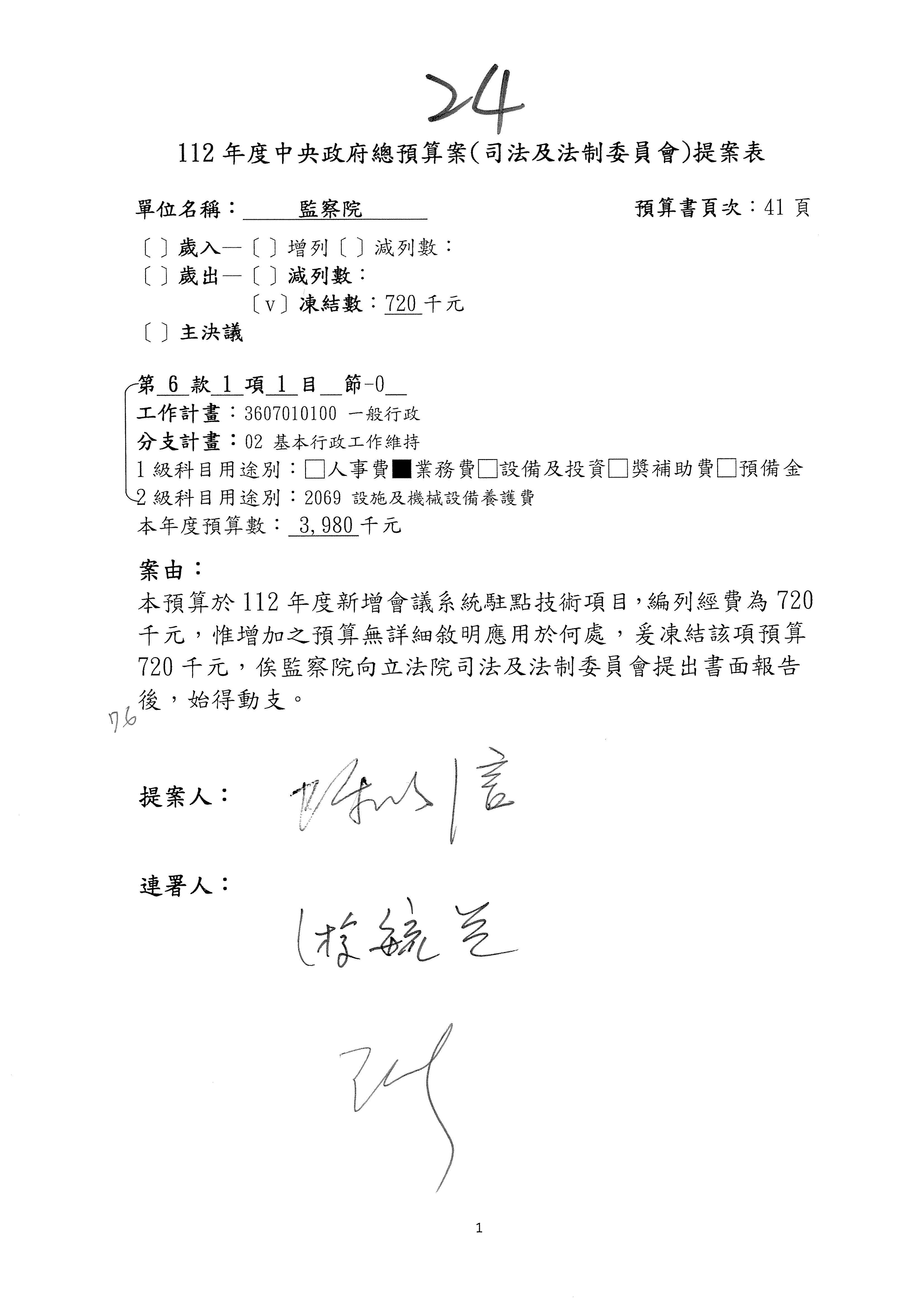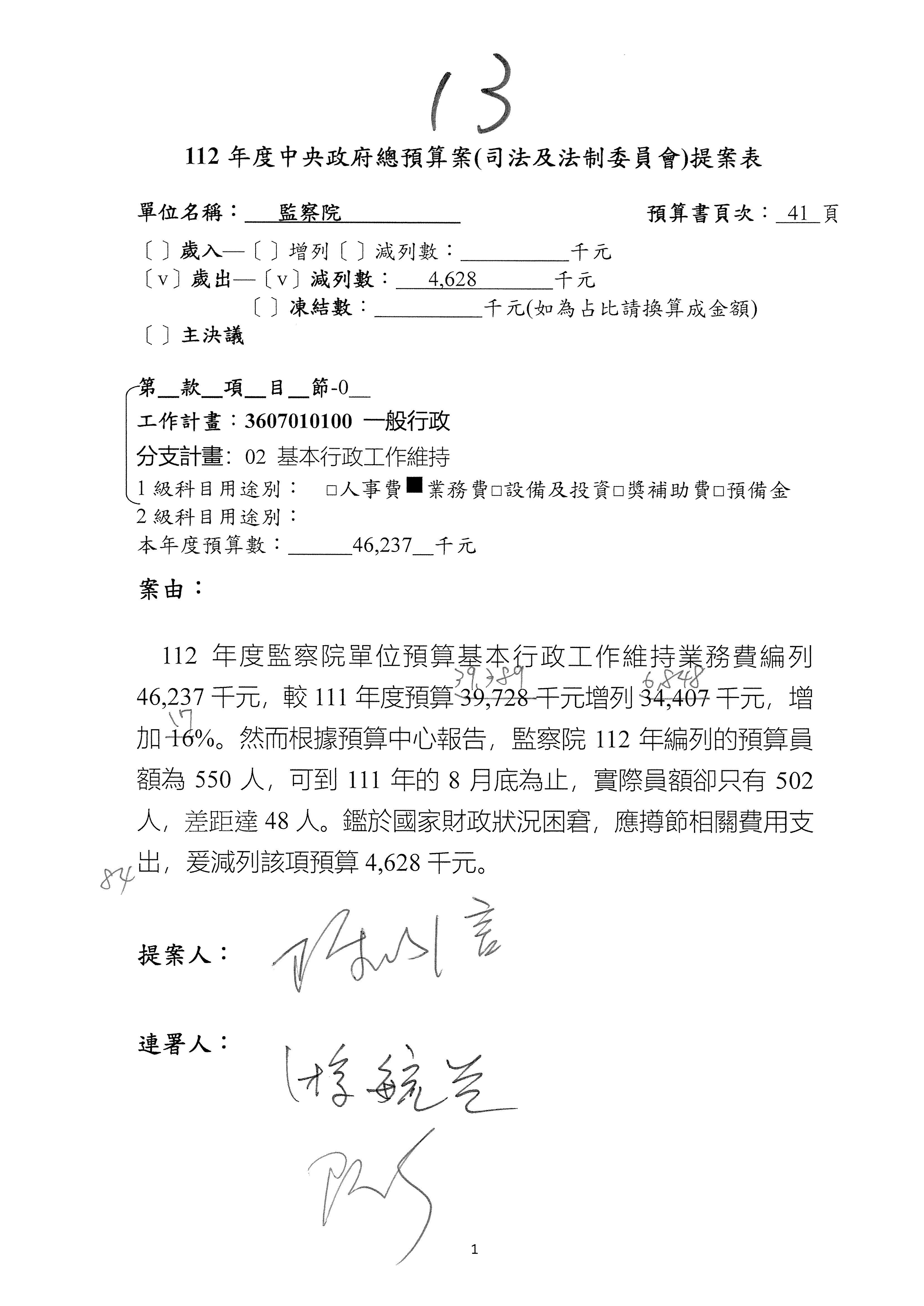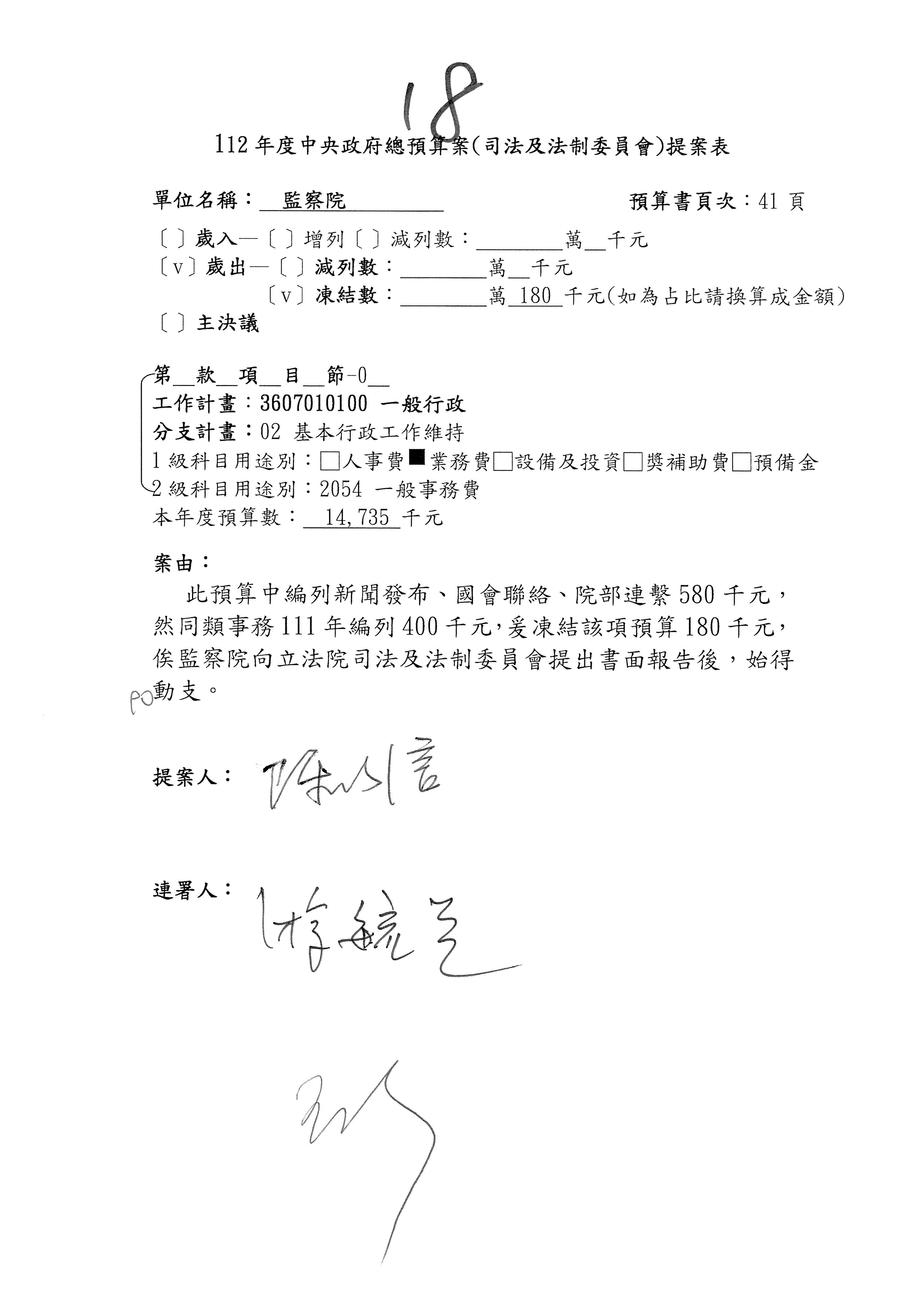 現在處理討論事項第一案─繼續審查112年度中央政府總預算案關於監察院主管收支部分,在處理之前,請議事人員一併宣讀討論事項第一案預算案之全部預算數及委員提案,請宣讀。