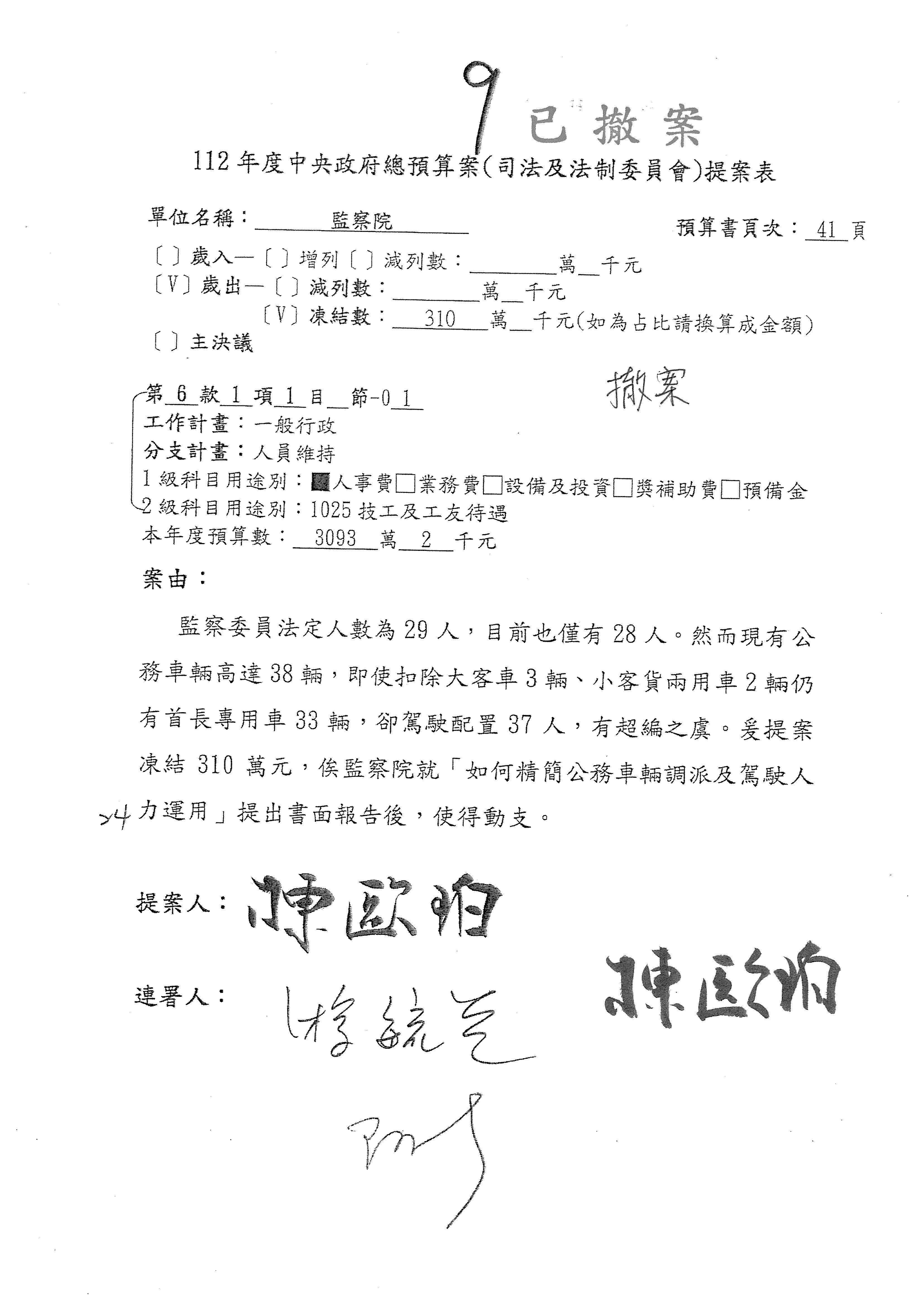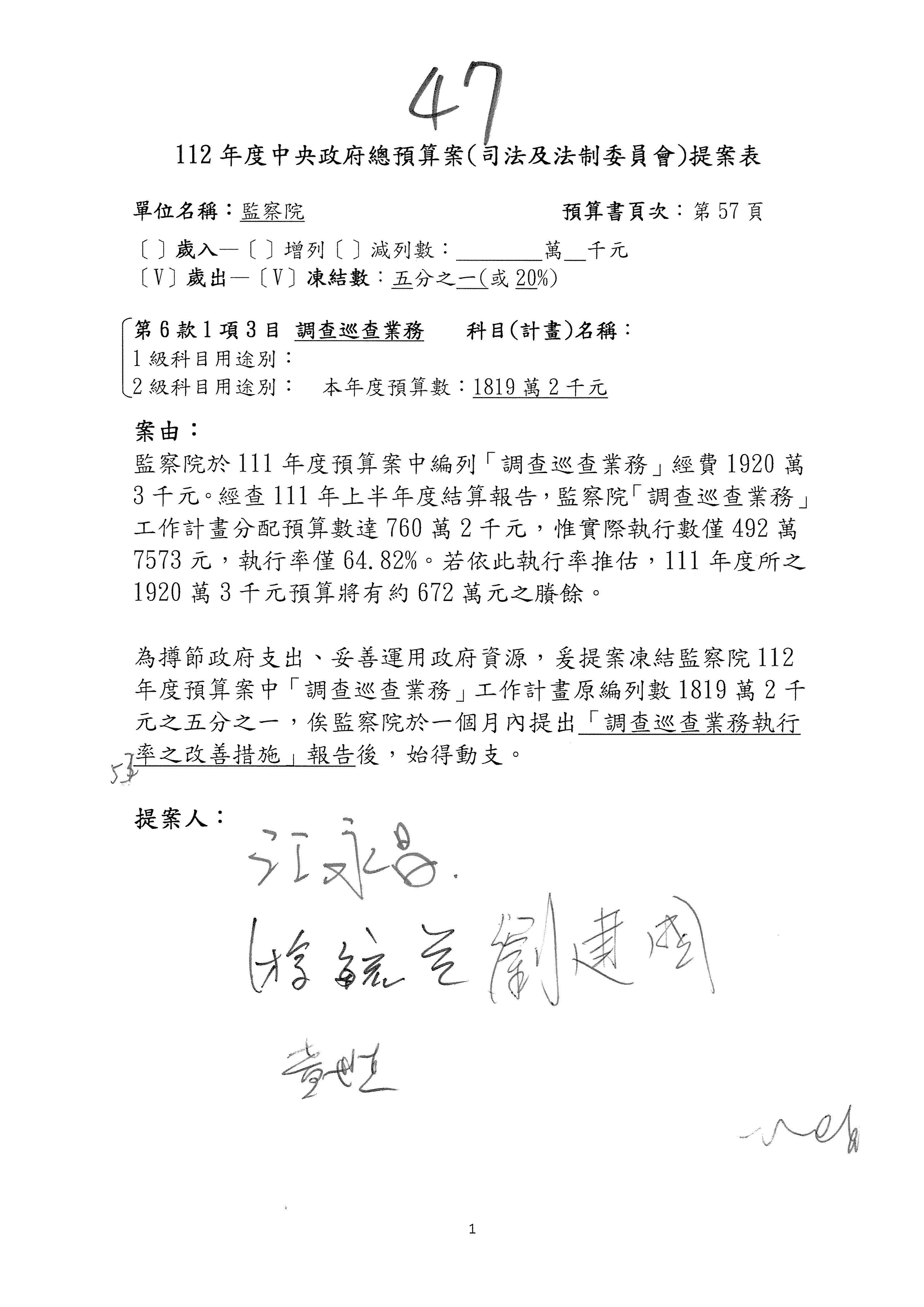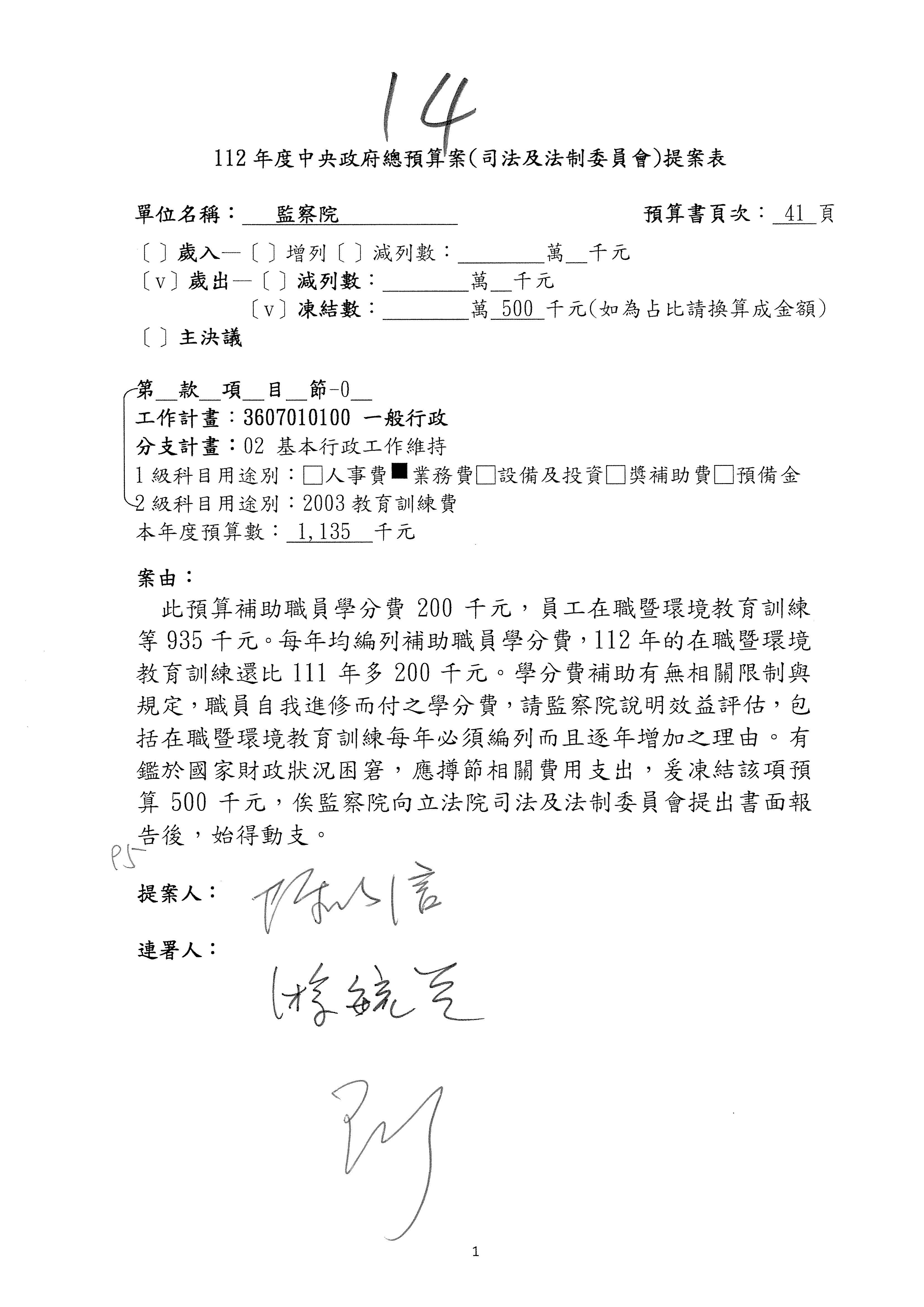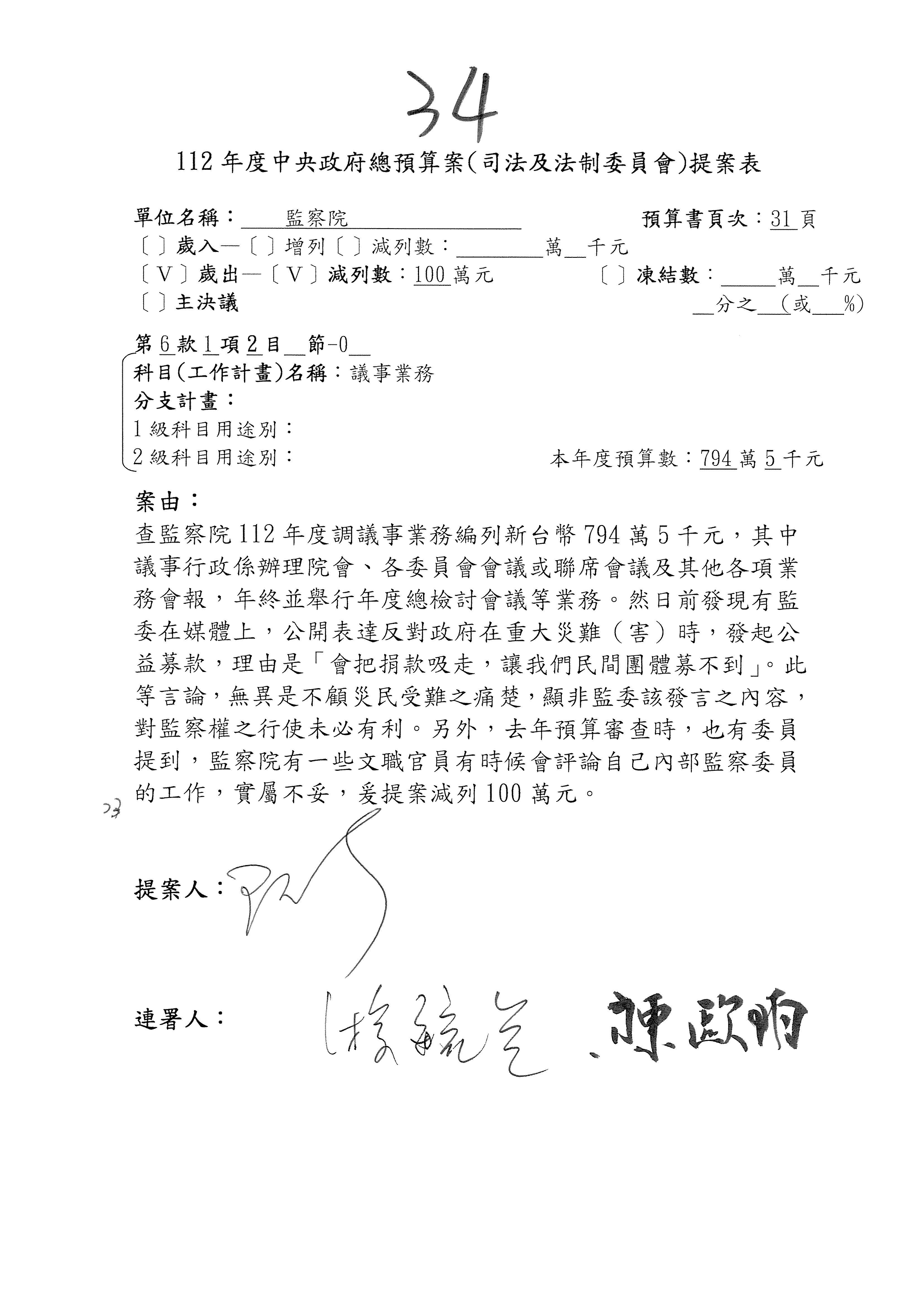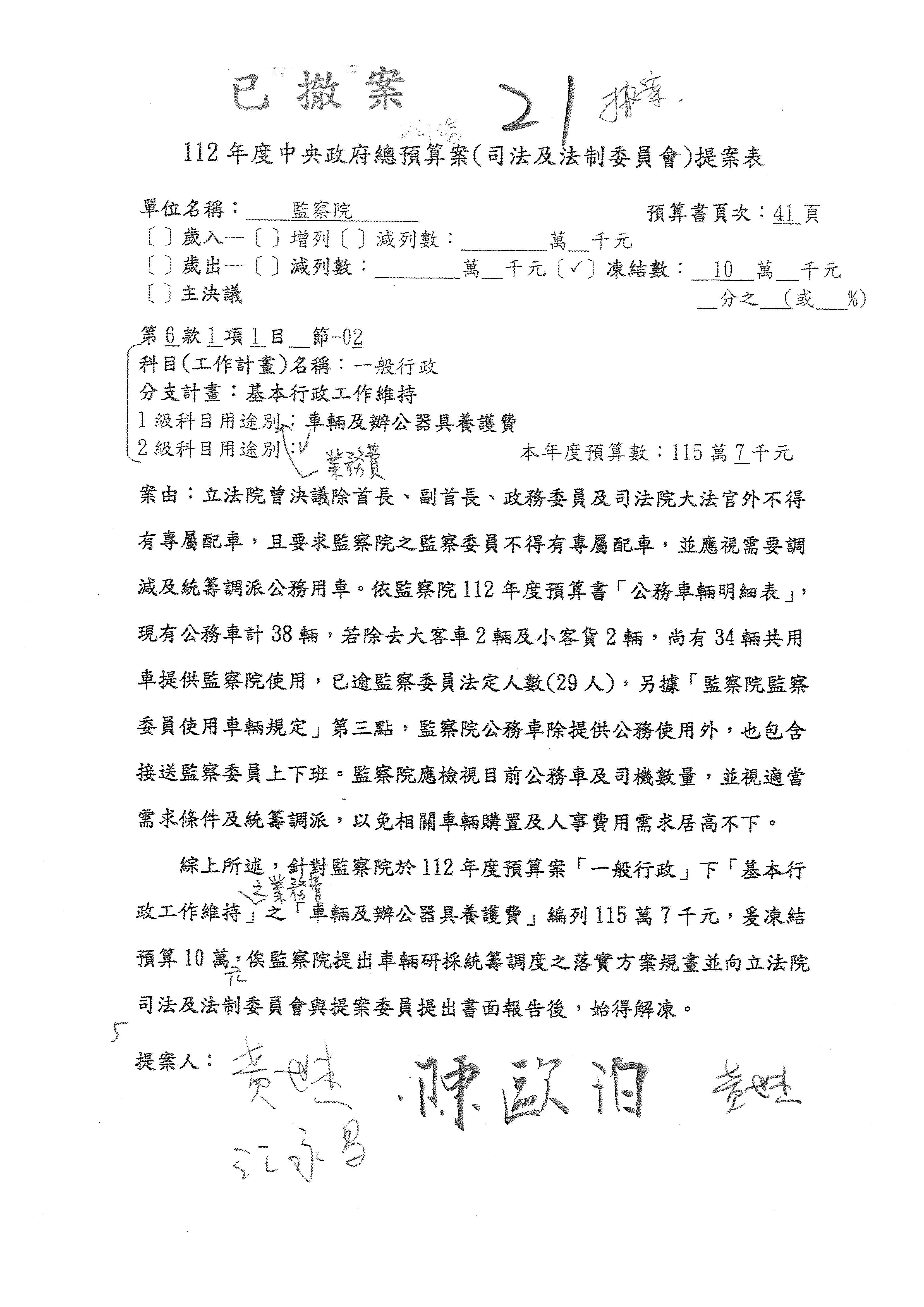 現在處理討論事項第一案─繼續審查112年度中央政府總預算案關於監察院主管收支部分,在處理之前,請議事人員一併宣讀討論事項第一案預算案之全部預算數及委員提案,請宣讀。