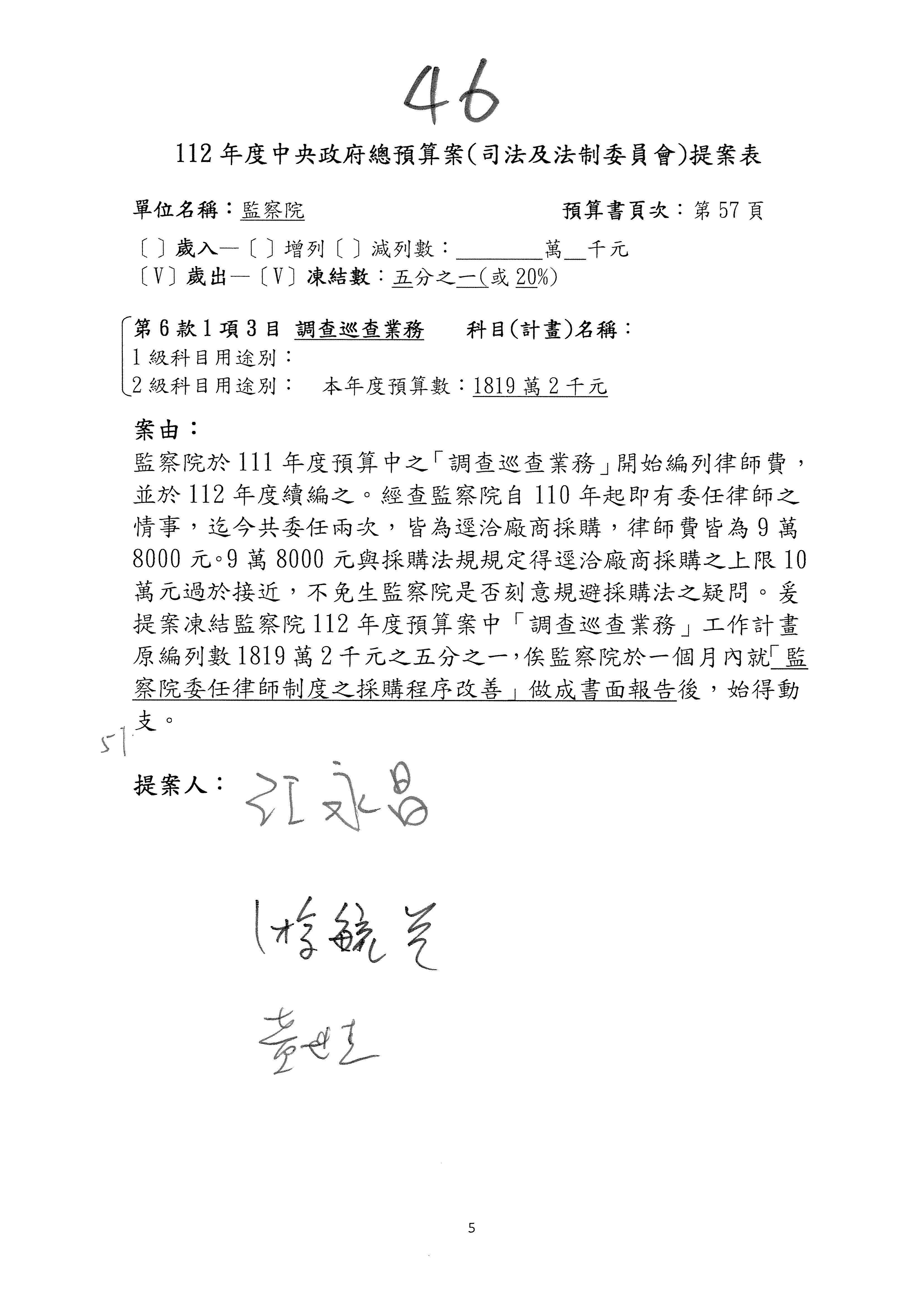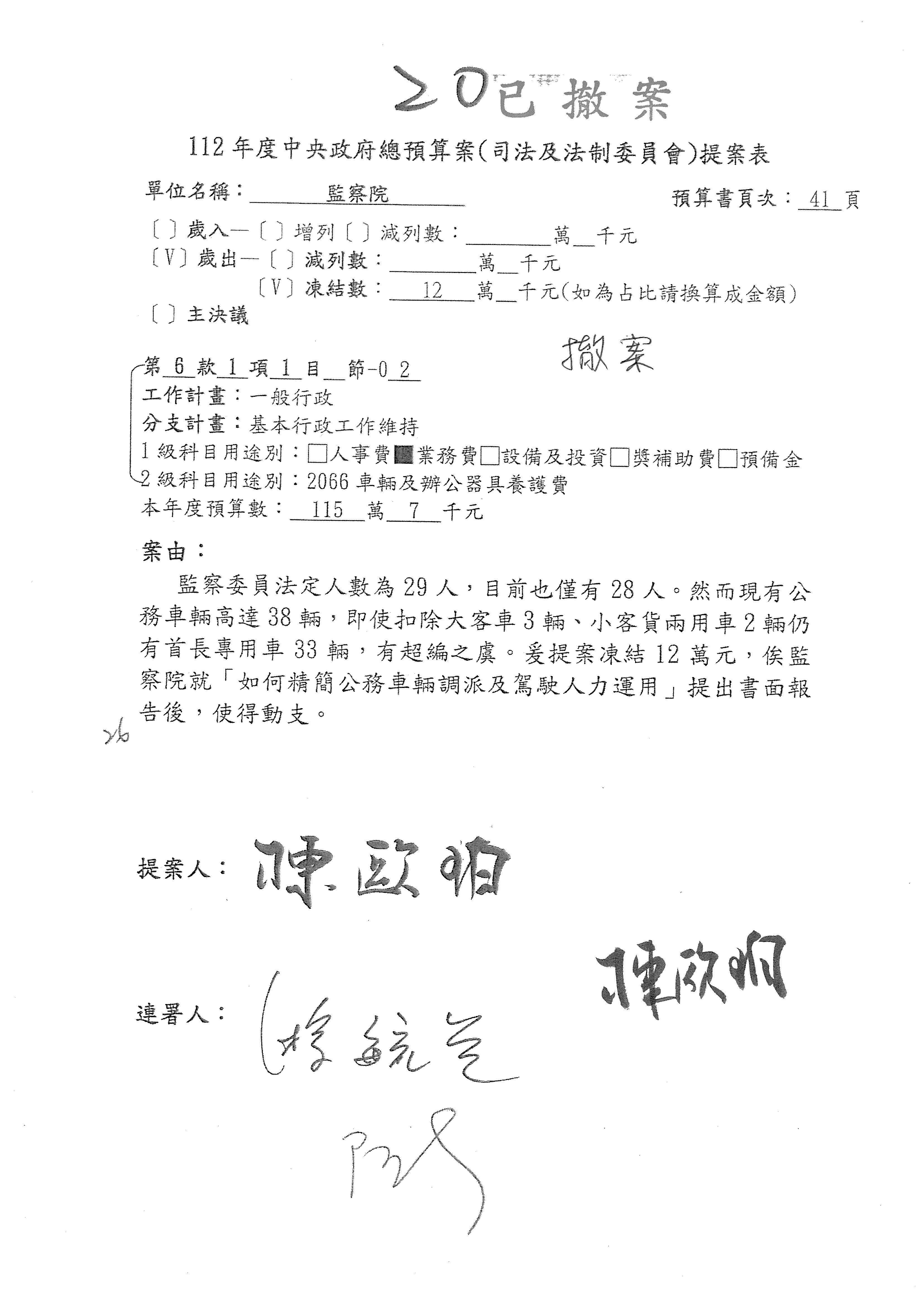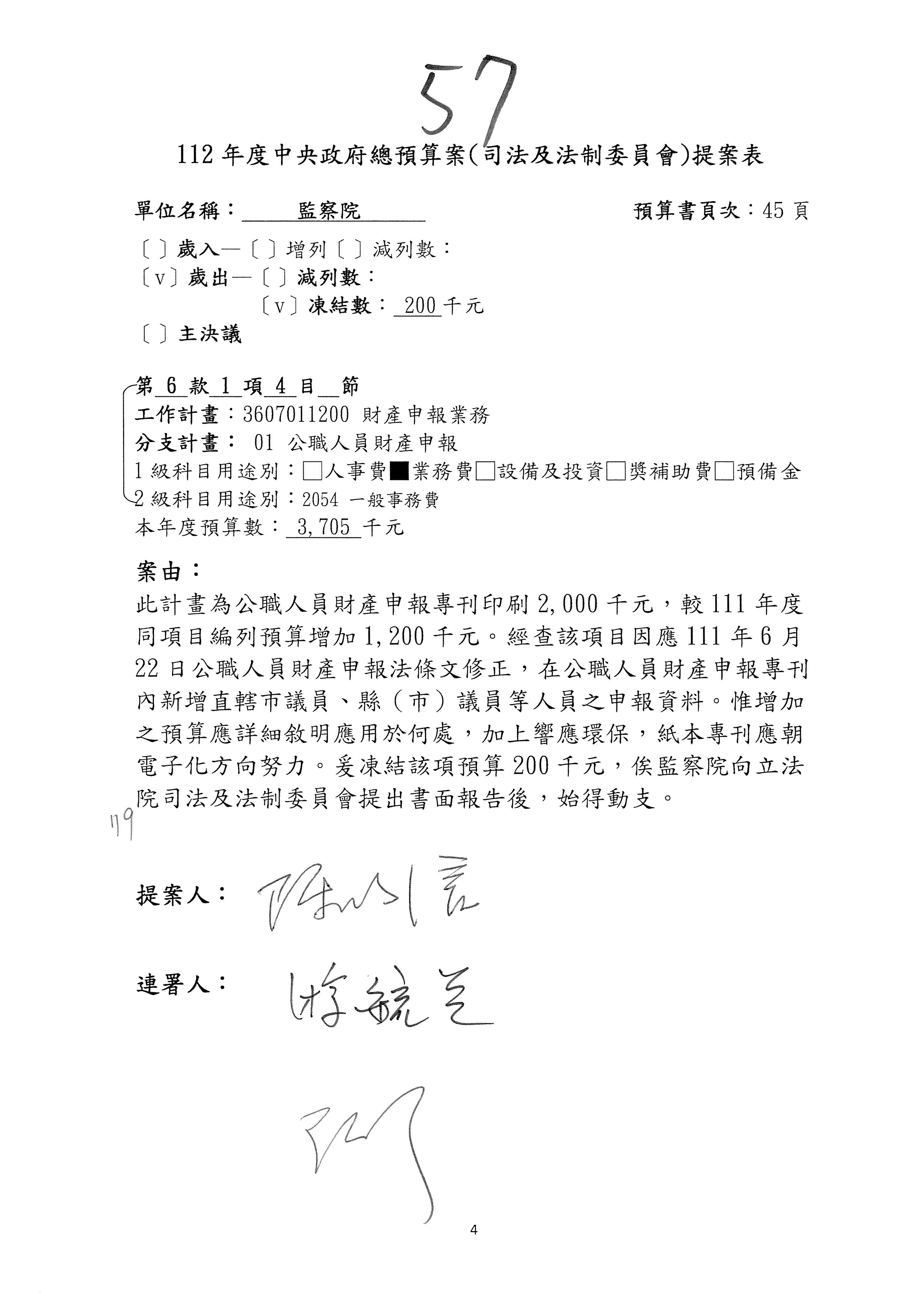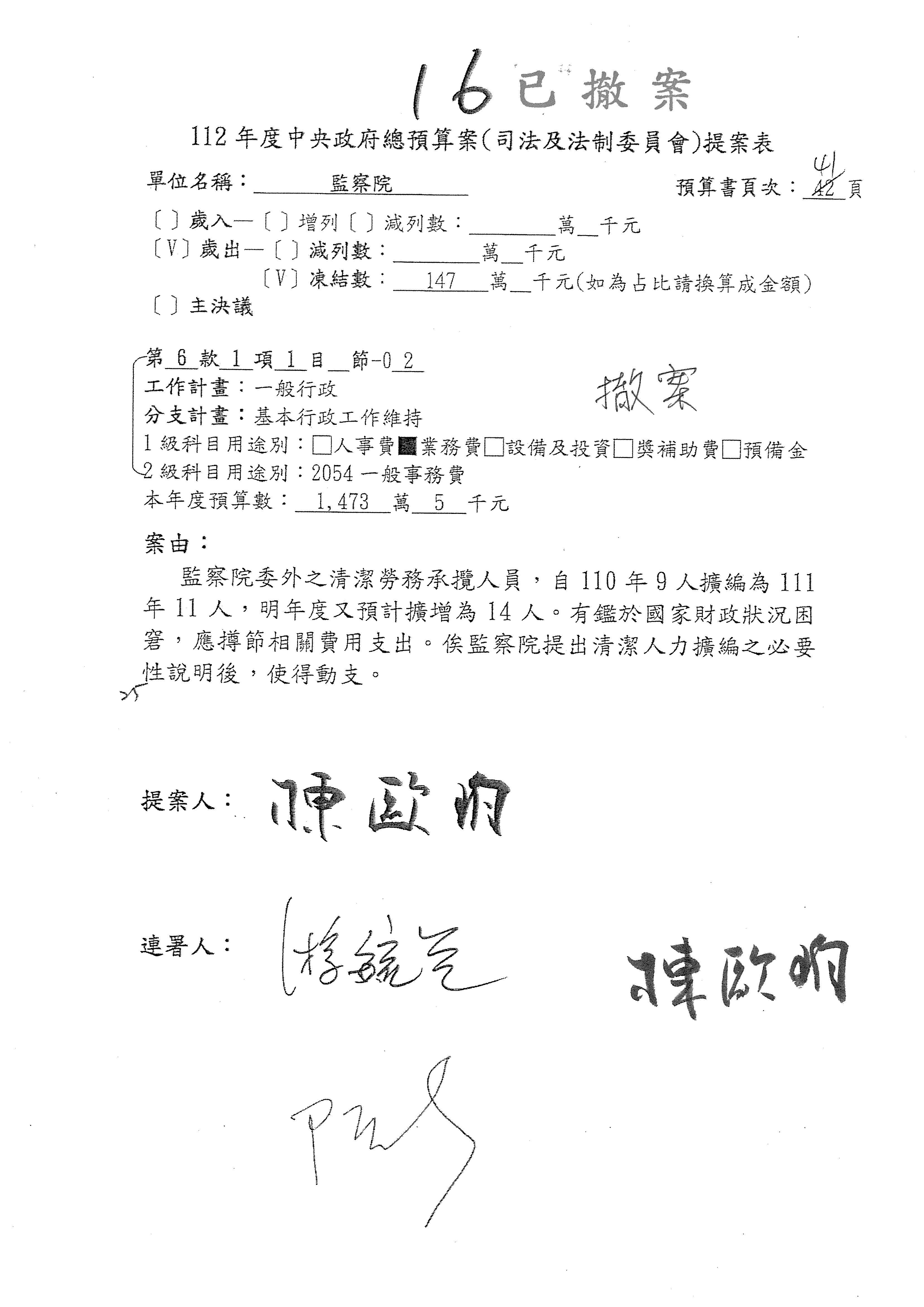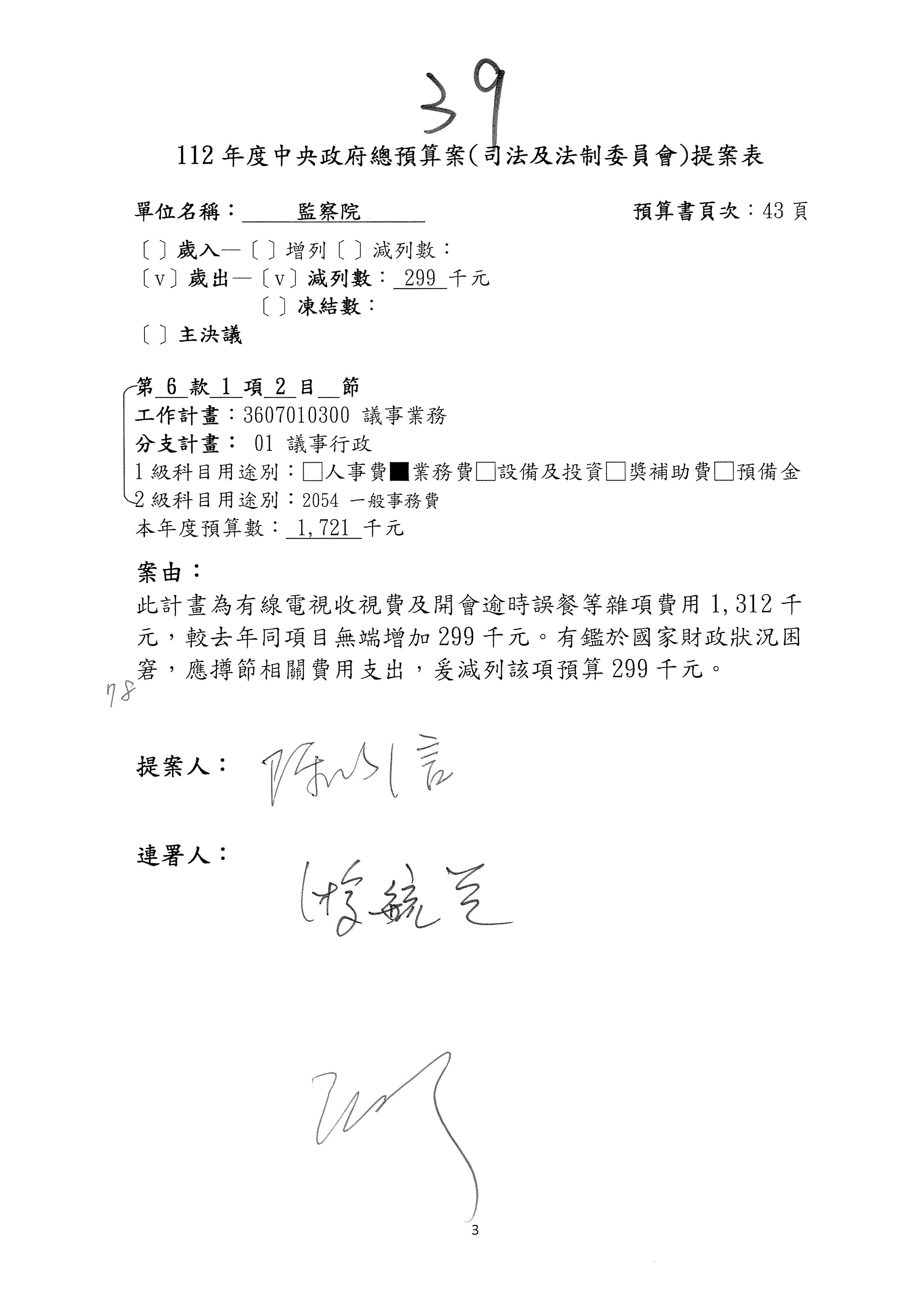 現在處理討論事項第一案─繼續審查112年度中央政府總預算案關於監察院主管收支部分,在處理之前,請議事人員一併宣讀討論事項第一案預算案之全部預算數及委員提案,請宣讀。
